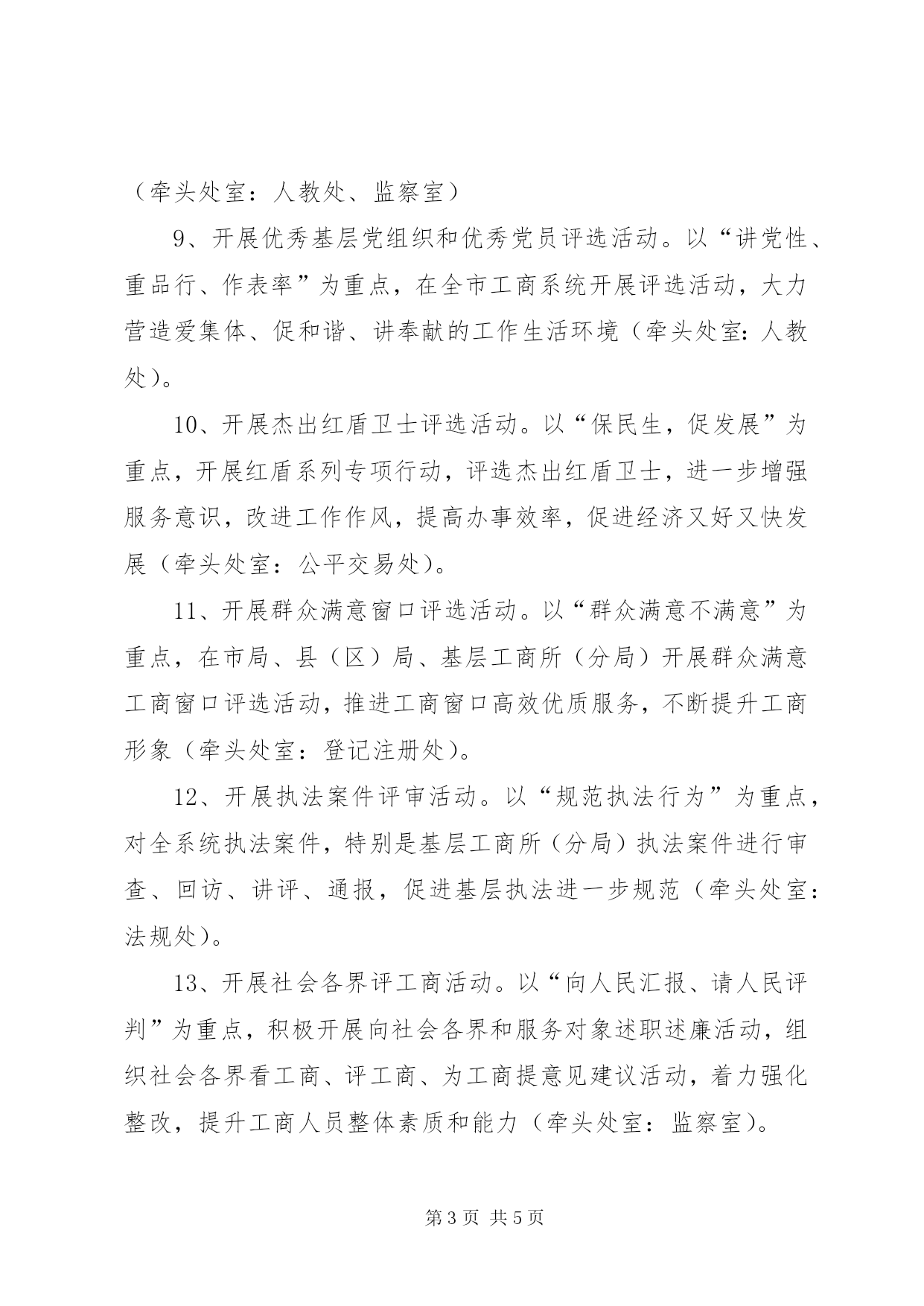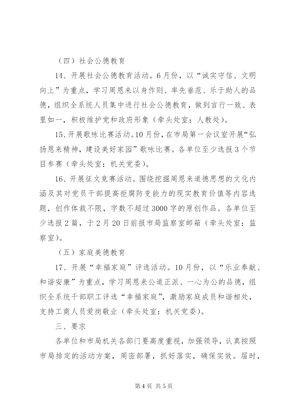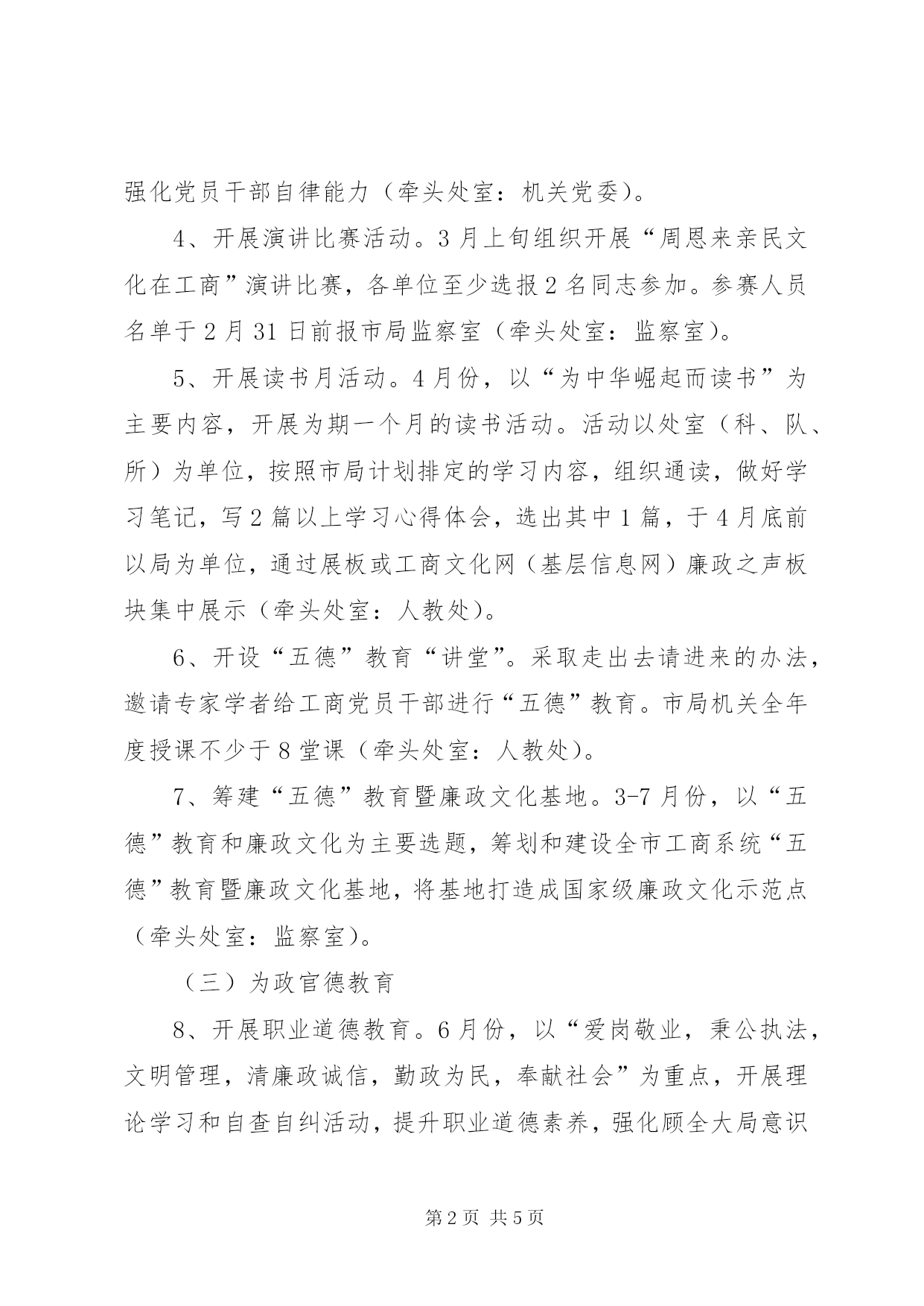 第PAGE\*Arabic\*MERGEFORMAT5页共NUMPAGES\*MERGEFORMAT5页工商局五德拒腐防变实施方案一、指导思想强化全系统党员干部思想建设、道德建设、作风建设,为扎实推进工商事业发展,建设受人尊敬、令人向往的美丽富庶幸福新作出更大奉献。二、活动安排(一)政治品德教育1、开展政治理论教育活动。1月至4月,“以党章是党的总章程,是全党必须遵循的总规矩”为重点,集中组织党员干部认真学习贯彻党章和党的十八大精神,同时认真学习中央纪委二次全会、省纪委三次全会、市纪委二次全会精神,强化党组织和广大党员干部精心履职、服务人民、服务发展意识(牵头处室:机关党委、监察室)。2、开展政治纪律教育活动。1月至4月,以贯彻落实“八项规定”为重点,组织全系统人员认真学习中央政治局“八项规定”、省委“十项规定”、市委“十二项规定”以及省、市纪委、省工商局关于2013年元旦、春节期间党风廉政建设规定和要求,强化党员干部廉政意识和自律意识(牵头处室:监察室)。(二)思想道德教育3、开展向党旗宣誓、向组织承诺活动。5月份,以局为单位组织全体党员干部向党旗宣誓、向组织承诺,进一步增强党性,强化党员干部自律能力(牵头处室:机关党委)。4、开展演讲比赛活动。3月上旬组织开展“周恩来亲民文化在工商”演讲比赛,各单位至少选报2名同志参加。参赛人员名单于2月31日前报市局监察室(牵头处室:监察室)。5、开展读书月活动。4月份,以“为中华崛起而读书”为主要内容,开展为期一个月的读书活动。活动以处室(科、队、所)为单位,按照市局计划排定的学习内容,组织通读,做好学习笔记,写2篇以上学习心得体会,选出其中1篇,于4月底前以局为单位,通过展板或工商文化网(基层信息网)廉政之声板块集中展示(牵头处室:人教处)。6、开设“五德”教育“讲堂”。采取走出去请进来的办法,邀请专家学者给工商党员干部进行“五德”教育。市局机关全年度授课不少于8堂课(牵头处室:人教处)。7、筹建“五德”教育暨廉政文化基地。3-7月份,以“五德”教育和廉政文化为主要选题,筹划和建设全市工商系统“五德”教育暨廉政文化基地,将基地打造成国家级廉政文化示范点(牵头处室:监察室)。(三)为政官德教育8、开展职业道德教育。6月份,以“爱岗敬业,秉公执法,文明管理,清廉政诚信,勤政为民,奉献社会”为重点,开展理论学习和自查自纠活动,提升职业道德素养,强化顾全大局意识(牵头处室:人教处、监察室)9、开展优秀基层党组织和优秀党员评选活动。以“讲党性、重品行、作表率”为重点,在全市工商系统开展评选活动,大力营造爱集体、促和谐、讲奉献的工作生活环境(牵头处室:人教处)。10、开展杰出红盾卫士评选活动。以“保民生,促发展”为重点,开展红盾系列专项行动,评选杰出红盾卫士,进一步增强服务意识,改进工作作风,提高办事效率,促进经济又好又快发展(牵头处室:公平交易处)。11、开展群众满意窗口评选活动。以“群众满意不满意”为重点,在市局、县(区)局、基层工商所(分局)开展群众满意工商窗口评选活动,推进工商窗口高效优质服务,不断提升工商形象(牵头处室:登记注册处)。12、开展执法案件评审活动。以“规范执法行为”为重点,对全系统执法案件,特别是基层工商所(分局)执法案件进行审查、回访、讲评、通报,促进基层执法进一步规范(牵头处室:法规处)。13、开展社会各界评工商活动。以“向人民汇报、请人民评判”为重点,积极开展向社会各界和服务对象述职述廉活动,组织社会各界看工商、评工商、为工商提意见建议活动,着力强化整改,提升工商人员整体素质和能力(牵头处室:监察室)。(四)社会公德教育14、开展社会公德教育活动。6月份,以“诚实守信、文明向上”为重点,学习周恩来以身作则、率先垂范、乐于助人的品德,组织全系统人员集中进行社会公德教育,做到言行一致、表里如一,积极维护党和政府形象(牵头处室:人教处)。15、开展歌咏比赛活动。10月份,在市局第一会议室开展“弘扬恩来精神,建设美好家园”歌咏比赛。各单位至少选报3个节目参赛(牵头处室:机关党委)。16、开展征文竞赛活动。围绕挖掘周恩来道德思想的文化内涵及其对党员干部提高拒腐防变能力的现实教育价值等内容选题,创作体裁不限,字数不超过3000字的原创作品。各单位至少选报2篇,于2月20日前报市局监察室邮箱(牵头处室:监察室)。(五)家庭美德教育17、开展“幸福家庭”评选活动。10月份,以“乐业奉献、和谐安康”为重点,学习周恩来公道正派、一心为公的品德,组织全系统干部职工评选“幸福家庭”,激励家庭成员和谐相处,支持工商人员爱岗敬业(牵头处室:机关党委)。三、要求各单位和市局机关各部门要高度重视,加强领导,认真按照市局排定的活动方案,周密部署,抓好落实,确保实效。届时,市