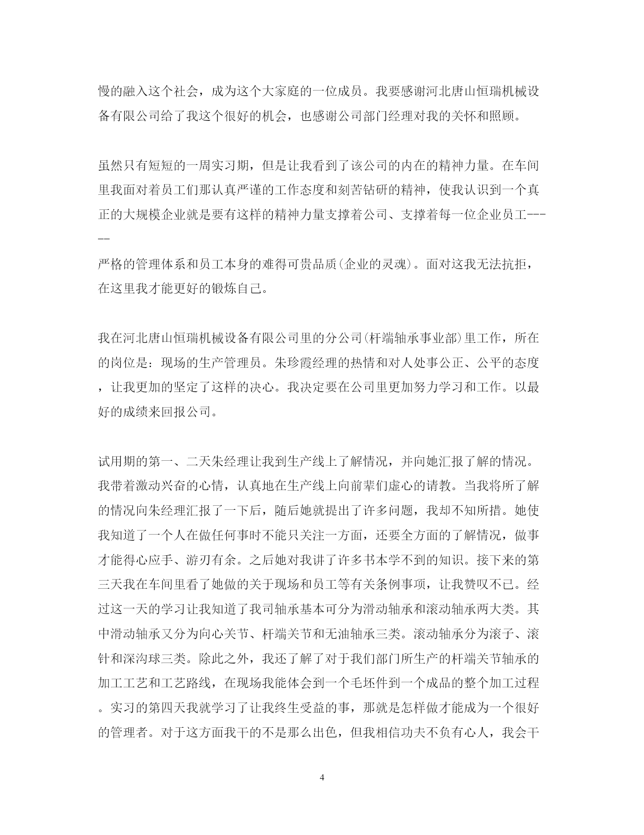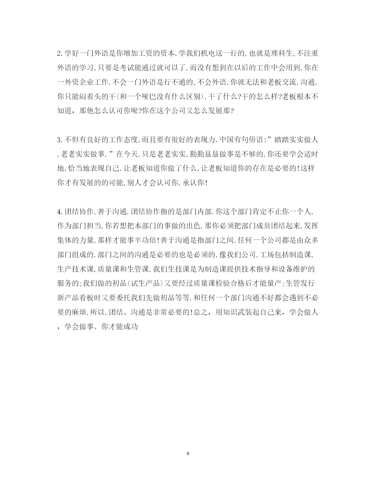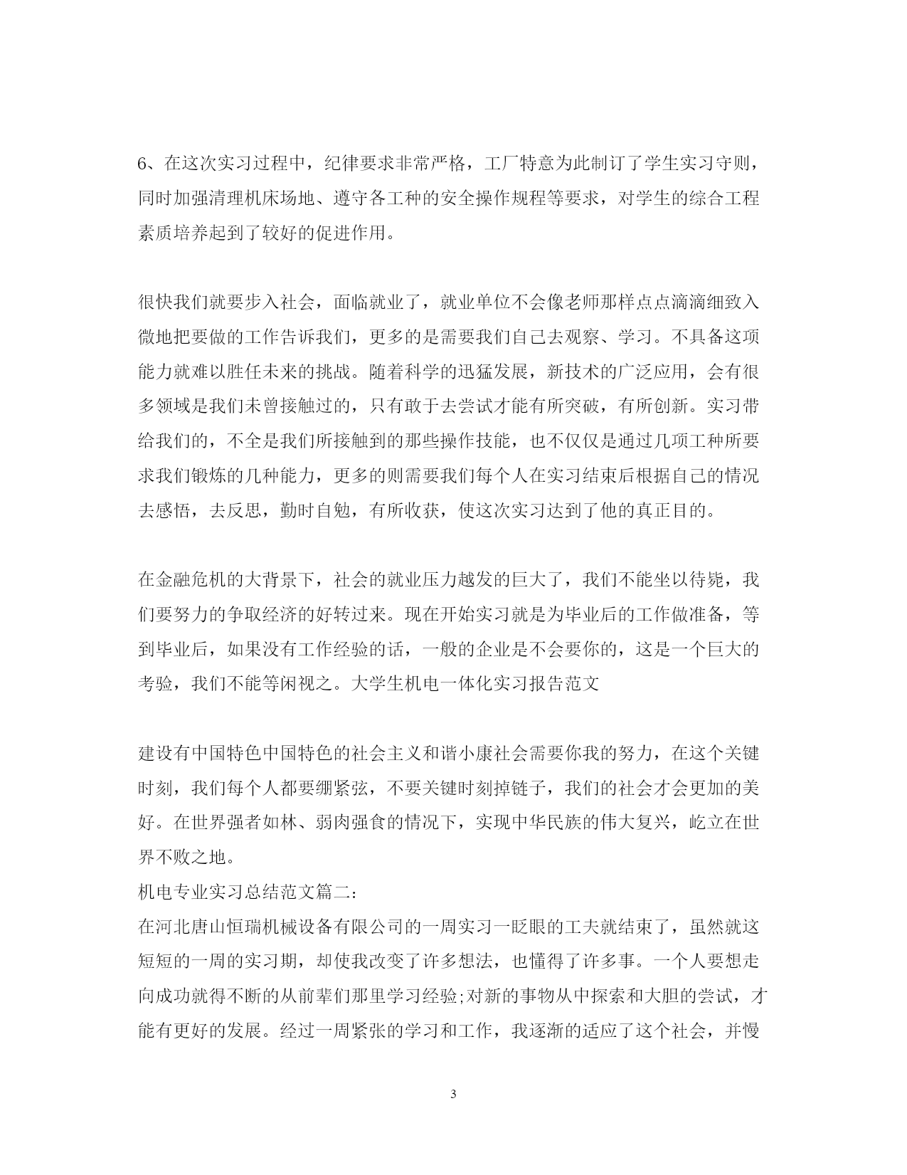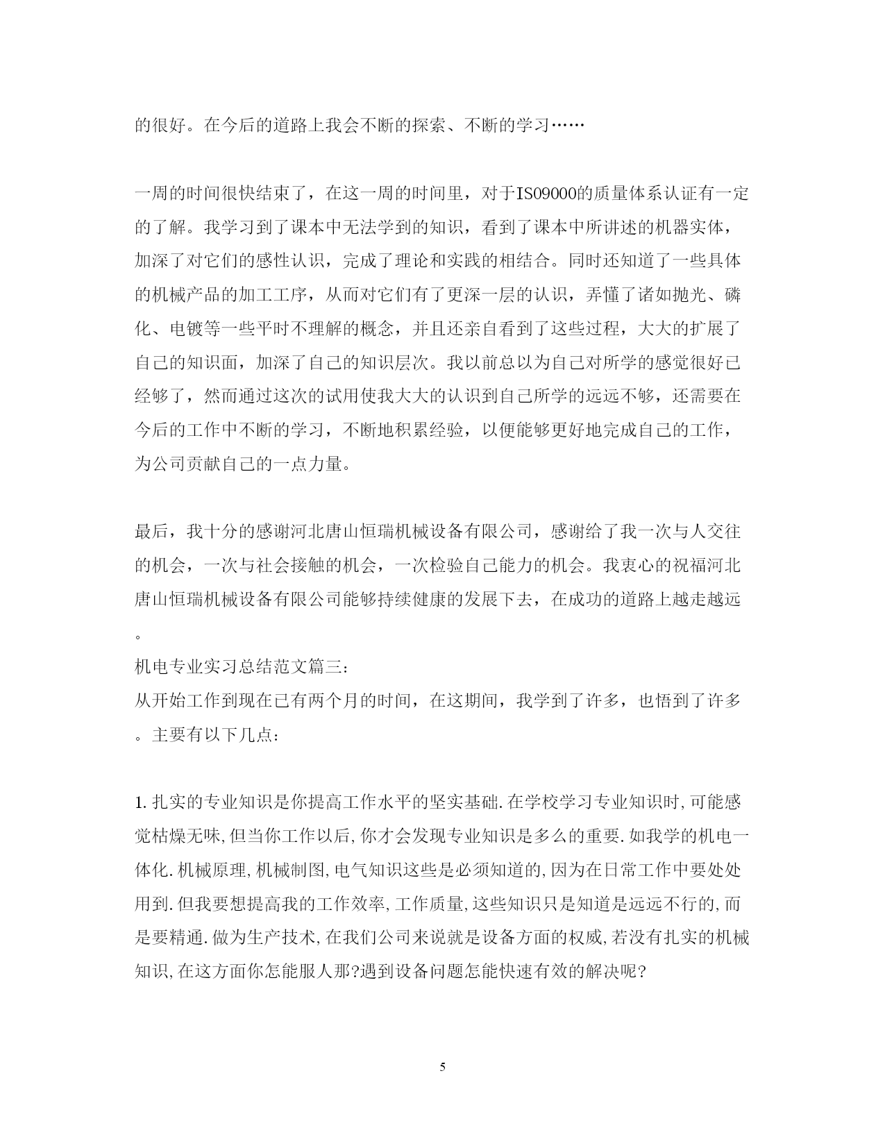 此资料由网络收集而来,如有侵权请告知上传者立即删除。资料共分享,我们负责传递知识。PAGEPAGE6机电专业实习总结范文3篇机电专业是职业学校的基本课程之一,对学生综合能力的提升起着重要的作用,因此必须加强对机电专业的教学,特别是实验实训的教学。为本次实习做一个总结,本文是范文网小编为大家整理的机电专业de实习总结范文,仅供参考。机电专业实习总结范文篇一:实践课题:机电一体化技术的社会实践和就业形势实践内容:古人有云:“纸上得来终觉浅,绝知此事要躬行”。自从走进了大学,距离工作就不远了,学校为了拓展我们学生自身的知识面,扩大与社会的接触面,增加个人在社会竞争中的经验,锻炼和提高我们的能力,以便在以后毕业后能真正走入社会,能够适应国内外的经济形势的变化,在学习机电一体化专业知识后,要求我们进行社会实践。社会实践是教学与生产实际相结合的重要实践性教学环节。它不仅让我们学到了很多在课堂上根本就学不到的知识,还使我们开阔了视野,增长了见识,了解一个企业是怎样进行生产的。为我们以后更好把所学的知识运用到实际工作中打下坚实的基础。作为一名新时代的大学生,空有一身抱负是不行的,还要有一身的本领才行。但是在新时代的情况下,社会竞争日趋激烈,社会的发展越来越快,只要你跟不上,就会被社会淘汰。现在就让我来回顾一下我的实习经历与成果:先说说我的专业。机电一体化技术是将机械技术、电工电子技术、微电子技术、信息技术、传感器技术、接口技术、信号变换技术等多种技术进行有机地结合,并综合应用到实际中去的综合技术。是现代化的自动生产设备几乎可以说都是机电一体化的设备。据报道称,中国机电设计迈入PLM全新阶段,正挑战着前所未有的、不可预测的难题。此次实习,带着什么是测控技术与仪器、本专业适合干哪方面的工作、本专业前途如何、等这些问题,我参加了实习。对电工技术、电子技术、机械设计基础、机械加工机床、机械加工工艺、数控技术等进行初步的实践,认清就业形势及当今社会对机电一体化专业技术的需求。1、亲临了一线的车间进行生产,真正的自己动手操作,熟悉车间各个操作流程。这让我了解了现代机械制造工业的生产方式和工艺过程。熟悉了工程材料主要成形方法和主要机械加工方法及其所用主要设备的工作原理和典型结构、工夹量具的使用以及安全操作技术。更加了解机械制造工艺知识和新工艺、新技术、新设备在机械制造中的应用。2、在车间里,友好的老师傅几乎寸步不离我身边,手把手教我具体的操作,这让我在工程材料主要成形加工方法和主要机械加工方法上,具有初步的独立操作技能,在此我也很感激他们给我一个这么好的机会亲手实践。3、由于在生产车间待得久了,耳濡目染,对书本的知识记忆更深了。在了解、熟悉和掌握一定的工程基础知识和操作技能过程中,培养、提高和加强了我的工程实践能力、创新意识和创新能力。4、车间里老师傅的细心也让我们明白做事要认真小心细致,不能马虎大意。这同时也培养了我坚强不屈的本质,永不言弃的信念!5、工厂领导时刻提醒安全和质量问题,也让我内心领会到了安全的重要性,培养和锻炼了劳动观点、质量和经济观念。在一定程度上加强了遵守劳动纪律、遵守安全技术规则和爱护公共财产的自觉性,提高了我的整体素质。6、在这次实习过程中,纪律要求非常严格,工厂特意为此制订了学生实习守则,同时加强清理机床场地、遵守各工种的安全操作规程等要求,对学生的综合工程素质培养起到了较好的促进作用。很快我们就要步入社会,面临就业了,就业单位不会像老师那样点点滴滴细致入微地把要做的工作告诉我们,更多的是需要我们自己去观察、学习。不具备这项能力就难以胜任未来的挑战。随着科学的迅猛发展,新技术的广泛应用,会有很多领域是我们未曾接触过的,只有敢于去尝试才能有所突破,有所创新。实习带给我们的,不全是我们所接触到的那些操作技能,也不仅仅是通过几项工种所要求我们锻炼的几种能力,更多的则需要我们每个人在实习结束后根据自己的情况去感悟,去反思,勤时自勉,有所收获,使这次实习达到了他的真正目的。在金融危机的大背景下,社会的就业压力越发的巨大了,我们不能坐以待毙,我们要努力的争取经济的好转过来。现在开始实习就是为毕业后的工作做准备,等到毕业后,如果没有工作经验的话,一般的企业是不会要你的,这是一个巨大的考验,我们不能等闲视之。大学生机电一体化实习报告范文建设有中国特色中国特色的社会主义和谐小康社会需要你我的努力,在这个关键时刻,我们每个人都要绷紧弦,不要关键时刻掉链子,我们的社会才会更加的美好。在世界强者如林、弱肉强食的情况下,实现中华民族的伟大复兴,屹立在世界不败之地。机电专业实习总结范文篇二:在河北唐山恒瑞机械设备有限公司的一周实习一眨眼的工夫就结束了,虽然就这短短的一周的实习期,却使我改变了许多想法,