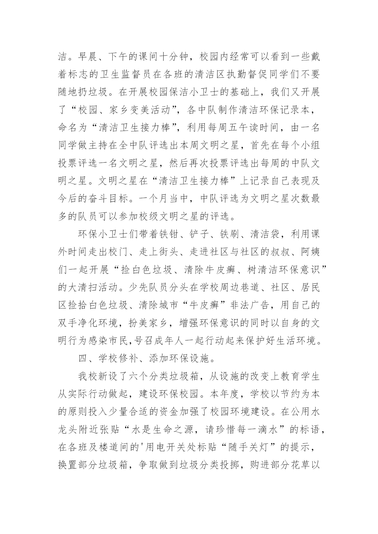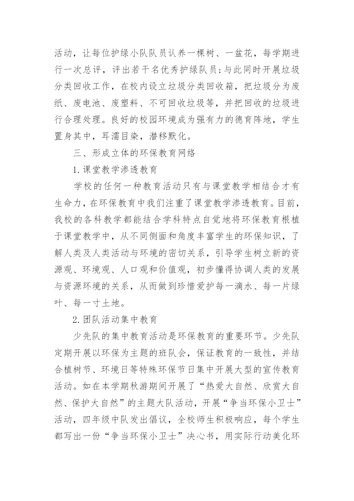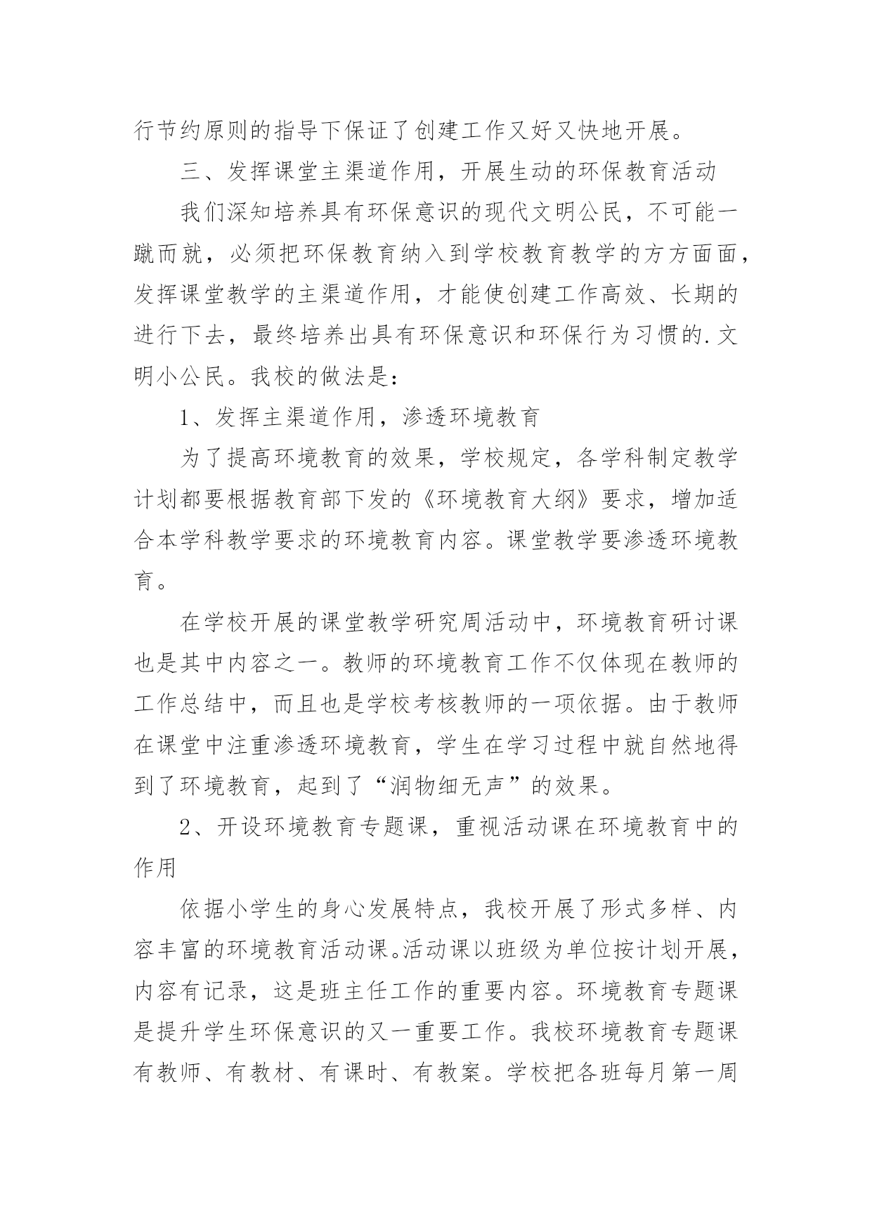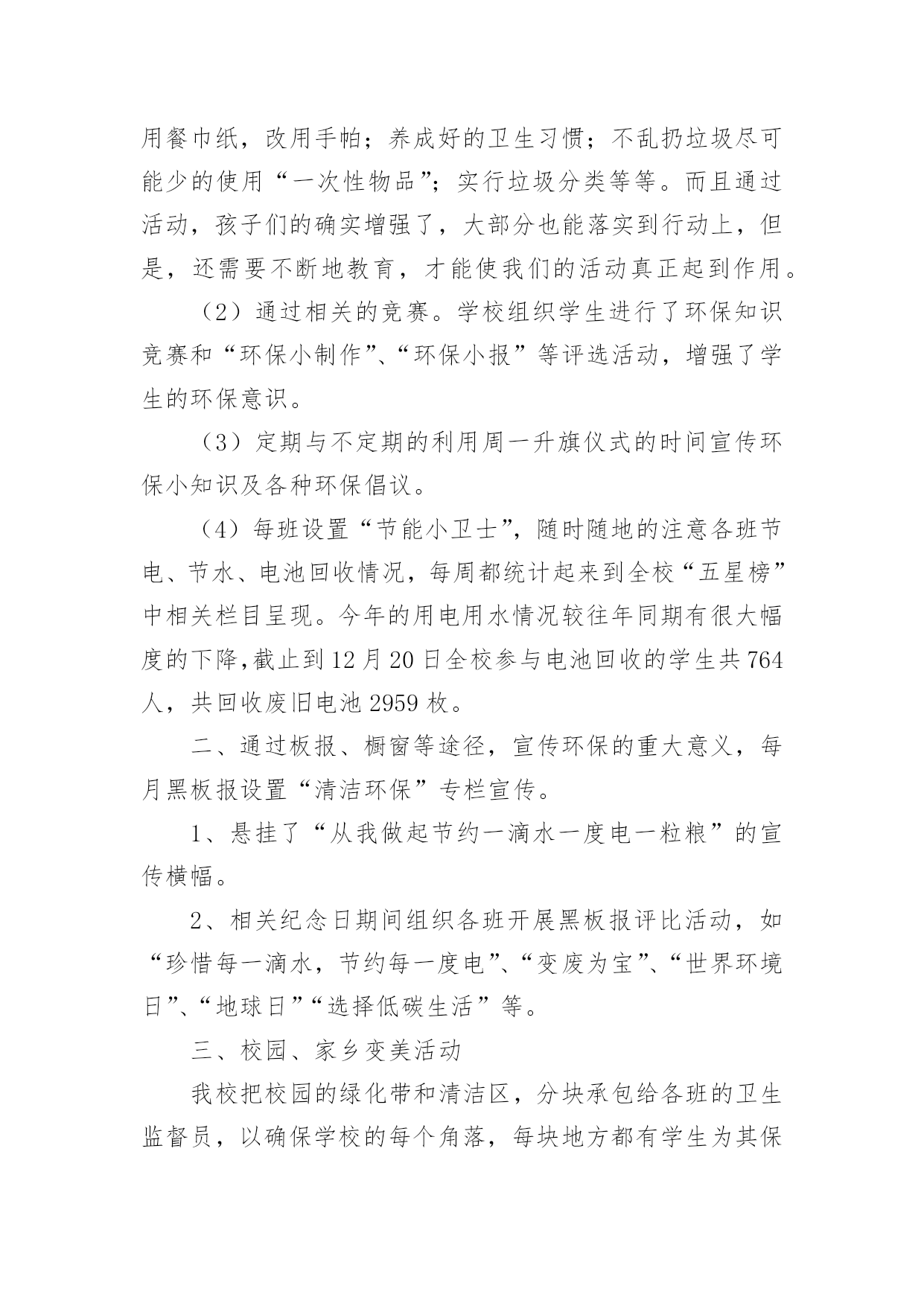 小学学校环保的工作总结小学学校环保的工作总结总结就是把一个时段的学习、工作或其完成情况进行一次全面系统的总结,它能使我们及时找出错误并改正,因此我们需要回头归纳,写一份总结了。那么你真的懂得怎么写总结吗?以下是小编为大家整理的小学学校环保的工作总结,仅供参考,希望能够帮助到大家。小学学校环保的工作总结1一、营造浓厚的宣传氛围加强宣传教育是我们开展环保教育的主要途径,我校利用红领巾广播站、黑板报、班报、主题队会等形式开展系列宣传教育活动,从而形成浓厚的环保宣传氛围,从而使环保意识扎根在学生的脑海和心田。二、建造优美的校园环境良好的校园环境是对学生进行环境教育的主要阵地,因此,我校注重加强校园文化建设,明确提出“校园无处不育人,校园无时不育人”的口号。一位四年级学生在日记中写下:“置身校园,如同进入花园;校园内外,绿树成荫;楼前楼后,花繁草茂;花丛林带,四季飘香;艺术板块,美的熏陶。”为了保持校园优美的环境,我校开展了“弯弯腰”活动,要求每位学生每天捡一张废纸、一个塑料袋;开展护绿活动,让每位护绿小队队员认养一棵树、一盆花,每学期进行一次总评,评出若干名优秀护绿队员;与此同时开展垃圾分类回收工作,在校内设立垃圾分类回收箱,把垃圾分为废纸、废电池、废塑料、不可回收垃圾等,并把回收的垃圾进行合理处理。良好的校园环境成为强有力的德育阵地,学生置身其中,耳濡目染,潜移默化。三、形成立体的环保教育网络1.课堂教学渗透教育学校的任何一种教育活动只有与课堂教学相结合才有生命力,在环保教育中我们注重了课堂教学渗透教育。目前,我校的各科教学都能结合学科特点自觉地将环保教育根植于课堂教学中,从不同侧面和角度丰富学生的环保知识,了解人类及人类活动与环境的密切关系,引导学生树立新的资源观、环境观、人口观和价值观,初步懂得协调人类的发展与资源环境的关系,从而做到珍惜爱护每一滴水、每一片绿叶、每一寸土地。2.团队活动集中教育少先队的集中教育活动是环保教育的重要环节。少先队定期开展以环保为主题的班队会,保证教育的一致性,并结合植树节、环境日等特殊环保节日集中开展大型的宣传教育活动。如在本学期秋游期间开展了“热爱大自然、欣赏大自然、保护大自然”的主题大队活动,开展“争当环保小卫士”活动,四年级中队发出倡议,全校师生积极响应,每个学生都写出一份“争当环保小卫士”决心书,用实际行动美化环境,净化心灵,结合活动的开展,少先队又评选出40名校园环保小卫士,利用红领巾广播、黑板报等大力宣传,从而增强了全体师生的环境意识。3.家长学校延伸教育为了进一步提高全民的环境意识,增强社会的共同责任感,我们把环保教育工作延伸开创建专题会议,研究并解决创建过程中出现的新问题,及时提出下一步的工作目标。这样我校的创建“绿色”工作得以有序开展,形成了多角度,高视野的创建效果。二、在浓郁的氛围中提高环保意识创建绿色学校不仅是学校的面貌改变,更重要的是要培养师生的环保素养,提高师生的环保意识。为此,学校每学期都要开展环保专题培训,学校领导和有关教师举办环保专题讲座,对不同年龄的孩子讲座的形式和内容也有所不同。学校还采取“请进来派出去”的方法,加强教师环保知识培训,请进来就是请环保部门的专家来校传授环保知识、介绍国内外环境动态,宣传有关环保的法律法规等。派出去就是选派领导和教师到兄弟学校学习创建经验。我校先后参加了十三中创建交流会、东苑小学的创建经验介绍和四村小学的创建现场学习会。通过校内外的培训学习增加了教师的环保知识。培养了师生的环保意识。为我校开展创建“绿色”学校工作做好了思想准备。学校创建“绿色学校”工作的经费使用做到专款专用,并纳入到学校的财务管理中,做到创建经费动态管理,在厉行节约原则的指导下保证了创建工作又好又快地开展。三、发挥课堂主渠道作用,开展生动的环保教育活动我们深知培养具有环保意识的现代文明公民,不可能一蹴而就,必须把环保教育纳入到学校教育教学的方方面面,发挥课堂教学的主渠道作用,才能使创建工作高效、长期的进行下去,最终培养出具有环保意识和环保行为习惯的.文明小公民。我校的做法是:1、发挥主渠道作用,渗透环境教育为了提高环境教育的效果,学校规定,各学科制定教学计划都要根据教育部下发的《环境教育大纲》要求,增加适合本学科教学要求的环境教育内容。课堂教学要渗透环境教育。在学校开展的课堂教学研究周活动中,环境教育研讨课也是其中内容之一。教师的环境教育工作不仅体现在教师的工作总结中,而且也是学校考核教师的一项依据。由于教师在课堂中注重渗透环境教育,学生在学习过程中就自然地得到了环境教育,起到了“润物细无声”的效果。2、开设环境教育专题课,重视活动课在环境教育中的作用依据小学生的身心发展特点,我校开展了形式多样、内容丰富的环境教育活动课。活动课以班级为单位按计划开展,内容有记录,