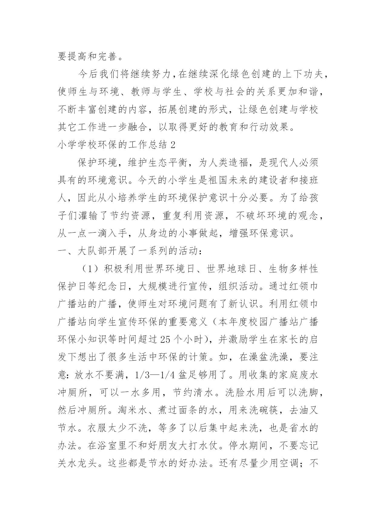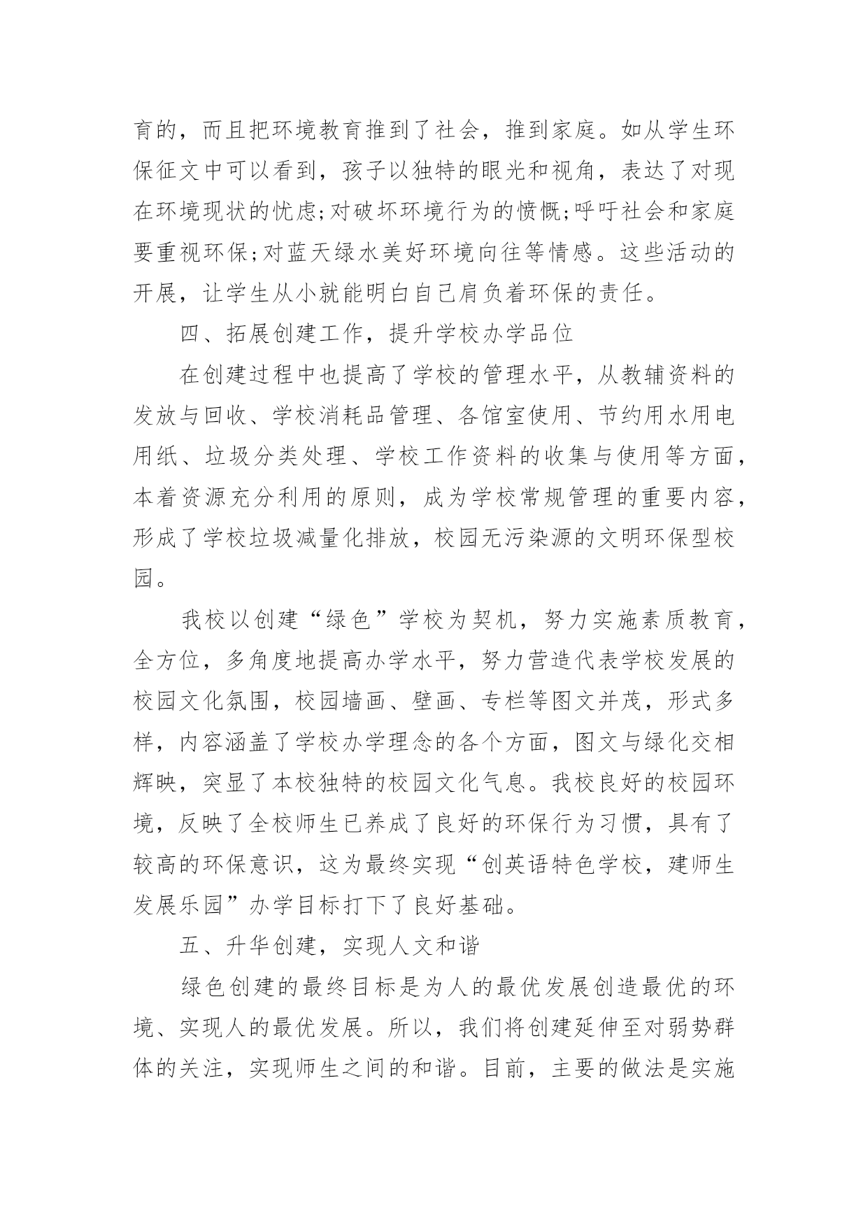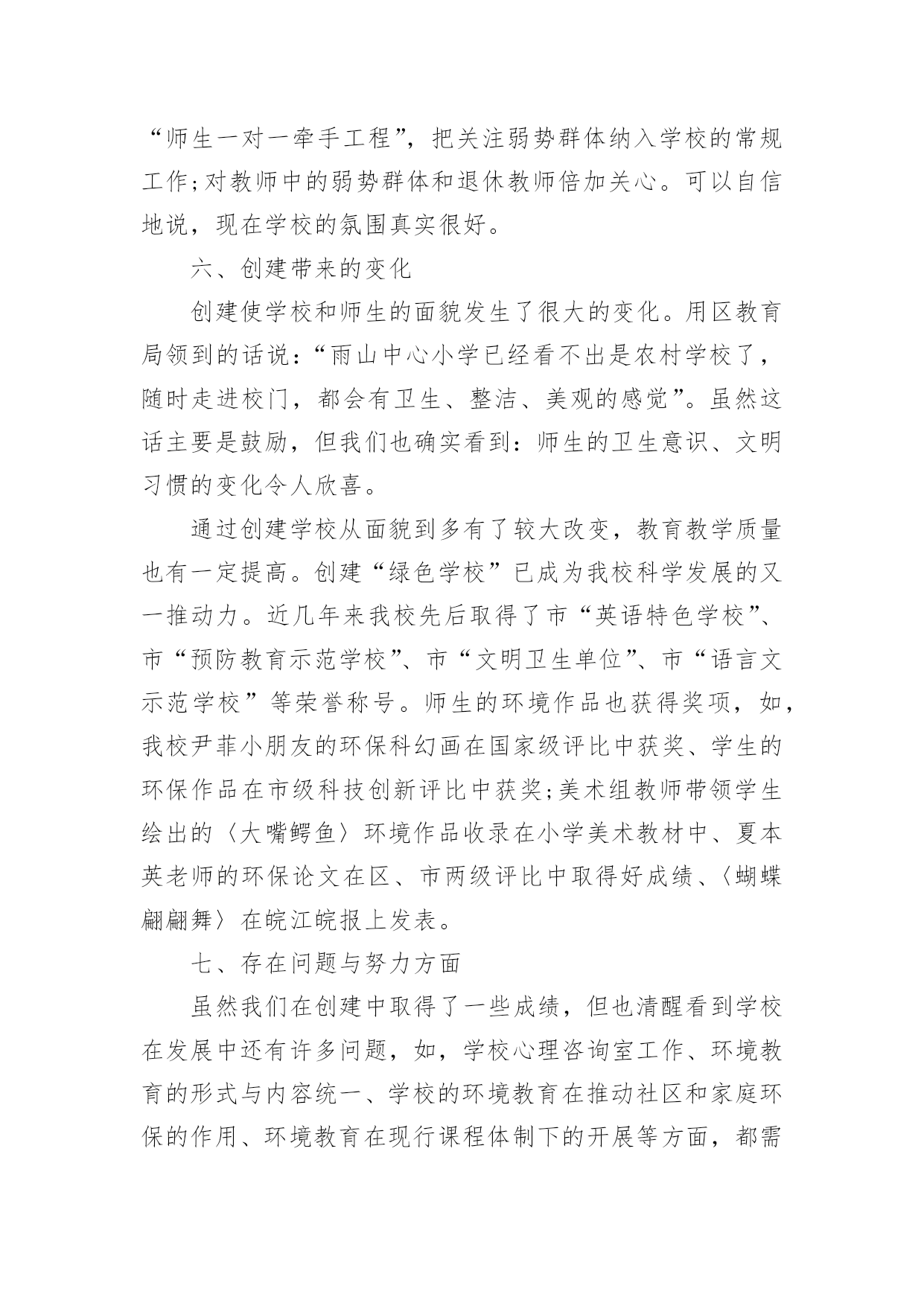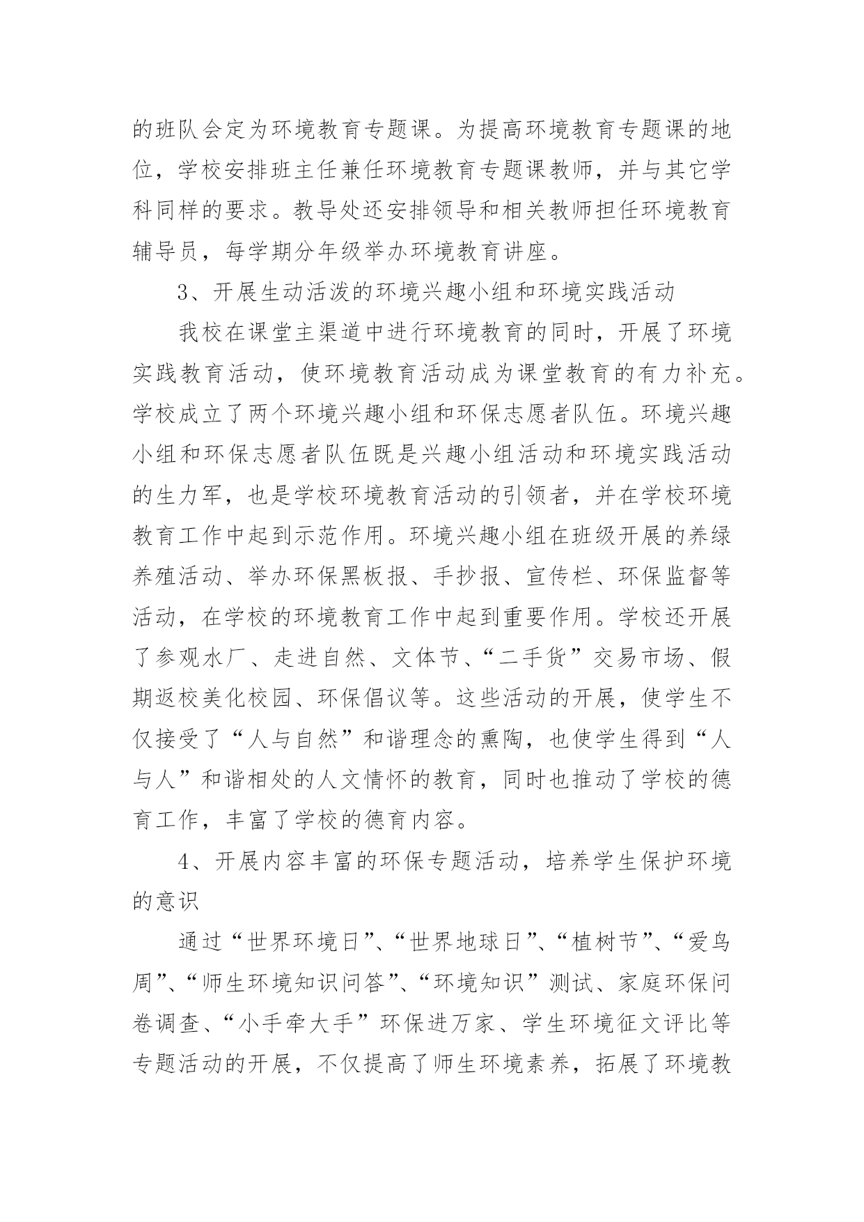 小学学校环保的工作总结小学学校环保的工作总结总结就是把一个时段的学习、工作或其完成情况进行一次全面系统的总结,它能使我们及时找出错误并改正,因此我们需要回头归纳,写一份总结了。那么你真的懂得怎么写总结吗?以下是小编为大家整理的小学学校环保的工作总结,仅供参考,希望能够帮助到大家。小学学校环保的工作总结1一、营造浓厚的宣传氛围加强宣传教育是我们开展环保教育的主要途径,我校利用红领巾广播站、黑板报、班报、主题队会等形式开展系列宣传教育活动,从而形成浓厚的环保宣传氛围,从而使环保意识扎根在学生的脑海和心田。二、建造优美的校园环境良好的校园环境是对学生进行环境教育的主要阵地,因此,我校注重加强校园文化建设,明确提出“校园无处不育人,校园无时不育人”的口号。一位四年级学生在日记中写下:“置身校园,如同进入花园;校园内外,绿树成荫;楼前楼后,花繁草茂;花丛林带,四季飘香;艺术板块,美的熏陶。”为了保持校园优美的环境,我校开展了“弯弯腰”活动,要求每位学生每天捡一张废纸、一个塑料袋;开展护绿活动,让每位护绿小队队员认养一棵树、一盆花,每学期进行一次总评,评出若干名优秀护绿队员;与此同时开展垃圾分类回收工作,在校内设立垃圾分类回收箱,把垃圾分为废纸、废电池、废塑料、不可回收垃圾等,并把回收的垃圾进行合理处理。良好的校园环境成为强有力的德育阵地,学生置身其中,耳濡目染,潜移默化。三、形成立体的环保教育网络1.课堂教学渗透教育学校的任何一种教育活动只有与课堂教学相结合才有生命力,在环保教育中我们注重了课堂教学渗透教育。目前,我校的各科教学都能结合学科特点自觉地将环保教育根植于课堂教学中,从不同侧面和角度丰富学生的环保知识,了解人类及人类活动与环境的密切关系,引导学生树立新的资源观、环境观、人口观和价值观,初步懂得协调人类的发展与资源环境的关系,从而做到珍惜爱护每一滴水、每一片绿叶、每一寸土地。2.团队活动集中教育少先队的集中教育活动是环保教育的重要环节。少先队定期开展以环保为主题的班队会,保证教育的一致性,并结合植树节、环境日等特殊环保节日集中开展大型的宣传教育活动。如在本学期秋游期间开展了“热爱大自然、欣赏大自然、保护大自然”的主题大队活动,开展“争当环保小卫士”活动,四年级中队发出倡议,全校师生积极响应,每个学生都写出一份“争当环保小卫士”决心书,用实际行动美化环境,净化心灵,结合活动的开展,少先队又评选出40名校园环保小卫士,利用红领巾广播、黑板报等大力宣传,从而增强了全体师生的环境意识。3.家长学校延伸教育为了进一步提高全民的环境意识,增强社会的共同责任感,我们把环保教育工作延伸开创建专题会议,研究并解决创建过程中出现的新问题,及时提出下一步的工作目标。这样我校的创建“绿色”工作得以有序开展,形成了多角度,高视野的创建效果。二、在浓郁的氛围中提高环保意识创建绿色学校不仅是学校的面貌改变,更重要的是要培养师生的环保素养,提高师生的环保意识。为此,学校每学期都要开展环保专题培训,学校领导和有关教师举办环保专题讲座,对不同年龄的孩子讲座的形式和内容也有所不同。学校还采取“请进来派出去”的方法,加强教师环保知识培训,请进来就是请环保部门的专家来校传授环保知识、介绍国内外环境动态,宣传有关环保的法律法规等。派出去就是选派领导和教师到兄弟学校学习创建经验。我校先后参加了十三中创建交流会、东苑小学的创建经验介绍和四村小学的创建现场学习会。通过校内外的培训学习增加了教师的环保知识。培养了师生的环保意识。为我校开展创建“绿色”学校工作做好了思想准备。学校创建“绿色学校”工作的经费使用做到专款专用,并纳入到学校的财务管理中,做到创建经费动态管理,在厉行节约原则的指导下保证了创建工作又好又快地开展。三、发挥课堂主渠道作用,开展生动的环保教育活动我们深知培养具有环保意识的现代文明公民,不可能一蹴而就,必须把环保教育纳入到学校教育教学的方方面面,发挥课堂教学的主渠道作用,才能使创建工作高效、长期的进行下去,最终培养出具有环保意识和环保行为习惯的.文明小公民。我校的做法是:1、发挥主渠道作用,渗透环境教育为了提高环境教育的效果,学校规定,各学科制定教学计划都要根据教育部下发的《环境教育大纲》要求,增加适合本学科教学要求的环境教育内容。课堂教学要渗透环境教育。在学校开展的课堂教学研究周活动中,环境教育研讨课也是其中内容之一。教师的环境教育工作不仅体现在教师的工作总结中,而且也是学校考核教师的一项依据。由于教师在课堂中注重渗透环境教育,学生在学习过程中就自然地得到了环境教育,起到了“润物细无声”的效果。2、开设环境教育专题课,重视活动课在环境教育中的作用依据小学生的身心发展特点,我校开展了形式多样、内容丰富的环境教育活动课。活动课以班级为单位按计划开展,内容有记录,