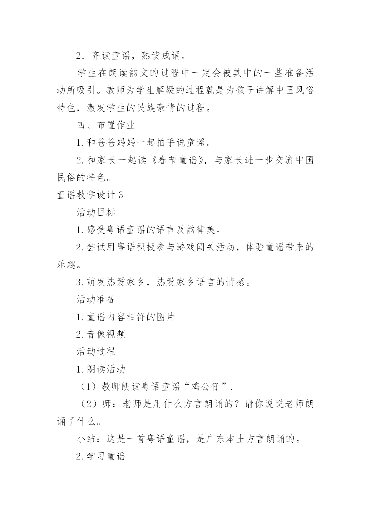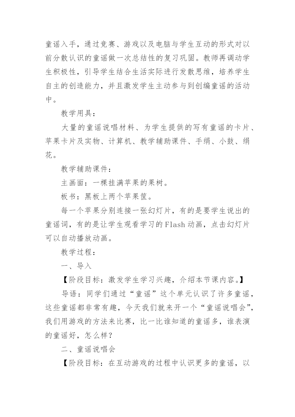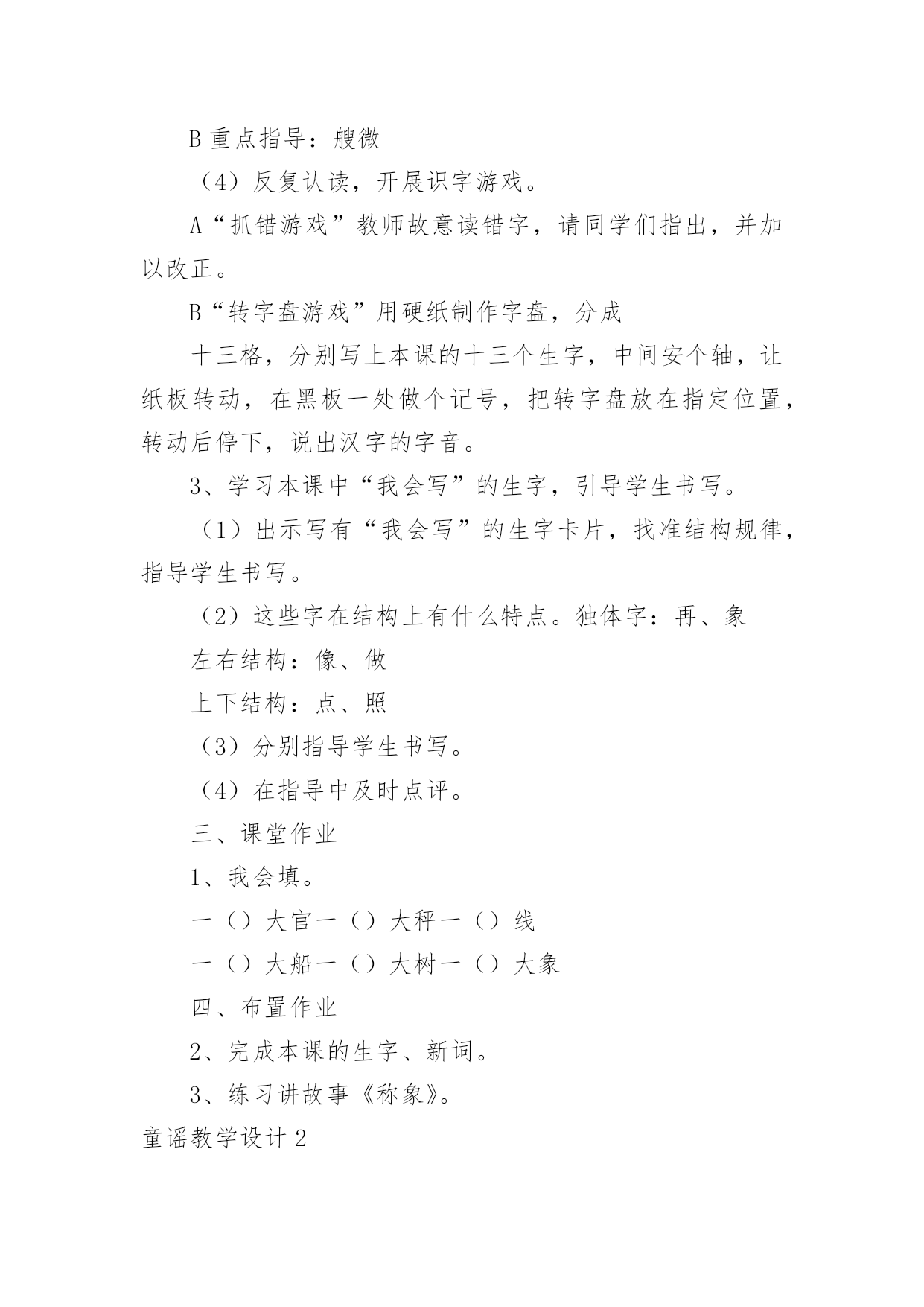 童谣教学设计童谣教学设计作为一名默默奉献的教育工作者,通常会被要求编写教学设计,教学设计是一个系统化规划教学系统的过程。那么什么样的教学设计才是好的呢?下面是小编整理的童谣教学设计,希望能够帮助到大家。童谣教学设计1教学目标:1、认识11个生字。2、正确、流利、有感情地朗读课文,体会风娃娃的好心和傻气。3、懂得“做事光有好的愿望不行,还要看是不是对别人有用”的的道理。重点难点:让学生知道风娃娃做了几件事,哪些做得好?哪些做得不好?教学过程第一课时一、谈话导入。同学们都一定很喜欢娃娃吧?你们自己有玩具娃娃吗?有什么娃娃?(结合学生的话,激发学生学习兴趣。)娃娃有很多种,有洋娃娃、木娃娃、布娃娃、泥娃娃。今天,咱们要认识一个新娃娃:(板书风娃娃,让学生齐读课题)。二、学习课文。1、感知课文,了解课文大意。(1)听课文录音,学生边听边画出生字。初步了解课文大意。(2)自由读课文,反复读带有生字的句子。2、自选板块,自主研读。3、通读全文,理清线索。读全文,看设影,想想风娃娃做了哪几件事情。学生汇报,老师板书:吹大风车,吹帆船,吹风筝,吹衣服、小树。以上几件事中,哪些是他做的好事?哪些是他做的坏事?4、提问设疑,小组研读。(1)风娃娃为什么想到帮人们做事?(2)风娃娃为什么好心办了坏事?(3)选择你最感兴趣的问题,在自学的基础上讨论。5、分块研读,反馈交流。(1)研读:“做好事”板块。(选择重点句子读一读,想一想。)风娃娃做了什么?结果怎样?风娃娃做了两件好事后,是怎样想的?读一读这一句话。从他心里想的,你体会到了什么?感受怎么样?(注重学生的情感体验和自身感受。)(2)研读“做坏事”板块。(选择重点句子读一读,想一想。)风娃娃做了什么?结果怎样?风娃娃听了人们的责怪,是怎样想的?读一读这句话。读读学习伙伴话,说说你想对风娃娃说什么?(3)请你评价一下,风娃娃是一个怎样的娃娃?(通过让学生体会、感受、评价、思考,明白做事情光有好的愿望不行,还要看是不是真的对别人有用的道理。)三、教师小结四、布置作业。第二课时差一、复习课文内容。1、练习朗读,思考:你能用自己的话说说曹冲称象的过程吗?2、练习背诵课文。二、学习本课的生字、新词,掌握识字规律。1、学习本课中“我会认”的生字,找到识字规律,引导学生自主识字。(1)出示写有“我会认”的生字卡片,引导学生认读。纠正读音。(2)请你仔细观察本课会认的生字,小组讨论识字方法。(3)学生汇报表演。A加偏旁方法记忆。B重点指导:艘微(4)反复认读,开展识字游戏。A“抓错游戏”教师故意读错字,请同学们指出,并加以改正。B“转字盘游戏”用硬纸制作字盘,分成十三格,分别写上本课的十三个生字,中间安个轴,让纸板转动,在黑板一处做个记号,把转字盘放在指定位置,转动后停下,说出汉字的字音。3、学习本课中“我会写”的生字,引导学生书写。(1)出示写有“我会写”的生字卡片,找准结构规律,指导学生书写。(2)这些字在结构上有什么特点。独体字:再、象左右结构:像、做上下结构:点、照(3)分别指导学生书写。(4)在指导中及时点评。三、课堂作业1、我会填。一()大官一()大秤一()线一()大船一()大树一()大象四、布置作业2、完成本课的生字、新词。3、练习讲故事《称象》。童谣教学设计2一、激趣导入说一说:同学们,你最喜欢哪个节日?为什么?预设:生:我最喜欢春节,春节可以放鞭炮……二、快乐积累,了解民俗1.同学们知道过大年吗?能说一说过年之前你们家里都要做些什么吗?2.中国农历新年称为春节,是中国最隆重的传统节日,也是团结、兴旺的象征,同时也是对未来寄予新的希望的佳节。据记载,中国人过春节已有4000多年的历史。为了迎接新年的到来,我们要做好多事情,快一起读一读,看看我们都要准备什么。3.多媒体播放《春节童谣》动画视频,吸引学生注意力,听准字音。学生自由读童谣。4.说一说这首童谣中你哪里没读懂。预设:(1)腊八:就是农历的十二月初八。(2)糖瓜:用麦芽糖做成圆圆的小南瓜的形状。这种糖很粘,会粘住牙齿,让我们说不了话。(可以讲一讲灶王爷的故事)(3)熬一宿:就是一晚上不睡觉。5、拍手读童谣,感受学习乐趣。三、游戏巩固所学1、课件出示连一连,随机让学生上台连线,巩固记忆。2.齐读童谣,熟读成诵。学生在朗读韵文的过程中一定会被其中的一些准备活动所吸引。教师为学生解疑的过程就是为孩子讲解中国风俗特色,激发学生的民族豪情的过程。四、布置作业1.和爸爸妈妈一起拍手说童谣。2.和家长一起读《春节童谣》,与家长进一步交流中国民俗的特色。童谣教学设计3活动目标1.感受粤语童谣的语言及韵律美。2.尝试用粤语积极参与游戏闯关活动,体验童谣带来的乐趣。3.萌发热爱家乡,热爱家乡语言的情感。活动准备1.童谣内容相符的图片2.音像视频活动过程1.朗