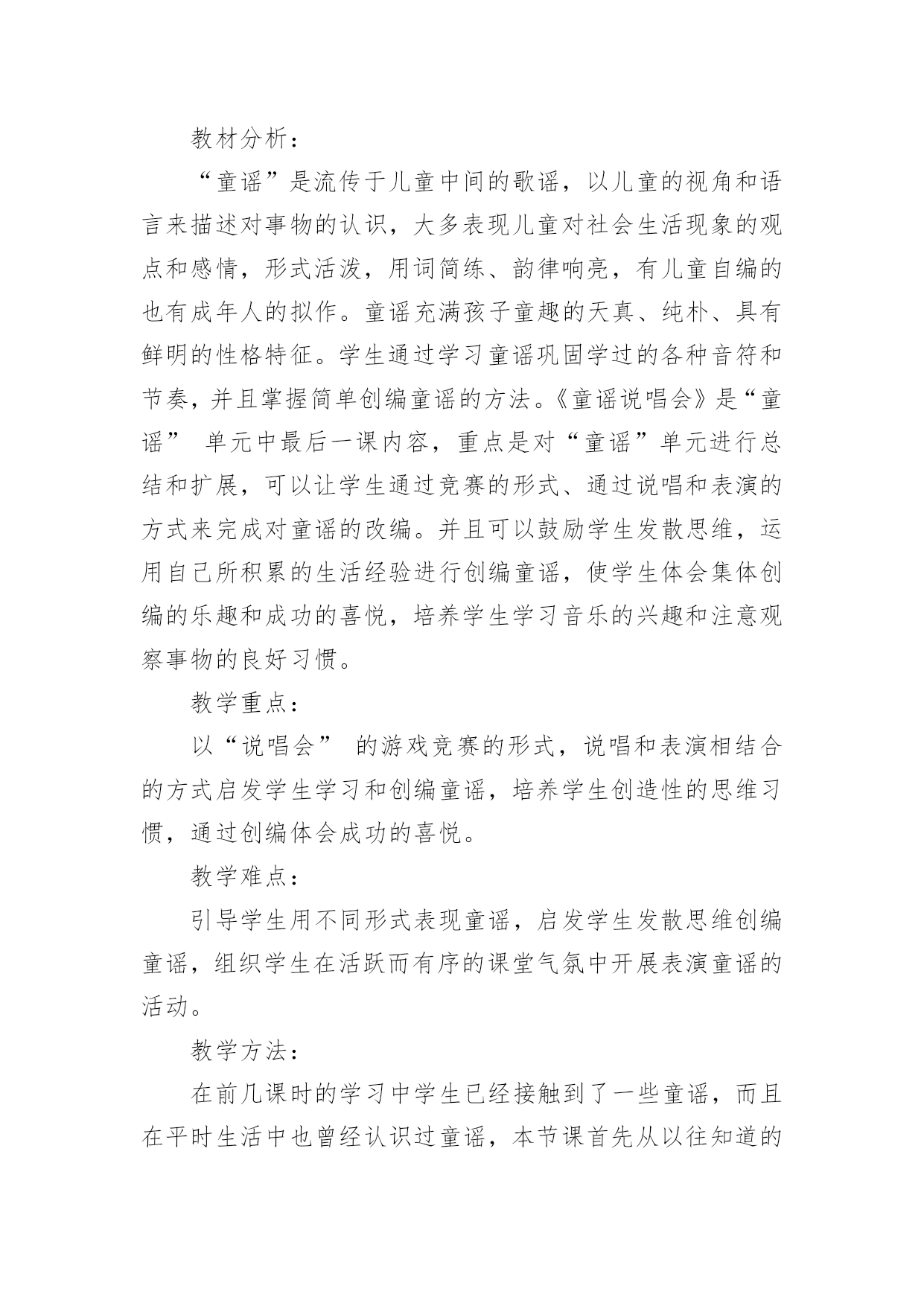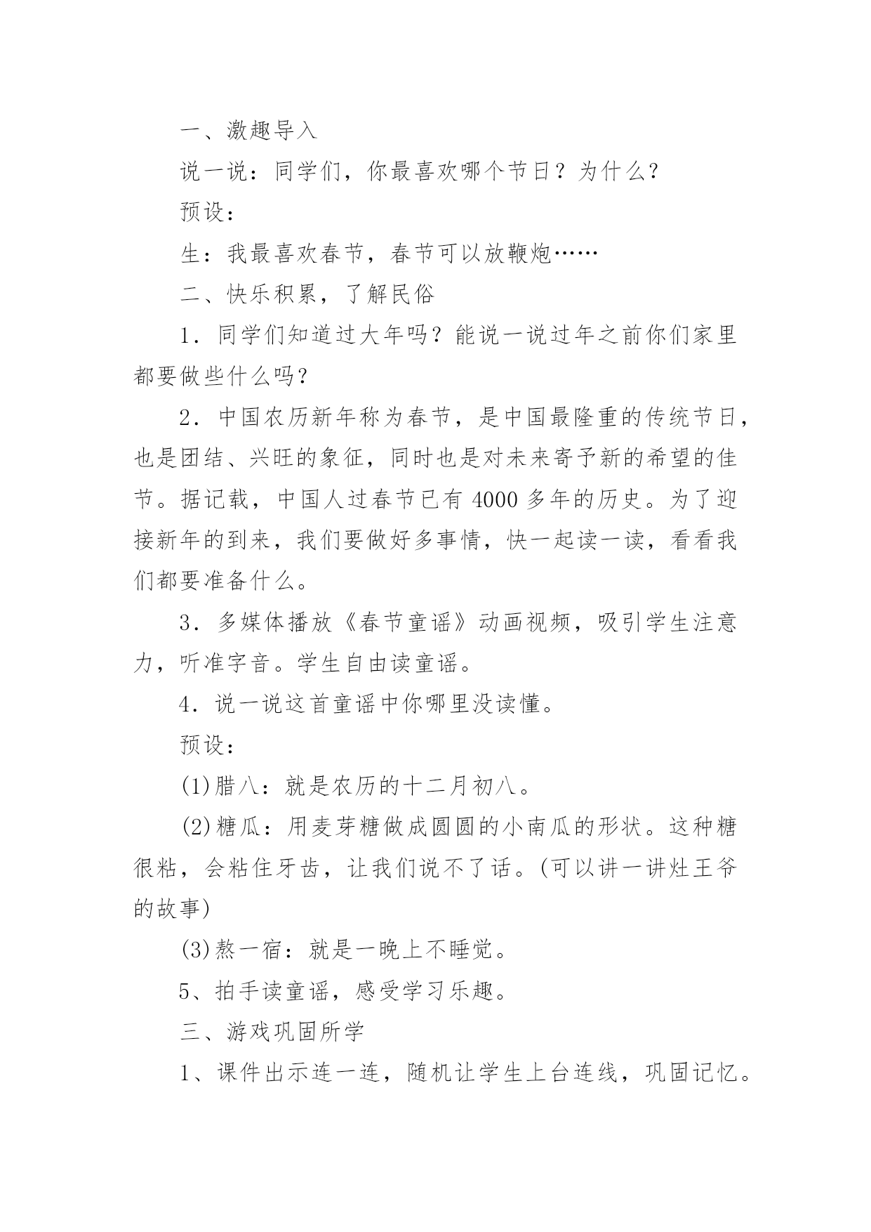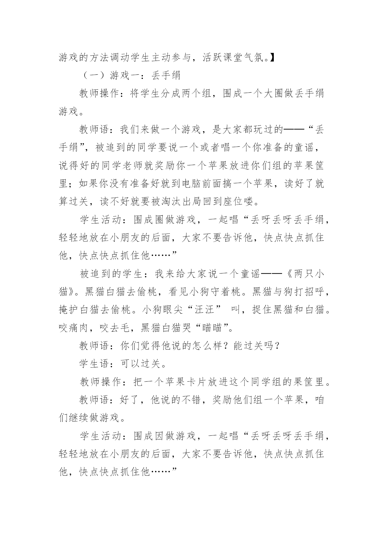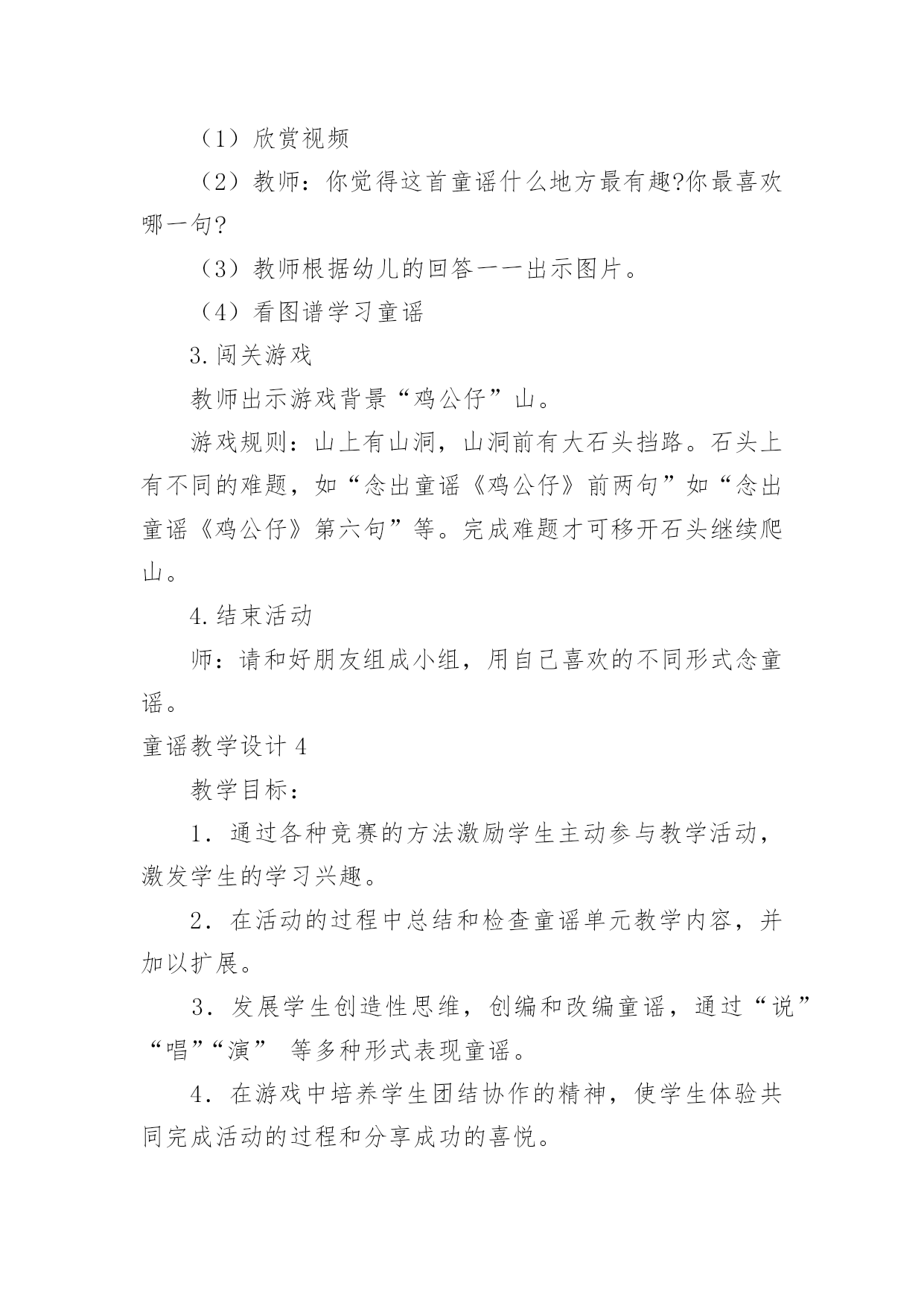 童谣教学设计童谣教学设计作为一名默默奉献的教育工作者,通常会被要求编写教学设计,教学设计是一个系统化规划教学系统的过程。那么什么样的教学设计才是好的呢?下面是小编整理的童谣教学设计,希望能够帮助到大家。童谣教学设计1教学目标:1、认识11个生字。2、正确、流利、有感情地朗读课文,体会风娃娃的好心和傻气。3、懂得“做事光有好的愿望不行,还要看是不是对别人有用”的的道理。重点难点:让学生知道风娃娃做了几件事,哪些做得好?哪些做得不好?教学过程第一课时一、谈话导入。同学们都一定很喜欢娃娃吧?你们自己有玩具娃娃吗?有什么娃娃?(结合学生的话,激发学生学习兴趣。)娃娃有很多种,有洋娃娃、木娃娃、布娃娃、泥娃娃。今天,咱们要认识一个新娃娃:(板书风娃娃,让学生齐读课题)。二、学习课文。1、感知课文,了解课文大意。(1)听课文录音,学生边听边画出生字。初步了解课文大意。(2)自由读课文,反复读带有生字的句子。2、自选板块,自主研读。3、通读全文,理清线索。读全文,看设影,想想风娃娃做了哪几件事情。学生汇报,老师板书:吹大风车,吹帆船,吹风筝,吹衣服、小树。以上几件事中,哪些是他做的好事?哪些是他做的坏事?4、提问设疑,小组研读。(1)风娃娃为什么想到帮人们做事?(2)风娃娃为什么好心办了坏事?(3)选择你最感兴趣的问题,在自学的基础上讨论。5、分块研读,反馈交流。(1)研读:“做好事”板块。(选择重点句子读一读,想一想。)风娃娃做了什么?结果怎样?风娃娃做了两件好事后,是怎样想的?读一读这一句话。从他心里想的,你体会到了什么?感受怎么样?(注重学生的情感体验和自身感受。)(2)研读“做坏事”板块。(选择重点句子读一读,想一想。)风娃娃做了什么?结果怎样?风娃娃听了人们的责怪,是怎样想的?读一读这句话。读读学习伙伴话,说说你想对风娃娃说什么?(3)请你评价一下,风娃娃是一个怎样的娃娃?(通过让学生体会、感受、评价、思考,明白做事情光有好的愿望不行,还要看是不是真的对别人有用的道理。)三、教师小结四、布置作业。第二课时差一、复习课文内容。1、练习朗读,思考:你能用自己的话说说曹冲称象的过程吗?2、练习背诵课文。二、学习本课的生字、新词,掌握识字规律。1、学习本课中“我会认”的生字,找到识字规律,引导学生自主识字。(1)出示写有“我会认”的生字卡片,引导学生认读。纠正读音。(2)请你仔细观察本课会认的生字,小组讨论识字方法。(3)学生汇报表演。A加偏旁方法记忆。B重点指导:艘微(4)反复认读,开展识字游戏。A“抓错游戏”教师故意读错字,请同学们指出,并加以改正。B“转字盘游戏”用硬纸制作字盘,分成十三格,分别写上本课的十三个生字,中间安个轴,让纸板转动,在黑板一处做个记号,把转字盘放在指定位置,转动后停下,说出汉字的字音。3、学习本课中“我会写”的生字,引导学生书写。(1)出示写有“我会写”的生字卡片,找准结构规律,指导学生书写。(2)这些字在结构上有什么特点。独体字:再、象左右结构:像、做上下结构:点、照(3)分别指导学生书写。(4)在指导中及时点评。三、课堂作业1、我会填。一()大官一()大秤一()线一()大船一()大树一()大象四、布置作业2、完成本课的生字、新词。3、练习讲故事《称象》。童谣教学设计2一、激趣导入说一说:同学们,你最喜欢哪个节日?为什么?预设:生:我最喜欢春节,春节可以放鞭炮……二、快乐积累,了解民俗1.同学们知道过大年吗?能说一说过年之前你们家里都要做些什么吗?2.中国农历新年称为春节,是中国最隆重的传统节日,也是团结、兴旺的象征,同时也是对未来寄予新的希望的佳节。据记载,中国人过春节已有4000多年的历史。为了迎接新年的到来,我们要做好多事情,快一起读一读,看看我们都要准备什么。3.多媒体播放《春节童谣》动画视频,吸引学生注意力,听准字音。学生自由读童谣。4.说一说这首童谣中你哪里没读懂。预设:(1)腊八:就是农历的十二月初八。(2)糖瓜:用麦芽糖做成圆圆的小南瓜的形状。这种糖很粘,会粘住牙齿,让我们说不了话。(可以讲一讲灶王爷的故事)(3)熬一宿:就是一晚上不睡觉。5、拍手读童谣,感受学习乐趣。三、游戏巩固所学1、课件出示连一连,随机让学生上台连线,巩固记忆。2.齐读童谣,熟读成诵。学生在朗读韵文的过程中一定会被其中的一些准备活动所吸引。教师为学生解疑的过程就是为孩子讲解中国风俗特色,激发学生的民族豪情的过程。四、布置作业1.和爸爸妈妈一起拍手说童谣。2.和家长一起读《春节童谣》,与家长进一步交流中国民俗的特色。童谣教学设计3活动目标1.感受粤语童谣的语言及韵律美。2.尝试用粤语积极参与游戏闯关活动,体验童谣带来的乐趣。3.萌发热爱家乡,热爱家乡语言的情感。活动准备1.童谣内容相符的图片2.音像视频活动过程1.朗