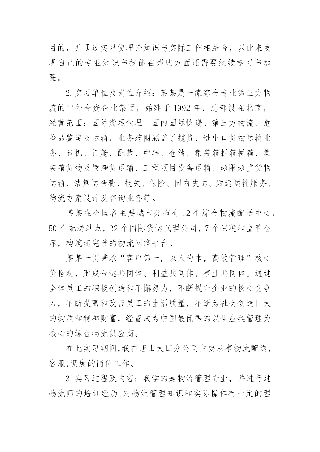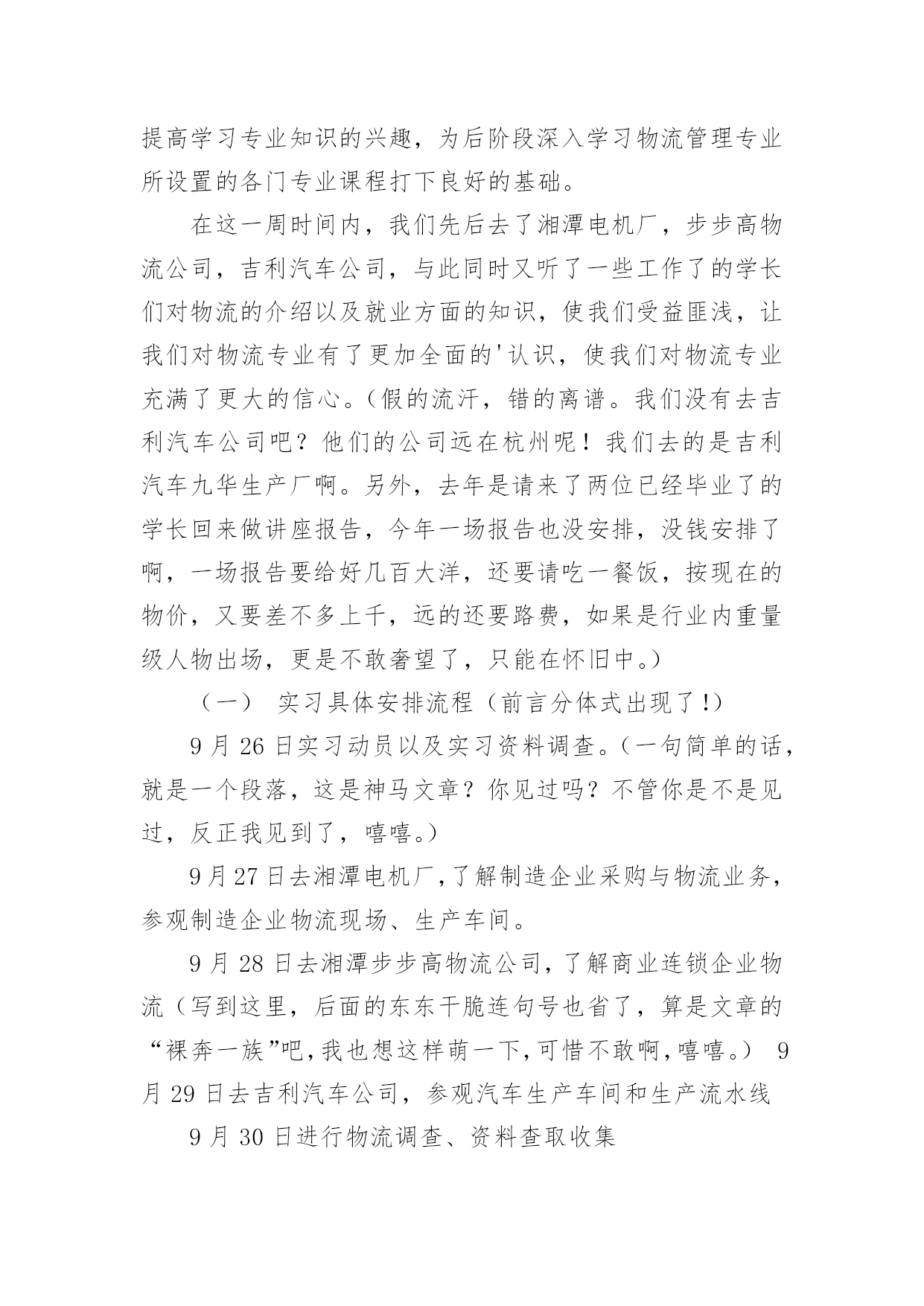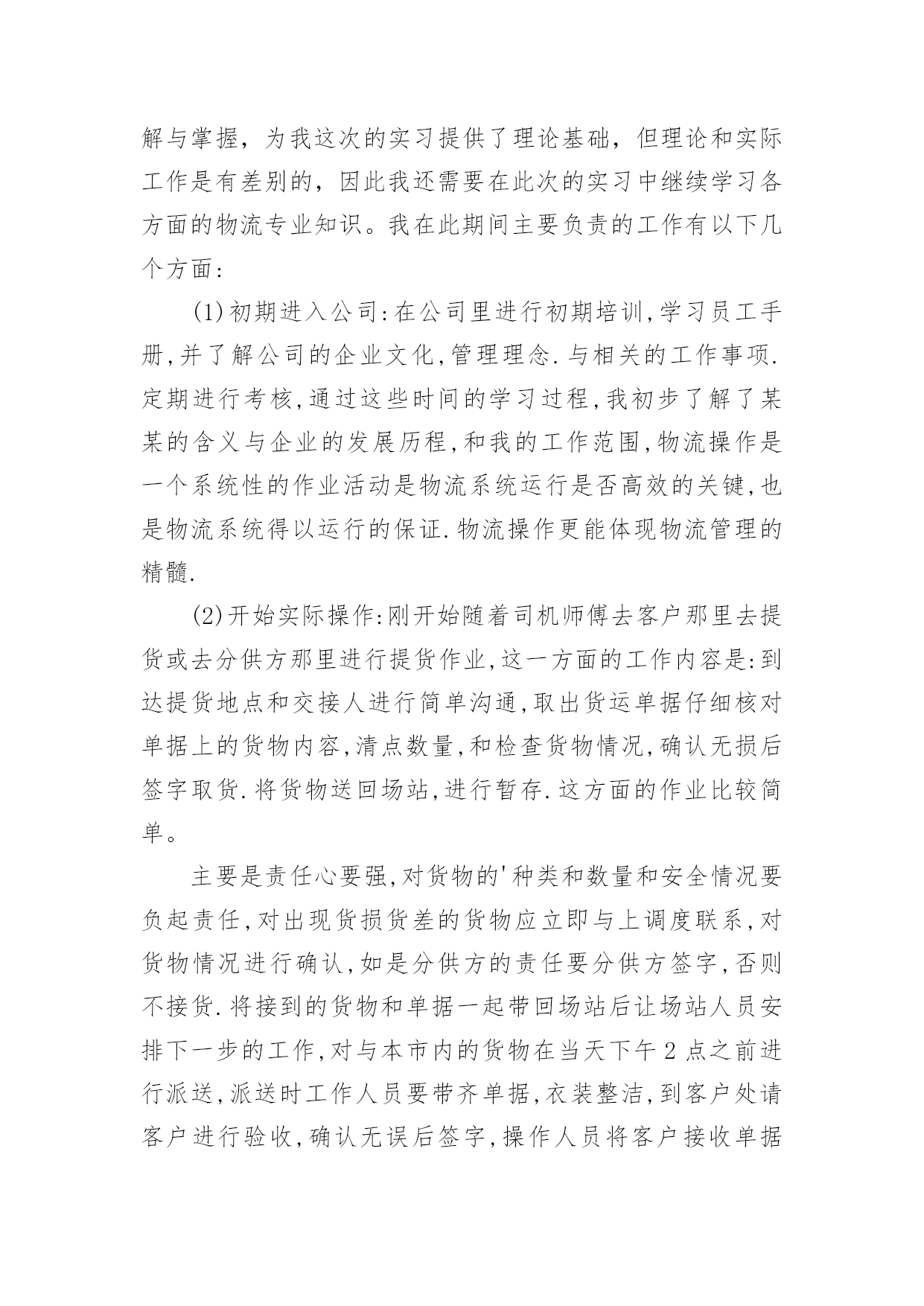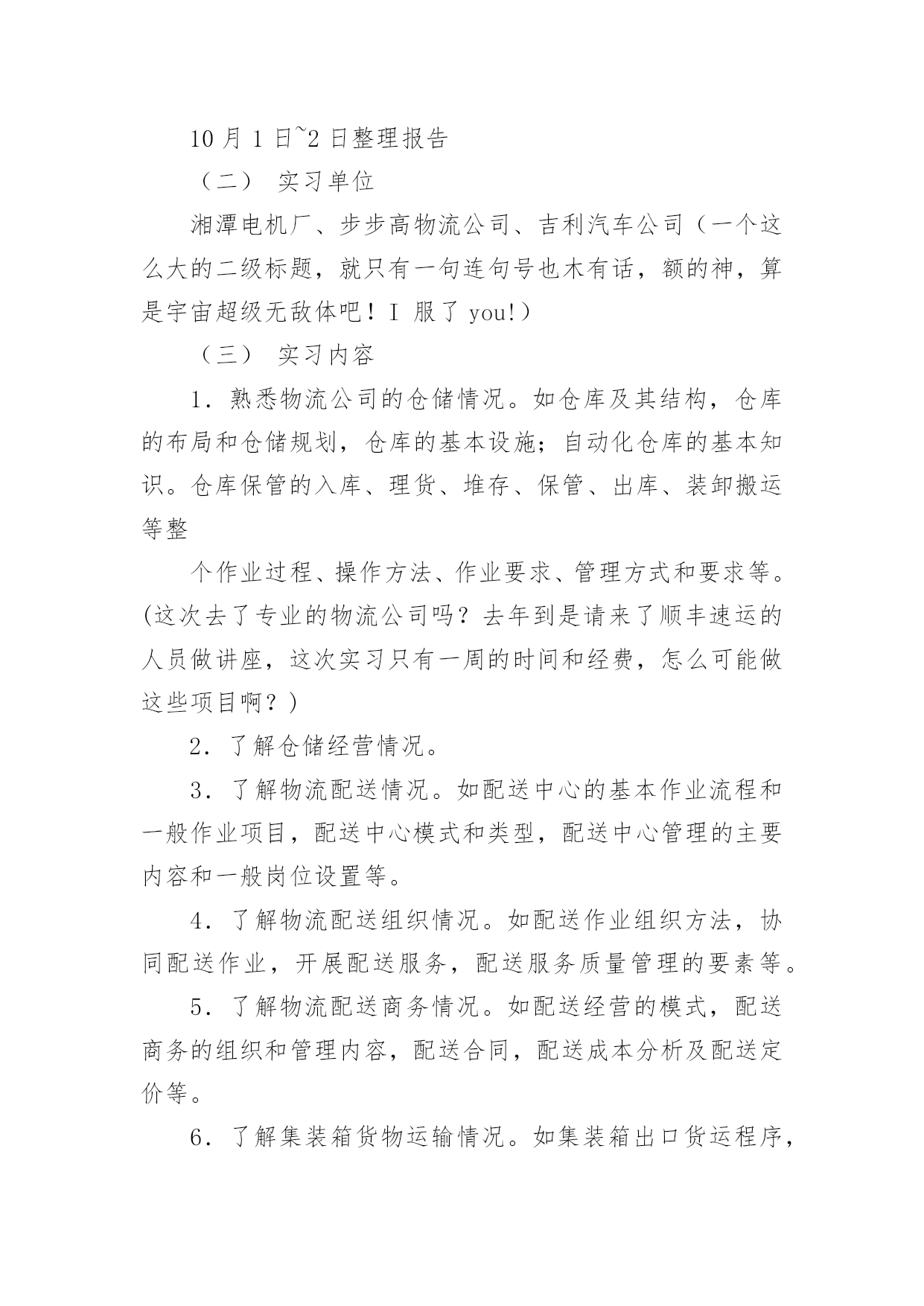 物流实习总结物流实习总结15篇总结是事后对某一时期、某一项目或某些工作进行回顾和分析,从而做出带有规律性的结论,它能帮我们理顺知识结构,突出重点,突破难点,是时候写一份总结了。你所见过的总结应该是什么样的?以下是小编精心整理的物流实习总结,仅供参考,大家一起来看看吧。物流实习总结1专业物流管理班级1002学号34(编外学生)学生姓名李智彬导师姓名孔夫子(编外没有老师,自己请的)完成日期前言(宋体、3号字、加粗、居中、段前段后各0.5)本次实习是物流管理专业入门的认识实习,实习的目的是初步了解物流管理在现代市场经济中的功能和地位,了解现代物流在工商企业中基本运作规律,参观了解物流场馆及设施装备,了解企业物流基本流程,增强对所学专业的感性认识,提高学习专业知识的兴趣,为后阶段深入学习物流管理专业所设置的各门专业课程打下良好的基础。本次实习时间为一周,即本学期第五周,实习内容主要是以多个物流主题认识调查为基础,结合企业指导老师的物流业务讲座和现场讲解,并对湘潭电机股份有限公司的部分生产分厂及仓库、湘潭步步高物流中心的各场馆、吉利汽车(九华厂)的整车生产流水线等场馆参观来进行的。主要实习过程如下:星期一,听取了物流专业认识实习动员报告,完成了物流行业主题认识调查;星期二,听取了湘电股份指导老师的。。。。。。。(“以此类推,等式成立”,嘻嘻)在指导老师不太精心的安排布置下,经过一周的实习,基本完成了各项实习任务,达到了预期的实习目的。(要自由发挥一些哦,嘻嘻)我相信每一位同学都会做的很优秀的,做文章时一定要严谨,尽量避免犯错误。做事谨慎,少犯错误,就会少一些指责,多一些开心哦,这是搜狐总裁张朝阳的人生格言。注意一下几点:前言不能加任何数字标记,如一、二、之类的;前言正文部分不能分几级标题,如(一)1.2.之类的;每一句语言要加以正确的标点符号;物流在企业里占据着怎样的地位,发挥着如何程度的作用?实际的企业物流与管理跟书本上的理论差距到底有多远?物流专业的学子未来的就业定位在哪里,我们应当具备怎样的实际能力?我们即将参观的企业拥有怎样的特点,我们实习到底要真正领会什么?本次实习是物流管理专业入门的认识实习,是为今后系统学习各门专业知识的必要环节。实习的目的是初步了解物流管理在现代市场经济中的功能和地位,了解现代物流在工商企业中基本运作规律,增强学生对所学专业的感性认识,提高学习专业知识的兴趣,为后阶段深入学习物流管理专业所设置的各门专业课程打下良好的基础。在这一周时间内,我们先后去了湘潭电机厂,步步高物流公司,吉利汽车公司,与此同时又听了一些工作了的学长们对物流的介绍以及就业方面的知识,使我们受益匪浅,让我们对物流专业有了更加全面的'认识,使我们对物流专业充满了更大的信心。(假的流汗,错的离谱。我们没有去吉利汽车公司吧?他们的公司远在杭州呢!我们去的是吉利汽车九华生产厂啊。另外,去年是请来了两位已经毕业了的学长回来做讲座报告,今年一场报告也没安排,没钱安排了啊,一场报告要给好几百大洋,还要请吃一餐饭,按现在的物价,又要差不多上千,远的还要路费,如果是行业内重量级人物出场,更是不敢奢望了,只能在怀旧中。)(一)实习具体安排流程(前言分体式出现了!)9月26日实习动员以及实习资料调查。(一句简单的话,就是一个段落,这是神马文章?你见过吗?不管你是不是见过,反正我见到了,嘻嘻。)9月27日去湘潭电机厂,了解制造企业采购与物流业务,参观制造企业物流现场、生产车间。9月28日去湘潭步步高物流公司,了解商业连锁企业物流(写到这里,后面的东东干脆连句号也省了,算是文章的“裸奔一族”吧,我也想这样萌一下,可惜不敢啊,嘻嘻。)9月29日去吉利汽车公司,参观汽车生产车间和生产流水线9月30日进行物流调查、资料查取收集10月1日~2日整理报告(二)实习单位湘潭电机厂、步步高物流公司、吉利汽车公司(一个这么大的二级标题,就只有一句连句号也木有话,额的神,算是宇宙超级无敌体吧!I服了you!)(三)实习内容1.熟悉物流公司的仓储情况。如仓库及其结构,仓库的布局和仓储规划,仓库的基本设施;自动化仓库的基本知识。仓库保管的入库、理货、堆存、保管、出库、装卸搬运等整个作业过程、操作方法、作业要求、管理方式和要求等。(这次去了专业的物流公司吗?去年到是请来了顺丰速运的人员做讲座,这次实习只有一周的时间和经费,怎么可能做这些项目啊?)2.了解仓储经营情况。3.了解物流配送情况。如配送中心的基本作业流程和一般作业项目,配送中心模式和类型,配送中心管理的主要内容和一般岗位设置等。4.了解物流配送组织情况。如配送作业组织方法,协同配送作业,开展配送服务,配送服务质量管理的要素等。5.了解物流配送商务情况。如配送经营的模式,配送商务的组织和管理内容,配送合同,配送成本分析及配送
