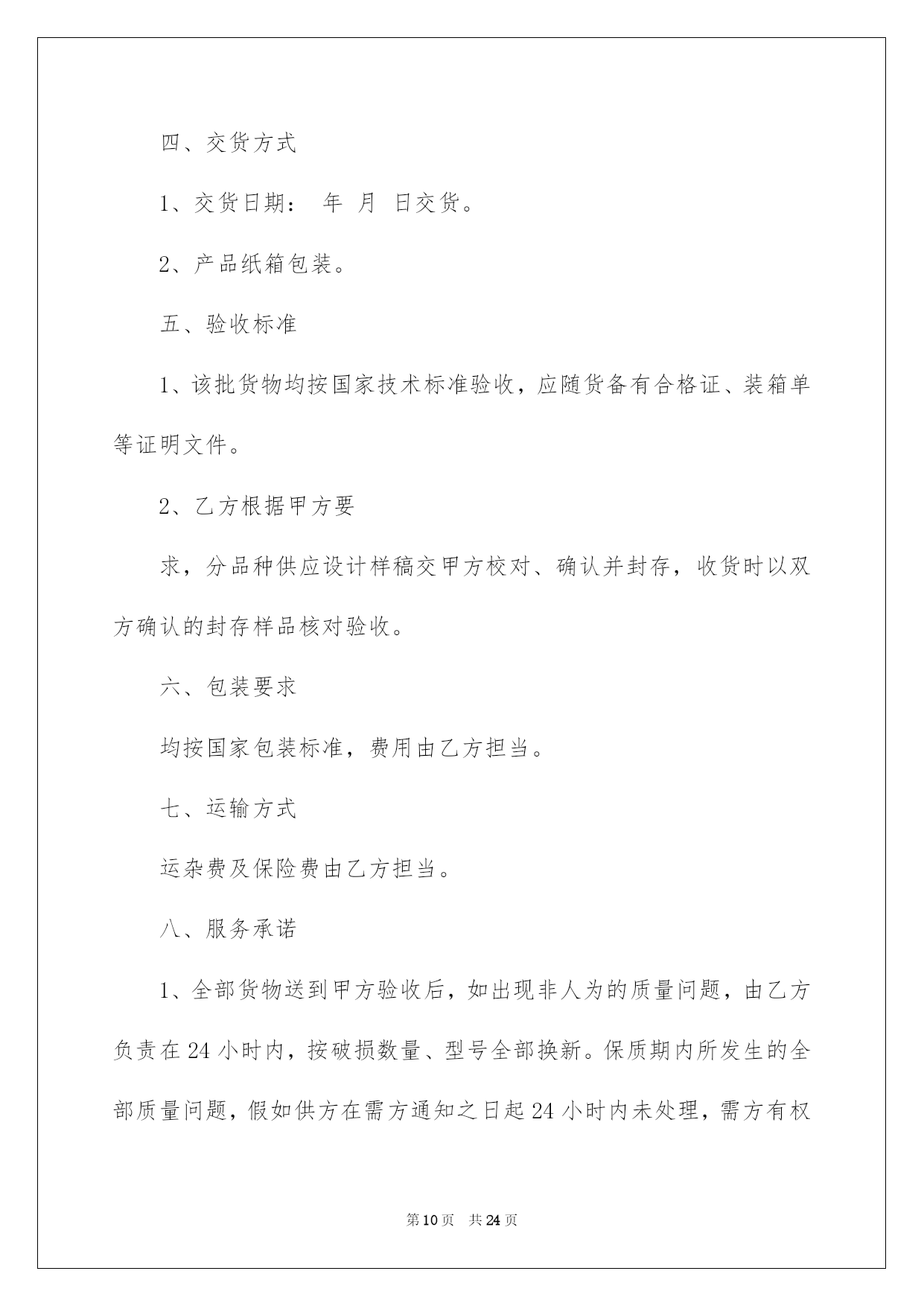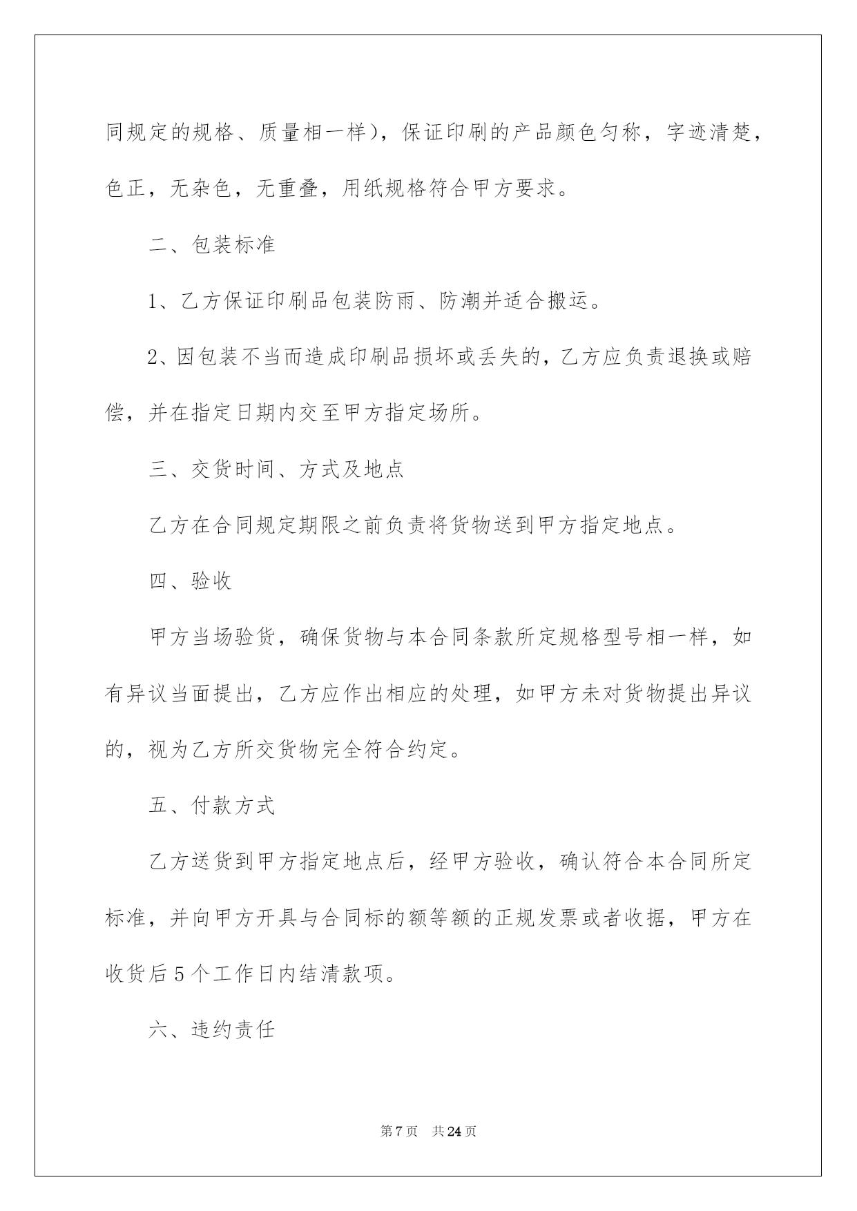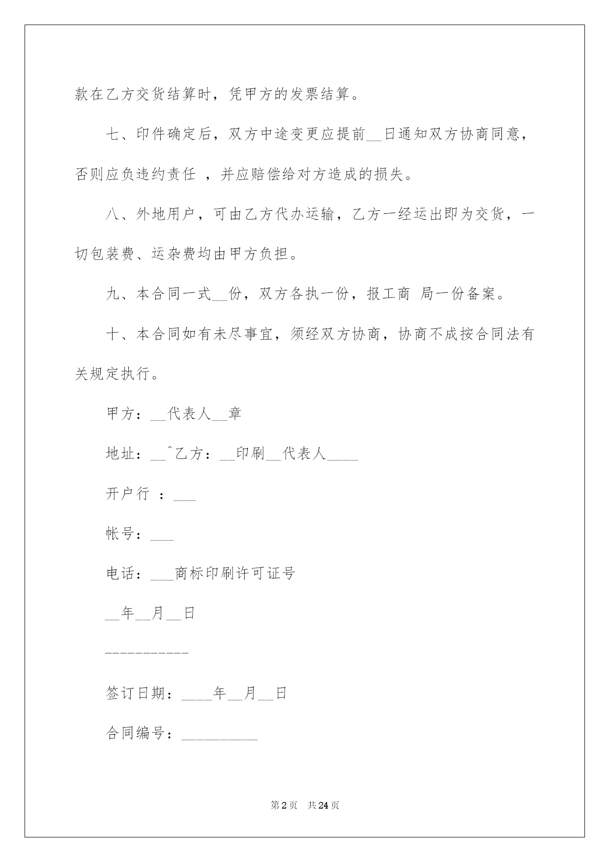 第PAGE\*Arabic\*MERGEFORMAT24页共NUMPAGES\*Arabic\*MERGEFORMAT24页第PAGE\*MERGEFORMAT24页共NUMPAGES\*MERGEFORMAT24页第PAGE\*MERGEFORMAT24页共NUMPAGES\*MERGEFORMAT24页第PAGE\*MERGEFORMAT24页共NUMPAGES\*MERGEFORMAT24页第PAGE\*MERGEFORMAT24页共NUMPAGES\*MERGEFORMAT24页第PAGE\*MERGEFORMAT24页共NUMPAGES\*MERGEFORMAT24页第PAGE\*MERGEFORMAT24页共NUMPAGES\*MERGEFORMAT24页第PAGE\*MERGEFORMAT24页共NUMPAGES\*MERGEFORMAT24页第PAGE\*MERGEFORMAT24页共NUMPAGES\*MERGEFORMAT24页第PAGE\*MERGEFORMAT24页共NUMPAGES\*MERGEFORMAT24页第PAGE\*MERGEFORMAT24页共NUMPAGES\*MERGEFORMAT24页2022印刷品购销合同印刷品购销合同8篇现今许多公民的维权意识在不断增加,合同出现的次数越来越多,签订合同也是避开争端的最好方式之一。那么合同要怎么拟定?想必这让大家都很苦恼吧,下面是我整理的印刷品购销合同,欢迎大家借鉴与参考,希望对大家有所帮助。印刷品购销合同1兹因甲方生产须要向乙方订印下列印刷品,经双方协商同意订立合同如下:一、印刷品名称、数量及交货日期:品名规格单位数量安排单价金额用料交货期二、加工原料:三、质量和式样:①质量:②式样:四、定货数量的差额幅度:五、货款结算,凭运输部门的运单向银行办理托收。六、原材料供应:甲方来料加工者,应由乙方作运货处理,其货款在乙方交货结算时,凭甲方的发票结算。七、印件确定后,双方中途变更应提前__日通知双方协商同意,否则应负违约责任,并应赔偿给对方造成的损失。八、外地用户,可由乙方代办运输,乙方一经运出即为交货,一切包装费、运杂费均由甲方负担。九、本合同一式__份,双方各执一份,报工商局一份备案。十、本合同如有未尽事宜,须经双方协商,协商不成按合同法有关规定执行。甲方:__代表人__章地址:__^乙方:__印刷__代表人____开户行:___帐号:___电话:___商标印刷许可证号__年__月__日-----------签订日期:____年__月__日合同编号:__________签约时间:__________签约地点:__________供方:____________需方:____________1.本合同是依照《中华人民共和国合同法》订立的,经双方签字盖章后,即发生法律效力,双方必需严格履行。2.合同条款:①签订双方商妥订货产品总值人民币____元。其产品名称的规格、质量、数量、单价、总值、交货付款等详如附表。②产品及原材料检验方法;③产品价格规定;④产品的包装方法及费用负担;⑤产品交货方法及费用负担;⑥货款及费用等结算方法;⑦补充条款。3.经济责任:(1)供方如未能履行合同,须负下列责任:①产品花色、品种、规格、质量不符合同规定:需方同意利用的,按质论价,退货贬值总值价款,不能利用的,应负责保修、保退、保换。由于延误交货时间,每天应偿付需方千分之__的罚款。②产品数量不符合规定:少交需方仍有须要的照数补交;因延期而不要的,可以退货,并担当因此而造成的损失;不能交货的,应偿付需方以不能交货的货款总值的百分之___的罚金。③产品包装不符合同规定:应负责返修或重新包装。并担当支付的费用;需方不要求返修或重新包装,应偿付不符合同规定包装价值的千分之__的罚金。(2)需方未能履行合同时,须负以下责任:①中途变更产品花色、品种、规格、质量或包装的规格,应偿付变更部分货款(或包装价值)总值百分之__罚金。②中途退货,由双方依据实际状况商定,同意退货的偿付退货部分货款总值千分之__的罚金。③未按规定的时间和要求交原材料或技术、资金、包装物,除交货日期得以顺延外,应偿付顺延交货产品总值每日千分之__的罚金;不能供应时,视同中途退货处理。④自提产品未按规定日期提货,每延期一天,应偿付供方以延期提货部分货款总额千分之__罚金。⑤未按规定日期付款,每延期一天,应偿付以延期付款总额千分之__的罚金。⑥实行送货或代运的产品拒绝接货,应担当由此而造成的损失和运输费用及罚金。(3)产品价格:如须要调整,必需经双方协商方能变更。(4