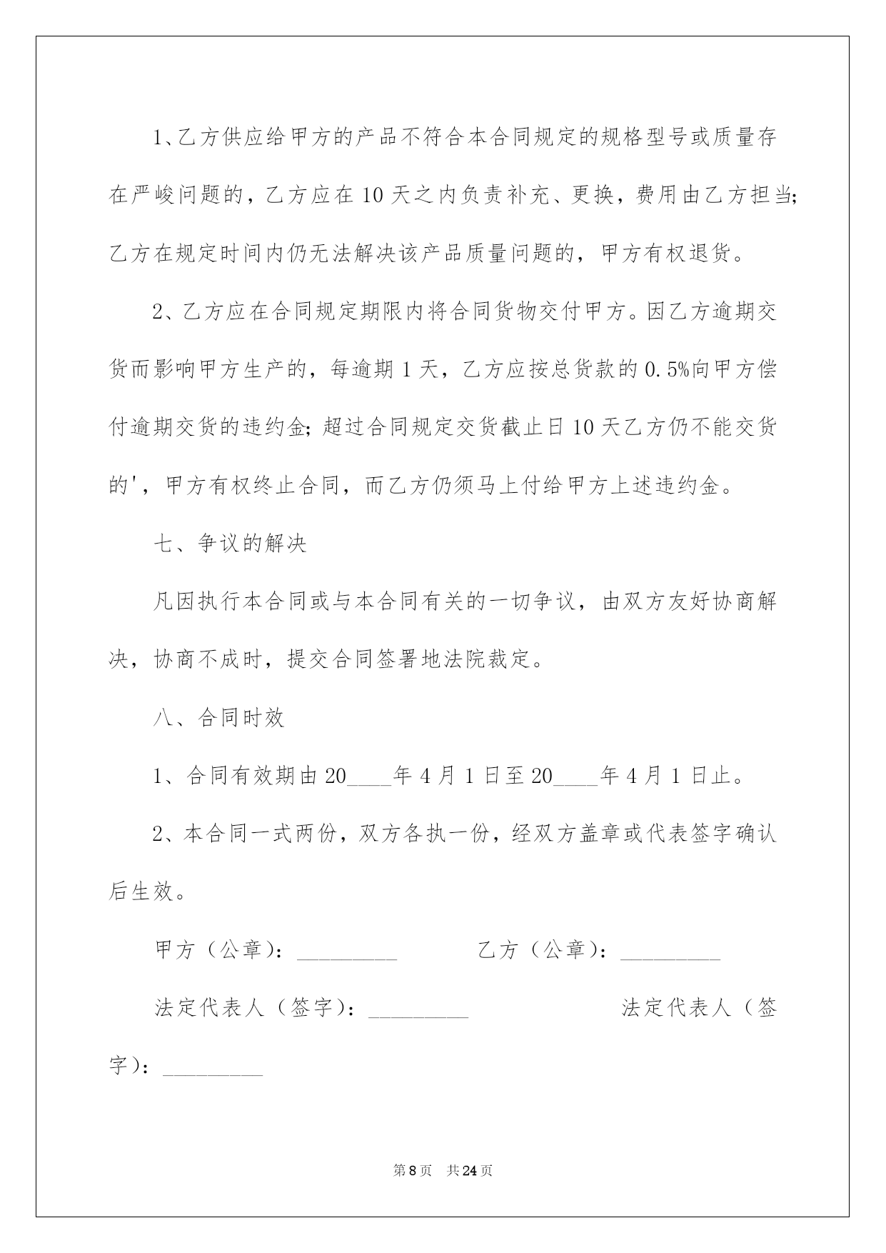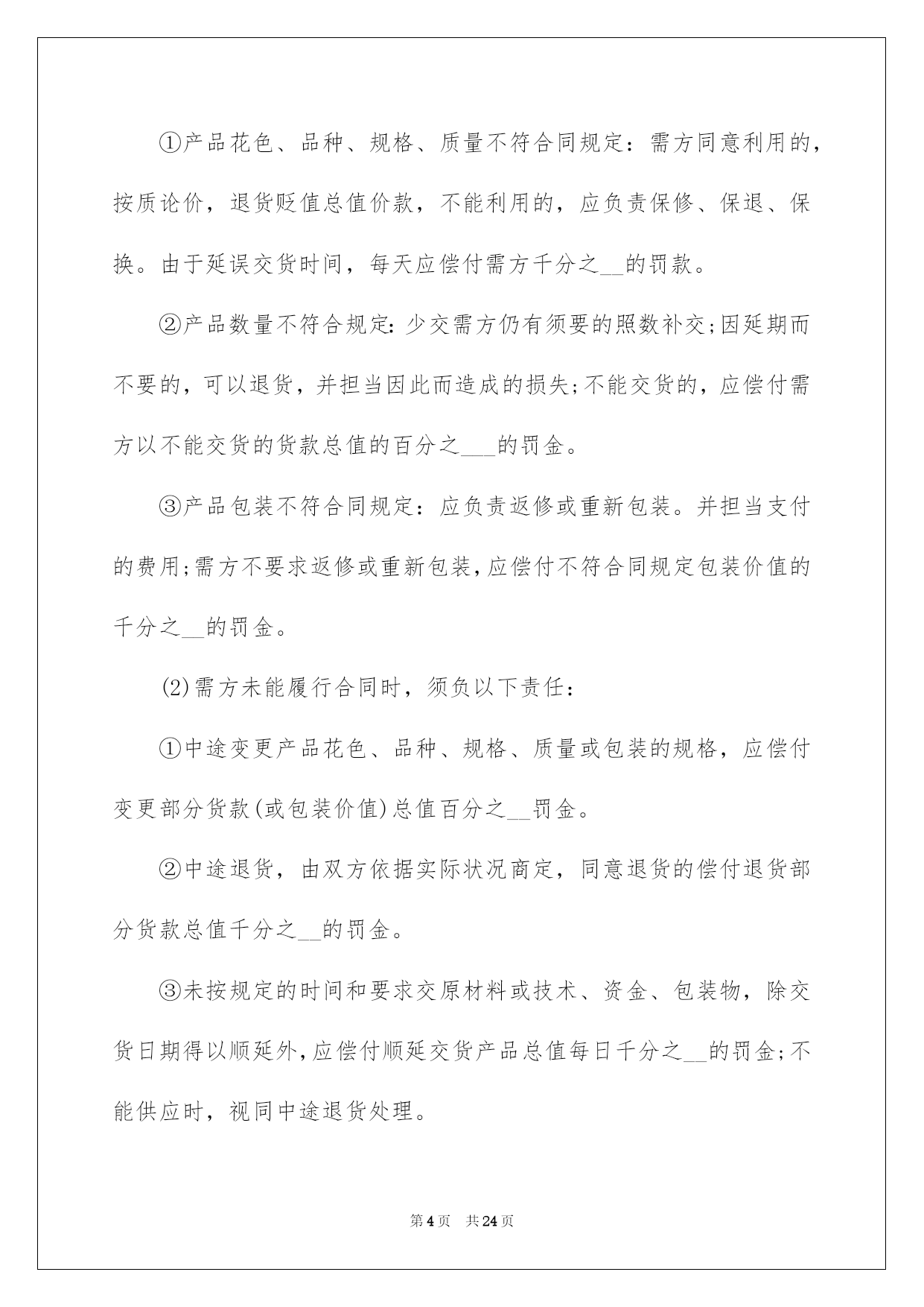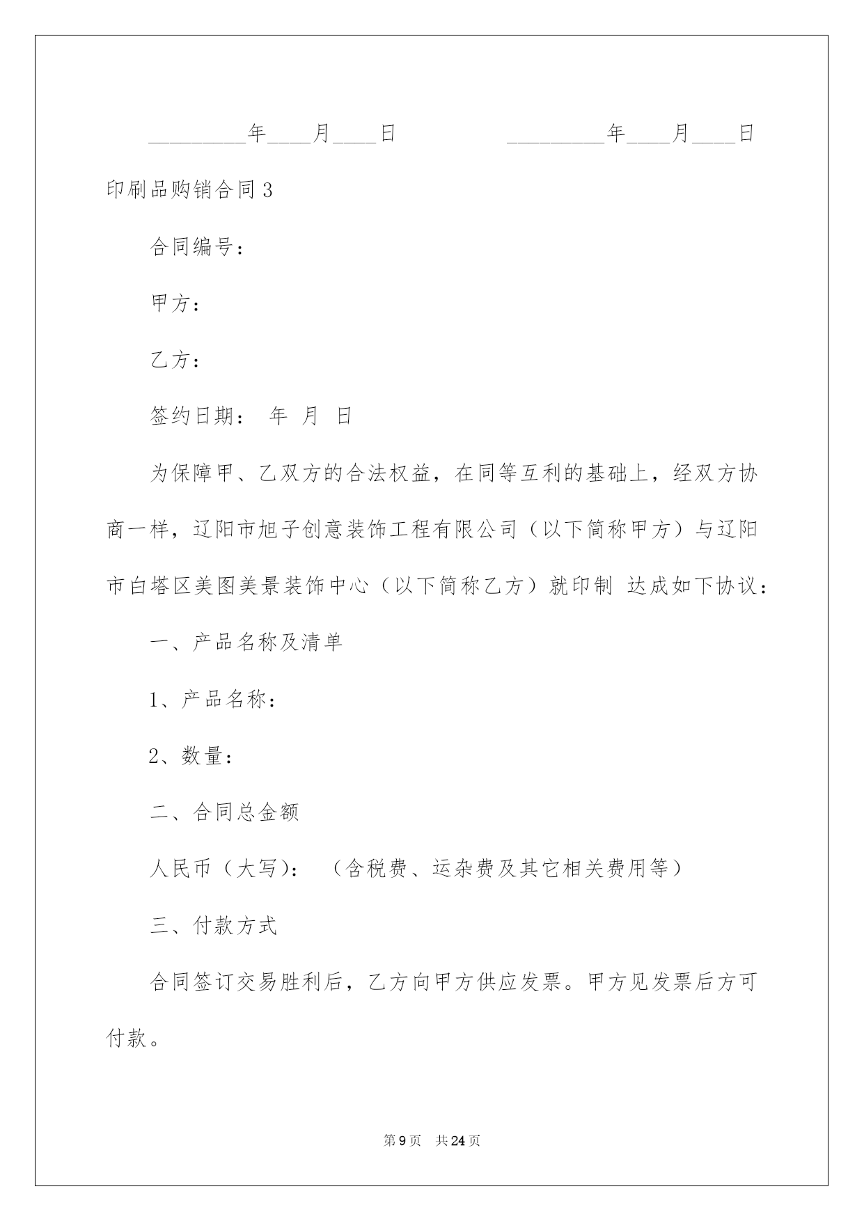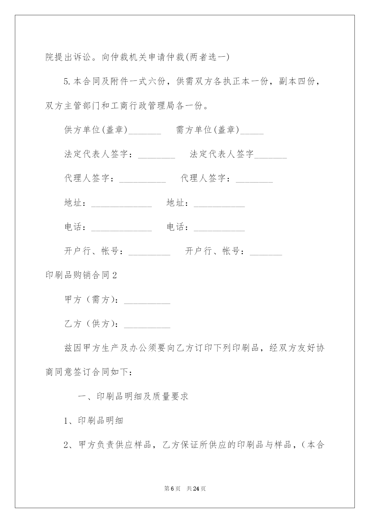第PAGE\*Arabic\*MERGEFORMAT24页共NUMPAGES\*Arabic\*MERGEFORMAT24页第PAGE\*MERGEFORMAT24页共NUMPAGES\*MERGEFORMAT24页第PAGE\*MERGEFORMAT24页共NUMPAGES\*MERGEFORMAT24页第PAGE\*MERGEFORMAT24页共NUMPAGES\*MERGEFORMAT24页第PAGE\*MERGEFORMAT24页共NUMPAGES\*MERGEFORMAT24页第PAGE\*MERGEFORMAT24页共NUMPAGES\*MERGEFORMAT24页第PAGE\*MERGEFORMAT24页共NUMPAGES\*MERGEFORMAT24页第PAGE\*MERGEFORMAT24页共NUMPAGES\*MERGEFORMAT24页第PAGE\*MERGEFORMAT24页共NUMPAGES\*MERGEFORMAT24页第PAGE\*MERGEFORMAT24页共NUMPAGES\*MERGEFORMAT24页第PAGE\*MERGEFORMAT24页共NUMPAGES\*MERGEFORMAT24页2022印刷品购销合同印刷品购销合同8篇现今许多公民的维权意识在不断增加,合同出现的次数越来越多,签订合同也是避开争端的最好方式之一。那么合同要怎么拟定?想必这让大家都很苦恼吧,下面是我整理的印刷品购销合同,欢迎大家借鉴与参考,希望对大家有所帮助。印刷品购销合同1兹因甲方生产须要向乙方订印下列印刷品,经双方协商同意订立合同如下:一、印刷品名称、数量及交货日期:品名规格单位数量安排单价金额用料交货期二、加工原料:三、质量和式样:①质量:②式样:四、定货数量的差额幅度:五、货款结算,凭运输部门的运单向银行办理托收。六、原材料供应:甲方来料加工者,应由乙方作运货处理,其货款在乙方交货结算时,凭甲方的发票结算。七、印件确定后,双方中途变更应提前__日通知双方协商同意,否则应负违约责任,并应赔偿给对方造成的损失。八、外地用户,可由乙方代办运输,乙方一经运出即为交货,一切包装费、运杂费均由甲方负担。九、本合同一式__份,双方各执一份,报工商局一份备案。十、本合同如有未尽事宜,须经双方协商,协商不成按合同法有关规定执行。甲方:__代表人__章地址:__^乙方:__印刷__代表人____开户行:___帐号:___电话:___商标印刷许可证号__年__月__日-----------签订日期:____年__月__日合同编号:__________签约时间:__________签约地点:__________供方:____________需方:____________1.本合同是依照《中华人民共和国合同法》订立的,经双方签字盖章后,即发生法律效力,双方必需严格履行。2.合同条款:①签订双方商妥订货产品总值人民币____元。其产品名称的规格、质量、数量、单价、总值、交货付款等详如附表。②产品及原材料检验方法;③产品价格规定;④产品的包装方法及费用负担;⑤产品交货方法及费用负担;⑥货款及费用等结算方法;⑦补充条款。3.经济责任:(1)供方如未能履行合同,须负下列责任:①产品花色、品种、规格、质量不符合同规定:需方同意利用的,按质论价,退货贬值总值价款,不能利用的,应负责保修、保退、保换。由于延误交货时间,每天应偿付需方千分之__的罚款。②产品数量不符合规定:少交需方仍有须要的照数补交;因延期而不要的,可以退货,并担当因此而造成的损失;不能交货的,应偿付需方以不能交货的货款总值的百分之___的罚金。③产品包装不符合同规定:应负责返修或重新包装。并担当支付的费用;需方不要求返修或重新包装,应偿付不符合同规定包装价值的千分之__的罚金。(2)需方未能履行合同时,须负以下责任:①中途变更产品花色、品种、规格、质量或包装的规格,应偿付变更部分货款(或包装价值)总值百分之__罚金。②中途退货,由双方依据实际状况商定,同意退货的偿付退货部分货款总值千分之__的罚金。③未按规定的时间和要求交原材料或技术、资金、包装物,除交货日期得以顺延外,应偿付顺延交货产品总值每日千分之__的罚金;不能供应时,视同中途退货处理。④自提产品未按规定日期提货,每延期一天,应偿付供方以延期提货部分货款总额千分之__罚金。⑤未按规定日期付款,每延期一天,应偿付以延期付款总额千分之__的罚金。⑥实行送货或代运的产品拒绝接货,应担当由此而造成的损失和运输费用及罚金。(3)产品价格:如须要调整,必需经双方协商方能变更。(4