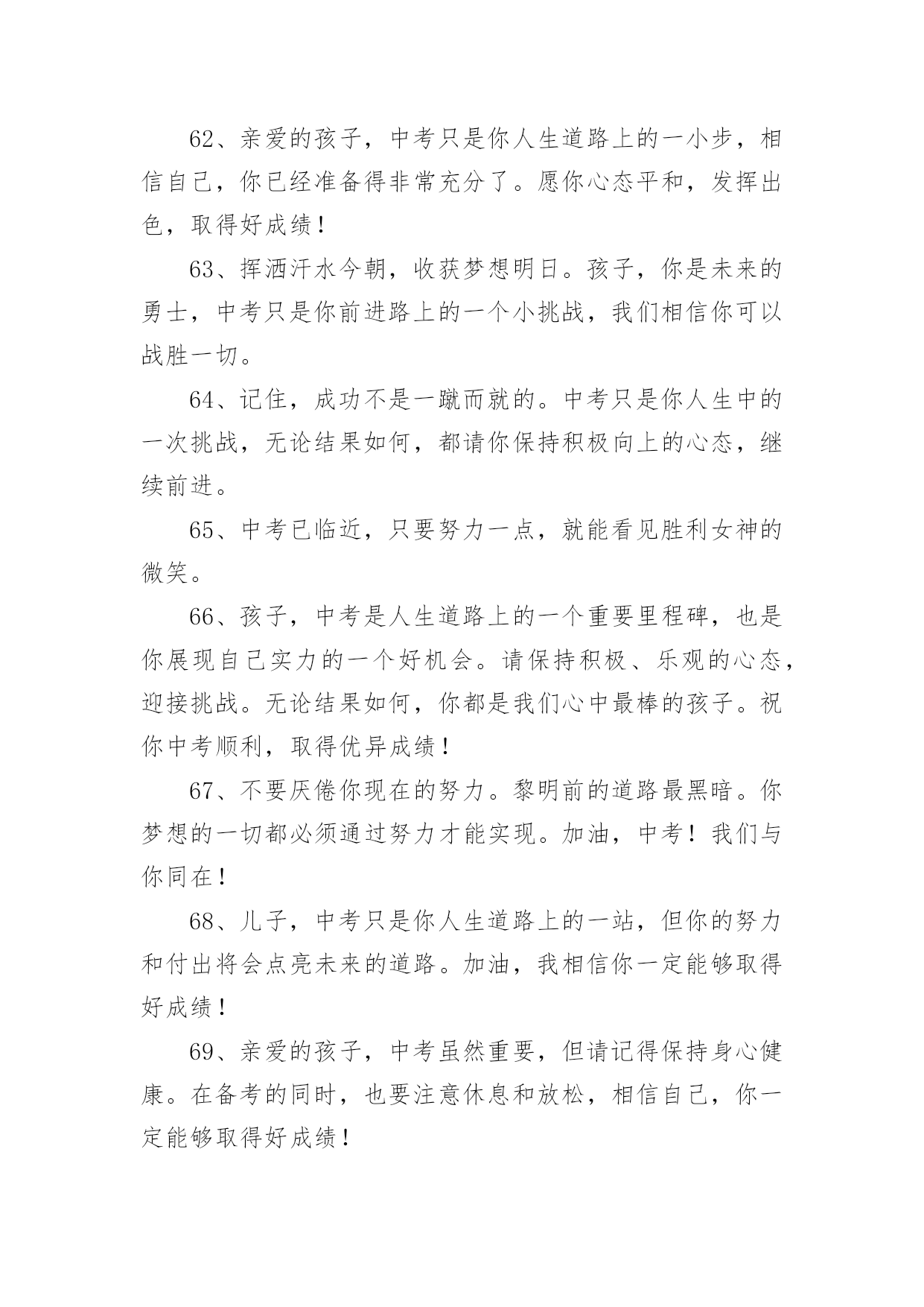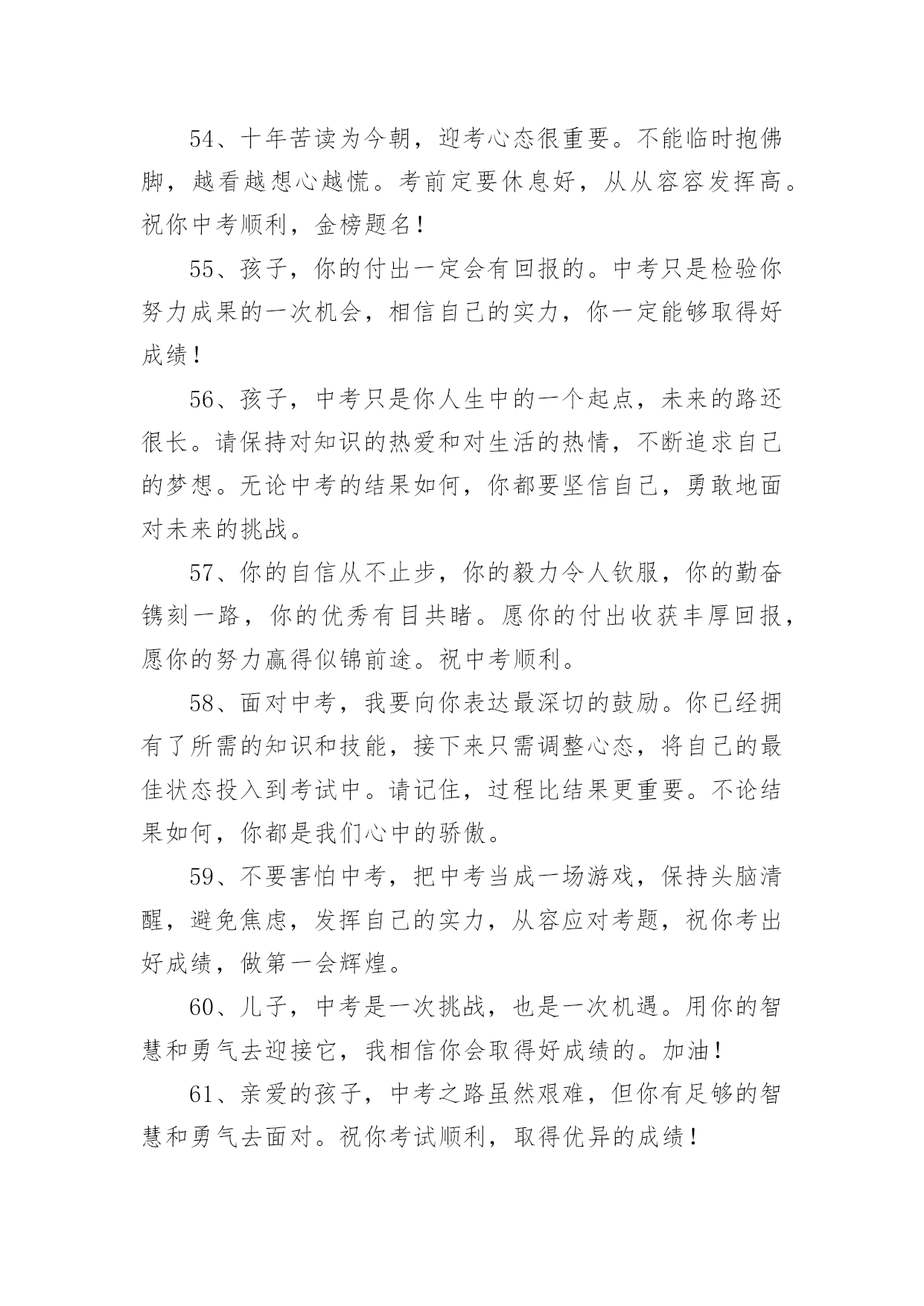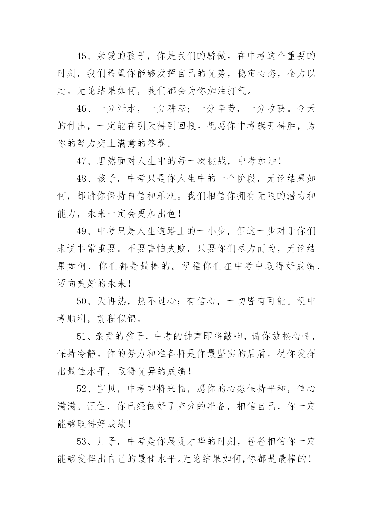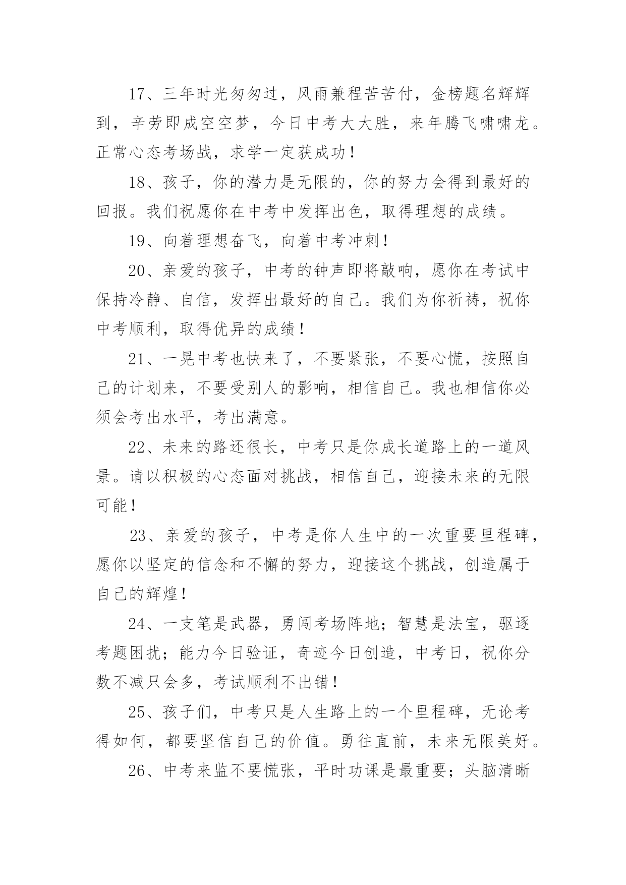 家长中考加油祝福语家长中考加油祝福语(精选360句)中考对每一位同学来说是接受九年义务教育的终结性评价,是人生求学路上的一次选择。以下是小编整理的家长中考加油祝福语,欢迎阅读!1、中考是比知识、比能力、比心理、比信心、比体力的一场综合考试。2、中考的日子,是金色的日子,是成功的开始,因为我问心无愧,胸有成竹。3、中考着实是一种丰收,它包蕴着太多的内涵!无论高考成绩如何,你的成长与成熟是任何人无法改变的事实,这三年的辛勤走过,你获得的太多太多!4、亲爱的孩子,明天就是你三年初中生活的终点了,祝你中考顺利!5、中考之日又来临,考生家长心如焚。子女面前莫表现,压力太大难发挥。营养餐要准备好,不能太荤坏肠胃。保证孩子睡眠好,从从容容应中考。祝捷报早传,开心欢笑!6、考场不是战场,让心保持平常。自信不要怯场,记得冷静登场。千万不要紧张,放手一搏何妨。别管结果如何,至少无悔衷肠。祝你中考顺利,早日题名金榜!7、明天就是中考了,希望在这最后的日子,你能满怀着信心,发挥出你最好的水平,考出最好的成绩!加油!好好发挥,老哥支持你!8、这两天的中考过程中,要调整好自己的情绪,考过一门,就不要再想了,重要的是吃好,喝好,休息好,营造一种良好的应考氛围,祝愿你中考顺利!9、咬定学习不放松,立根原在努力中千磨万击还奋斗,任尔中考风!10、孩子,你已经付出了很多,现在是时候展现你的成果了。相信自己,你一定能够在中考中取得好成绩!11、青春飞扬,梦想飞扬,中考的试卷在飞扬;希望飞扬,愿望飞扬,中考的志向在飞扬;从容以对,笑傲考场,优异的发挥在考场。祝你中考顺利!12、亲爱的孩子,中考是一个展示你才华和能力的舞台,愿你能够珍惜这次机会,全力以赴,为自己的梦想奋斗!13、皎洁的月光照亮了你人生旅途的崭新路标,祝福赠予你生活斑斓的色彩,路在脚下,梦想就在离你不远的地方,我会一直守候在你身旁。祝愿中考顺利!14、孩子,中考是检验你努力与付出的时刻,相信你的努力会有回报。愿你考场上冷静自若,发挥出自己的最佳状态!15、无论中考的结果如何,你都是最棒的。请相信自己的实力,相信你的未来一片光明,只要勇往直前,你必将取得更大的成就!16、成长的道路上,难免有些波澜,愿你放平心态勇往直前,祝你中考大捷!17、三年时光匆匆过,风雨兼程苦苦付,金榜题名辉辉到,辛劳即成空空梦,今日中考大大胜,来年腾飞啸啸龙。正常心态考场战,求学一定获成功!18、孩子,你的潜力是无限的,你的努力会得到最好的回报。我们祝愿你在中考中发挥出色,取得理想的成绩。19、向着理想奋飞,向着中考冲刺!20、亲爱的孩子,中考的钟声即将敲响,愿你在考试中保持冷静、自信,发挥出最好的自己。我们为你祈祷,祝你中考顺利,取得优异的成绩!21、一晃中考也快来了,不要紧张,不要心慌,按照自己的计划来,不要受别人的影响,相信自己。我也相信你必须会考出水平,考出满意。22、未来的路还很长,中考只是你成长道路上的一道风景。请以积极的心态面对挑战,相信自己,迎接未来的无限可能!23、亲爱的孩子,中考是你人生中的一次重要里程碑,愿你以坚定的信念和不懈的努力,迎接这个挑战,创造属于自己的辉煌!24、一支笔是武器,勇闯考场阵地;智慧是法宝,驱逐考题困扰;能力今日验证,奇迹今日创造,中考日,祝你分数不减只会多,考试顺利不出错!25、孩子们,中考只是人生路上的一个里程碑,无论考得如何,都要坚信自己的价值。勇往直前,未来无限美好。26、中考来监不要慌张,平时功课是最重要;头脑清晰思维敏捷,细心审题错误减少;清淡饮食重营养,适当休息重健康;祝你考取好成绩,鱼跃龙门自然好!27、中考是人生的重要一步,愿你在知识的海洋里乘风破浪,勇往直前。记住,无论结果如何,你都是最棒的!加油,孩子!28、紧张而有序,效率是关键。祝愿中考旗开得胜,一鸣惊人金榜题名!29、面对中考,请保持冷静与乐观。不要过分关注结果,重要的是享受努力的过程。勇敢面对挑战,你的每一次努力都不会被辜负。相信自己的实力,你一定能取得佳绩!30、亲爱的孩子,中考即将来临,愿你以坚定的信念和扎实的准备迎接挑战,取得优异的成绩!31、亲爱的孩子,中考只是人生中的一站,我们相信你一定会全力以赴,发挥出自己的最佳水平。加油,你是最棒的!32、中考的日子又要到了。饭后要好好吃饭,好好睡几天,打起精神,迎接中考。胸有自信很重要。你要坦然微笑,做好充分拥抱中考的准备,祝中考成功。33、勇敢面对挑战,自信迎战中考。你充满了潜力和才华,相信自己的实力,一定能取得优异的成绩。我们为你骄傲,加油!34、亲爱的孩子,中考只是你人生道路上的一道关卡,无论结果如何,爸爸都为你骄傲。愿你全力以赴,不留遗憾,加油!35、孩子,你的努力和汗水我们都看在眼里,记在心里。中考只是你迈向更高目标的第一步,相信你一定能够发挥出