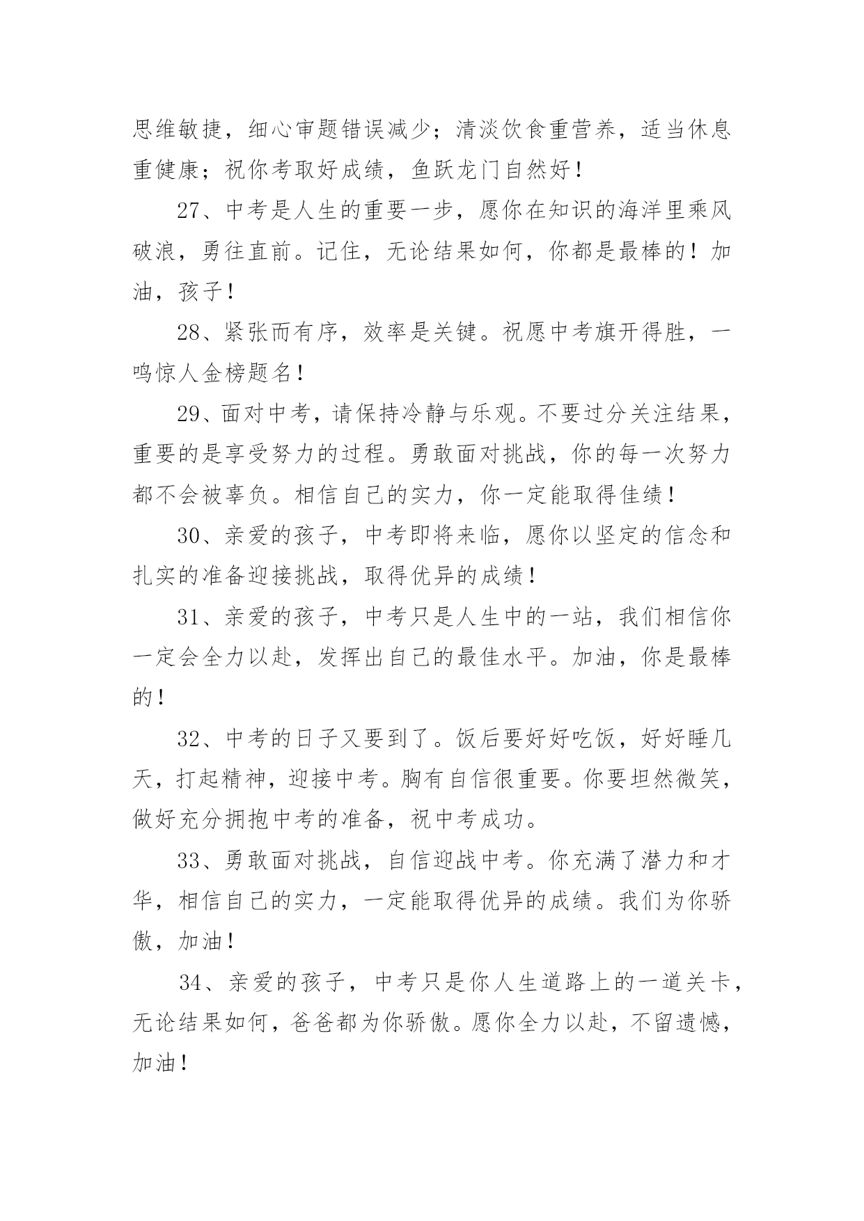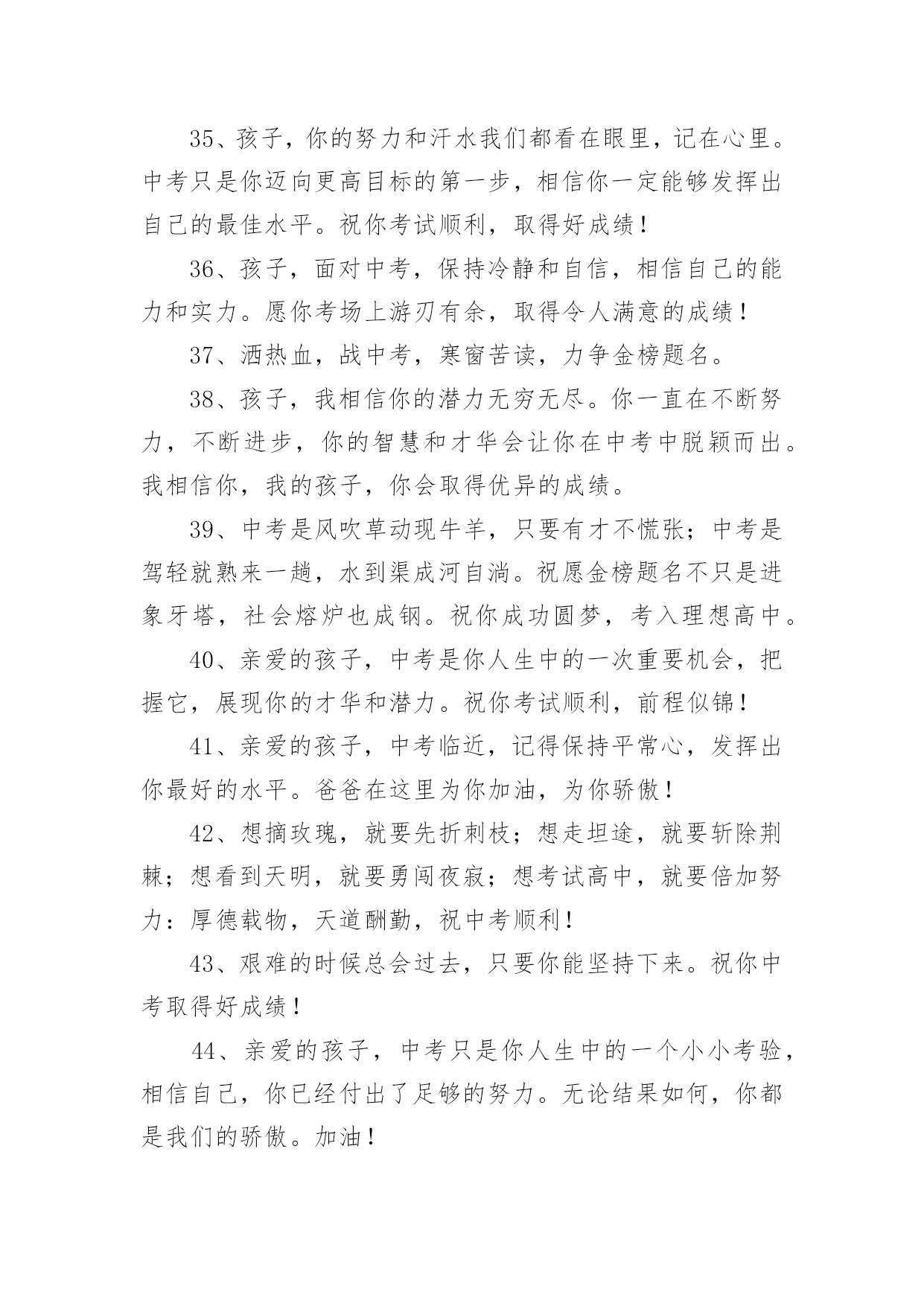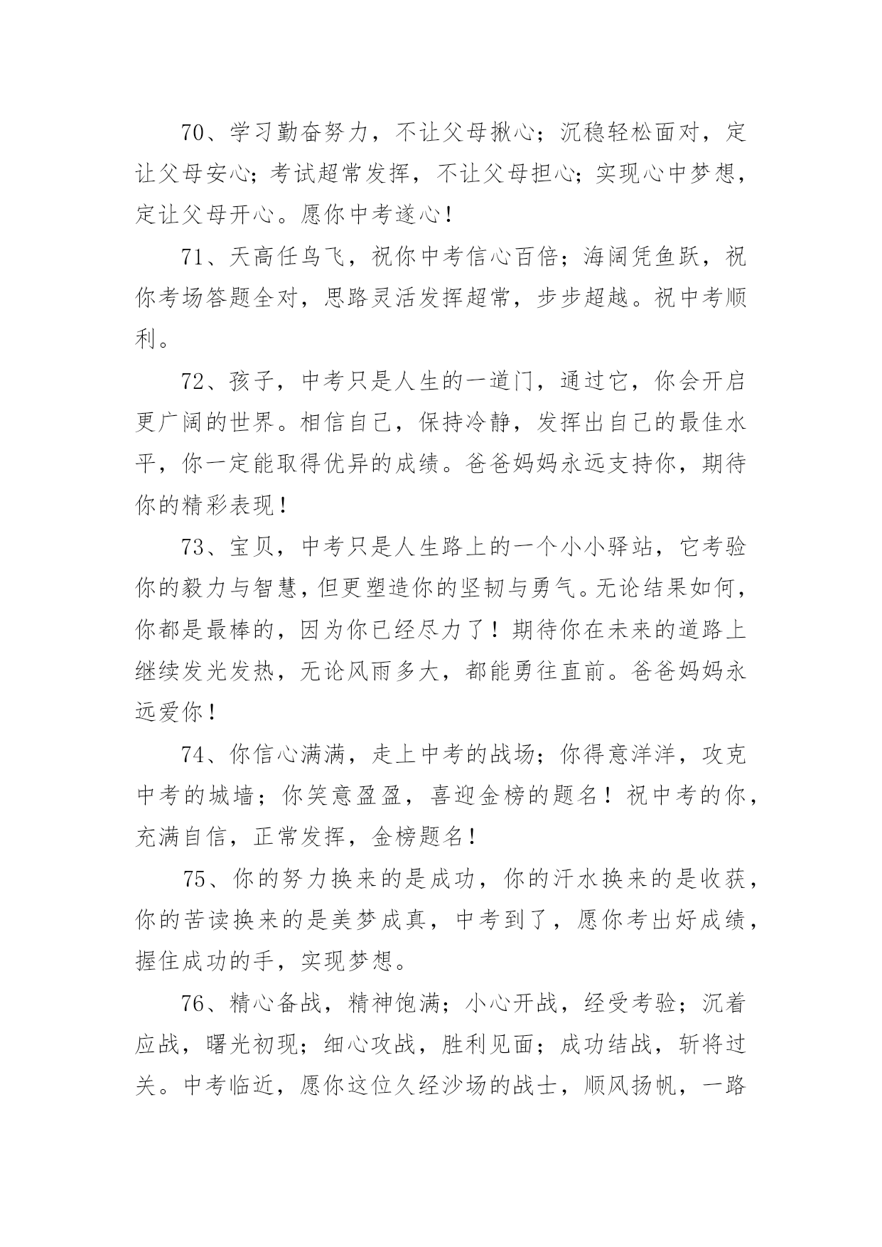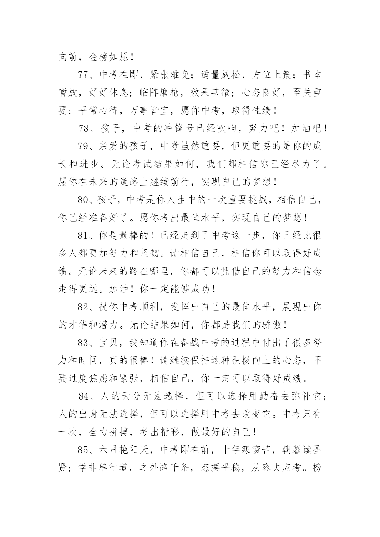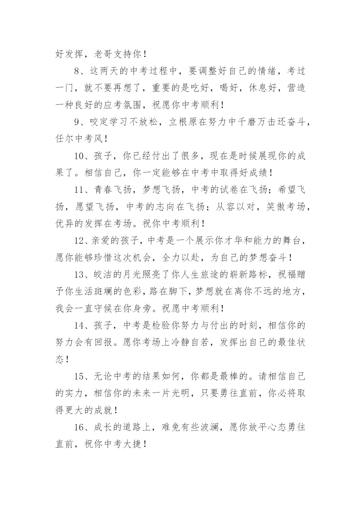 家长中考加油祝福语家长中考加油祝福语(精选360句)中考对每一位同学来说是接受九年义务教育的终结性评价,是人生求学路上的一次选择。以下是小编整理的家长中考加油祝福语,欢迎阅读!1、中考是比知识、比能力、比心理、比信心、比体力的一场综合考试。2、中考的日子,是金色的日子,是成功的开始,因为我问心无愧,胸有成竹。3、中考着实是一种丰收,它包蕴着太多的内涵!无论高考成绩如何,你的成长与成熟是任何人无法改变的事实,这三年的辛勤走过,你获得的太多太多!4、亲爱的孩子,明天就是你三年初中生活的终点了,祝你中考顺利!5、中考之日又来临,考生家长心如焚。子女面前莫表现,压力太大难发挥。营养餐要准备好,不能太荤坏肠胃。保证孩子睡眠好,从从容容应中考。祝捷报早传,开心欢笑!6、考场不是战场,让心保持平常。自信不要怯场,记得冷静登场。千万不要紧张,放手一搏何妨。别管结果如何,至少无悔衷肠。祝你中考顺利,早日题名金榜!7、明天就是中考了,希望在这最后的日子,你能满怀着信心,发挥出你最好的水平,考出最好的成绩!加油!好好发挥,老哥支持你!8、这两天的中考过程中,要调整好自己的情绪,考过一门,就不要再想了,重要的是吃好,喝好,休息好,营造一种良好的应考氛围,祝愿你中考顺利!9、咬定学习不放松,立根原在努力中千磨万击还奋斗,任尔中考风!10、孩子,你已经付出了很多,现在是时候展现你的成果了。相信自己,你一定能够在中考中取得好成绩!11、青春飞扬,梦想飞扬,中考的试卷在飞扬;希望飞扬,愿望飞扬,中考的志向在飞扬;从容以对,笑傲考场,优异的发挥在考场。祝你中考顺利!12、亲爱的孩子,中考是一个展示你才华和能力的舞台,愿你能够珍惜这次机会,全力以赴,为自己的梦想奋斗!13、皎洁的月光照亮了你人生旅途的崭新路标,祝福赠予你生活斑斓的色彩,路在脚下,梦想就在离你不远的地方,我会一直守候在你身旁。祝愿中考顺利!14、孩子,中考是检验你努力与付出的时刻,相信你的努力会有回报。愿你考场上冷静自若,发挥出自己的最佳状态!15、无论中考的结果如何,你都是最棒的。请相信自己的实力,相信你的未来一片光明,只要勇往直前,你必将取得更大的成就!16、成长的道路上,难免有些波澜,愿你放平心态勇往直前,祝你中考大捷!17、三年时光匆匆过,风雨兼程苦苦付,金榜题名辉辉到,辛劳即成空空梦,今日中考大大胜,来年腾飞啸啸龙。正常心态考场战,求学一定获成功!18、孩子,你的潜力是无限的,你的努力会得到最好的回报。我们祝愿你在中考中发挥出色,取得理想的成绩。19、向着理想奋飞,向着中考冲刺!20、亲爱的孩子,中考的钟声即将敲响,愿你在考试中保持冷静、自信,发挥出最好的自己。我们为你祈祷,祝你中考顺利,取得优异的成绩!21、一晃中考也快来了,不要紧张,不要心慌,按照自己的计划来,不要受别人的影响,相信自己。我也相信你必须会考出水平,考出满意。22、未来的路还很长,中考只是你成长道路上的一道风景。请以积极的心态面对挑战,相信自己,迎接未来的无限可能!23、亲爱的孩子,中考是你人生中的一次重要里程碑,愿你以坚定的信念和不懈的努力,迎接这个挑战,创造属于自己的辉煌!24、一支笔是武器,勇闯考场阵地;智慧是法宝,驱逐考题困扰;能力今日验证,奇迹今日创造,中考日,祝你分数不减只会多,考试顺利不出错!25、孩子们,中考只是人生路上的一个里程碑,无论考得如何,都要坚信自己的价值。勇往直前,未来无限美好。26、中考来监不要慌张,平时功课是最重要;头脑清晰思维敏捷,细心审题错误减少;清淡饮食重营养,适当休息重健康;祝你考取好成绩,鱼跃龙门自然好!27、中考是人生的重要一步,愿你在知识的海洋里乘风破浪,勇往直前。记住,无论结果如何,你都是最棒的!加油,孩子!28、紧张而有序,效率是关键。祝愿中考旗开得胜,一鸣惊人金榜题名!29、面对中考,请保持冷静与乐观。不要过分关注结果,重要的是享受努力的过程。勇敢面对挑战,你的每一次努力都不会被辜负。相信自己的实力,你一定能取得佳绩!30、亲爱的孩子,中考即将来临,愿你以坚定的信念和扎实的准备迎接挑战,取得优异的成绩!31、亲爱的孩子,中考只是人生中的一站,我们相信你一定会全力以赴,发挥出自己的最佳水平。加油,你是最棒的!32、中考的日子又要到了。饭后要好好吃饭,好好睡几天,打起精神,迎接中考。胸有自信很重要。你要坦然微笑,做好充分拥抱中考的准备,祝中考成功。33、勇敢面对挑战,自信迎战中考。你充满了潜力和才华,相信自己的实力,一定能取得优异的成绩。我们为你骄傲,加油!34、亲爱的孩子,中考只是你人生道路上的一道关卡,无论结果如何,爸爸都为你骄傲。愿你全力以赴,不留遗憾,加油!35、孩子,你的努力和汗水我们都看在眼里,记在心里。中考只是你迈向更高目标的第一步,相信你一定能够发挥出