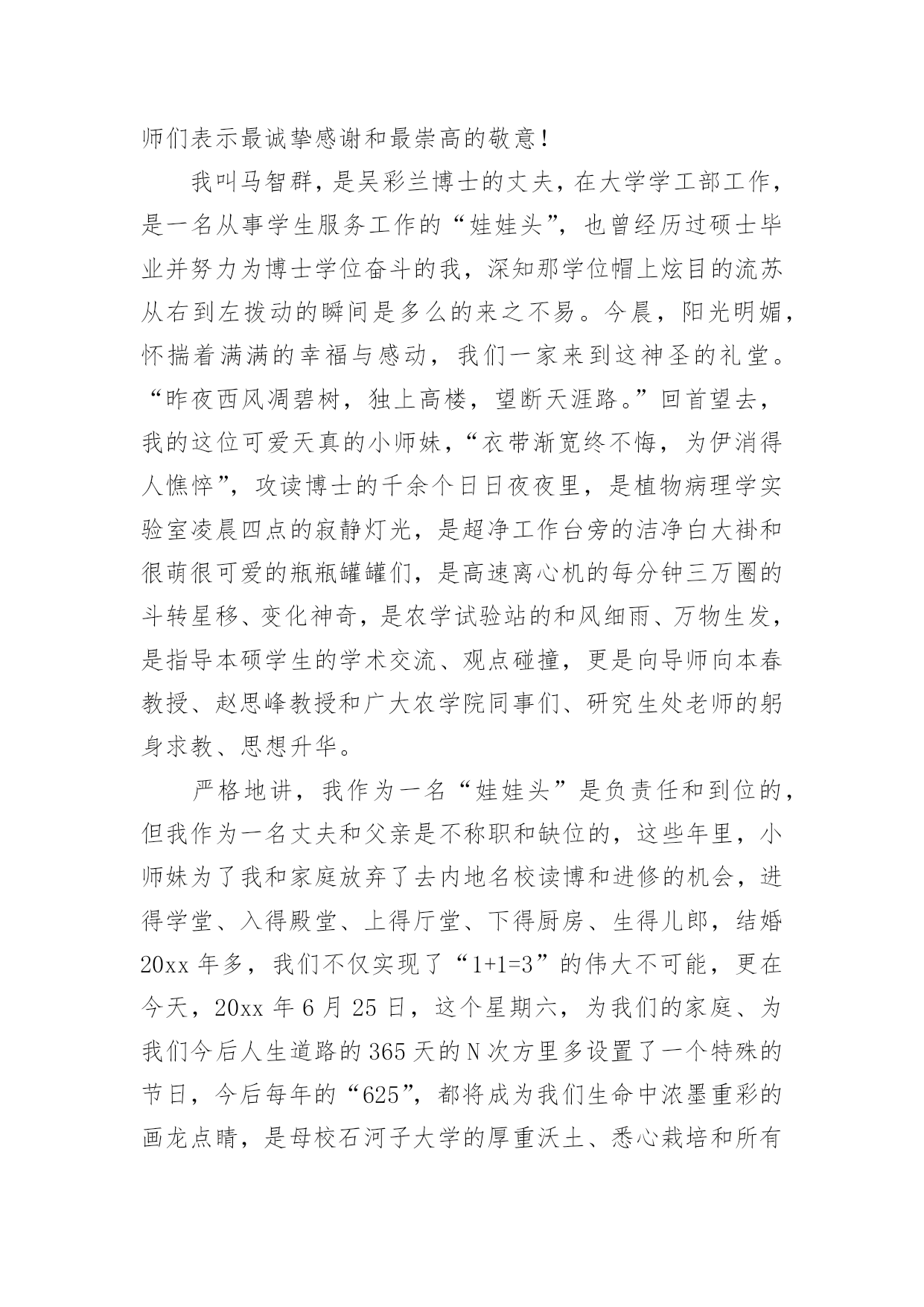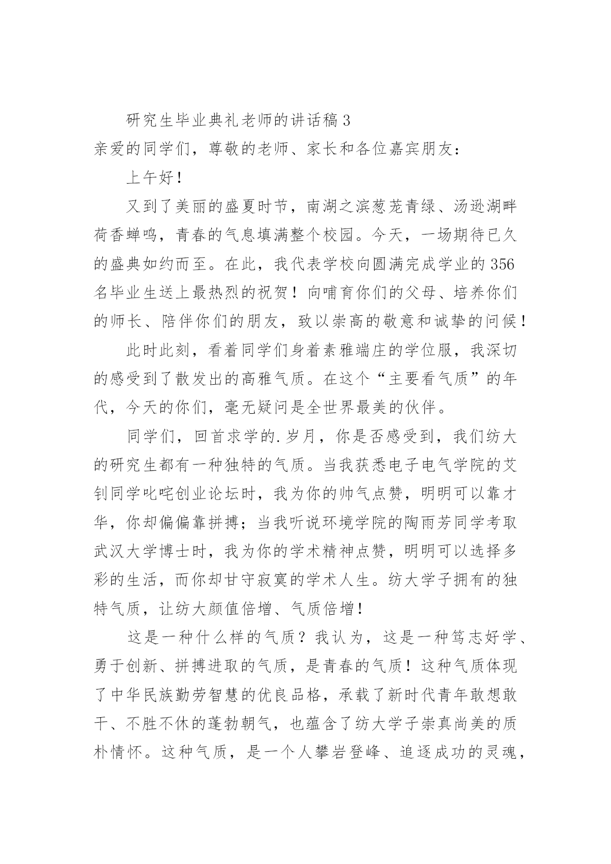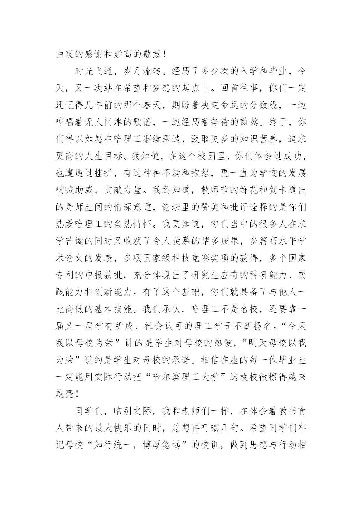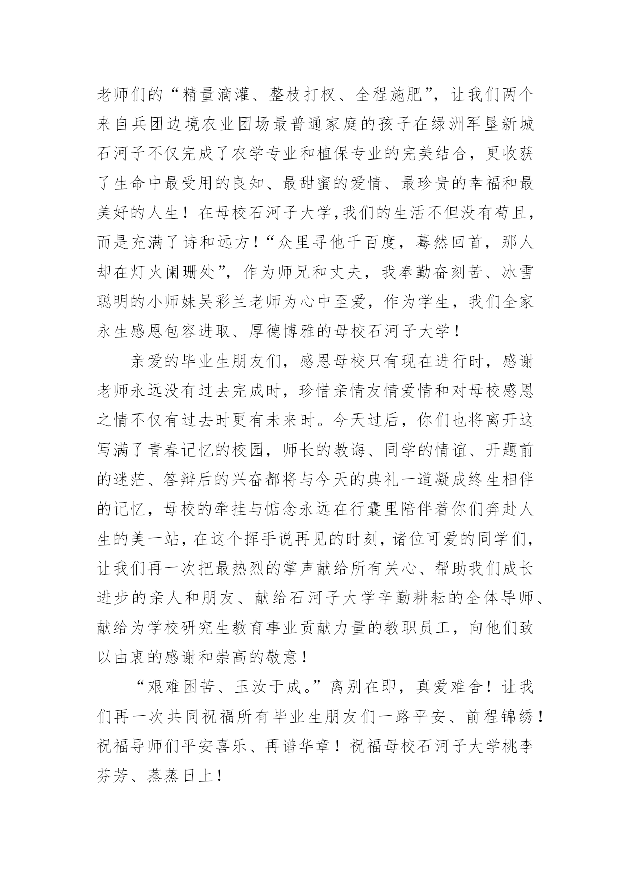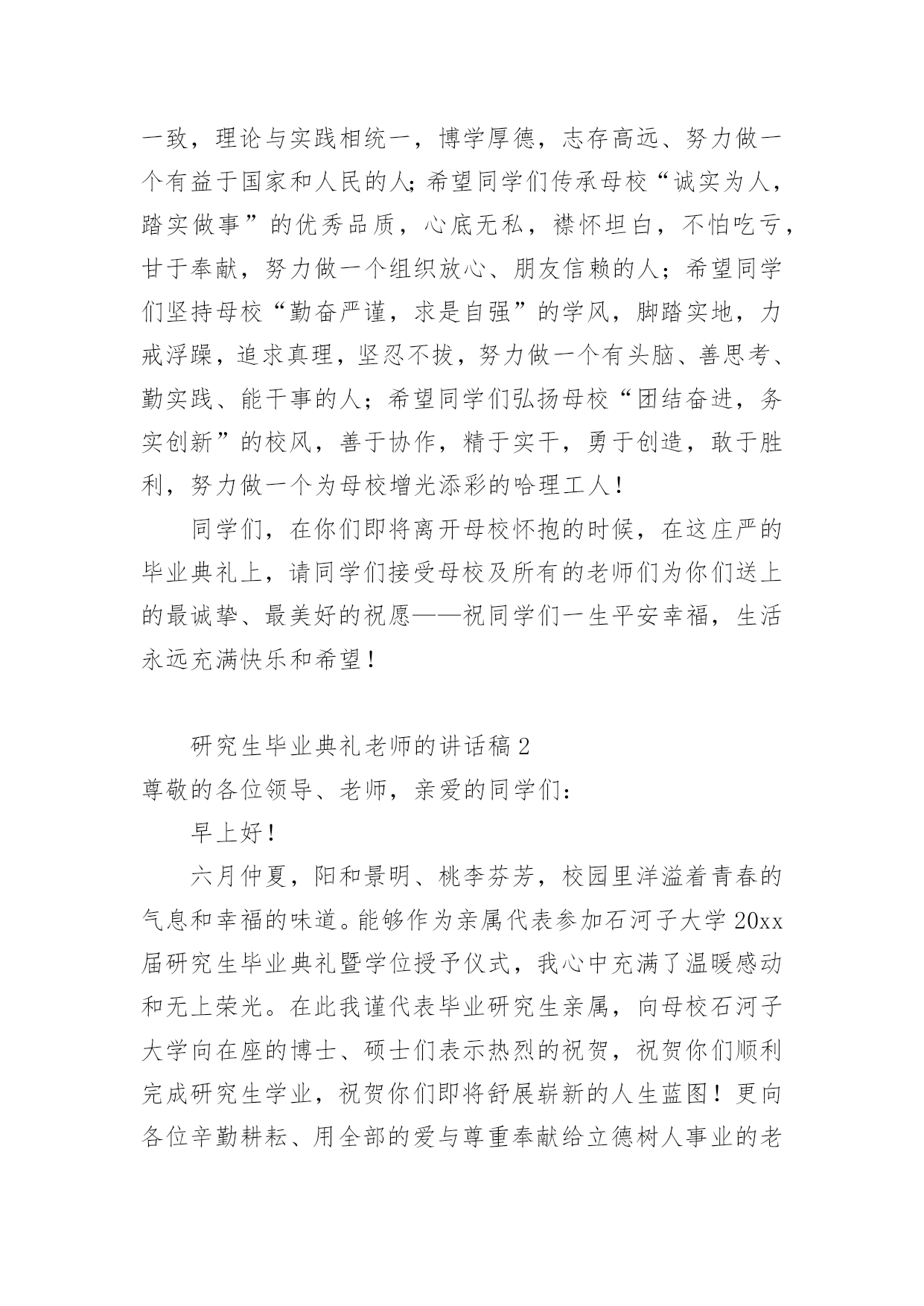 研究生毕业典礼老师的讲话稿在社会一步步向前发展的今天,需要使用讲话稿的情况越来越多,讲话稿是在公务活动中针对特定场合,面对特定听众发表口头讲话的文稿。怎么写讲话稿才能避免踩雷呢?以下是小编为大家整理的研究生毕业典礼老师的讲话稿,希望对大家有所帮助。研究生毕业典礼老师的讲话稿1老师们,同学们:在这冬去春来万物复苏的美好季节,我们相聚在一起隆重举行一年一度的研究生毕业典礼,为xxxx届969名研究生授予博士学位和硕士学位。刚刚老师和同学们的发言,令我感触颇深,也曾经历过硕士毕业、博士毕业的我,深知流苏从右到左拨动的瞬间是多么的来之不易,我代表学校向你们表示由衷的祝贺!当然,今天过后,你们也将离开这写满了青春记忆的校园,师长的教诲、同学的情谊、开题前的迷茫、答辩后的兴奋都将与今天的典礼一道凝成终生相伴的记忆,陪伴着你们奔赴人生的下一站,在这个挥手说再见的时刻,同学们,请带上母校最为真挚的祝愿与祝福,你们的行囊里,永远不会缺少母校的牵挂与惦念!借此机会,请同学们与我一道,把最热烈的掌声献给所有关心、帮助你们成长进步的亲人和朋友、献给理工大学辛勤耕耘的全体导师、献给为学校研究生教育事业贡献力量的教职员工,向他们致以由衷的感谢和崇高的敬意!时光飞逝,岁月流转。经历了多少次的入学和毕业,今天,又一次站在希望和梦想的起点上。回首往事,你们一定还记得几年前的那个春天,期盼着决定命运的分数线,一边哼唱着无人问津的歌谣,一边经历着等待的煎熬。终于,你们得以如愿在哈理工继续深造,汲取更多的知识营养,追求更高的人生目标。我知道,在这个校园里,你们体会过成功,也遭遇过挫折,有过种种不满和抱怨,更一直为学校的发展呐喊助威、贡献力量。我还知道,教师节的鲜花和贺卡道出的是师生间的情深意重,论坛里的赞美和批评诠释的是你们热爱哈理工的炙热情怀。我更知道,你们当中的很多人在求学苦读的同时又收获了令人羡慕的诸多成果,多篇高水平学术论文的发表,多项国家级科技竞赛奖项的获得,多个国家专利的申报获批,充分体现出了研究生应有的科研能力、实践能力和创新能力。有了这个基础,你们就具备了与他人一比高低的基本技能。我们承认,哈理工不是名校,还要靠一届又一届学有所成、社会认可的理工学子不断扬名。“今天我以母校为荣”讲的是学生对母校的热爱,“明天母校以我为荣”说的是学生对母校的承诺。相信在座的每一位毕业生一定能用实际行动把“哈尔滨理工大学”这枚校徽擦得越来越亮!同学们,临别之际,我和老师们一样,在体会着教书育人带来的最大快乐的同时,总想再叮嘱几句。希望同学们牢记母校“知行统一,博厚悠远”的校训,做到思想与行动相一致,理论与实践相统一,博学厚德,志存高远、努力做一个有益于国家和人民的人;希望同学们传承母校“诚实为人,踏实做事”的优秀品质,心底无私,襟怀坦白,不怕吃亏,甘于奉献,努力做一个组织放心、朋友信赖的人;希望同学们坚持母校“勤奋严谨,求是自强”的学风,脚踏实地,力戒浮躁,追求真理,坚忍不拔,努力做一个有头脑、善思考、勤实践、能干事的人;希望同学们弘扬母校“团结奋进,务实创新”的校风,善于协作,精于实干,勇于创造,敢于胜利,努力做一个为母校增光添彩的哈理工人!同学们,在你们即将离开母校怀抱的时候,在这庄严的毕业典礼上,请同学们接受母校及所有的老师们为你们送上的最诚挚、最美好的祝愿——祝同学们一生平安幸福,生活永远充满快乐和希望!研究生毕业典礼老师的讲话稿2尊敬的各位领导、老师,亲爱的同学们:早上好!六月仲夏,阳和景明、桃李芬芳,校园里洋溢着青春的气息和幸福的味道。能够作为亲属代表参加石河子大学20xx届研究生毕业典礼暨学位授予仪式,我心中充满了温暖感动和无上荣光。在此我谨代表毕业研究生亲属,向母校石河子大学向在座的博士、硕士们表示热烈的祝贺,祝贺你们顺利完成研究生学业,祝贺你们即将舒展崭新的人生蓝图!更向各位辛勤耕耘、用全部的爱与尊重奉献给立德树人事业的老师们表示最诚挚感谢和最崇高的敬意!我叫马智群,是吴彩兰博士的丈夫,在大学学工部工作,是一名从事学生服务工作的“娃娃头”,也曾经历过硕士毕业并努力为博士学位奋斗的我,深知那学位帽上炫目的流苏从右到左拨动的瞬间是多么的来之不易。今晨,阳光明媚,怀揣着满满的幸福与感动,我们一家来到这神圣的礼堂。“昨夜西风凋碧树,独上高楼,望断天涯路。”回首望去,我的这位可爱天真的小师妹,“衣带渐宽终不悔,为伊消得人憔悴”,攻读博士的千余个日日夜夜里,是植物病理学实验室凌晨四点的寂静灯光,是超净工作台旁的洁净白大褂和很萌很可爱的瓶瓶罐罐们,是高速离心机的每分钟三万圈的斗转星移、变化神奇,是农学试验站的和风细雨、万物生发,是指导本硕学生的学术交流、观点碰撞,更是向导师向本春教授、赵思峰教授和广大农学院同事们、研究生处老师的躬身求教、思想升华。严格地讲,我作