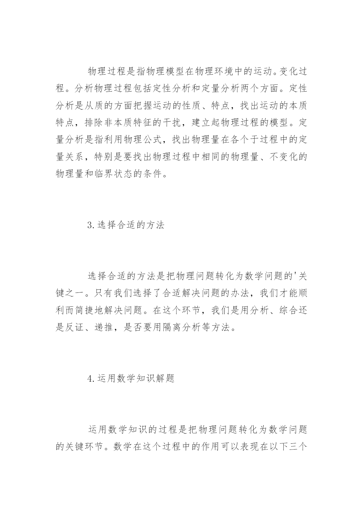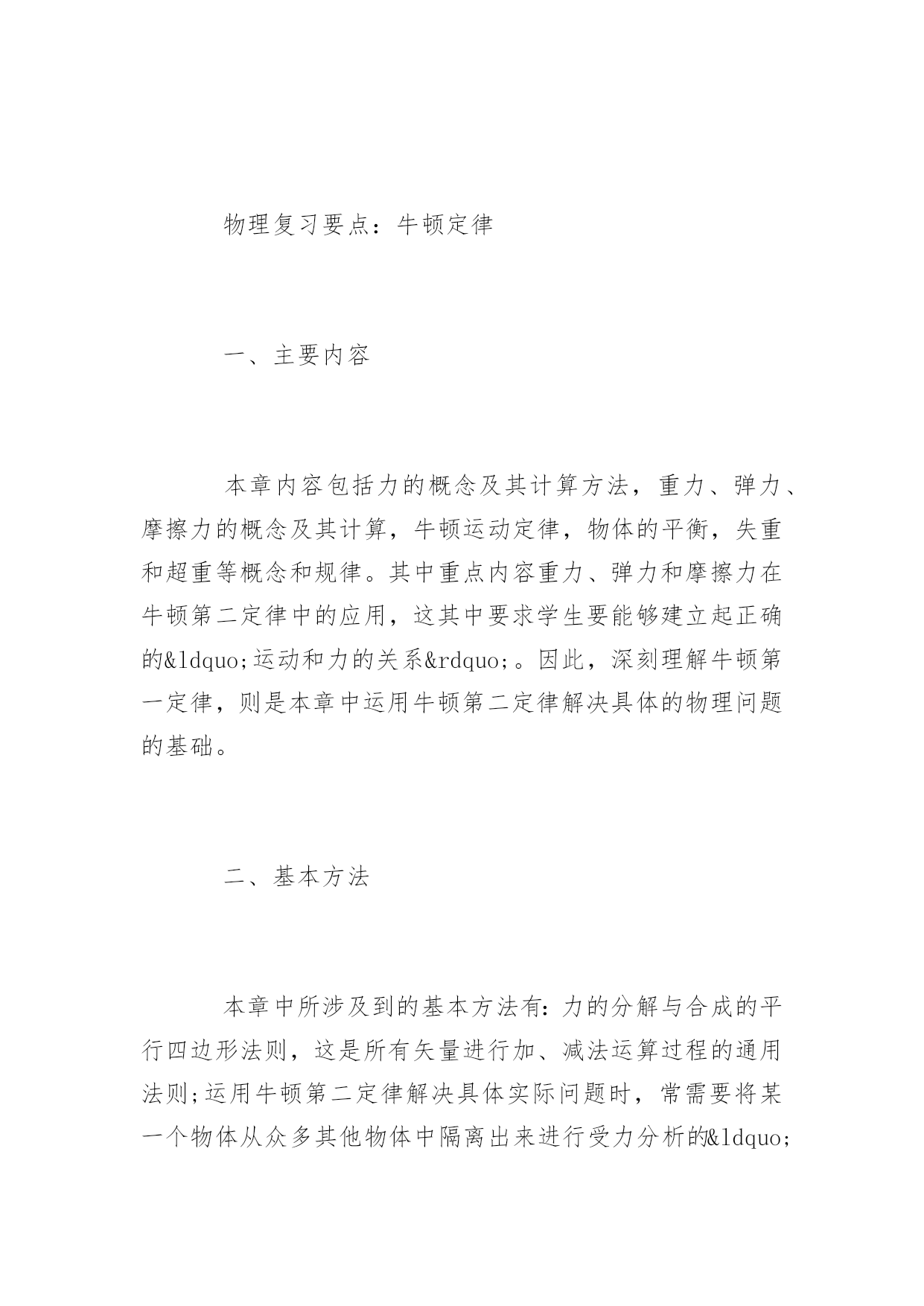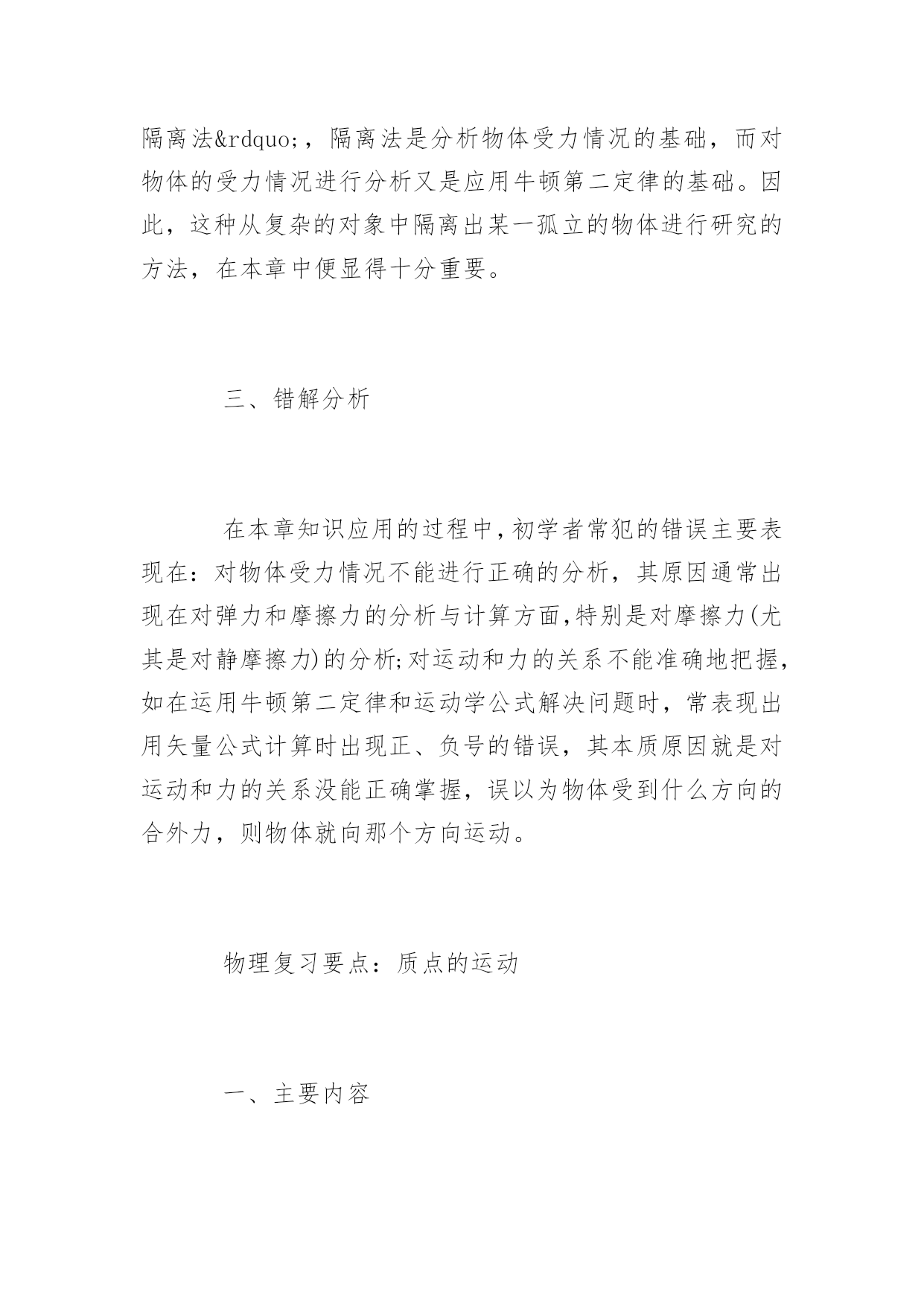 成人高考物理复习2014年成人高考物理复习成人高考物理学科复习方法:1.识别物理现象识别物理现象的过程是在充分读懂、理解题目文字叙述的基础上,抓住己给的解题线索,形成具体问题情景的大致物理轮廓,并且对解题的方向作出初步判断的过程。识别物理现象包括理解题意和确定研究对象两个方面。理解题意是正确解答物理问题的关键。要迅速地理解题意,必须抓住题目中的关键字句,找出已知条件和所求物理量之间的关系,在必要时画出草图帮助理解题意。确定研究对象实际上是把题目所给的物理条件分析为研究对象和研究对象的影响因素的过程。2.分析物理过程物理过程是指物理模型在物理环境中的运动。变化过程。分析物理过程包括定性分析和定量分析两个方面。定性分析是从质的方面把握运动的性质、特点,找出运动的本质特点,排除非本质特征的干扰,建立起物理过程的模型。定量分析是指利用物理公式,找出物理量在各个于过程中的定量关系,特别是要找出物理过程中相同的物理量、不变化的物理量和临界状态的条件。3.选择合适的方法选择合适的方法是把物理问题转化为数学问题的'关键之一。只有我们选择了合适解决问题的办法,我们才能顺利而简捷地解决问题。在这个环节,我们是用分析、综合还是反证、递推,是否要用隔离分析等方法。4.运用数学知识解题运用数学知识的过程是把物理问题转化为数学问题的关键环节。数学在这个过程中的作用可以表现在以下三个方面。①通过寻找数量关系,给物理模型加入定量的因素;②用符号来表示物理量,从而使符号成为物理内容的载体,把复杂的事物代码化;③根据物理规律列出问题中物理量之间的关系,实现物理过程的数学化。当表示物理量之间的数学表达式列出以后,就应该运用数学知识准确地求出结果,并应注意提高解题效率。5.讨论验证结果讨论验证结果既是对原来的问题重新审视的过程,也是对自己的解题是否成功进行评价的环节。常用的讨论验证结果的方法有数量级估算法,特殊值假设检验法等。物理复习要点:牛顿定律一、主要内容本章内容包括力的概念及其计算方法,重力、弹力、摩擦力的概念及其计算,牛顿运动定律,物体的平衡,失重和超重等概念和规律。其中重点内容重力、弹力和摩擦力在牛顿第二定律中的应用,这其中要求学生要能够建立起正确的“运动和力的关系”。因此,深刻理解牛顿第一定律,则是本章中运用牛顿第二定律解决具体的物理问题的基础。二、基本方法本章中所涉及到的基本方法有:力的分解与合成的平行四边形法则,这是所有矢量进行加、减法运算过程的通用法则;运用牛顿第二定律解决具体实际问题时,常需要将某一个物体从众多其他物体中隔离出来进行受力分析的“隔离法”,隔离法是分析物体受力情况的基础,而对物体的受力情况进行分析又是应用牛顿第二定律的基础。因此,这种从复杂的对象中隔离出某一孤立的物体进行研究的方法,在本章中便显得十分重要。三、错解分析在本章知识应用的过程中,初学者常犯的错误主要表现在:对物体受力情况不能进行正确的分析,其原因通常出现在对弹力和摩擦力的分析与计算方面,特别是对摩擦力(尤其是对静摩擦力)的分析;对运动和力的关系不能准确地把握,如在运用牛顿第二定律和运动学公式解决问题时,常表现出用矢量公式计算时出现正、负号的错误,其本质原因就是对运动和力的关系没能正确掌握,误以为物体受到什么方向的合外力,则物体就向那个方向运动。物理复习要点:质点的运动一、主要内容本章内容包括位移、路程、时间、时刻、平均速度、即时速度、线速度、角速度、加速度等基本概念,以及匀变速直线运动的规律、平抛运动的规律及圆周运动的规律。在学习中要注意准确理解位移、速度、加速度等基本概念,特别应该理解位移与距离(路程)、速度与速率、时间与时刻、加速度与速度及速度变化量的不同。二、基本方法本章中所涉及到的基本方法有:利用运动合成与分解的方法研究平抛运动的问题,这是将复杂的问题利用分解的方法将其划分为若干个简单问题的基本方法;利用物理量间的函数关系图像研究物体的运动规律的方法,这也是形象、直观的研究物理问题的一种基本方法。这些具体方法中所包含的思想,在整个物理学研究问题中都是经常用到的。因此,在学习过程中要特别加以体会。三、错解分析在本章知识应用的过程中,初学者常犯的错误主要表现在:对要领理解不深刻,如加速度的大小与速度大小、速度变化量的大小,加速度的方向与速度的方向之间常混淆不清;对位移、速度、加速度这些矢量运算过程中正、负号的使用出现混乱:在未对物体运动(特别是物体做减速运动)过程进行准确分析的情况下,盲目地套公式进行运算等。