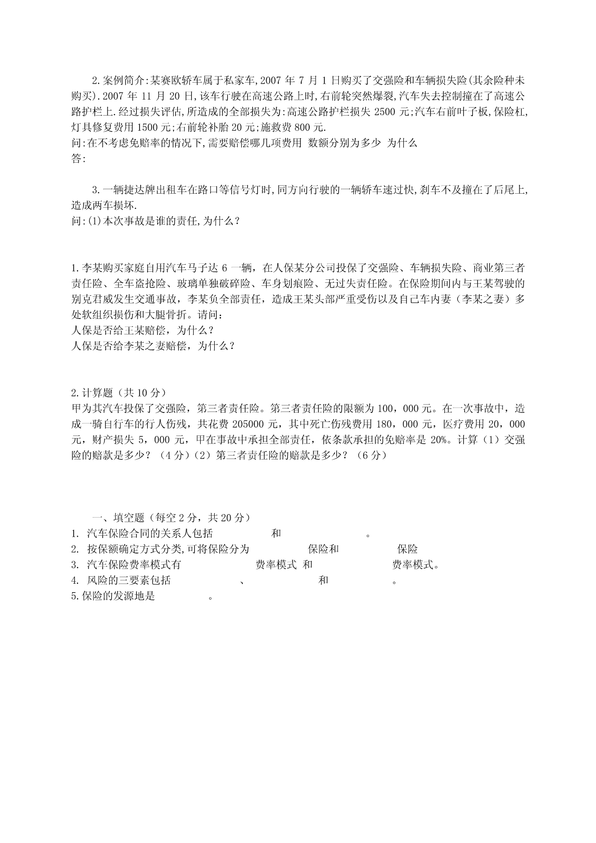 一、选择)1.世界上最早的汽车责任保险单起源于()。A美国B德国C英国D中国2.冰雹导致路滑引起车祸,撞伤行人,哪一项属于风险损失()。A冰雹B车祸C路滑D行人3.风险管理的基本目标是()。A以最小的成本获得最小的安全保障B以最大的成本获得最大的安全保障C以最小的成本获得最大的安全保障D以最大的成本获得最小的安全保障4.保险人依据法律规定或合同约定,不承担赔偿和给付责任的范围叫做()。A保险责任B责任免除C保险约定D保险范围5.以下不属于保险中介人的是()。A保险代理人B保险公估人C保险经纪人D投保人6.投保人对保险标的所具有的法律上承认的利益称为()。A保险利益B经济利益C法律权益D经济权益7.甲乙两车互撞,甲车承担100%责任,车损4000元,乙车承担无责,车损6000元,则甲乙车获得交强险的赔偿分别是()元。A2000,2000B100,2000C2000,100D6000,1003.《中华人民共和国道路交通安全法实施条例》第五十四条规定:机动车载物不得超过机动车行驶证上核定的载质量,装载长度、宽度不得超出车厢。另外,载运集装箱的车辆不得超过:A.3.2米。B.4.2米。C.5.2米D4.0米9.保险车辆发生保险事故后,以下哪项费用保险人应该负责a.停车费.b.保管费.c.罚款.d.施救费.10.汽车保险是以()为保险标的的一种保险。A利益B信用C财产D汽车及有关利益11.一般车辆应在出险后()h向保险公司报案。A12B24C48D7212.机动车辆保险承保的风险包括()等。A敌对行为B暴风、暴雨C罢工、暴动D竞赛、测试13.下列人员中,属于机动车辆第三者责任险中的第三者的是()。A被保险人的驾驶人员B借给他人使用时的驾驶人员C被保险人车上的人员D对方车上的乘客14.保险车辆被盗窃,经出险地县级以上公安刑侦部门立案证明,满()天未查明下落的全车损失属于全车盗抢险的保险责任。A20B40C60D8015.玻璃单独破碎险中,所谓的保险标的指的是()。A车窗玻璃B灯具玻璃C车镜玻璃D以上三者1.根据1997年颁布,2001年修改的《汽车报废标准》,使用年限为8年的汽车有:a.载货车(含越野),带拖挂的汽车,矿山车,出租车.b.非营运的乘用车.c.除了以上两类之外的其他各类车辆.2.对于营运货车按非营运货车投保的案例,可以通过哪些方式识别a.所运载的货物b.车辆的行驶里程3.《中华人民共和国道路交通安全法实施条例》第五十四条规定:机动车载物不得超过机动车行驶证上核定的载质量,装载长度,宽度不得超出车厢.另外,载运集装箱的车辆不得超过:a.3.2米.b.4.2米.c.5.2米4.车辆定损应注意区别事故损失与机械损失的界限,以下哪些现象属于事故损失a.刹车失灵.b.机械故障.c.零部件因锈蚀,朽旧,老化,变形,裂纹等造成的车身损失.d.驾驶员正常行驶时操作不当造成的碰撞.5.保险车辆发生事故后,如果被保险人要求自选修理厂修理的,应该:a.首先确定保险责任和损失金额.b.首先进行事故车辆的修复.6.某地市级公司承包的一辆保时捷发生事故致损,由于当地无法修复,保险人同意去外地修理.以下哪些费用保险公司应该承担a.将车辆移送修复地的移送费.b.车主护送保险车辆去外地的误工费和差旅费.c.车辆修复后开回本地的汽油费,过路费.7.对于保险公司来说,事故车辆的修复应该遵循什么样的原则a.恢复到发生事故前的技术状态.b.发现和确定车辆的故障和隐患.8.前翼子板损伤程度达到必须将其从车上拆下来才能修复,并且前翼子板的材料价格低廉,供应流畅,材料价格基本达到或接近整形修复的工时费,制定维修方案时可以考虑:a.可以更换.b.一般不考虑更换.c.根据车主要求决定是否更换.9保险车辆发生保险事故后,以下哪项费用保险人应该负责a.停车费.b.保管费.c.罚款.d.施救费.10.某车挂牌,购置保险半年后,自行加装了真皮座椅,高档音响.后来发生属于保险责任的落水事故,定损时对于自行加装的真皮座椅,高档音响,应该如何处理a.既然落水属于保险责任,应该予以赔偿.b.真皮座椅,高档音响不是原车配置,车主又未曾投保"新增设备险",无需赔偿.c.真皮座椅,高档音响可以不按实际价值赔偿,但应该按普通座椅和音响损失的价值赔偿.1、在变更保险合同中用的是:()A保险单B暂保单C批单D投保单2、以下属于纯粹风险的是:()A战争B火灾C暴乱D恐怖活动3、下列属于保险当事人的是:()A投保人B保险代理人C被保险人D受益人4、下列属于第三者责任险中的第三者的是:A投保人B被保险人C中介人D保险