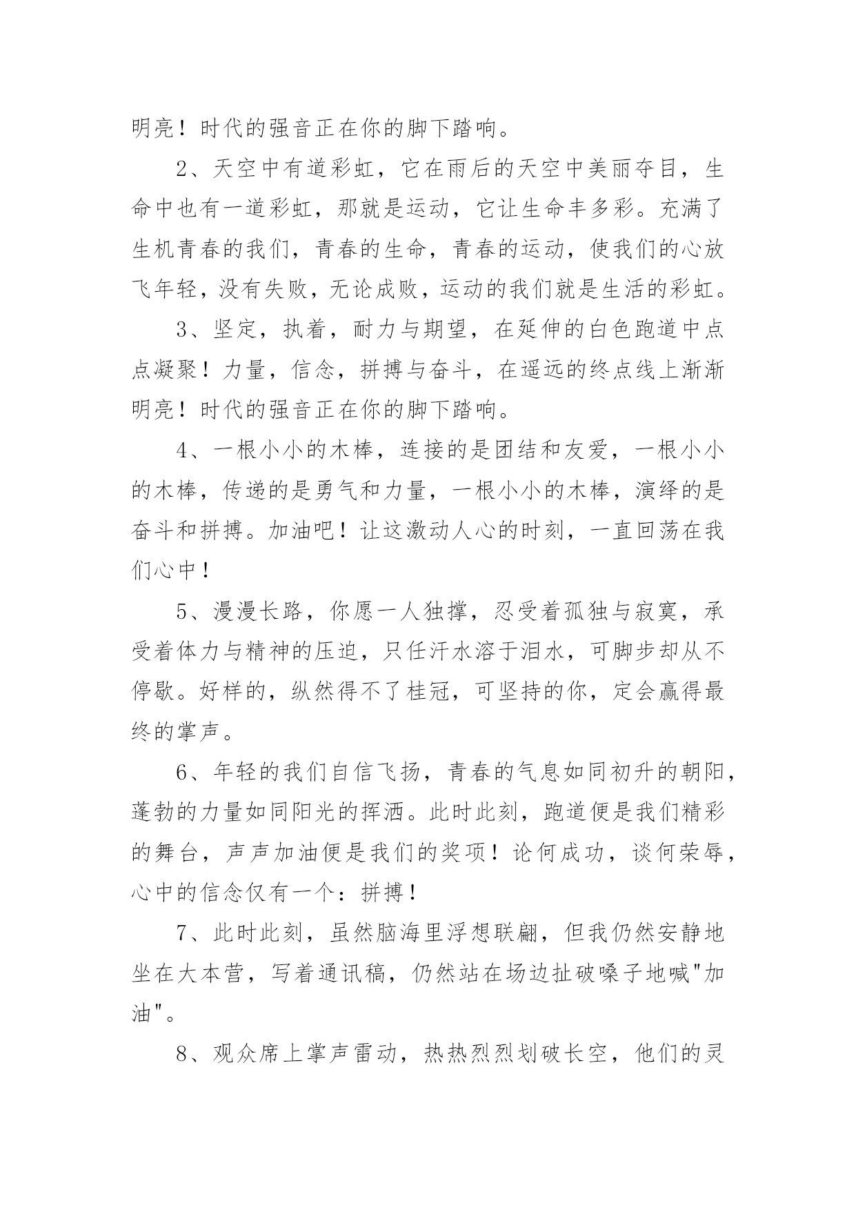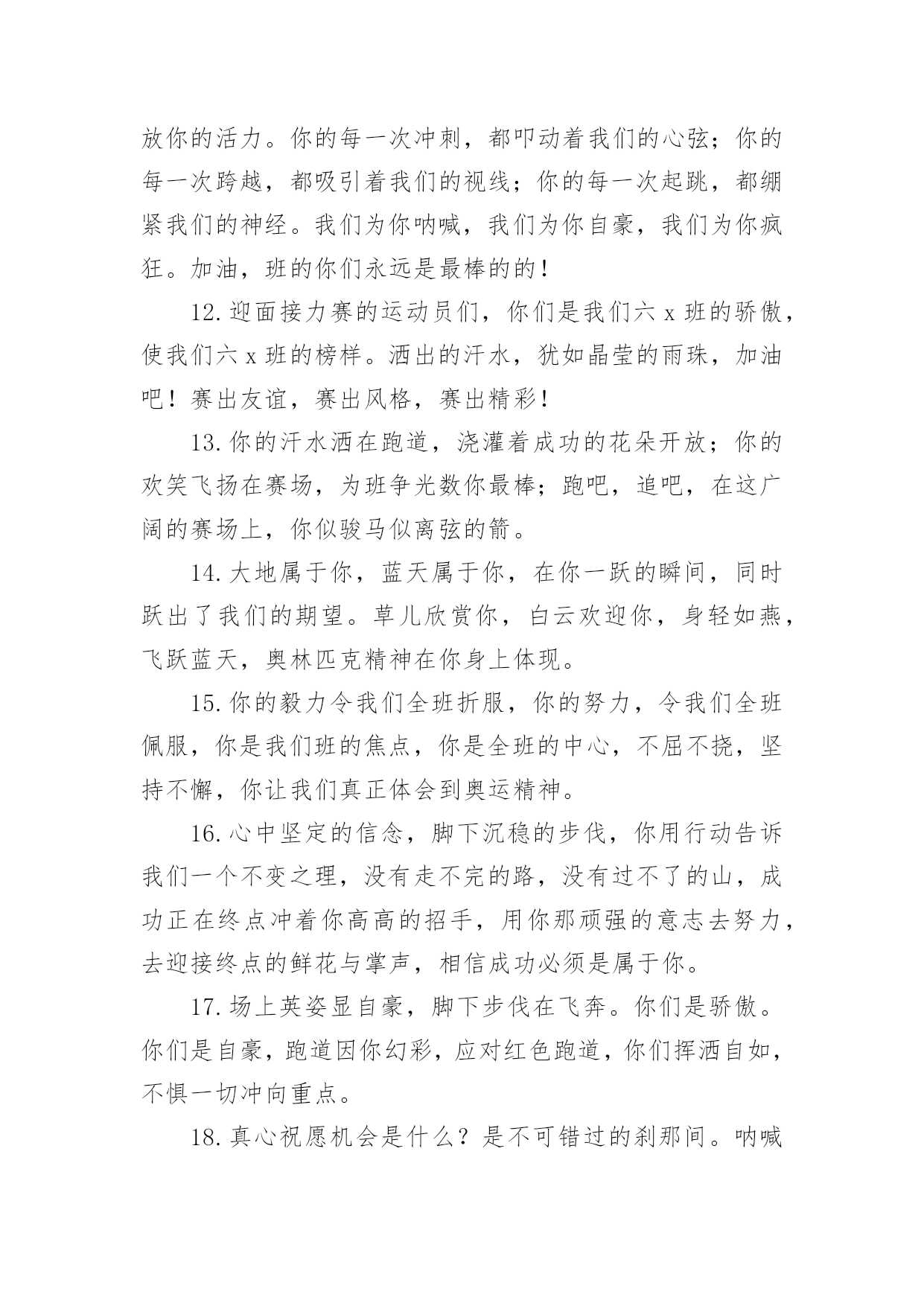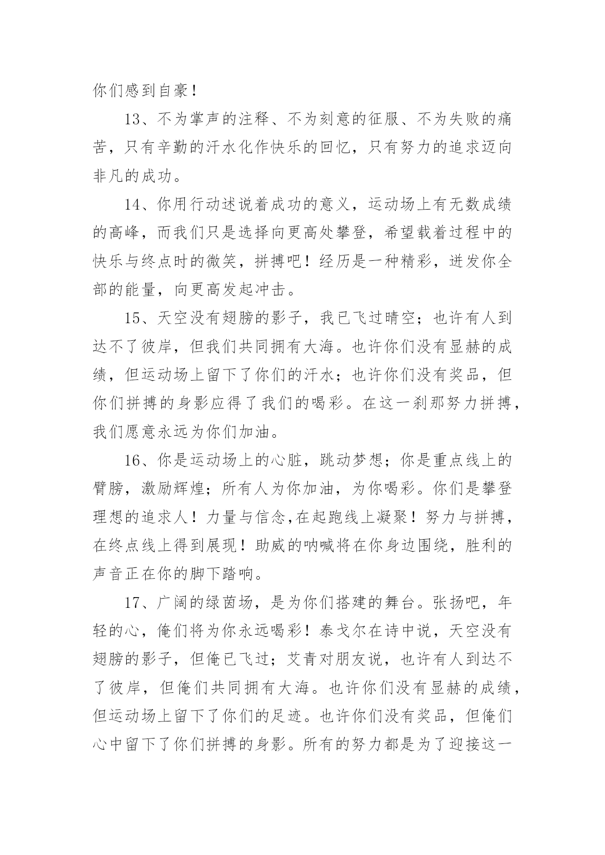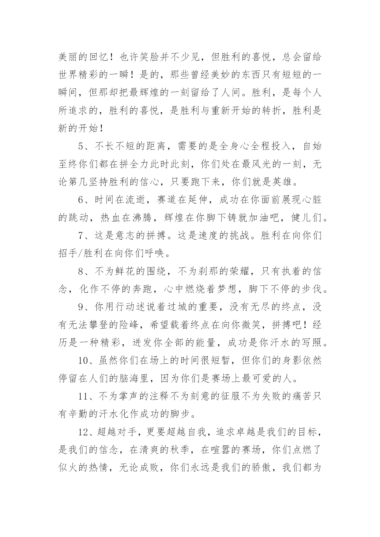 运动会加油稿运动会加油稿15篇随着社会一步步向前发展,我们可以使用加油稿的机会越来越多,加油稿是鼓励激励对方的文稿。怎么写加油稿才能避免踩雷呢?下面是小编精心整理的运动会加油稿,希望能够帮助到大家。运动会加油稿11、广阔的绿茵场,是为你们搭建的舞台。张扬吧,年轻的心,我们将为你永远喝彩!2、泰戈尔在诗中说,天空没有翅膀的影子,但我已飞过;艾青对朋友说,也许有人到达不了彼岸,但我们共同拥有大海。也许你们没有显赫的成绩,但运动场上留下了你们的足迹。也许你们没有奖品,但我们心中留下了你们拼搏的身影。所有的努力都是为了迎接这一刹那,所有的拼搏都是为了这一声令下。3、就像花儿准备了春、秋、冬,就是为了红透整个盛夏。就像雪花经历了春、夏、秋就是为了洁白整个严冬。蹲下,昂首,出发……轻轻的一抬脚,便牵动了全场的目光潇洒的迫挥挥手,便满足了那一份无言的等待。迎着朝阳,你们踏歌而去,背着希望,我们等待你们的归来。4、也许流星并不少见,但它燃烧的刹那,留给人间最美丽的回忆!也许笑脸并不少见,但胜利的喜悦,总会留给世界精彩的一瞬!是的,那些曾经美妙的东西只有短短的一瞬间,但那却把最辉煌的一刻留给了人间。胜利,是每个人所追求的,胜利的喜悦,是胜利与重新开始的转折,胜利是新的开始!5、不长不短的距离,需要的是全身心全程投入,自始至终你们都在拼全力此时此刻,你们处在最风光的一刻,无论第几坚持胜利的信心,只要跑下来,你们就是英雄。6、时间在流逝,赛道在延伸,成功在你面前展现心脏的跳动,热血在沸腾,辉煌在你脚下铸就加油吧,健儿们。7、这是意志的拼搏。这是速度的挑战。胜利在向你们招手/胜利在向你们呼唤。8、不为鲜花的围绕,不为刹那的荣耀,只有执着的信念,化作不停的奔跑,心中燃烧着梦想,脚下不停的步伐。9、你用行动述说着过城的重要,没有无尽的终点,没有无法攀登的险峰,希望载着终点在向你微笑,拼搏吧!经历是一种精彩,迸发你全部的能量,成功是你汗水的写照。10、虽然你们在场上的时间很短暂,但你们的身影依然停留在人们的脑海里,因为你们是赛场上最可爱的人。11、不为掌声的注释不为刻意的征服不为失败的痛苦只有辛勤的汗水化作成功的脚步。12、超越对手,更要超越自我,追求卓越是我们的目标,是我们的信念,在清爽的秋季,在喧嚣的赛场,你们点燃了似火的热情,无论成败,你们永远是我们的骄傲,我们都为你们感到自豪!13、不为掌声的注释、不为刻意的征服、不为失败的痛苦,只有辛勤的汗水化作快乐的回忆,只有努力的追求迈向非凡的成功。14、你用行动述说着成功的意义,运动场上有无数成绩的高峰,而我们只是选择向更高处攀登,希望载着过程中的快乐与终点时的微笑,拼搏吧!经历是一种精彩,迸发你全部的能量,向更高发起冲击。15、天空没有翅膀的影子,我已飞过晴空;也许有人到达不了彼岸,但我们共同拥有大海。也许你们没有显赫的成绩,但运动场上留下了你们的汗水;也许你们没有奖品,但你们拼搏的身影应得了我们的喝彩。在这一刹那努力拼搏,我们愿意永远为你们加油。16、你是运动场上的心脏,跳动梦想;你是重点线上的臂膀,激励辉煌;所有人为你加油,为你喝彩。你们是攀登理想的追求人!力量与信念,在起跑线上凝聚!努力与拼搏,在终点线上得到展现!助威的呐喊将在你身边围绕,胜利的声音正在你的脚下踏响。17、广阔的绿茵场,是为你们搭建的舞台。张扬吧,年轻的心,俺们将为你永远喝彩!泰戈尔在诗中说,天空没有翅膀的影子,但俺已飞过;艾青对朋友说,也许有人到达不了彼岸,但俺们共同拥有大海。也许你们没有显赫的成绩,但运动场上留下了你们的足迹。也许你们没有奖品,但俺们心中留下了你们拼搏的身影。所有的努力都是为了迎接这一刹那,所有的拼搏都是为了这一声令下。18、有多少次挥汗如雨,伤痛曾添满记忆,只因为始终相信,去拼搏才能胜利。总在鼓舞自己,要成功就得努力。热血在赛场沸腾,巨人在赛场升起。相信自己,你将赢得胜利,创造奇迹;相信自己,梦想在你手中,这是你的天地。当一切过去,你们将是第一。相信自己,你们将超越极限,超越自己!相信自己,加油吧,健儿们,相信你自己。19、年轻的、我们自信飞扬,青春的气息如同出生的朝阳,蓬勃的力量如同阳光的挥洒。此时此刻,跑道便是我们精彩的舞台,声声加油便是我们最高的奖项!论何成功,谈何荣辱,心中的信念只有一个:拼搏!运动会加油稿21.你们快如离弦之箭;疾似撒疆野马;你们的速度让我们惊叹;你们的精神让我们钦佩;流汗千日,只为今日一搏;疾踏百步,只为终点一触;胜利再向你微笑;成功在向你招手;加油啊!健儿们!2.泥泞的路走过无数,累了,告诉自己:快了,再坚持一会儿。身上的伤流出血来,疼了,告诉自己:别哭,会好的。摔到了,告诉自己:快爬起来,世上很少有坦途。3.或许失败对于你来说是一种耻辱,是一种期望的破灭。几个月的艰辛训练和满