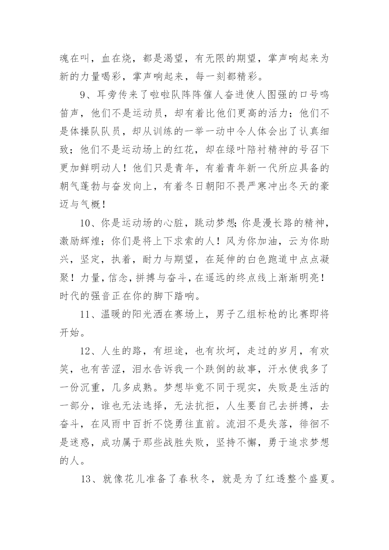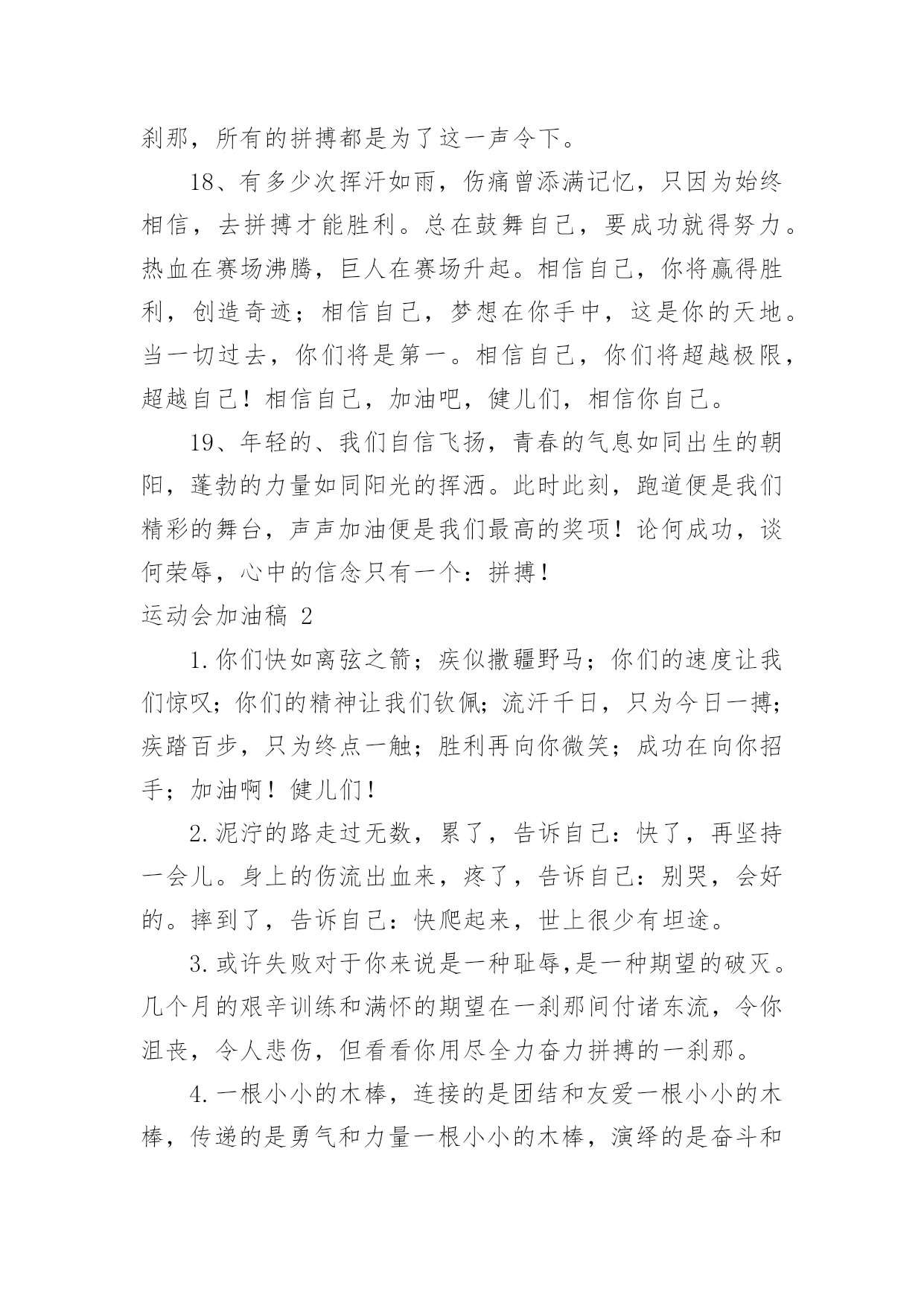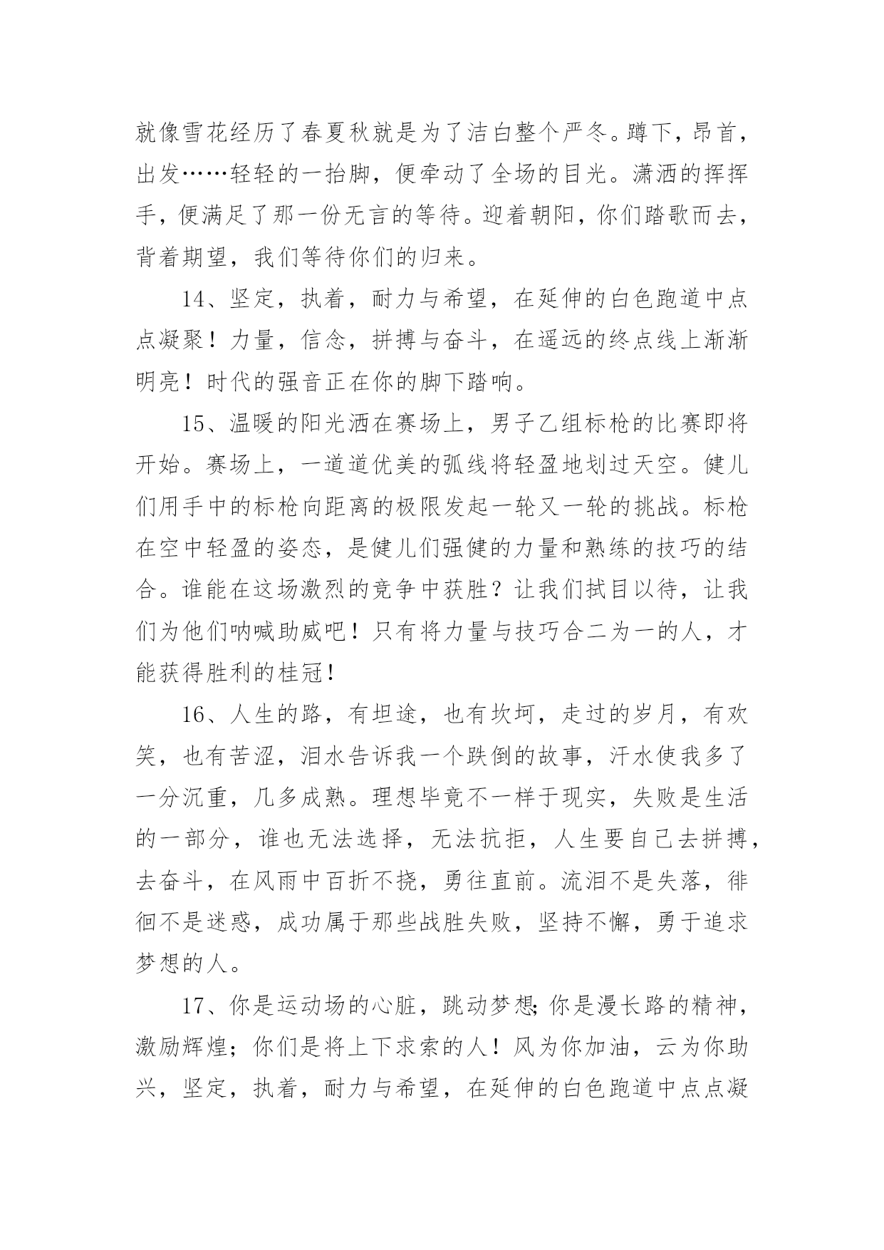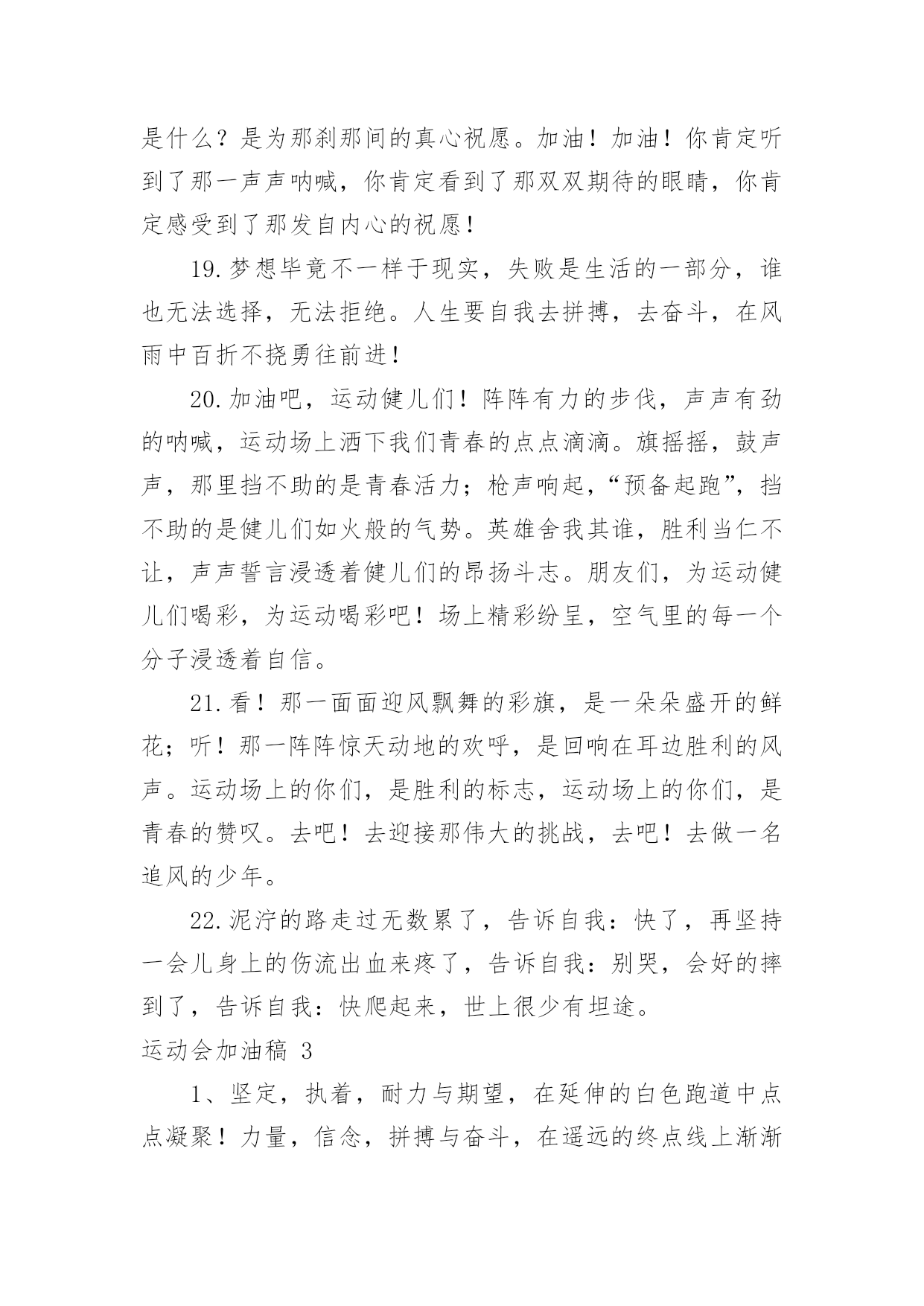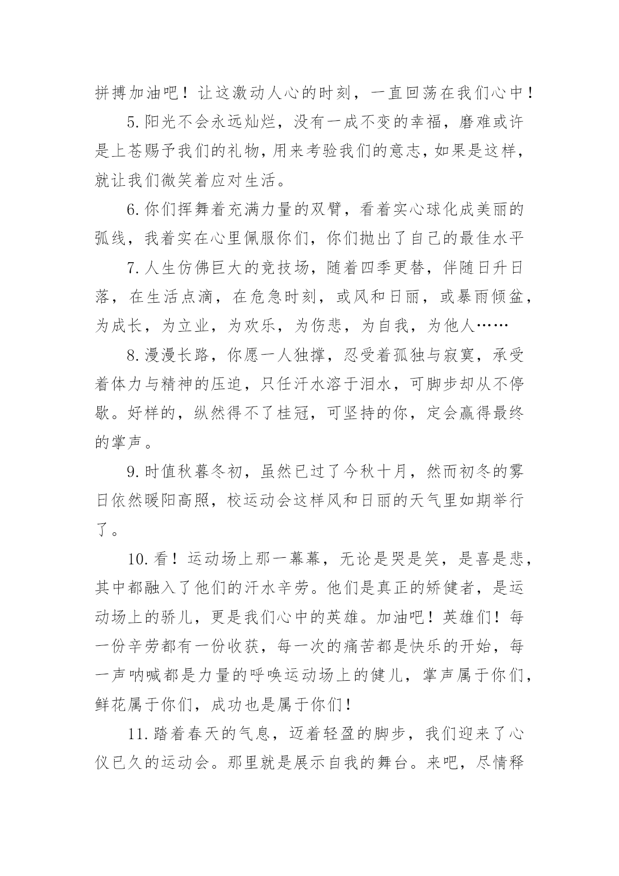 运动会加油稿运动会加油稿15篇随着社会一步步向前发展,我们可以使用加油稿的机会越来越多,加油稿是鼓励激励对方的文稿。怎么写加油稿才能避免踩雷呢?下面是小编精心整理的运动会加油稿,希望能够帮助到大家。运动会加油稿11、广阔的绿茵场,是为你们搭建的舞台。张扬吧,年轻的心,我们将为你永远喝彩!2、泰戈尔在诗中说,天空没有翅膀的影子,但我已飞过;艾青对朋友说,也许有人到达不了彼岸,但我们共同拥有大海。也许你们没有显赫的成绩,但运动场上留下了你们的足迹。也许你们没有奖品,但我们心中留下了你们拼搏的身影。所有的努力都是为了迎接这一刹那,所有的拼搏都是为了这一声令下。3、就像花儿准备了春、秋、冬,就是为了红透整个盛夏。就像雪花经历了春、夏、秋就是为了洁白整个严冬。蹲下,昂首,出发……轻轻的一抬脚,便牵动了全场的目光潇洒的迫挥挥手,便满足了那一份无言的等待。迎着朝阳,你们踏歌而去,背着希望,我们等待你们的归来。4、也许流星并不少见,但它燃烧的刹那,留给人间最美丽的回忆!也许笑脸并不少见,但胜利的喜悦,总会留给世界精彩的一瞬!是的,那些曾经美妙的东西只有短短的一瞬间,但那却把最辉煌的一刻留给了人间。胜利,是每个人所追求的,胜利的喜悦,是胜利与重新开始的转折,胜利是新的开始!5、不长不短的距离,需要的是全身心全程投入,自始至终你们都在拼全力此时此刻,你们处在最风光的一刻,无论第几坚持胜利的信心,只要跑下来,你们就是英雄。6、时间在流逝,赛道在延伸,成功在你面前展现心脏的跳动,热血在沸腾,辉煌在你脚下铸就加油吧,健儿们。7、这是意志的拼搏。这是速度的挑战。胜利在向你们招手/胜利在向你们呼唤。8、不为鲜花的围绕,不为刹那的荣耀,只有执着的信念,化作不停的奔跑,心中燃烧着梦想,脚下不停的步伐。9、你用行动述说着过城的重要,没有无尽的终点,没有无法攀登的险峰,希望载着终点在向你微笑,拼搏吧!经历是一种精彩,迸发你全部的能量,成功是你汗水的写照。10、虽然你们在场上的时间很短暂,但你们的身影依然停留在人们的脑海里,因为你们是赛场上最可爱的人。11、不为掌声的注释不为刻意的征服不为失败的痛苦只有辛勤的汗水化作成功的脚步。12、超越对手,更要超越自我,追求卓越是我们的目标,是我们的信念,在清爽的秋季,在喧嚣的赛场,你们点燃了似火的热情,无论成败,你们永远是我们的骄傲,我们都为你们感到自豪!13、不为掌声的注释、不为刻意的征服、不为失败的痛苦,只有辛勤的汗水化作快乐的回忆,只有努力的追求迈向非凡的成功。14、你用行动述说着成功的意义,运动场上有无数成绩的高峰,而我们只是选择向更高处攀登,希望载着过程中的快乐与终点时的微笑,拼搏吧!经历是一种精彩,迸发你全部的能量,向更高发起冲击。15、天空没有翅膀的影子,我已飞过晴空;也许有人到达不了彼岸,但我们共同拥有大海。也许你们没有显赫的成绩,但运动场上留下了你们的汗水;也许你们没有奖品,但你们拼搏的身影应得了我们的喝彩。在这一刹那努力拼搏,我们愿意永远为你们加油。16、你是运动场上的心脏,跳动梦想;你是重点线上的臂膀,激励辉煌;所有人为你加油,为你喝彩。你们是攀登理想的追求人!力量与信念,在起跑线上凝聚!努力与拼搏,在终点线上得到展现!助威的呐喊将在你身边围绕,胜利的声音正在你的脚下踏响。17、广阔的绿茵场,是为你们搭建的舞台。张扬吧,年轻的心,俺们将为你永远喝彩!泰戈尔在诗中说,天空没有翅膀的影子,但俺已飞过;艾青对朋友说,也许有人到达不了彼岸,但俺们共同拥有大海。也许你们没有显赫的成绩,但运动场上留下了你们的足迹。也许你们没有奖品,但俺们心中留下了你们拼搏的身影。所有的努力都是为了迎接这一刹那,所有的拼搏都是为了这一声令下。18、有多少次挥汗如雨,伤痛曾添满记忆,只因为始终相信,去拼搏才能胜利。总在鼓舞自己,要成功就得努力。热血在赛场沸腾,巨人在赛场升起。相信自己,你将赢得胜利,创造奇迹;相信自己,梦想在你手中,这是你的天地。当一切过去,你们将是第一。相信自己,你们将超越极限,超越自己!相信自己,加油吧,健儿们,相信你自己。19、年轻的、我们自信飞扬,青春的气息如同出生的朝阳,蓬勃的力量如同阳光的挥洒。此时此刻,跑道便是我们精彩的舞台,声声加油便是我们最高的奖项!论何成功,谈何荣辱,心中的信念只有一个:拼搏!运动会加油稿21.你们快如离弦之箭;疾似撒疆野马;你们的速度让我们惊叹;你们的精神让我们钦佩;流汗千日,只为今日一搏;疾踏百步,只为终点一触;胜利再向你微笑;成功在向你招手;加油啊!健儿们!2.泥泞的路走过无数,累了,告诉自己:快了,再坚持一会儿。身上的伤流出血来,疼了,告诉自己:别哭,会好的。摔到了,告诉自己:快爬起来,世上很少有坦途。3.或许失败对于你来说是一种耻辱,是一种期望的破灭。几个月的艰辛训练和满