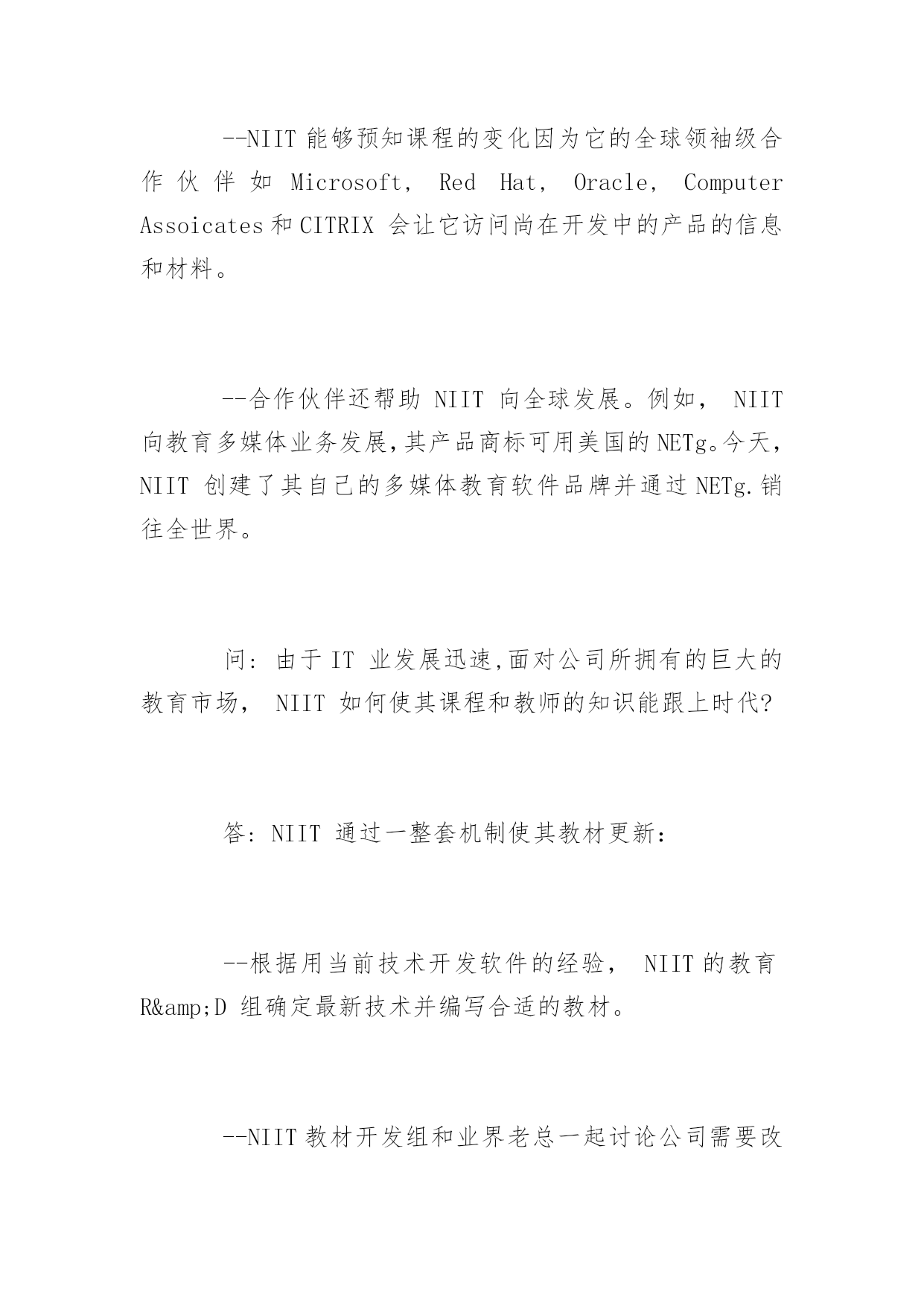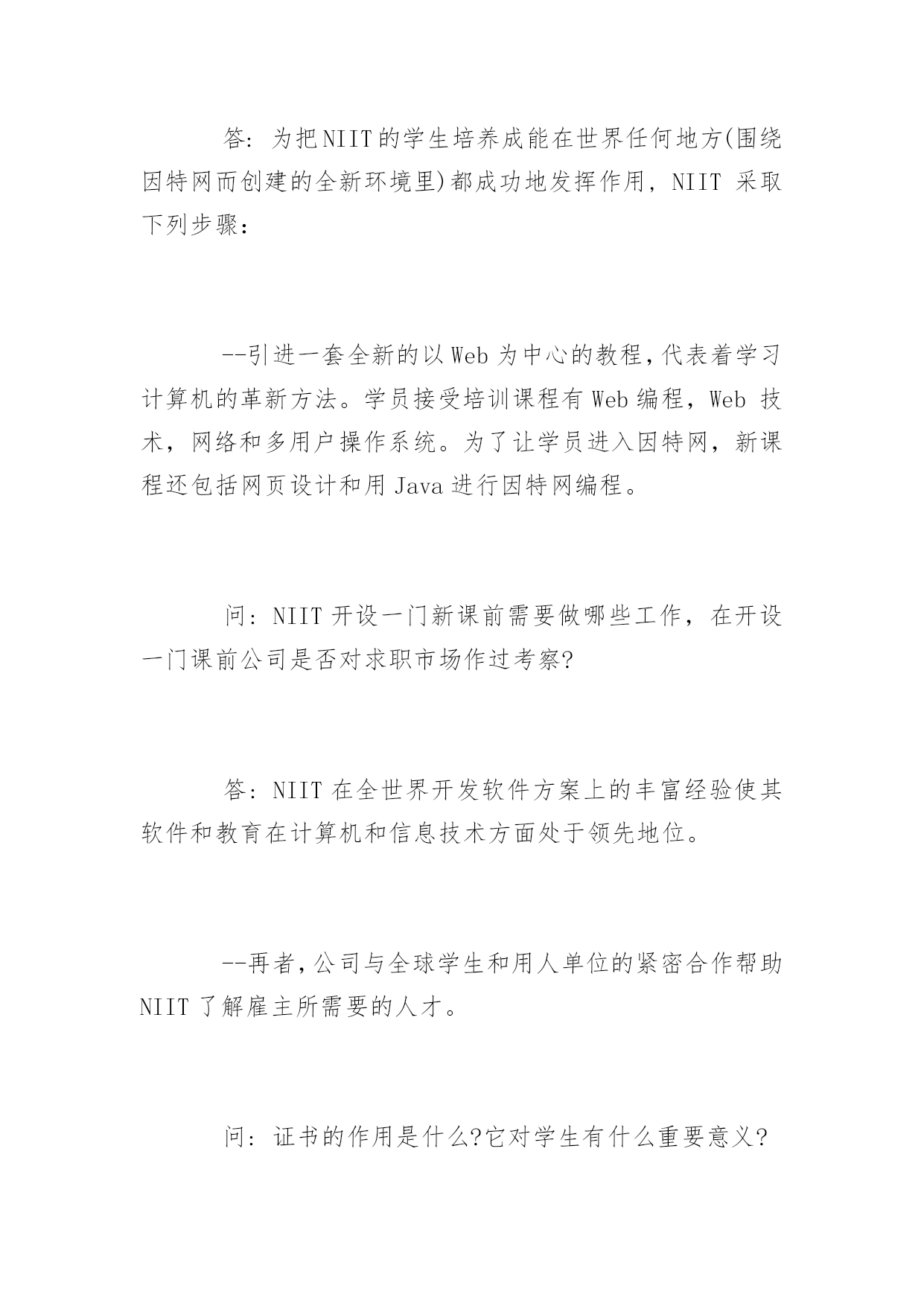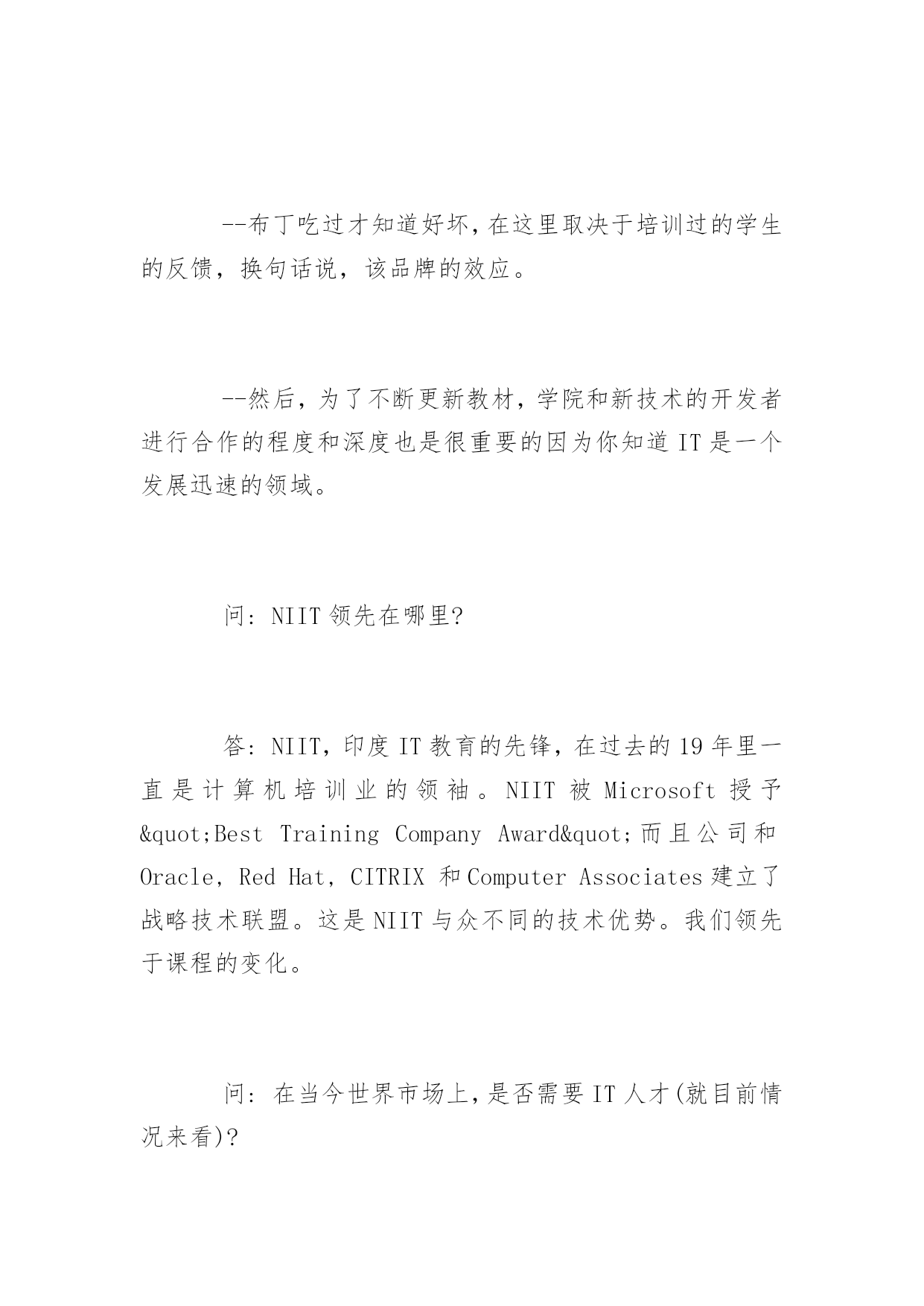 NIIT认证的问与答2016关于NIIT认证的问与答目前,NIIT已成为全球最大的IT教育和提供IT解决方案的公司,同时,NIIT拥有近8000人规模的服务外包软件开发团队、超过500人规模的软件课程体系研发团队,傲居全球软件培训及信息技术领域的领导地位。下面为大家整理的是NIIT认证的常见问题解答!问:在这座城市里有大量的培训学院涌现,面对众多的学校人们将如何选择呢?答:在选择IT培训学校时要考虑几件事,最重要的是:--学院过去的情况如何?--它是否已为培训制定了可接受的标准?--布丁吃过才知道好坏,在这里取决于培训过的学生的反馈,换句话说,该品牌的效应。--然后,为了不断更新教材,学院和新技术的开发者进行合作的程度和深度也是很重要的因为你知道IT是一个发展迅速的领域。问:NIIT领先在哪里?答:NIIT,印度IT教育的先锋,在过去的19年里一直是计算机培训业的领袖。NIIT被Microsoft授予"BestTrainingCompanyAward"而且公司和Oracle,RedHat,CITRIX和ComputerAssociates建立了战略技术联盟。这是NIIT与众不同的技术优势。我们领先于课程的变化。问:在当今世界市场上,是否需要IT人才(就目前情况来看)?答:目前的形势正掩盖着一个事实即对IT人才的巨大需求量。--美国IT协会的最新报告显示今年单是美国就缺700,000位IT专家。--来自EITO(欧洲研究体)的最新统计显示1千万个工作机会在因特网和通讯技术领域。--最近的形势还表明目前市场上IT人才仍供不应求尽管目前技术工人还面临着失业危机。--全球还短缺受过专业训练的IT人士。问:NIIT如何满足中国市场上的IT培训要求?答:为把NIIT的学生培养成能在世界任何地方(围绕因特网而创建的全新环境里)都成功地发挥作用,NIIT采取下列步骤:--引进一套全新的以Web为中心的教程,代表着学习计算机的革新方法。学员接受培训课程有Web编程,Web技术,网络和多用户操作系统。为了让学员进入因特网,新课程还包括网页设计和用Java进行因特网编程。问:NIIT开设一门新课前需要做哪些工作,在开设一门课前公司是否对求职市场作过考察?答:NIIT在全世界开发软件方案上的丰富经验使其软件和教育在计算机和信息技术方面处于领先地位。--再者,公司与全球学生和用人单位的紧密合作帮助NIIT了解雇主所需要的人才。问:证书的作用是什么?它对学生有什么重要意义?答:证书的最大优势在于它所设计的课程和世界IT业界的实际应用软件是一一对应的,这使软件开发商和培训专家同时受益。--证书对于培训中心来说也是很重要的,因为得到象Microsoft这些公司评估和认可的学习中心会格外受到青睐。--对于学生来说,该证书也是一种补充资格,在CV方面有很高的价值。Microsoft认证专家,例如,专门学过Microsoft技术,他们强烈希望扩大Microsoft产品的'用途。问:与外国公司合作的意义何在?答:正如前面提到的,与全球软件业合作对于不断更新教材内容非常关键。--NIIT能够预知课程的变化因为它的全球领袖级合作伙伴如Microsoft,RedHat,Oracle,ComputerAssoicates和CITRIX会让它访问尚在开发中的产品的信息和材料。--合作伙伴还帮助NIIT向全球发展。例如,NIIT向教育多媒体业务发展,其产品商标可用美国的NETg。今天,NIIT创建了其自己的多媒体教育软件品牌并通过NETg.销往全世界。问:由于IT业发展迅速,面对公司所拥有的巨大的教育市场,NIIT如何使其课程和教师的知识能跟上时代?答:NIIT通过一整套机制使其教材更新:--根据用当前技术开发软件的经验,NIIT的教育R&D组确定最新技术并编写合适的教材。--NIIT教材开发组和业界老总一起讨论公司需要改进和增加的知识领域。--R&D组所制定的新的学习方式将发生重大变化,从课堂讲解到基于技术的培训和在因特网上学习。--结合所有业务优势,NIIT通过因特网把学生引入到新技术的变化中来。问:NIIT在其技术伙伴平台上提供的课程是什么?答:Microsoft:NIIT为Microsoft技术开发了1000小时的教育内容涉及各种课程包括Net,XML,e-Commerce,Windows2000,WindowsXP,VisualStudio,Biztalk和MSTV平台。--Oracle:NIIT和Oracle的关系是在Oracle8i平台上的Web教育。网络上的系列课程使8i针对那些或者想升级其技术或者想转向该平台的用户。--ComputerAsso