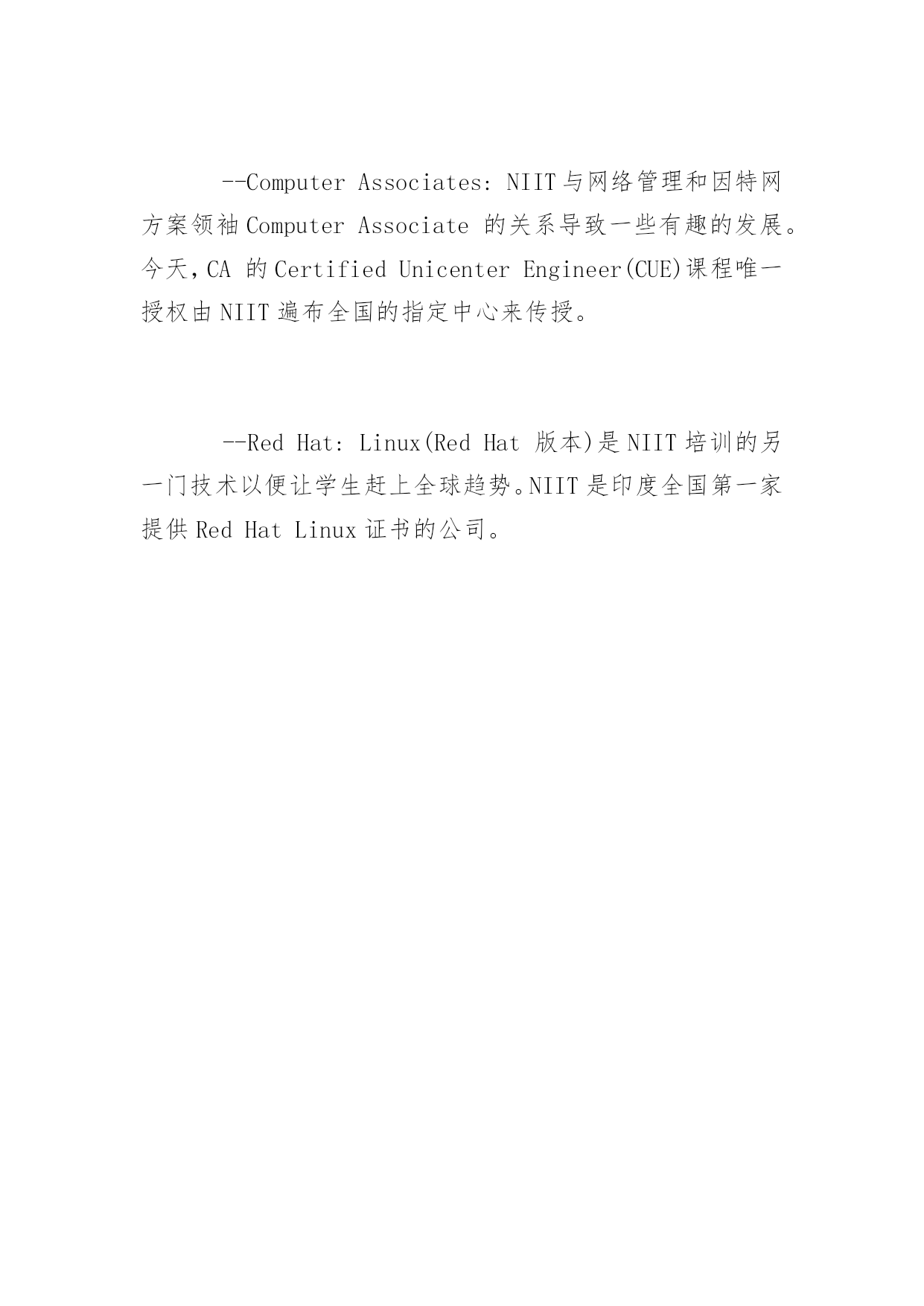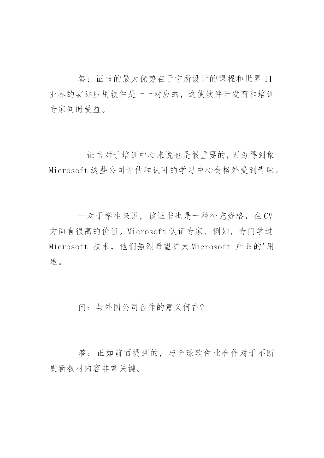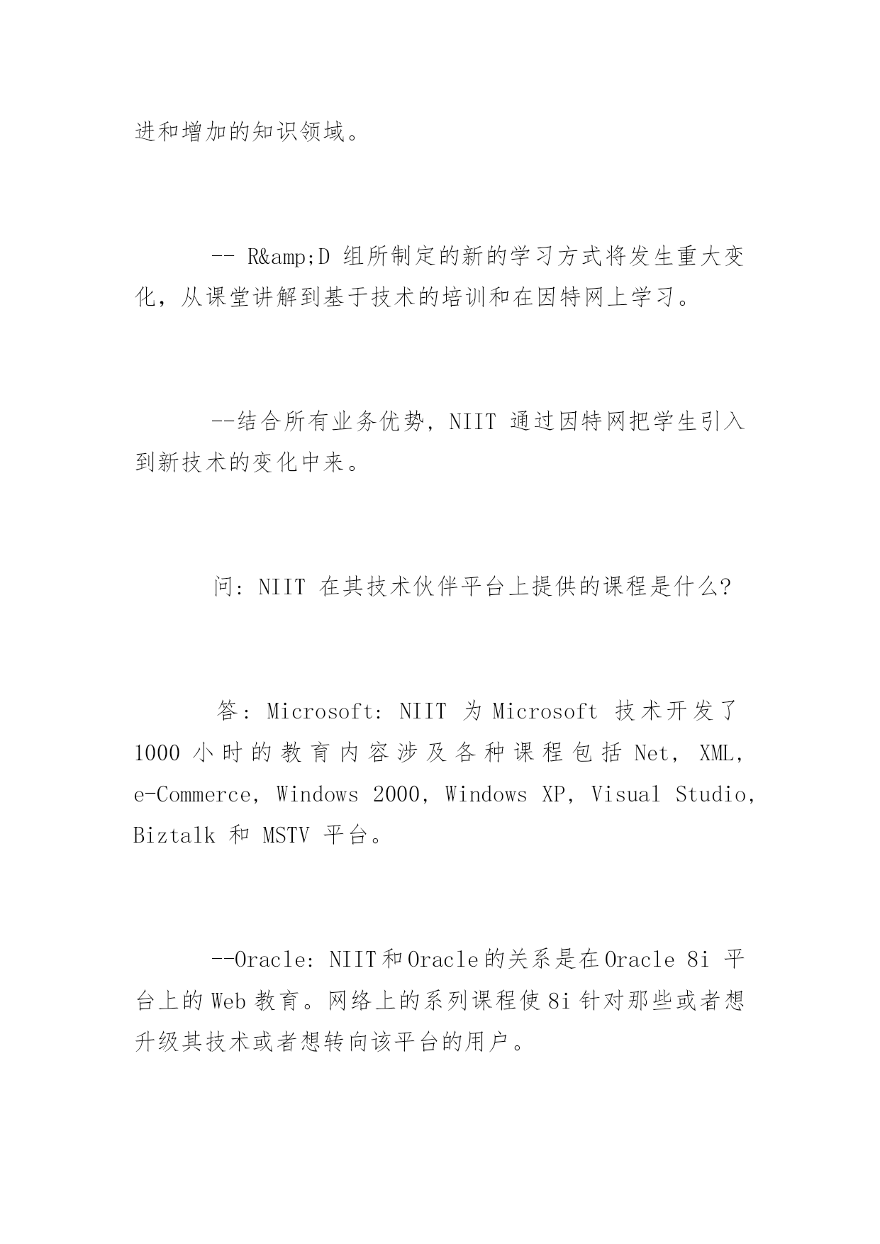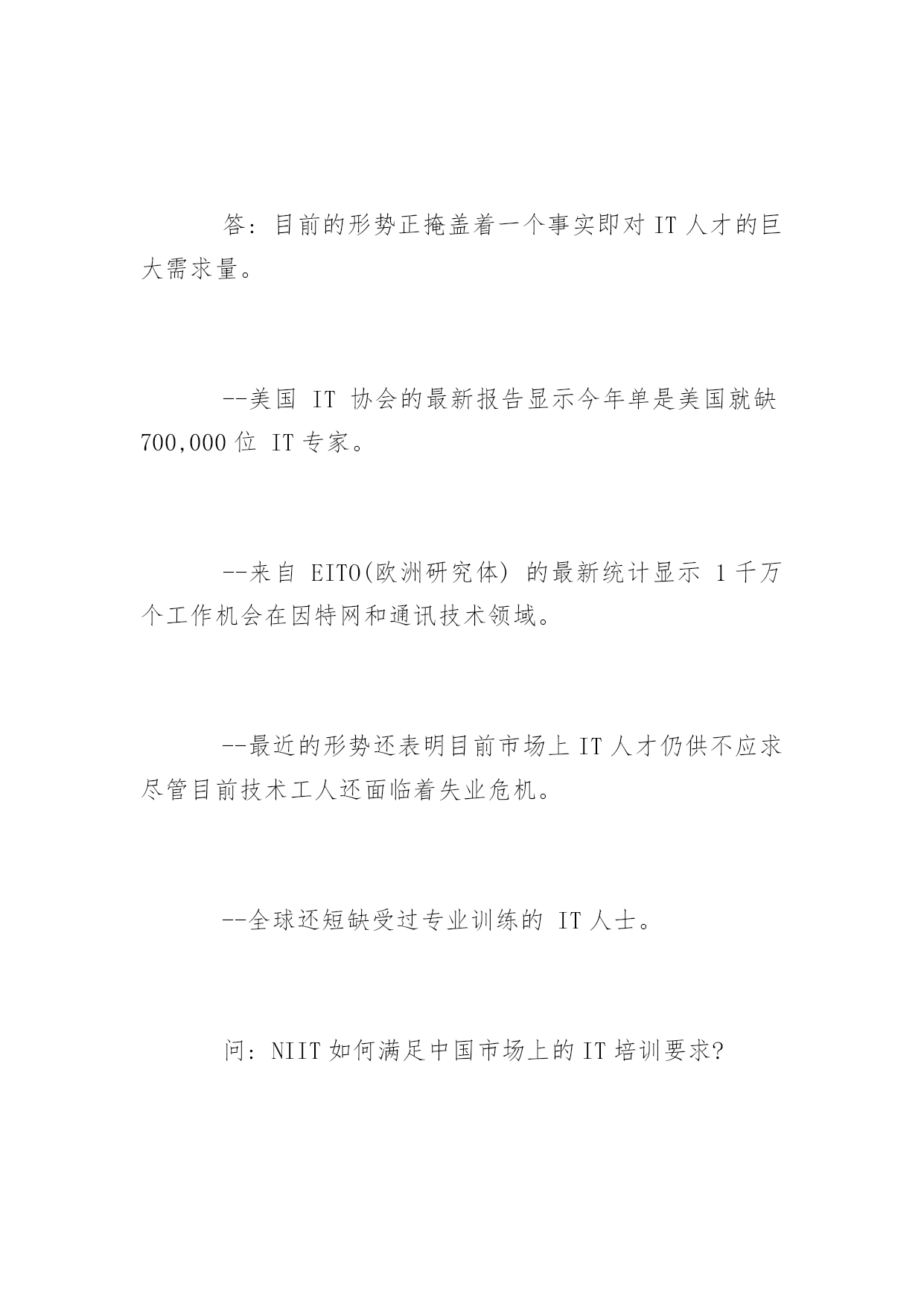 NIIT认证的问与答2016关于NIIT认证的问与答目前,NIIT已成为全球最大的IT教育和提供IT解决方案的公司,同时,NIIT拥有近8000人规模的服务外包软件开发团队、超过500人规模的软件课程体系研发团队,傲居全球软件培训及信息技术领域的领导地位。下面为大家整理的是NIIT认证的常见问题解答!问:在这座城市里有大量的培训学院涌现,面对众多的学校人们将如何选择呢?答:在选择IT培训学校时要考虑几件事,最重要的是:--学院过去的情况如何?--它是否已为培训制定了可接受的标准?--布丁吃过才知道好坏,在这里取决于培训过的学生的反馈,换句话说,该品牌的效应。--然后,为了不断更新教材,学院和新技术的开发者进行合作的程度和深度也是很重要的因为你知道IT是一个发展迅速的领域。问:NIIT领先在哪里?答:NIIT,印度IT教育的先锋,在过去的19年里一直是计算机培训业的领袖。NIIT被Microsoft授予"BestTrainingCompanyAward"而且公司和Oracle,RedHat,CITRIX和ComputerAssociates建立了战略技术联盟。这是NIIT与众不同的技术优势。我们领先于课程的变化。问:在当今世界市场上,是否需要IT人才(就目前情况来看)?答:目前的形势正掩盖着一个事实即对IT人才的巨大需求量。--美国IT协会的最新报告显示今年单是美国就缺700,000位IT专家。--来自EITO(欧洲研究体)的最新统计显示1千万个工作机会在因特网和通讯技术领域。--最近的形势还表明目前市场上IT人才仍供不应求尽管目前技术工人还面临着失业危机。--全球还短缺受过专业训练的IT人士。问:NIIT如何满足中国市场上的IT培训要求?答:为把NIIT的学生培养成能在世界任何地方(围绕因特网而创建的全新环境里)都成功地发挥作用,NIIT采取下列步骤:--引进一套全新的以Web为中心的教程,代表着学习计算机的革新方法。学员接受培训课程有Web编程,Web技术,网络和多用户操作系统。为了让学员进入因特网,新课程还包括网页设计和用Java进行因特网编程。问:NIIT开设一门新课前需要做哪些工作,在开设一门课前公司是否对求职市场作过考察?答:NIIT在全世界开发软件方案上的丰富经验使其软件和教育在计算机和信息技术方面处于领先地位。--再者,公司与全球学生和用人单位的紧密合作帮助NIIT了解雇主所需要的人才。问:证书的作用是什么?它对学生有什么重要意义?答:证书的最大优势在于它所设计的课程和世界IT业界的实际应用软件是一一对应的,这使软件开发商和培训专家同时受益。--证书对于培训中心来说也是很重要的,因为得到象Microsoft这些公司评估和认可的学习中心会格外受到青睐。--对于学生来说,该证书也是一种补充资格,在CV方面有很高的价值。Microsoft认证专家,例如,专门学过Microsoft技术,他们强烈希望扩大Microsoft产品的'用途。问:与外国公司合作的意义何在?答:正如前面提到的,与全球软件业合作对于不断更新教材内容非常关键。--NIIT能够预知课程的变化因为它的全球领袖级合作伙伴如Microsoft,RedHat,Oracle,ComputerAssoicates和CITRIX会让它访问尚在开发中的产品的信息和材料。--合作伙伴还帮助NIIT向全球发展。例如,NIIT向教育多媒体业务发展,其产品商标可用美国的NETg。今天,NIIT创建了其自己的多媒体教育软件品牌并通过NETg.销往全世界。问:由于IT业发展迅速,面对公司所拥有的巨大的教育市场,NIIT如何使其课程和教师的知识能跟上时代?答:NIIT通过一整套机制使其教材更新:--根据用当前技术开发软件的经验,NIIT的教育R&D组确定最新技术并编写合适的教材。--NIIT教材开发组和业界老总一起讨论公司需要改进和增加的知识领域。--R&D组所制定的新的学习方式将发生重大变化,从课堂讲解到基于技术的培训和在因特网上学习。--结合所有业务优势,NIIT通过因特网把学生引入到新技术的变化中来。问:NIIT在其技术伙伴平台上提供的课程是什么?答:Microsoft:NIIT为Microsoft技术开发了1000小时的教育内容涉及各种课程包括Net,XML,e-Commerce,Windows2000,WindowsXP,VisualStudio,Biztalk和MSTV平台。--Oracle:NIIT和Oracle的关系是在Oracle8i平台上的Web教育。网络上的系列课程使8i针对那些或者想升级其技术或者想转向该平台的用户。--ComputerAsso