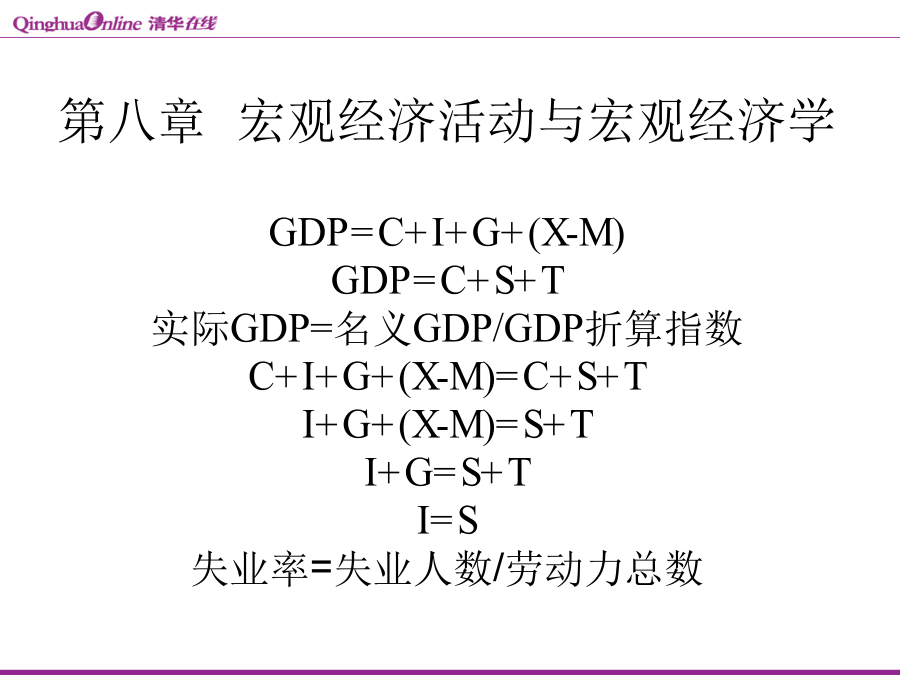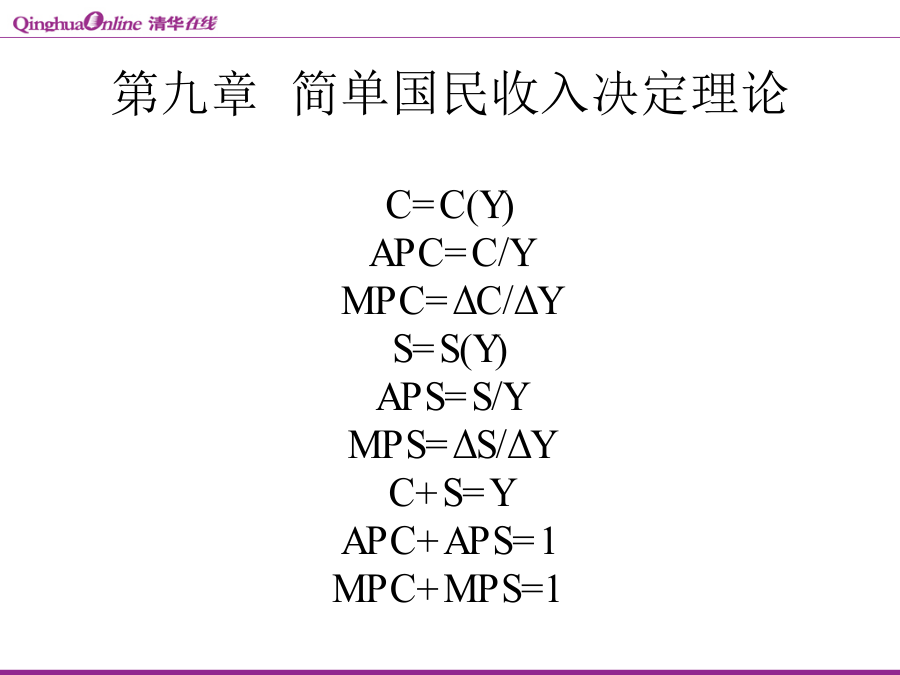 宏观经济学部分张弘2010年1月23日B第八章宏观经济活动与宏观经济学GDP=C+I+G+(X-M)GDP=C+S+T实际GDP=名义GDP/GDP折算指数C+I+G+(X-M)=C+S+TI+G+(X-M)=S+TI+G=S+TI=S失业率=失业人数/劳动力总数关键名词与思考题一、名词解释国内生产总值、国民生产总值、个人可支配收入、失业率、名义的和实际的国民收入二、简述题使用收入和支出方法进行国民收入核算时应注意哪些问题?国民收入核算与总需求和总供给分析的关系如何?第九章简单国民收入决定理论C=C(Y)APC=C/YMPC=ΔC/ΔYS=S(Y)APS=S/YMPS=ΔS/ΔYC+S=YAPC+APS=1MPC+MPS=1AAC=α+βY及I=I0时,Y=C+I=α+βY+I0(C+I)2C=α+βYISG=G0Yd=Y-T0C=α+βYd=α+β(Y-T0)Y=C+I+G=α+β(Y-T0)+I0+G0Y=(α-βT0+I0+G0)/(1-β)C+I+G△Y=△I/(1-β)△Y=△G/(1-β)△Y=-β△T/(1-β)△Y=△G/(1-β)-β△T/(1-β)=△G(=△T)关键名词与思考题一、名词解释消费函数、边际消费倾向、储蓄函数、边际储蓄倾向、投资乘数、税收乘数、平衡预算乘数二、简述题为什么说投资等于储蓄(I=S)是简单国民收入决定的基本均衡条件?国民收入的变动机制是什么?简述产品市场的均衡条件并加以简要评论。在简单的国民收入决定模型中加入政府变动将如何影响均衡国民收入的决定?简述凯恩斯的乘数理论,并指出其发挥作用的条件。三、计算与证明已知消费函数为C=100+0.6Y,投资为自主投资,I=60,求:均衡的国民收入(Y)为多少?均衡的储蓄量(S)为多少?如果充分就业的国民收入水平为Yf=1000,那么,为使该经济达到充分就业的均衡状态,投资量应如何变化?本题中投资乘数(k)为多少?历年考题名次解释投资乘数(2009年)论述题假设某经济体存在下列关系式,消费函数为C=100+0.72Y,投资函数为I=200-500r,政府购买为G=200,净出口函数为NX=100-0.12Y-500r,货币需求函数为M/P=0.8Y-2000r,名义货币供给M=800。求:总需求函数。当价格水平P=1时,均衡产出。假设通货膨胀预期为0,价格调整函数为πt=1.2(Yt-1250)/1250,求潜在的产出水平。如果P变为0.5,求均衡收入。此时价格有向上调整的压力,还是向下调整的压力?(2007年)第十章产品市场和货币市场的一般均衡R0=R1/(1+rC)+…+Rn/(1+rC)nI=I(r)S(Y)=I(r)S(Y-T)+T(Y)=I(r)+G045°rr45°rrr关键名词与思考题一、名词解释资本边际效率、投资函数、IS曲线、流动偏好、流动偏好陷阱、LM曲线二、简述题简述货币市场的均衡条件并加以简要评论。简述凯恩斯的货币理论。凯恩斯是如何解释资本主义经济的有效需求不足的?他所引申出的政策结论是什么?三、计算与证明已知消费函数为C=100+0.6Y(或储蓄函数),投资函数为I=520-r,货币需求为L=0.2Y-4r,货币的供给为m=120。写出IS曲线方程。写出LM曲线方程。写出IS-LM模型的具体方程并求解均衡的国民收入(Y)和均衡的利息率(r)各为多少?如果自主投资由520增加到550,均衡国民收入会如何变动?你的结果与乘数定理的结论相同吗?请给出解释。历年考题1、名词解释资本边际效率(2005年)2、选择题如果利率和收入的组合点出现在IS曲线的右上方、LM曲线的左上方的区域中,则表明______________。(2008年)投资小于储蓄且货币给小于货币需求投资大于储蓄且货币需求小于货币供给若利率和收入都能按供求情况自动得到调整,则利率下降,收入下降若利率和收入都能按供求情况自动得到调整,则利率下降,收入上升3、简答和计算题IS-LM模型中均衡利率是如何决定的?(2003年)已知:储蓄S=-50+0.2Y,投资I=150-6r,L=0.2Y-4r,M=150求:①IS和LM曲线方程。②均衡国民收入和均衡利息率。③当自主投资从150上升到200,均衡国民收入会怎样变化?与乘数定理结论是否相同?试解释?(2004年)IS曲线为何向右下倾斜?(2005年)考点预测假定:消费函数为C=50+0.8Y,投资函数为I=100-5r;消费函数为C=50+0.8Y,投资函数为I=100-l0r;消费函数为C=50+0.75Y,投资函数为I=100-10r。求A、B、C的IS曲线;比较A