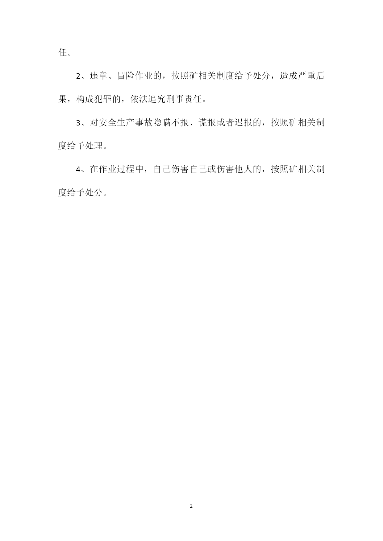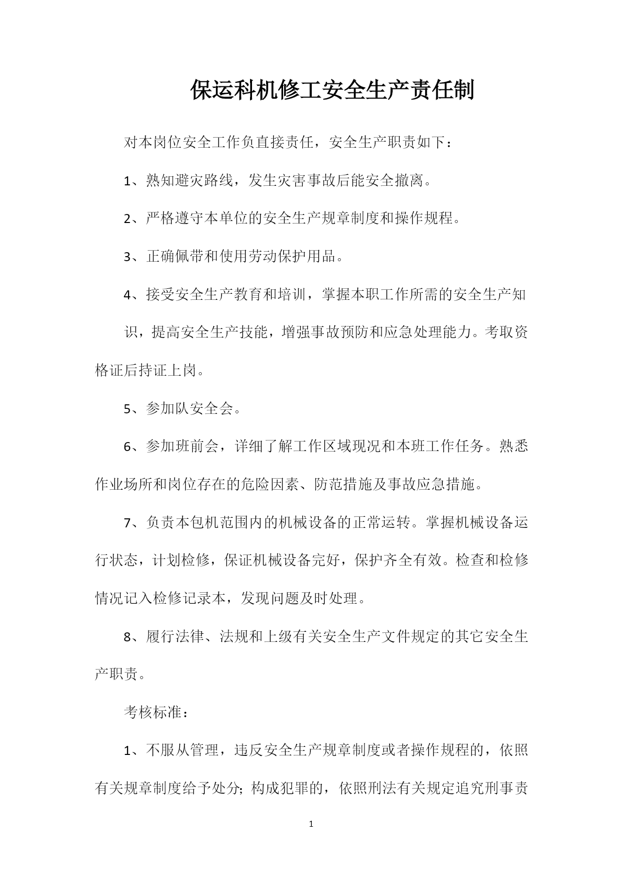 PAGEPAGE2保运科机修工安全生产责任制对本岗位安全工作负直接责任,安全生产职责如下:1、熟知避灾路线,发生灾害事故后能安全撤离。2、严格遵守本单位的安全生产规章制度和操作规程。3、正确佩带和使用劳动保护用品。4、接受安全生产教育和培训,掌握本职工作所需的安全生产知识,提高安全生产技能,增强事故预防和应急处理能力。考取资格证后持证上岗。5、参加队安全会。6、参加班前会,详细了解工作区域现况和本班工作任务。熟悉作业场所和岗位存在的危险因素、防范措施及事故应急措施。7、负责本包机范围内的机械设备的正常运转。掌握机械设备运行状态,计划检修,保证机械设备完好,保护齐全有效。检查和检修情况记入检修记录本,发现问题及时处理。8、履行法律、法规和上级有关安全生产文件规定的其它安全生产职责。考核标准:1、不服从管理,违反安全生产规章制度或者操作规程的,依照有关规章制度给予处分;构成犯罪的,依照刑法有关规定追究刑事责任。2、违章、冒险作业的,按照矿相关制度给予处分,造成严重后果,构成犯罪的,依法追究刑事责任。3、对安全生产事故隐瞒不报、谎报或者迟报的,按照矿相关制度给予处理。4、在作业过程中,自己伤害自己或伤害他人的,按照矿相关制度给予处分。
