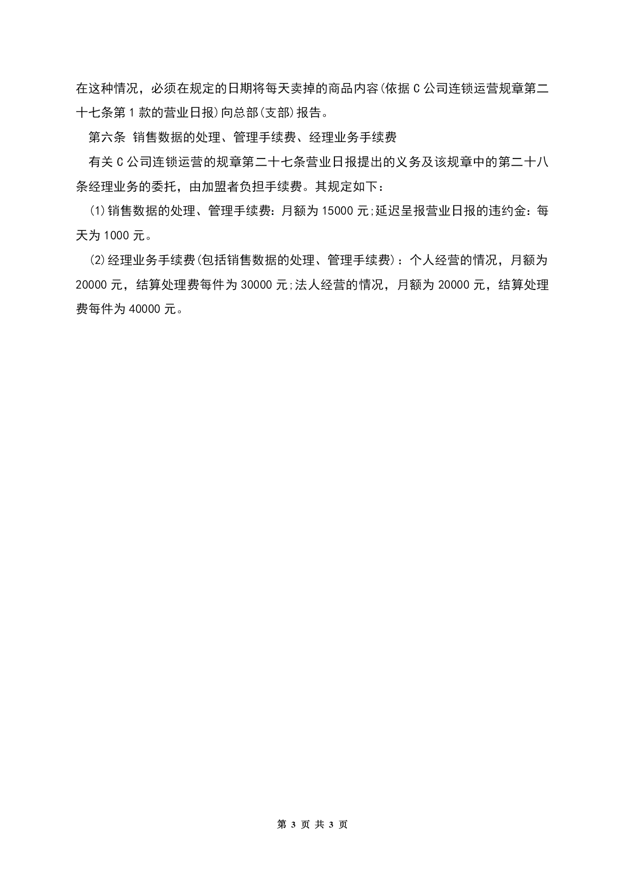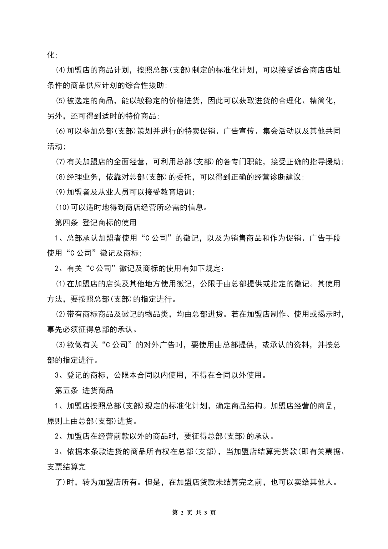 第PAGE\*MERGEFORMAT3页共NUMPAGES\*MERGEFORMAT3页自由连锁加盟合同文本(以下称:“加盟者”或“加盟店”)赞成C公司主导的连锁理想,协约遵守其运营规章中的各条款,并申请加盟,C公司亦承认其加盟。两者就有关加盟事项缔结如下合同:第一条组织1、C公司(以下称“总部”)主导本事业,并所有“C公司”登记商标。2、总部适应需要,可在每个加盟者的地区集团设“地区总部”或直辖的“分部”(与前款一样,统称“总部”)。3、总部在没有设地区总部或直辖分部的地区,可将总部事业的一部分委托给第三者,并称作委托业务的“支部”(以下称“支部”)。第二条加盟1、加盟金。每个店铺为元,在缔结加盟合同时向总部支付。并自双方在相互确认书上签字时起,此加盟金即充作委托保管的加盟申请保证金。此加盟金不返还。2、加盟者是位于(商店住所)的商店“C公司店”的经营者,本商店作为C公司连锁的加盟店,具备以下条件,并决心遵守本合同,诚实地从事经营。(1)依照总部的标准化计划,保持商店的结构;(2)维持不接受第三者制约的经营体制;(3)加盟者是由自身或适合法律规定资格的代理者专门从事经营,或者要使从业者具有统一的连锁意识;(4)在积极地协助连锁活动的同时,努力提高改善经营;(5)要认识作为C公司连锁商店的社会使命,忠实地为顾客服务,作一个永远提供便宜商品的商店。第三条加盟特权加盟者要具备以下基本的特权:(1)依靠使用“C公司”徽记进行营业,能享受“C公司”的知名度和信用;(2)进货“C公司”商标的商品,才能使用“C公司”的商标进行经营活动;(3)在商店的新设或装修方面,按照总部(支部)规定的标准化计划,争取商店的现代化;(4)加盟店的商品计划,按照总部(支部)制定的标准化计划,可以接受适合商店店址条件的商品供应计划的综合性援助;(5)被选定的商品,能以较稳定的价格进货,因此可以获取进货的合理化、精简化,另外,还可得到适时的特价商品;(6)可以参加总部(支部)策划并进行的特卖促销、广告宣传、集会活动以及其他共同活动;(7)有关加盟店的全面经营,可利用总部(支部)的各专门职能,接受正确的指导援助;(8)经理业务,依靠对总部(支部)的委托,可以得到正确的经营诊断建议;(9)加盟者及从业人员可以接受教育培训;(10)可以适时地得到商店经营所必需的信息。第四条登记商标的使用1、总部承认加盟者使用“C公司”的徽记,以及为销售商品和作为促销、广告手段使用“C公司”徽记及商标;2、有关“C公司”徽记及商标的使用有如下规定:(1)在加盟店的店头及其他地方使用徽记,公限于由总部提供或指定的徽记。其使用方法,要按照总部(支部)的指定进行。(2)带有商标商品及徽记的物品类,均由总部进货。若在加盟店制作、使用或揭示时,事先必须征得总部的承认。(3)欲做有关“C公司”的对外广告时,要使用由总部提供,或承认的资料,并按总部的指定进行。3、登记的商标,公限本合同以内使用,不得在合同以外使用。第五条进货商品1、加盟店按照总部(支部)规定的标准化计划,确定商品结构。加盟店经营的商品,原则上由总部(支部)进货。2、加盟店在经营前款以外的商品时,要征得总部(支部)的承认。3、依据本条款进货的商品所有权在总部(支部),当加盟店结算完货款(即有关票据、支票结算完了)时,转为加盟店所有。但是,在加盟店货款未结算完之前,也可以卖给其他人。在这种情况,必须在规定的日期将每天卖掉的商品内容(依据C公司连锁运营规章第二十七条第1款的营业日报)向总部(支部)报告。第六条销售数据的处理、管理手续费、经理业务手续费有关C公司连锁运营的规章第二十七条营业日报提出的义务及该规章中的第二十八条经理业务的委托,由加盟者负担手续费。其规定如下:(1)销售数据的处理、管理手续费:月额为15000元;延迟呈报营业日报的违约金:每天为1000元。(2)经理业务手续费(包括销售数据的处理、管理手续费):个人经营的情况,月额为20000元,结算处理费每件为30000元;法人经营的情况,月额为20000元,结算处理费每件为40000元。