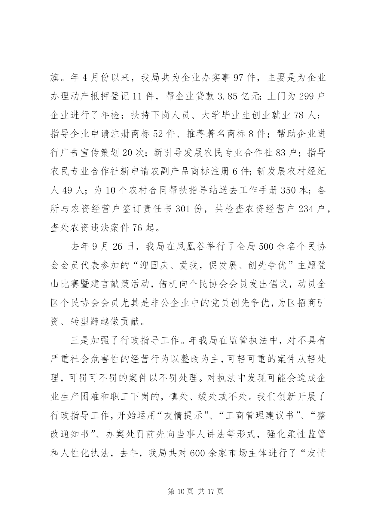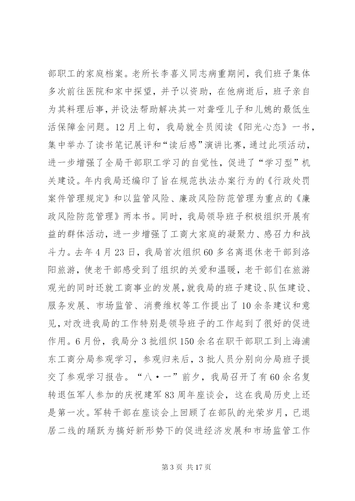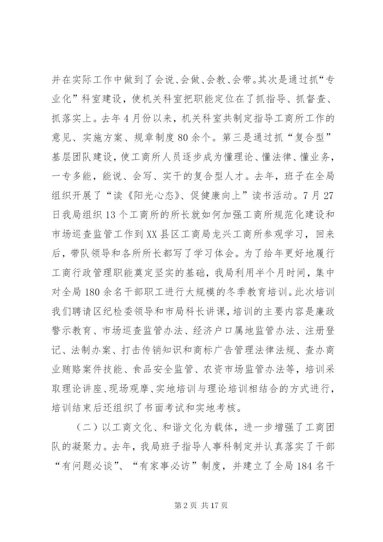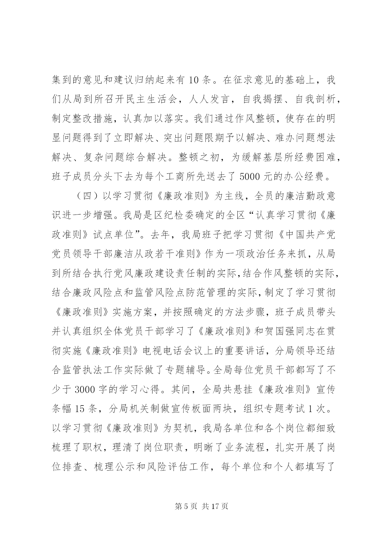 第PAGE\*Arabic\*MERGEFORMAT17页共NUMPAGES\*MERGEFORMAT17页工商局勤廉工作汇报在市工商局和区委、区政府的正确领导下,我们分局领导班子团结带领全局干部职工,坚持以科学发展观为统领,以构建和谐社会为目标,始终坚持“四个统一”,牢牢把握“四个只有”,紧紧围绕“创环境、促发展,抓监管、构和谐,带队伍、树形象”的工作主题,不断解放思想,更新观念,求真务实,开拓创新,加强对企业的扶持服务、加强对市场的巡查监管、加强执法办案和消费维权、加强队伍建设和基础建设,有力地维护了市场秩序和消费安全,有效地防范了监管风险和廉政风险,为建设区经济发展较快集中区域、促进全区经济转型跨越发展做出了新的贡献。区委副书记张建元在我局提交的年工作报告上批示:“工商分局围绕区委、区政府中心工作,做了大量工作,成绩突出。希望在新的一年里,按照转型发展、跨越发展的要求,认真履行职能,再创佳绩。”一、在队伍建设方面,去年,我局领导班子坚持把提升素质作为第一保障,以素质能力建设为核心,以作风纪律整顿为抓手,以内部管理制度创新为保障,努力建设政治上过硬、业务上过硬、作风上过硬的高素质干部队伍。(一)以素质能力培养为抓手,进一步提升了干部队伍的软实力。首先是建设坚强的领导班子。班子成员围绕中心,把握大局,做到了心中有目标、胸中有计划、工作有方法、手中有标竿,并在实际工作中做到了会说、会做、会教、会带。其次是通过抓“专业化”科室建设,使机关科室把职能定位在了抓指导、抓督查、抓落实上。去年4月份以来,机关科室共制定指导工商所工作的意见、实施方案、规章制度80余个。第三是通过抓“复合型”基层团队建设,使工商所人员逐步成为懂理论、懂法律、懂业务,一专多能,能说、会写、实干的复合型人才。去年,班子在全局组织开展了“读《阳光心态》、促健康向上”读书活动。7月27日我局组织13个工商所的所长就如何加强工商所规范化建设和市场巡查监管工作到XX县区工商局龙兴工商所参观学习,回来后,带队领导和各所所长都写了学习体会。为了给年更好地履行工商行政管理职能奠定坚实的基础,我局利用半个月时间,集中对全局180余名干部职工进行大规模的冬季教育培训。此次培训我们聘请区纪检委领导和市局科长讲课,培训的主要内容是廉政警示教育、市场巡查监管办法、经济户口属地监管办法、注册登记、法制办案、打击传销知识和商标广告管理法律法规、查办商业贿赂案件技能、食品安全监管、农资市场监管办法等,培训采取理论讲座、现场观摩、实地培训与理论培训相结合的方式进行,培训结束后还组织了书面考试和实地考核。(二)以工商文化、和谐文化为载体,进一步增强了工商团队的凝聚力。去年,我局班子指导人事科制定并认真落实了干部“有问题必谈”、“有家事必访”制度,并建立了全局184名干部职工的家庭档案。老所长李喜义同志病重期间,我们班子集体多次前往医院和家中探望,并予以资助,在他病逝后,班子亲自为其料理后事,并设法帮助解决其一对聋哑儿子和儿媳的最低生活保障金问题。12月上旬,我局就全员阅读《阳光心态》一书,集中举办了读书笔记展评和“读后感”演讲比赛,通过此项活动,进一步增强了全局干部职工学习的自觉性,促进了“学习型”机关建设。年内我局还编印了旨在规范执法办案行为的《行政处罚案件管理规定》和以监管风险、廉政风险防范管理为重点的《廉政风险防范管理》两本书。同时,我局领导班子积极组织开展有益的群体活动,进一步增强了工商大家庭的凝聚力、感召力和战斗力。去年4月23日,我局首次组织60多名离退休老干部到洛阳旅游,使老干部感受到了组织的关爱和温暖,老干部们在旅游观光的同时还就工商事业的发展,就我局的班子建设、队伍建设、服务发展、市场监管、消费维权等工作提出了10余条建议和意见,对改进我局的工作特别是领导班子的工作起到了很好的促进作用。6月份,我局分3批组织150余名在职干部职工到上海浦东工商分局参观学习,参观归来后,3批人员分别向分局班子提交了参观学习报告。“八·一”前夕,我局召开了有60余名复转退伍军人参加的庆祝建军83周年座谈会,这在我局历史上还是第一次。军转干部在座谈会上回顾了在部队的光荣岁月,已退居二线的踊跃为搞好新形势下的促进经济发展和市场监管工作建言献策,在职的复转军人一致表示要再接再厉、再创佳绩。10月17日,我们组织全局1名离退休人员参加了“舜帝德孝文化节”舜帝陵景区游园活动,离退休人员在游园过程中,纷纷表示离岗不离心、身退心不退,只要局工作需要,他们一定义无返顾、发挥余热。10月至11月,我局又花费近7万元,为166名离退休人员和180名在职人员在市第三人民医院进行了体检。(三)以“整顿作风、解决问题、提升形象、服务发展”为主题,认真开展了队伍作风整顿活动。为加大对此项活动的宣传