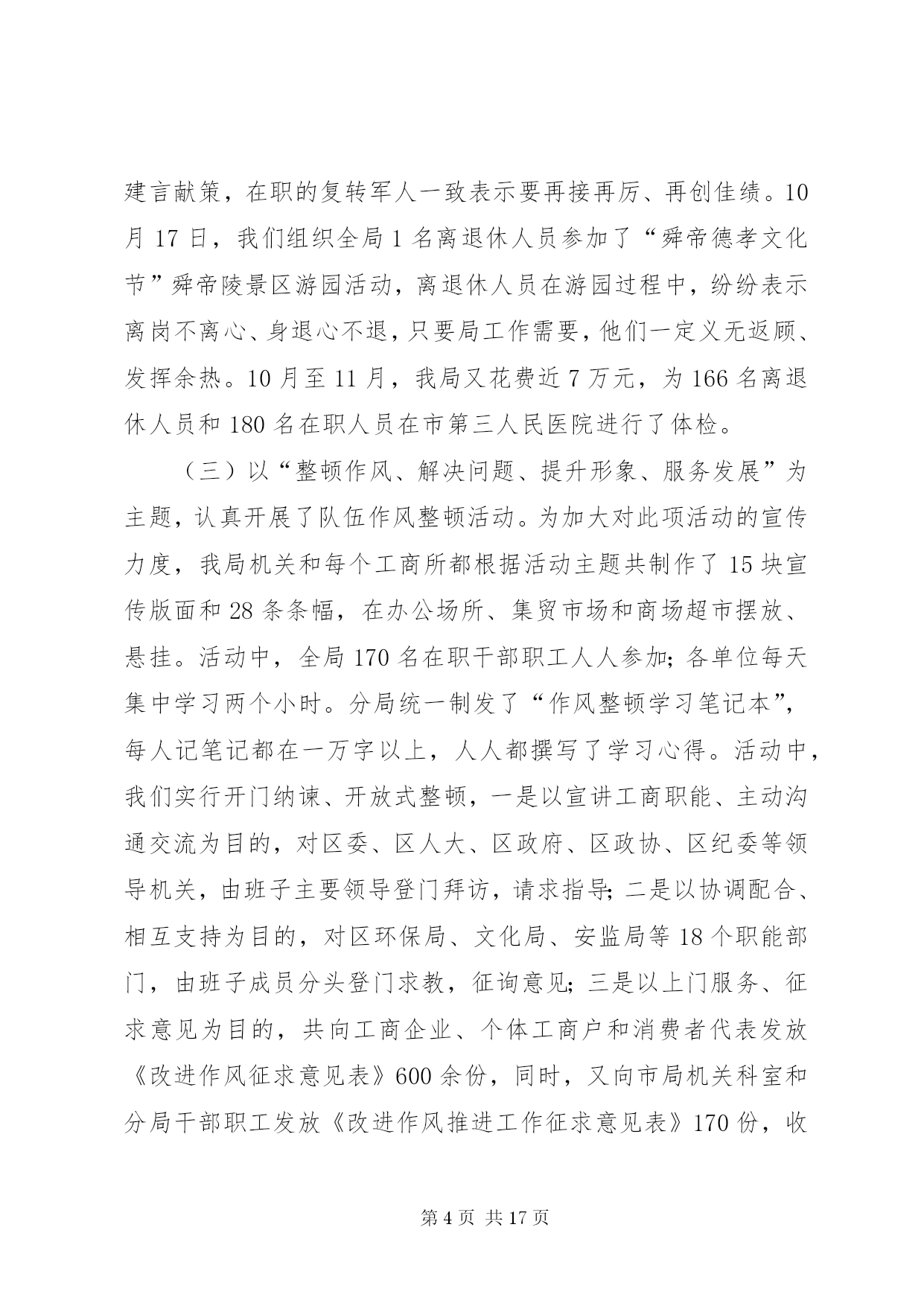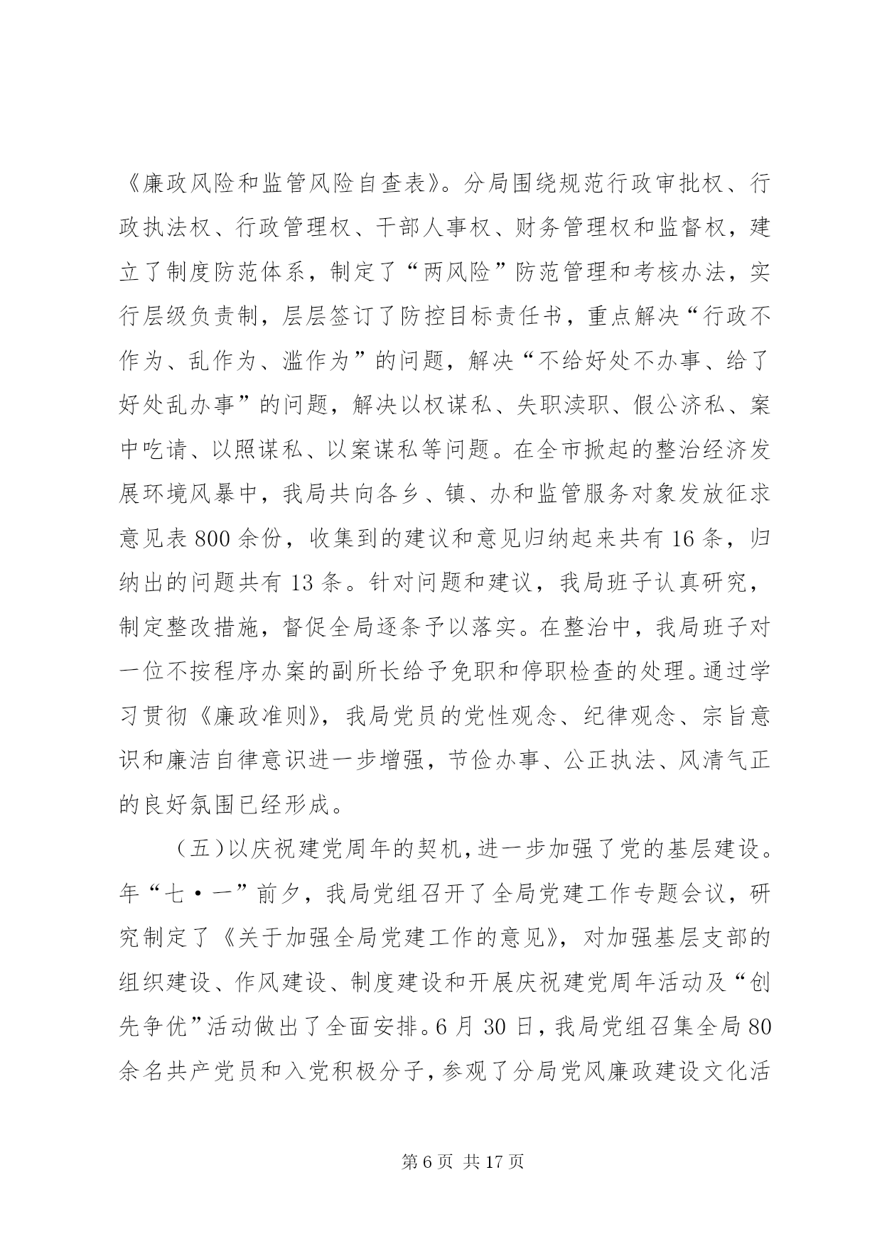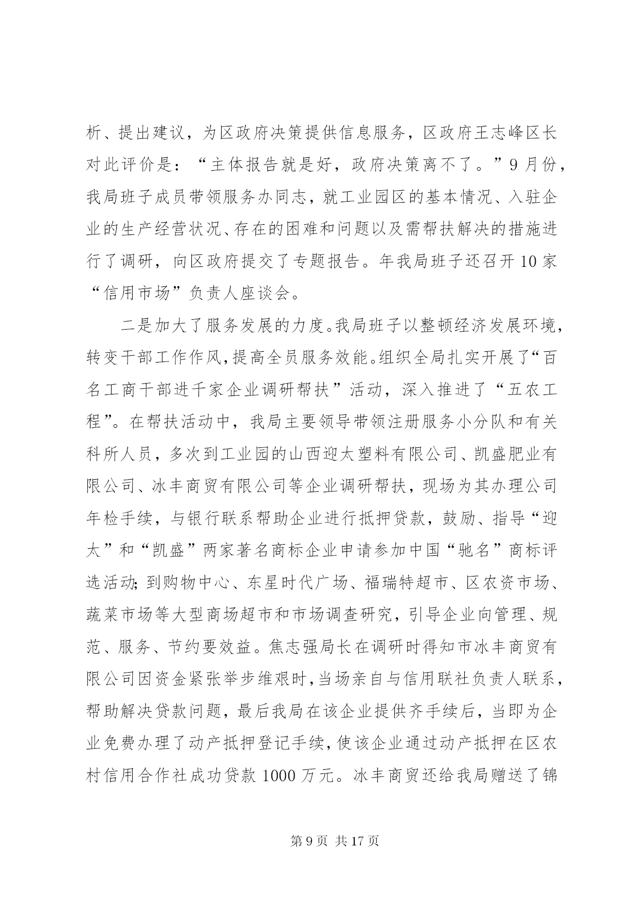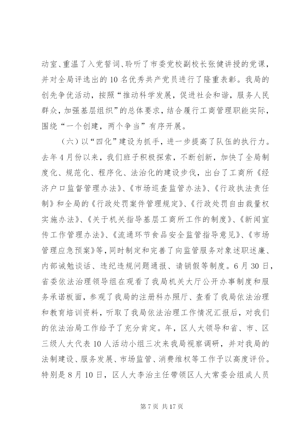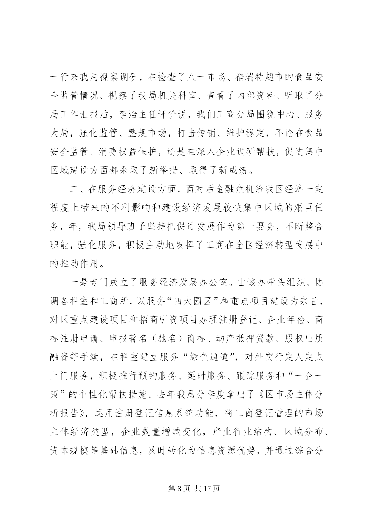 第PAGE\*Arabic\*MERGEFORMAT17页共NUMPAGES\*MERGEFORMAT17页工商局勤廉工作汇报在市工商局和区委、区政府的正确领导下,我们分局领导班子团结带领全局干部职工,坚持以科学发展观为统领,以构建和谐社会为目标,始终坚持“四个统一”,牢牢把握“四个只有”,紧紧围绕“创环境、促发展,抓监管、构和谐,带队伍、树形象”的工作主题,不断解放思想,更新观念,求真务实,开拓创新,加强对企业的扶持服务、加强对市场的巡查监管、加强执法办案和消费维权、加强队伍建设和基础建设,有力地维护了市场秩序和消费安全,有效地防范了监管风险和廉政风险,为建设区经济发展较快集中区域、促进全区经济转型跨越发展做出了新的贡献。区委副书记张建元在我局提交的年工作报告上批示:“工商分局围绕区委、区政府中心工作,做了大量工作,成绩突出。希望在新的一年里,按照转型发展、跨越发展的要求,认真履行职能,再创佳绩。”一、在队伍建设方面,去年,我局领导班子坚持把提升素质作为第一保障,以素质能力建设为核心,以作风纪律整顿为抓手,以内部管理制度创新为保障,努力建设政治上过硬、业务上过硬、作风上过硬的高素质干部队伍。(一)以素质能力培养为抓手,进一步提升了干部队伍的软实力。首先是建设坚强的领导班子。班子成员围绕中心,把握大局,做到了心中有目标、胸中有计划、工作有方法、手中有标竿,并在实际工作中做到了会说、会做、会教、会带。其次是通过抓“专业化”科室建设,使机关科室把职能定位在了抓指导、抓督查、抓落实上。去年4月份以来,机关科室共制定指导工商所工作的意见、实施方案、规章制度80余个。第三是通过抓“复合型”基层团队建设,使工商所人员逐步成为懂理论、懂法律、懂业务,一专多能,能说、会写、实干的复合型人才。去年,班子在全局组织开展了“读《阳光心态》、促健康向上”读书活动。7月27日我局组织13个工商所的所长就如何加强工商所规范化建设和市场巡查监管工作到XX县区工商局龙兴工商所参观学习,回来后,带队领导和各所所长都写了学习体会。为了给年更好地履行工商行政管理职能奠定坚实的基础,我局利用半个月时间,集中对全局180余名干部职工进行大规模的冬季教育培训。此次培训我们聘请区纪检委领导和市局科长讲课,培训的主要内容是廉政警示教育、市场巡查监管办法、经济户口属地监管办法、注册登记、法制办案、打击传销知识和商标广告管理法律法规、查办商业贿赂案件技能、食品安全监管、农资市场监管办法等,培训采取理论讲座、现场观摩、实地培训与理论培训相结合的方式进行,培训结束后还组织了书面考试和实地考核。(二)以工商文化、和谐文化为载体,进一步增强了工商团队的凝聚力。去年,我局班子指导人事科制定并认真落实了干部“有问题必谈”、“有家事必访”制度,并建立了全局184名干部职工的家庭档案。老所长李喜义同志病重期间,我们班子集体多次前往医院和家中探望,并予以资助,在他病逝后,班子亲自为其料理后事,并设法帮助解决其一对聋哑儿子和儿媳的最低生活保障金问题。12月上旬,我局就全员阅读《阳光心态》一书,集中举办了读书笔记展评和“读后感”演讲比赛,通过此项活动,进一步增强了全局干部职工学习的自觉性,促进了“学习型”机关建设。年内我局还编印了旨在规范执法办案行为的《行政处罚案件管理规定》和以监管风险、廉政风险防范管理为重点的《廉政风险防范管理》两本书。同时,我局领导班子积极组织开展有益的群体活动,进一步增强了工商大家庭的凝聚力、感召力和战斗力。去年4月23日,我局首次组织60多名离退休老干部到洛阳旅游,使老干部感受到了组织的关爱和温暖,老干部们在旅游观光的同时还就工商事业的发展,就我局的班子建设、队伍建设、服务发展、市场监管、消费维权等工作提出了10余条建议和意见,对改进我局的工作特别是领导班子的工作起到了很好的促进作用。6月份,我局分3批组织150余名在职干部职工到上海浦东工商分局参观学习,参观归来后,3批人员分别向分局班子提交了参观学习报告。“八·一”前夕,我局召开了有60余名复转退伍军人参加的庆祝建军83周年座谈会,这在我局历史上还是第一次。军转干部在座谈会上回顾了在部队的光荣岁月,已退居二线的踊跃为搞好新形势下的促进经济发展和市场监管工作建言献策,在职的复转军人一致表示要再接再厉、再创佳绩。10月17日,我们组织全局1名离退休人员参加了“舜帝德孝文化节”舜帝陵景区游园活动,离退休人员在游园过程中,纷纷表示离岗不离心、身退心不退,只要局工作需要,他们一定义无返顾、发挥余热。10月至11月,我局又花费近7万元,为166名离退休人员和180名在职人员在市第三人民医院进行了体检。(三)以“整顿作风、解决问题、提升形象、服务发展”为主题,认真开展了队伍作风整顿活动。为加大对此项活动的宣传