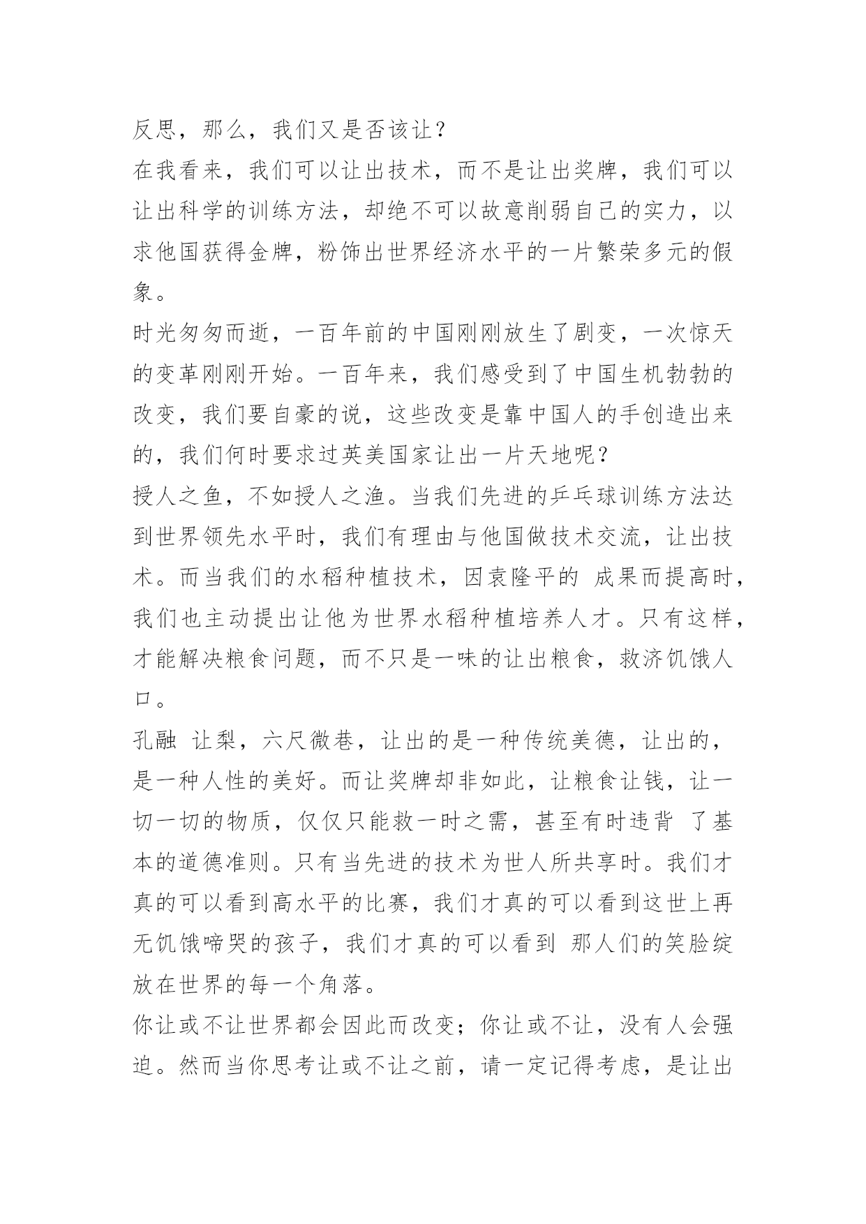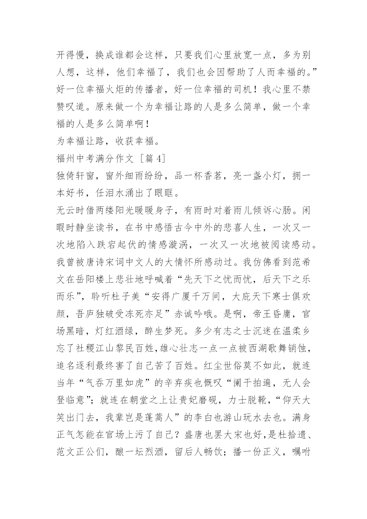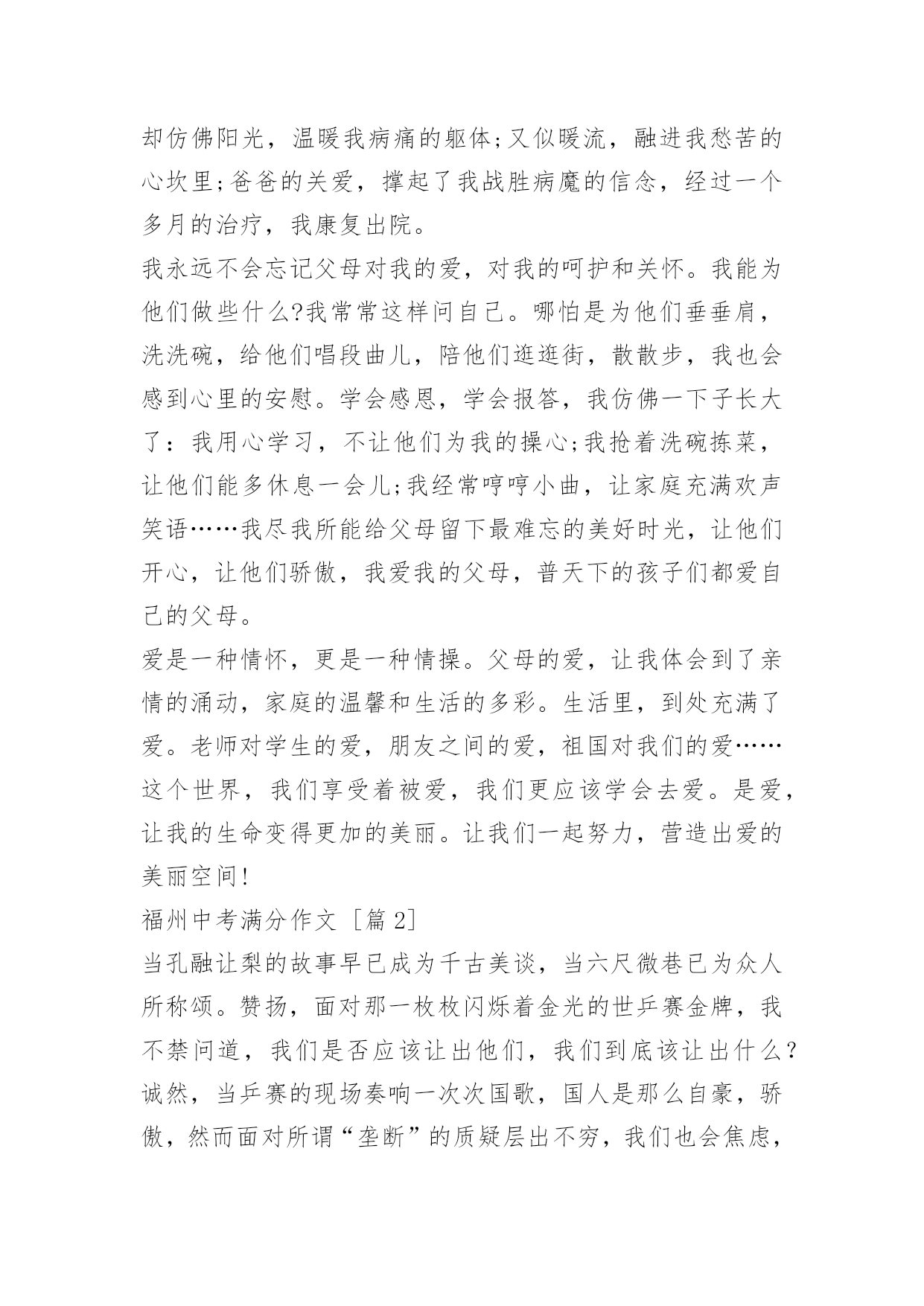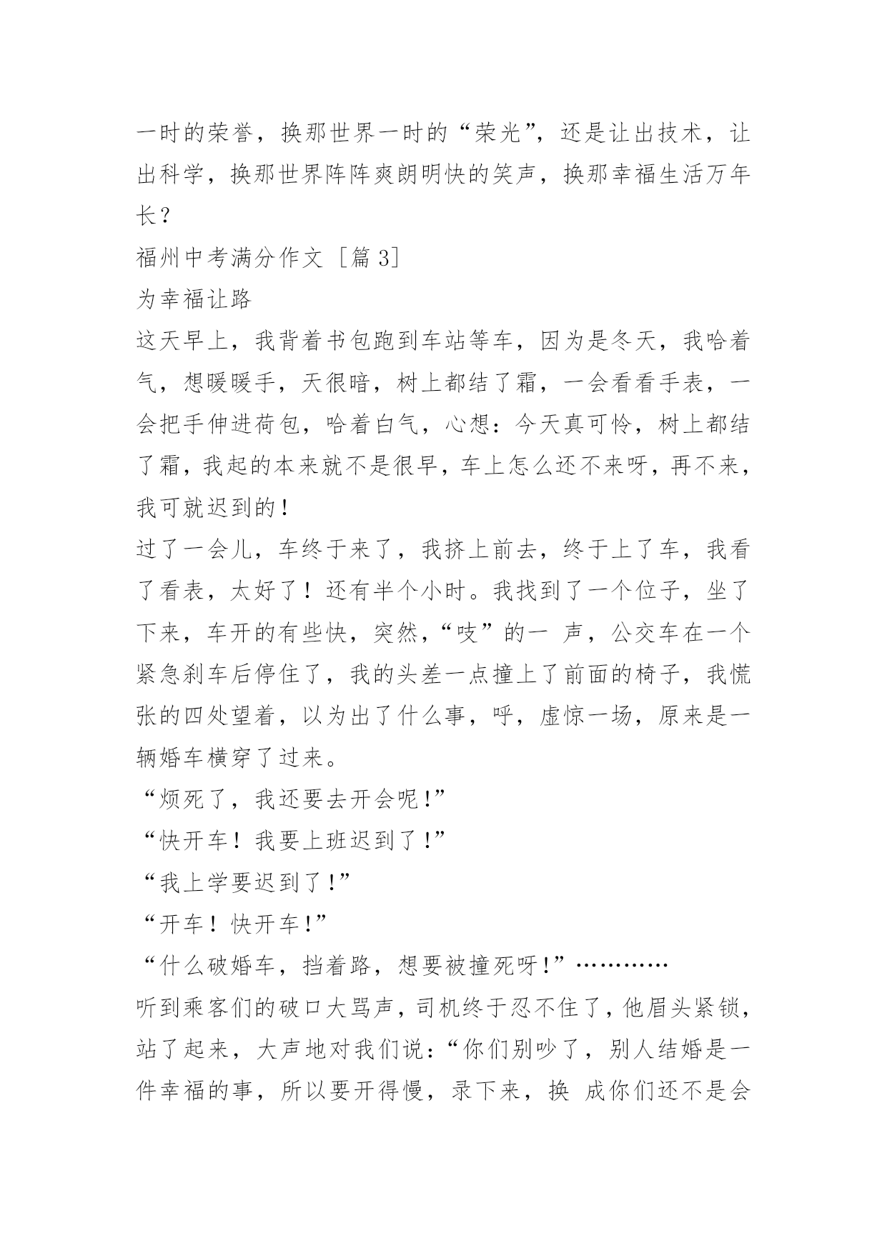 福州中考满分作文福州中考满分作文每个人的人生之路总是少不了明媚的春光,和煦的暖阳。如果要问到底哪一缕阳光最为耀眼?有人说是优异的学习成绩,有人说是丰厚的物质……而我却认为那最灿烂的阳光莫过于爱。两年前,我得了一场大病,父母背着我东奔西跑,到处求医,从他们焦急的神态中,从他们悉心的呵护中,我深深地体会到父母对我发自内心的爱。一天,爸爸用自行车驮我去医院,我坐车后发现爸爸骑得很慢。几个月了,爸爸是太累了,我的病让他身心疲惫。我无意中发现了爸爸头上的一些白发。啊,爸爸变了,变老了。我在他身上看到了岁月的沧桑,看到了生活的艰辛,更看到了爸爸为我操劳的痕迹。啊,爸爸没变,大山般的父爱没变。我依然感受着他的温暖,他的爱。那是我住院期间的一天傍晚,天很冷,外面的雪下得很大。爸爸下班后赶来给我送饭,可是我想吃饺子。他二话不说,放下手里提来的家里做好的饭菜,迎着凛冽的大风,冒着漫天飞舞的鹅毛大雪又出去为我买饺子。天黑了,风更猛了,雪更大了。这时,雪人似的爸爸一边走还一边说:“饿坏了吧!”看着爸爸慈祥的面容,摸着爸爸冻得通红的双手,我感动得流泪了。“爸爸,爸爸……”我在心里一遍遍地念叨,“你真是我的好爸爸!”冬天是寒冷的,而爸爸所做的一切,却仿佛阳光,温暖我病痛的躯体;又似暖流,融进我愁苦的心坎里;爸爸的关爱,撑起了我战胜病魔的信念,经过一个多月的治疗,我康复出院。我永远不会忘记父母对我的爱,对我的呵护和关怀。我能为他们做些什么?我常常这样问自己。哪怕是为他们垂垂肩,洗洗碗,给他们唱段曲儿,陪他们逛逛街,散散步,我也会感到心里的安慰。学会感恩,学会报答,我仿佛一下子长大了:我用心学习,不让他们为我的操心;我抢着洗碗拣菜,让他们能多休息一会儿;我经常哼哼小曲,让家庭充满欢声笑语……我尽我所能给父母留下最难忘的美好时光,让他们开心,让他们骄傲,我爱我的父母,普天下的孩子们都爱自己的父母。爱是一种情怀,更是一种情操。父母的爱,让我体会到了亲情的涌动,家庭的温馨和生活的多彩。生活里,到处充满了爱。老师对学生的爱,朋友之间的爱,祖国对我们的爱……这个世界,我们享受着被爱,我们更应该学会去爱。是爱,让我的生命变得更加的美丽。让我们一起努力,营造出爱的美丽空间!福州中考满分作文[篇2]当孔融让梨的故事早已成为千古美谈,当六尺微巷已为众人所称颂。赞扬,面对那一枚枚闪烁着金光的世乒赛金牌,我不禁问道,我们是否应该让出他们,我们到底该让出什么?诚然,当乒赛的现场奏响一次次国歌,国人是那么自豪,骄傲,然而面对所谓“垄断”的质疑层出不穷,我们也会焦虑,反思,那么,我们又是否该让?在我看来,我们可以让出技术,而不是让出奖牌,我们可以让出科学的训练方法,却绝不可以故意削弱自己的实力,以求他国获得金牌,粉饰出世界经济水平的一片繁荣多元的假象。时光匆匆而逝,一百年前的中国刚刚放生了剧变,一次惊天的变革刚刚开始。一百年来,我们感受到了中国生机勃勃的改变,我们要自豪的说,这些改变是靠中国人的手创造出来的,我们何时要求过英美国家让出一片天地呢?授人之鱼,不如授人之渔。当我们先进的乒乓球训练方法达到世界领先水平时,我们有理由与他国做技术交流,让出技术。而当我们的水稻种植技术,因袁隆平的成果而提高时,我们也主动提出让他为世界水稻种植培养人才。只有这样,才能解决粮食问题,而不只是一味的让出粮食,救济饥饿人口。孔融让梨,六尺微巷,让出的是一种传统美德,让出的,是一种人性的美好。而让奖牌却非如此,让粮食让钱,让一切一切的物质,仅仅只能救一时之需,甚至有时违背了基本的道德准则。只有当先进的技术为世人所共享时。我们才真的可以看到高水平的比赛,我们才真的可以看到这世上再无饥饿啼哭的孩子,我们才真的可以看到那人们的笑脸绽放在世界的每一个角落。你让或不让世界都会因此而改变;你让或不让,没有人会强迫。然而当你思考让或不让之前,请一定记得考虑,是让出一时的荣誉,换那世界一时的“荣光”,还是让出技术,让出科学,换那世界阵阵爽朗明快的笑声,换那幸福生活万年长?福州中考满分作文[篇3]为幸福让路这天早上,我背着书包跑到车站等车,因为是冬天,我哈着气,想暖暖手,天很暗,树上都结了霜,一会看看手表,一会把手伸进荷包,哈着白气,心想:今天真可怜,树上都结了霜,我起的本来就不是很早,车上怎么还不来呀,再不来,我可就迟到的!过了一会儿,车终于来了,我挤上前去,终于上了车,我看了看表,太好了!还有半个小时。我找到了一个位子,坐了下来,车开的有些快,突然,“吱”的一声,公交车在一个紧急刹车后停住了,我的头差一点撞上了前面的椅子,我慌张的四处望着,以为出了什么事,呼,虚惊一场,原来是一辆婚车横穿了过来。“烦死了,我还要去开会呢!”“快开车!我要上班迟到了!”“我上学要迟到了!”“开车!快开车!”“什么破婚车,挡着路,想要被撞