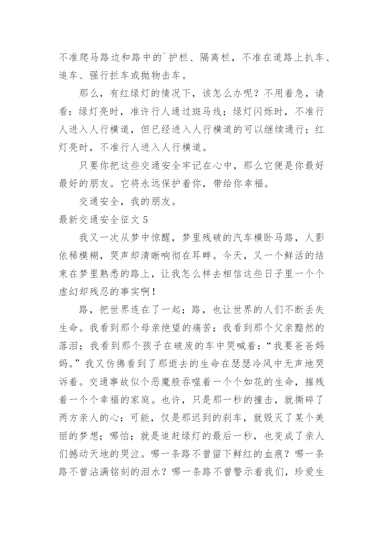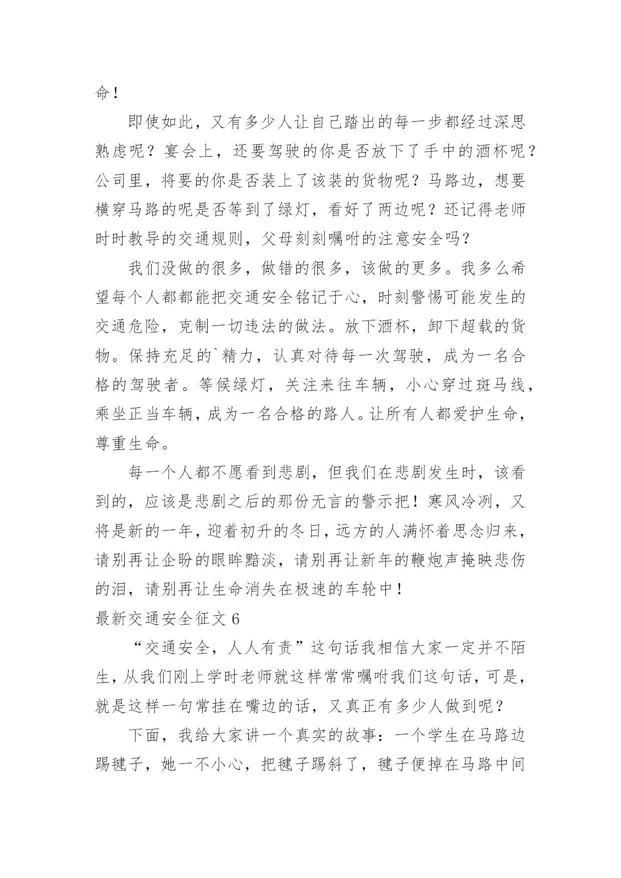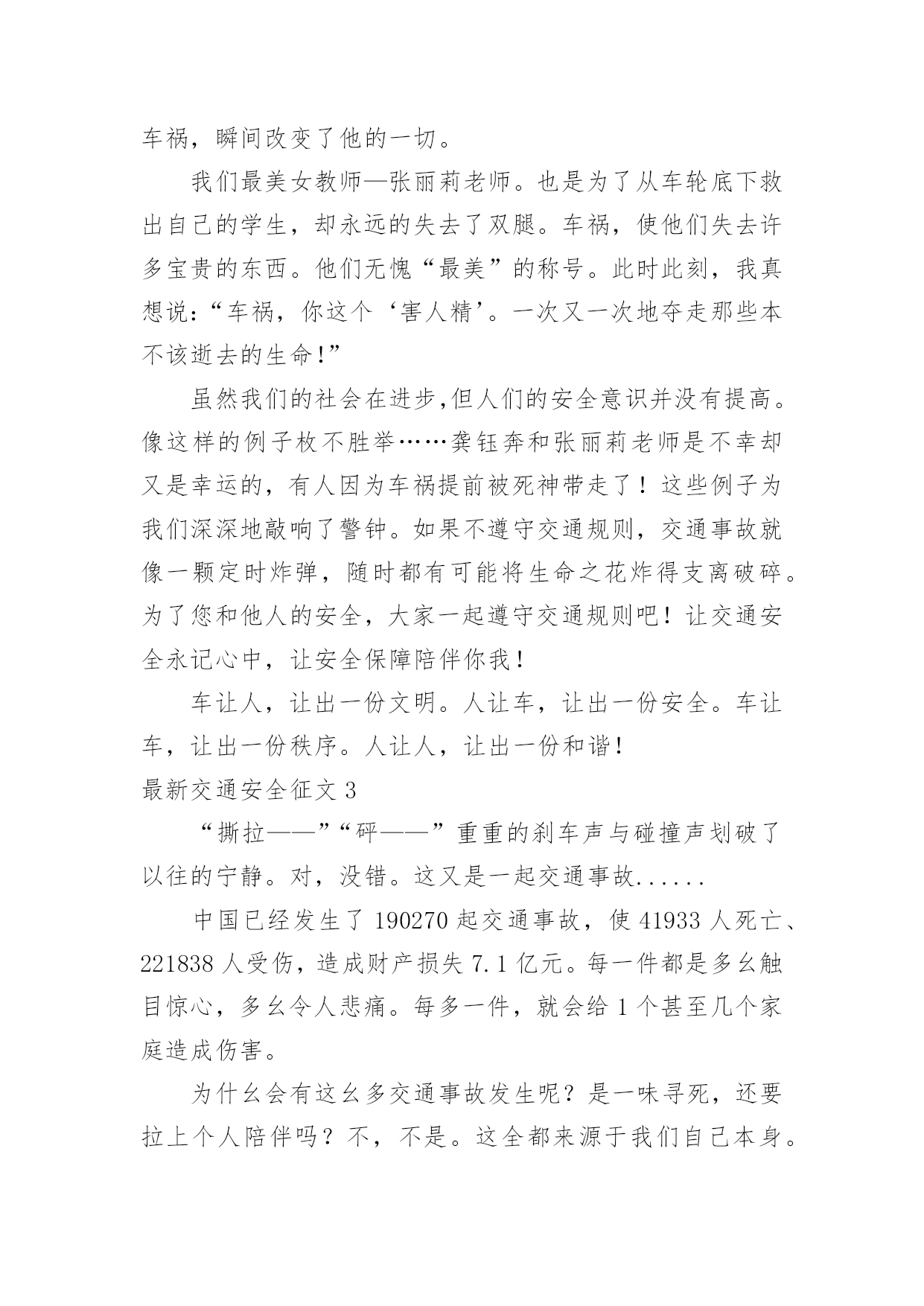 最新交通安全征文最新交通安全征文在日常生活或是工作学习中,大家总少不了接触征文吧,征文要求文面整洁干净,书写端正美观,字体清晰规范,标点准确无误。那么一般征文是怎么写的呢?下面是小编精心整理的最新交通安全征文,欢迎阅读,希望大家能够喜欢。最新交通安全征文1交通安全常常被人们忽略,其实交通安全就在我们的身边。尤其是针对那些不遵守交通规则的人。那是一个阴晴天,我和妈妈在大街上走着。路上几个骑自行车的.初中生进入了我和妈妈的视线。我看见他们叁五成群地围在一起,看起来很开心似的。他们一边骑自行车,一边顾着聊天。他们骑到一个十字路口,不遵守交通规则,还当红绿灯是个杂物,不管你红灯还是绿灯也照样冲,这种冲红灯的行为为他们增添了几分安全隐患。我和妈妈没走多远,我一回头,果然不出我所料,在那个路口,一辆小汽车行驶过来,向初中生冲过来。撞垮了一辆自行车。我听见几个初中生尖叫起来,其中一个初中生受了伤。这一个事例怎能不让他们受到了教训呢?还有一次,我正坐着爸爸的小轿车上学。我看见一位叔叔为了自己孩子的上学,就冲红灯,超车,横冲直撞。虽然这位叔叔没有遇上什幺交通事故,但我也深深的领悟到“生命宝贵”的意思。我突然记起一首交通绕口令:“红灯停,绿灯行,黄灯停一停。”在平时的生活中,就算有什幺急事或比赛,我都会不停地提醒爸爸不要冲红灯。有时候爸爸应酬很晚才回家,我常常也会叮嘱他,喝酒后不能开车,如果爸爸不听,我就会罗嗦地跟爸爸说起酒后开车的危害,使爸爸一次一次地清醒过来,然后他又会自觉坐出租车回家。让我们一起来自觉遵守交通规则,让我们的家园没有任何交通隐患,没有一丝的交通烦恼!最新交通安全征文2“红灯停,绿灯行……”这是众所周知的交通安全口诀,就连上幼儿园的小朋友都能倒背如流。可现实生活中,谁又能严格遵守交通规则呢?我曾看到这样一组惊人的数字:全世界每年因交通事故而丧生的有10。7万人,占总死亡人数的37﹪,47万人受伤,损失大约有亿。看着一条又一条鲜活的生命纷纷离我们远去,我们又有什么理由不珍惜生命,珍惜生命就要从遵守交通规则做起。我们的'生活离不开汽车,但汽车在带给我们方便的同时,也带来了一些交通安全隐患,如:11月3日上午,山东省枣庄二中高三学生,龚钰奔。车祸来临的瞬间,一把推开同学,自己却被蹍压在大货车下。使他右腿高位截肢,这个酷爱篮球的大哥哥不得不告别他曾经奔跑跳跃的篮球场,不得和他一直以来当兵的梦想说再见。车祸,瞬间改变了他的一切。我们最美女教师—张丽莉老师。也是为了从车轮底下救出自己的学生,却永远的失去了双腿。车祸,使他们失去许多宝贵的东西。他们无愧“最美”的称号。此时此刻,我真想说:“车祸,你这个‘害人精’。一次又一次地夺走那些本不该逝去的生命!”虽然我们的社会在进步,但人们的安全意识并没有提高。像这样的例子枚不胜举……龚钰奔和张丽莉老师是不幸却又是幸运的,有人因为车祸提前被死神带走了!这些例子为我们深深地敲响了警钟。如果不遵守交通规则,交通事故就像一颗定时炸弹,随时都有可能将生命之花炸得支离破碎。为了您和他人的安全,大家一起遵守交通规则吧!让交通安全永记心中,让安全保障陪伴你我!车让人,让出一份文明。人让车,让出一份安全。车让车,让出一份秩序。人让人,让出一份和谐!最新交通安全征文3“撕拉——”“砰——”重重的刹车声与碰撞声划破了以往的宁静。对,没错。这又是一起交通事故......中国已经发生了190270起交通事故,使41933人死亡、221838人受伤,造成财产损失7.1亿元。每一件都是多幺触目惊心,多幺令人悲痛。每多一件,就会给1个甚至几个家庭造成伤害。为什幺会有这幺多交通事故发生呢?是一味寻死,还要拉上个人陪伴吗?不,不是。这全都来源于我们自己本身。交通事故的'来源是什幺,是司机的错吗?不是。而是我们自己。如果不是交通意识浅薄,死神会把你带走吗?如果不是交通意识浅薄,会伤害那幺多人吗?我曾看过一则新闻:一辆外地面包车在经过一个红路灯的时候,并没有打变向灯,看样子是直行,却一扭转方向,撞上了另一个方向出来的小轿车。面包车被直接撞翻,被车内的5名成人3名小孩遭受重伤。如果司机能够慢点儿在慢点儿,还会撞上那辆车吗,还会遭受无辜的乘客一起下黄泉去走一趟吗!在此我诚挚的希望。全天下的人们,请爱惜自己,不要再多出一起交通事故了。最新交通安全征文4交通安全与我们的关系是非常密切的,它就像我们的朋友。日日夜夜都守在我们的身边,教育我们,劝戒我们。生命是宝贵的,人的一生就只有一次生命,我们应该爱惜生命。注意交通安全也是爱惜生命的一部分。现在因为交通事故而死于非命的人太多了,难道他们不是死的太冤枉了吗?交通安全,我们应当牢记在心。更主要的,是要知道交通安全常识:首先,行人须在人行通道内行走,没有人行道靠右边行走;穿越马路须走人行横道(斑马线);