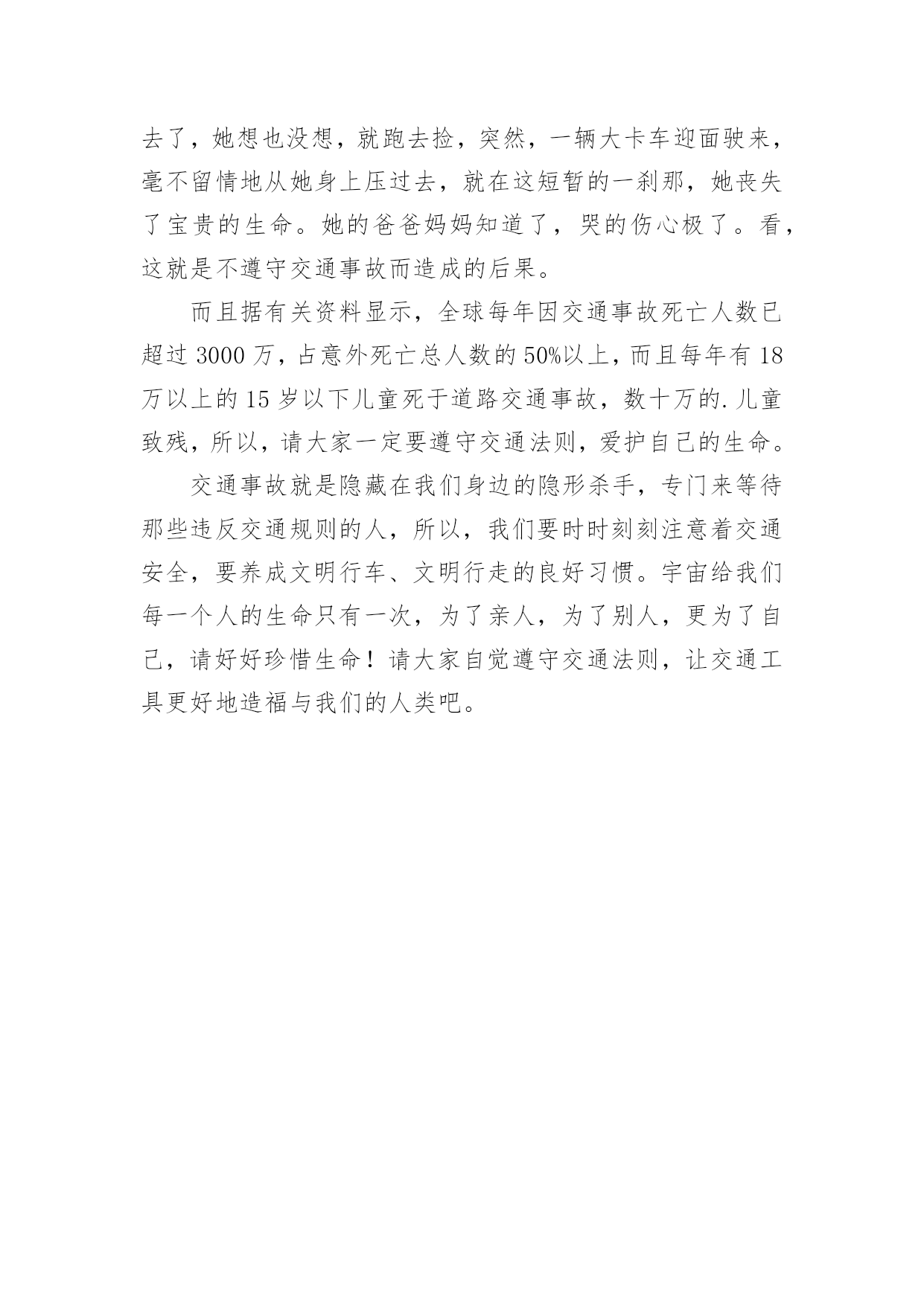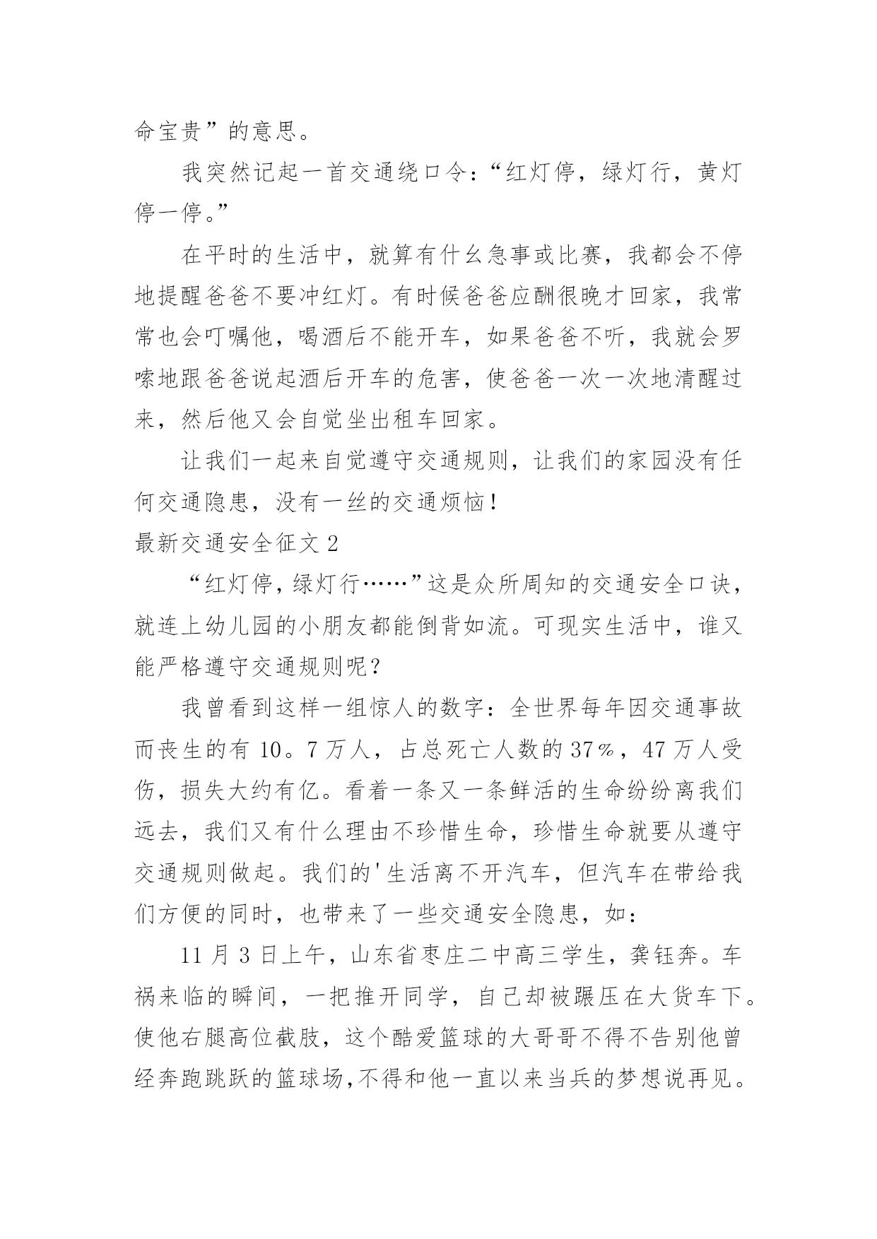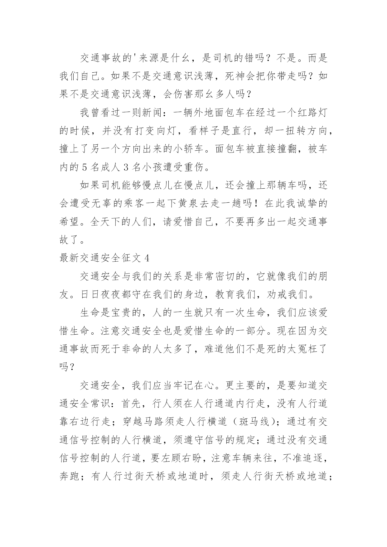 最新交通安全征文最新交通安全征文在日常生活或是工作学习中,大家总少不了接触征文吧,征文要求文面整洁干净,书写端正美观,字体清晰规范,标点准确无误。那么一般征文是怎么写的呢?下面是小编精心整理的最新交通安全征文,欢迎阅读,希望大家能够喜欢。最新交通安全征文1交通安全常常被人们忽略,其实交通安全就在我们的身边。尤其是针对那些不遵守交通规则的人。那是一个阴晴天,我和妈妈在大街上走着。路上几个骑自行车的.初中生进入了我和妈妈的视线。我看见他们叁五成群地围在一起,看起来很开心似的。他们一边骑自行车,一边顾着聊天。他们骑到一个十字路口,不遵守交通规则,还当红绿灯是个杂物,不管你红灯还是绿灯也照样冲,这种冲红灯的行为为他们增添了几分安全隐患。我和妈妈没走多远,我一回头,果然不出我所料,在那个路口,一辆小汽车行驶过来,向初中生冲过来。撞垮了一辆自行车。我听见几个初中生尖叫起来,其中一个初中生受了伤。这一个事例怎能不让他们受到了教训呢?还有一次,我正坐着爸爸的小轿车上学。我看见一位叔叔为了自己孩子的上学,就冲红灯,超车,横冲直撞。虽然这位叔叔没有遇上什幺交通事故,但我也深深的领悟到“生命宝贵”的意思。我突然记起一首交通绕口令:“红灯停,绿灯行,黄灯停一停。”在平时的生活中,就算有什幺急事或比赛,我都会不停地提醒爸爸不要冲红灯。有时候爸爸应酬很晚才回家,我常常也会叮嘱他,喝酒后不能开车,如果爸爸不听,我就会罗嗦地跟爸爸说起酒后开车的危害,使爸爸一次一次地清醒过来,然后他又会自觉坐出租车回家。让我们一起来自觉遵守交通规则,让我们的家园没有任何交通隐患,没有一丝的交通烦恼!最新交通安全征文2“红灯停,绿灯行……”这是众所周知的交通安全口诀,就连上幼儿园的小朋友都能倒背如流。可现实生活中,谁又能严格遵守交通规则呢?我曾看到这样一组惊人的数字:全世界每年因交通事故而丧生的有10。7万人,占总死亡人数的37﹪,47万人受伤,损失大约有亿。看着一条又一条鲜活的生命纷纷离我们远去,我们又有什么理由不珍惜生命,珍惜生命就要从遵守交通规则做起。我们的'生活离不开汽车,但汽车在带给我们方便的同时,也带来了一些交通安全隐患,如:11月3日上午,山东省枣庄二中高三学生,龚钰奔。车祸来临的瞬间,一把推开同学,自己却被蹍压在大货车下。使他右腿高位截肢,这个酷爱篮球的大哥哥不得不告别他曾经奔跑跳跃的篮球场,不得和他一直以来当兵的梦想说再见。车祸,瞬间改变了他的一切。我们最美女教师—张丽莉老师。也是为了从车轮底下救出自己的学生,却永远的失去了双腿。车祸,使他们失去许多宝贵的东西。他们无愧“最美”的称号。此时此刻,我真想说:“车祸,你这个‘害人精’。一次又一次地夺走那些本不该逝去的生命!”虽然我们的社会在进步,但人们的安全意识并没有提高。像这样的例子枚不胜举……龚钰奔和张丽莉老师是不幸却又是幸运的,有人因为车祸提前被死神带走了!这些例子为我们深深地敲响了警钟。如果不遵守交通规则,交通事故就像一颗定时炸弹,随时都有可能将生命之花炸得支离破碎。为了您和他人的安全,大家一起遵守交通规则吧!让交通安全永记心中,让安全保障陪伴你我!车让人,让出一份文明。人让车,让出一份安全。车让车,让出一份秩序。人让人,让出一份和谐!最新交通安全征文3“撕拉——”“砰——”重重的刹车声与碰撞声划破了以往的宁静。对,没错。这又是一起交通事故......中国已经发生了190270起交通事故,使41933人死亡、221838人受伤,造成财产损失7.1亿元。每一件都是多幺触目惊心,多幺令人悲痛。每多一件,就会给1个甚至几个家庭造成伤害。为什幺会有这幺多交通事故发生呢?是一味寻死,还要拉上个人陪伴吗?不,不是。这全都来源于我们自己本身。交通事故的'来源是什幺,是司机的错吗?不是。而是我们自己。如果不是交通意识浅薄,死神会把你带走吗?如果不是交通意识浅薄,会伤害那幺多人吗?我曾看过一则新闻:一辆外地面包车在经过一个红路灯的时候,并没有打变向灯,看样子是直行,却一扭转方向,撞上了另一个方向出来的小轿车。面包车被直接撞翻,被车内的5名成人3名小孩遭受重伤。如果司机能够慢点儿在慢点儿,还会撞上那辆车吗,还会遭受无辜的乘客一起下黄泉去走一趟吗!在此我诚挚的希望。全天下的人们,请爱惜自己,不要再多出一起交通事故了。最新交通安全征文4交通安全与我们的关系是非常密切的,它就像我们的朋友。日日夜夜都守在我们的身边,教育我们,劝戒我们。生命是宝贵的,人的一生就只有一次生命,我们应该爱惜生命。注意交通安全也是爱惜生命的一部分。现在因为交通事故而死于非命的人太多了,难道他们不是死的太冤枉了吗?交通安全,我们应当牢记在心。更主要的,是要知道交通安全常识:首先,行人须在人行通道内行走,没有人行道靠右边行走;穿越马路须走人行横道(斑马线);