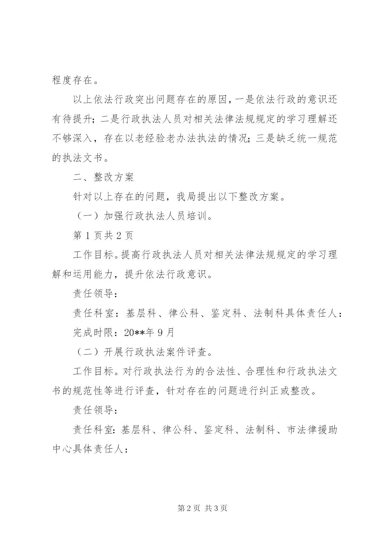 第PAGE\*Arabic\*MERGEFORMAT3页共NUMPAGES\*MERGEFORMAT3页司法局依法行政及整改方案司法局依法行政及整改方案一、存在的问题、薄弱环节及原因(一)行政投诉工作方面。20**年9月9日,《省司法行政法律服务行政投诉处理办法》试行后,有关律师、公证、基层法律服务工作者、司法鉴定人在执业过程中存在的违法违规情况的投诉、反映纳入了行政投诉的范围。我局在此项工作中存在一些薄弱环节。1.程序方面存在问题。一是受理环节,无相关受理登记、无受理通知书或不予受理通知书、无送达通知书回证;二是调查环节,调查人员未出示行政执法证件或少于2人、无询问笔录或相关调查材料;三是处理环节,存在以口头答复代替书面告知的情况。2.相关执法文书存在问题。主要表现为各程序相关执法文书不规范,如文书编号不规范、文书内容不全等。(二)行政许可工作方面。20**年1月30日,《省司法行政机关行政许可实施与监督工作规定》正式施行。为认真贯彻执行该《规定》,我局结合工作实际,印发了《市司法局关于进一步规范行政审批工作的通知》,明确工作职责,予以进一步规范。从运行情况看,我局在此项工作中仍存在薄弱环节。主要表现为执行“统一备案”工作制度中存在问题,不及时备案情况仍不同程度存在。以上依法行政突出问题存在的原因,一是依法行政的意识还有待提升;二是行政执法人员对相关法律法规规定的学习理解还不够深入,存在以老经验老办法执法的情况;三是缺乏统一规范的执法文书。二、整改方案针对以上存在的问题,我局提出以下整改方案。(一)加强行政执法人员培训。工作目标。提高行政执法人员对相关法律法规规定的学习理解和运用能力,提升依法行政意识。责任领导:责任科室:基层科、律公科、鉴定科、法制科具体责任人:完成时限:20**年9月(二)开展行政执法案件评查。工作目标。对行政执法行为的合法性、合理性和行政执法文书的规范性等进行评查,针对存在的问题进行纠正或整改。责任领导:责任科室:基层科、律公科、鉴定科、法制科、市法律援助中心具体责任人: