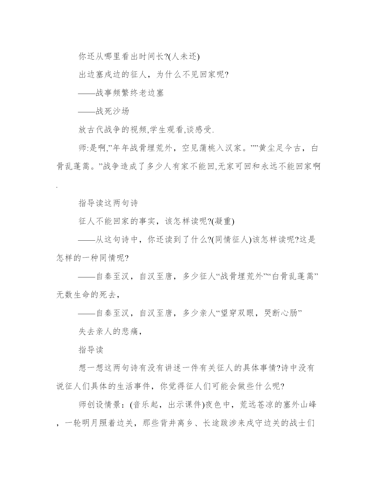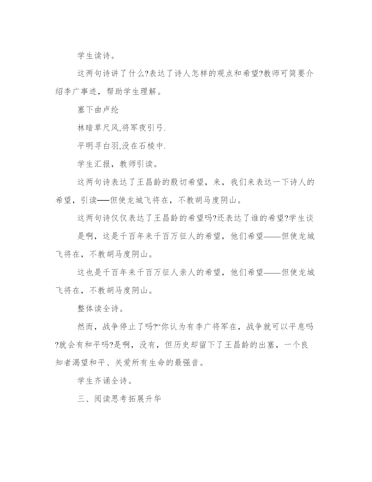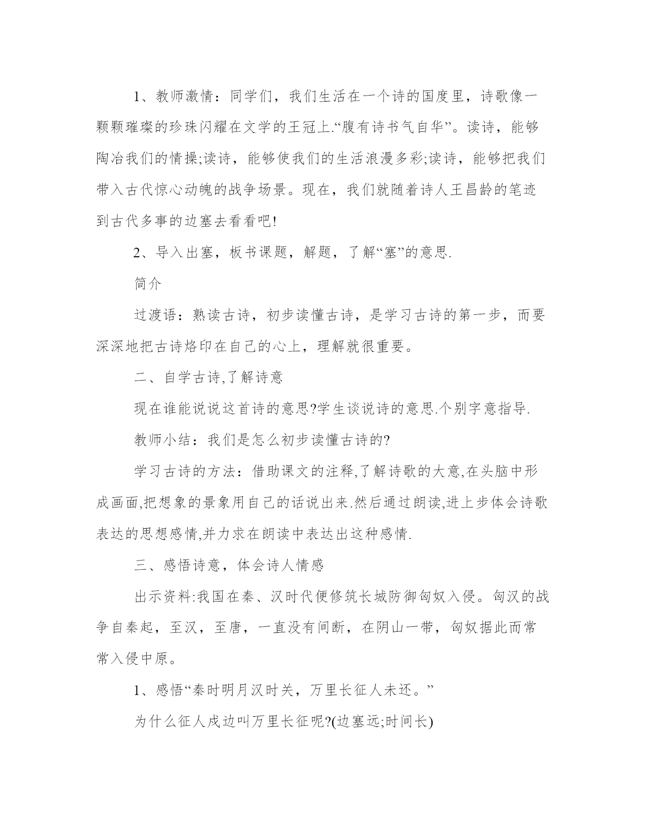 《出塞》教学设计教学目标:1.结合课后注释及及工具书,自学古诗,了解诗的大意.2.诵读古诗,读悟结合,体会诗人丰富的情感,感悟诗歌博大的人性美.3.课内外结合,激发对诗歌的兴趣及对祖国灿烂文化的热爱之情.教学重点:大体把握诗歌含义,想象诗境,体会诗人情感.教学难点:在赏析中了解我国悠久灿烂的古诗文化,激发学习古诗兴趣,培养自学古诗的能力,提高文化素养.教学准备:课件资料教学方法:自读自悟为主,点播为辅.课时:一课前游戏:赛诗会,看谁背诵的古诗多教学过程:一、创设情景,导入新课1、教师激情:同学们,我们生活在一个诗的国度里,诗歌像一颗颗璀璨的珍珠闪耀在文学的王冠上.“腹有诗书气自华”。读诗,能够陶冶我们的情操;读诗,能够使我们的生活浪漫多彩;读诗,能够把我们带入古代惊心动魄的战争场景。现在,我们就随着诗人王昌龄的笔迹到古代多事的边塞去看看吧!2、导入出塞,板书课题,解题,了解“塞”的意思.简介过渡语:熟读古诗,初步读懂古诗,是学习古诗的第一步,而要深深地把古诗烙印在自己的心上,理解就很重要。二、自学古诗,了解诗意现在谁能说说这首诗的意思?学生谈说诗的意思.个别字意指导.教师小结:我们是怎么初步读懂古诗的?学习古诗的方法:借助课文的注释,了解诗歌的大意,在头脑中形成画面,把想象的景象用自己的话说出来.然后通过朗读,进上步体会诗歌表达的思想感情,并力求在朗读中表达出这种感情.三、感悟诗意,体会诗人情感出示资料:我国在秦、汉时代便修筑长城防御匈奴入侵。匈汉的战争自秦起,至汉,至唐,一直没有间断,在阴山一带,匈奴据此而常常入侵中原。1、感悟“秦时明月汉时关,万里长征人未还。”为什么征人戍边叫万里长征呢?(边塞远;时间长)你还从哪里看出时间长?(人未还)出边塞戍边的征人,为什么不见回家呢?——战事频繁终老边塞——战死沙场放古代战争的视频,学生观看,谈感受.师:是啊,”年年战骨埋荒外,空见蒲桃入汉家。””黄尘足今古,白骨乱蓬蒿。”战争造成了多少人有家不能回,无家可回和永远不能回家啊.指导读这两句诗征人不能回家的事实,该怎样读呢?(凝重)——从这句诗中,你还读到了什么?(同情征人)该怎样读呢?这是怎样的一种同情呢?——自秦至汉,自汉至唐,多少征人“战骨埋荒外”“白骨乱蓬蒿”无数生命的死去,——自秦至汉,自汉至唐,多少亲人“望穿双眼,哭断心肠”失去亲人的悲痛,指导读想一想这两句诗有没有讲述一件有关征人的具体事情?诗中没有说征人们具体的生活事件,你觉得征人们可能会做些什么呢?师创设情景:(音乐起,出示课件)夜色中,荒远苍凉的塞外山峰,一轮明月照着边关,那些背井离乡、长途跋涉来戍守边关的战士们,白天军务繁忙,到了静夜,面对边塞荒凉的关山,面对一轮明月,他们可能会想些什么呢?学生根据自己的理解回答.征人们这一切一切的感受,都化成了一个愿望,那就是——回家.要知道,这征人是千百年来的千百万征人啊!千百年来千百万人萦绕心头的梦,却都只化成一句:(引读)秦时明月汉时关,万里长征人未还。征人们在思念家乡,思念亲人.同在一轮明月照耀下的征人的亲人可能会做些什么呢?①征人白发苍苍的父母……②征人柔弱无助的妻子……③征人无依无靠的孩子……教师激情引读:这千百年来千百万白发双亲、这千百年来千百万可怜的妻子、这千百年来千百万孤苦无依的孩子对儿子、丈夫、父亲的期盼,却也只能化成一句(引读)“秦时明月汉时关,万里长征人未还。”是啊,”此夜曲中闻折柳,何人不起故园情.”每个征人盼回家,每个征人的亲人盼征人回家.诗人写出这样的诗句该有何等的悲天悯民的情怀啊.板书:思亲盼归征人们回家有望吗?我们来看一段资料:据资治通鉴·唐纪载,玄宗时,改府兵为募兵,兵士戍边时间从一年延至三年、六年,终于成为久戍之役,“天宝以后,山东戍卒还者十无二、三”。生看资料,理解资料意思。古代的边塞诗,有很多就反映了边塞战争给人民带来的苦难,我们一起轻声读读,感受感受。可怜无定河边骨,犹是春闺梦里人.——唐·陈陶陇西行凭君莫话封侯事,一将功成万骨枯。──唐·曹松已亥岁二首不知何处吹芦管,一夜征人尽望乡。──唐·李益夜上受降城闻笛今为羌笛出塞声,使我三军泪如雨。──唐·李颀古意旦辞爷娘去,暮宿黄河边,不闻爷娘唤女声,但闻黄河流水鸣溅溅。旦辞黄河去,暮至黑山头,不闻爷娘唤女声,但闻燕山胡骑鸣啾啾。万里赴戎机,关山度若飞。朔气传金柝,寒光照铁衣。将军百战死,壮士十年归。n——北朝民歌木兰辞王昌龄面对这千百年来千百万人的悲剧,发千古之感慨,写下了”秦时明月汉时关,万里长征人未还。”的不朽佳句,我们也写两句话,表达自己的感受。学生写话。指名读读自己写的话.2、感悟“但使龙城飞将在,
