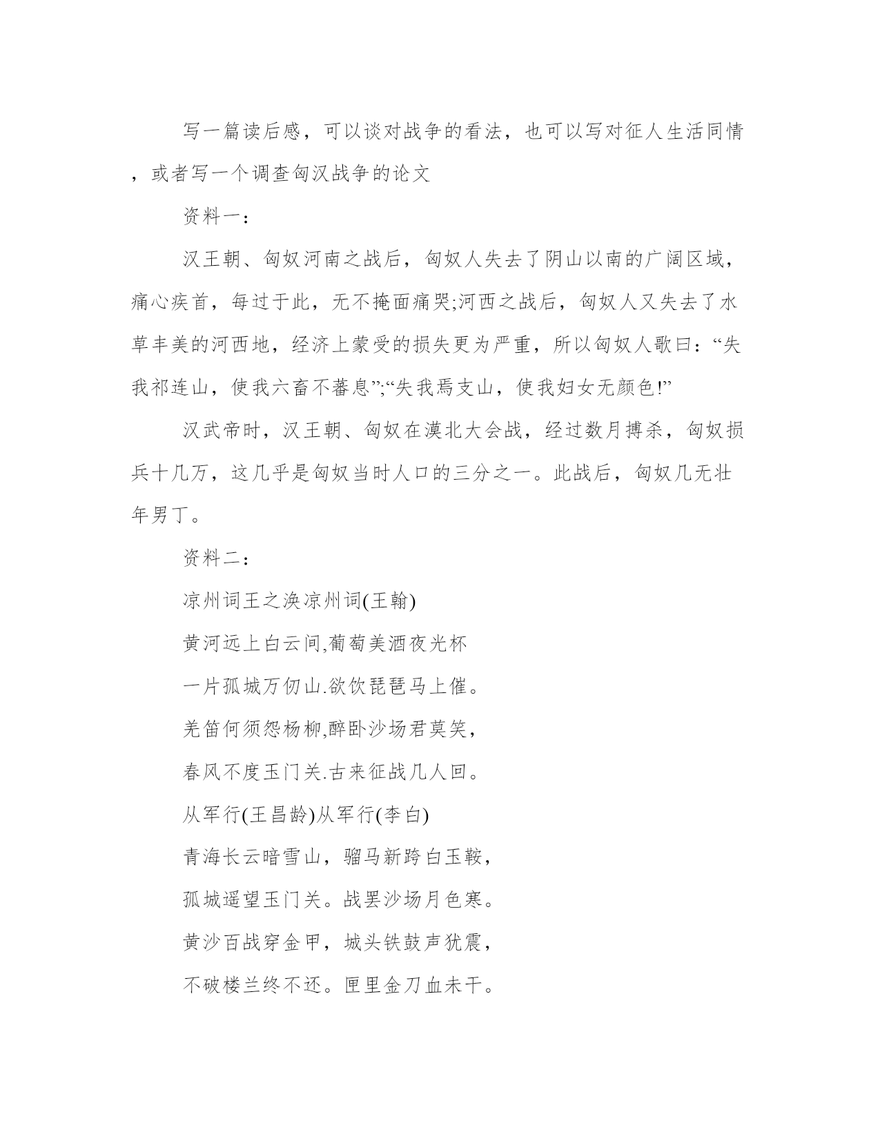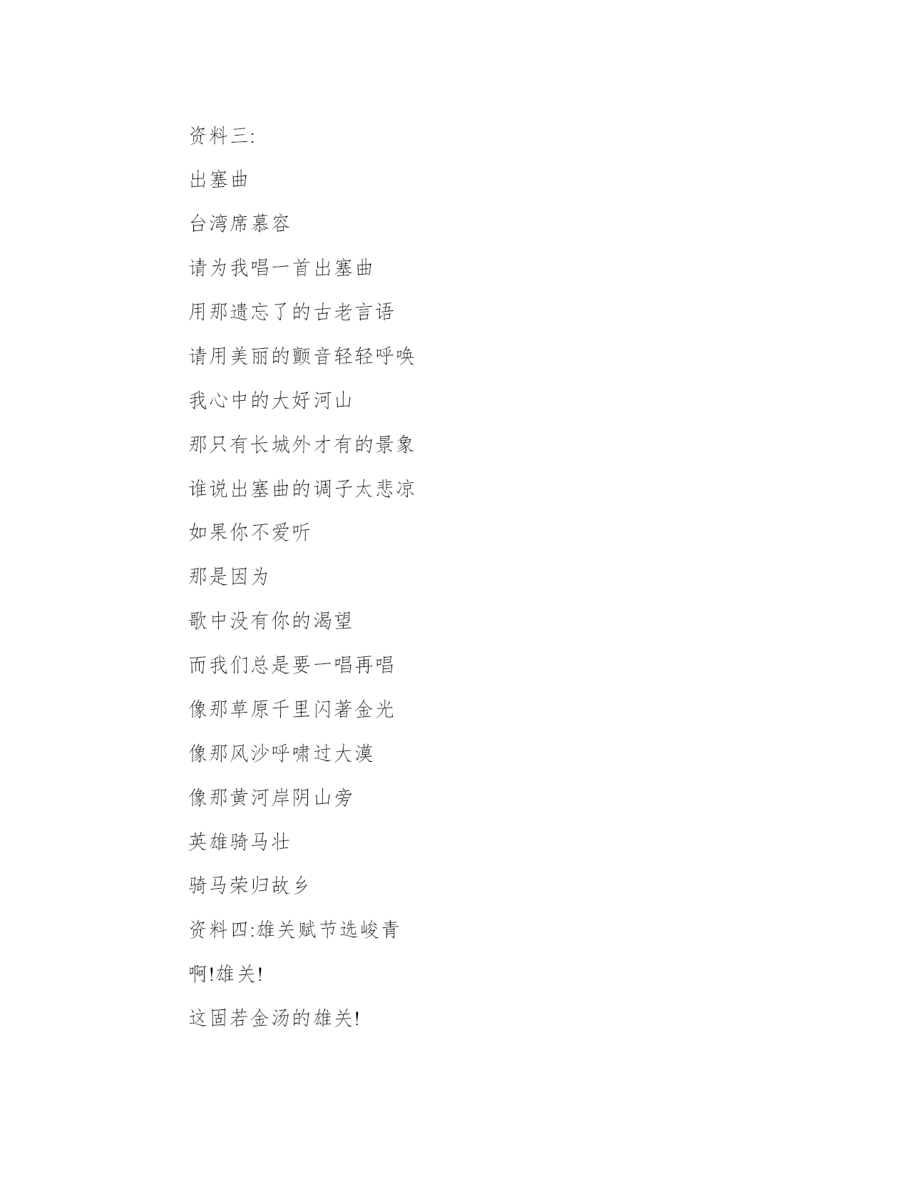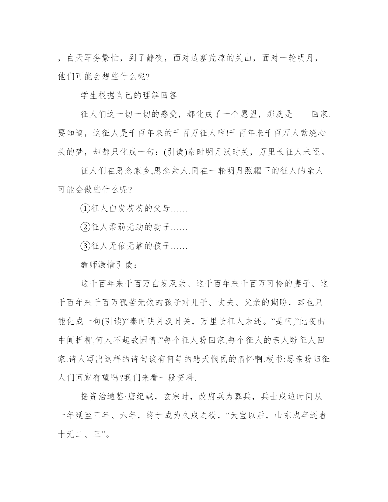 《出塞》教学设计教学目标:1.结合课后注释及及工具书,自学古诗,了解诗的大意.2.诵读古诗,读悟结合,体会诗人丰富的情感,感悟诗歌博大的人性美.3.课内外结合,激发对诗歌的兴趣及对祖国灿烂文化的热爱之情.教学重点:大体把握诗歌含义,想象诗境,体会诗人情感.教学难点:在赏析中了解我国悠久灿烂的古诗文化,激发学习古诗兴趣,培养自学古诗的能力,提高文化素养.教学准备:课件资料教学方法:自读自悟为主,点播为辅.课时:一课前游戏:赛诗会,看谁背诵的古诗多教学过程:一、创设情景,导入新课1、教师激情:同学们,我们生活在一个诗的国度里,诗歌像一颗颗璀璨的珍珠闪耀在文学的王冠上.“腹有诗书气自华”。读诗,能够陶冶我们的情操;读诗,能够使我们的生活浪漫多彩;读诗,能够把我们带入古代惊心动魄的战争场景。现在,我们就随着诗人王昌龄的笔迹到古代多事的边塞去看看吧!2、导入出塞,板书课题,解题,了解“塞”的意思.简介过渡语:熟读古诗,初步读懂古诗,是学习古诗的第一步,而要深深地把古诗烙印在自己的心上,理解就很重要。二、自学古诗,了解诗意现在谁能说说这首诗的意思?学生谈说诗的意思.个别字意指导.教师小结:我们是怎么初步读懂古诗的?学习古诗的方法:借助课文的注释,了解诗歌的大意,在头脑中形成画面,把想象的景象用自己的话说出来.然后通过朗读,进上步体会诗歌表达的思想感情,并力求在朗读中表达出这种感情.三、感悟诗意,体会诗人情感出示资料:我国在秦、汉时代便修筑长城防御匈奴入侵。匈汉的战争自秦起,至汉,至唐,一直没有间断,在阴山一带,匈奴据此而常常入侵中原。1、感悟“秦时明月汉时关,万里长征人未还。”为什么征人戍边叫万里长征呢?(边塞远;时间长)你还从哪里看出时间长?(人未还)出边塞戍边的征人,为什么不见回家呢?——战事频繁终老边塞——战死沙场放古代战争的视频,学生观看,谈感受.师:是啊,”年年战骨埋荒外,空见蒲桃入汉家。””黄尘足今古,白骨乱蓬蒿。”战争造成了多少人有家不能回,无家可回和永远不能回家啊.指导读这两句诗征人不能回家的事实,该怎样读呢?(凝重)——从这句诗中,你还读到了什么?(同情征人)该怎样读呢?这是怎样的一种同情呢?——自秦至汉,自汉至唐,多少征人“战骨埋荒外”“白骨乱蓬蒿”无数生命的死去,——自秦至汉,自汉至唐,多少亲人“望穿双眼,哭断心肠”失去亲人的悲痛,指导读想一想这两句诗有没有讲述一件有关征人的具体事情?诗中没有说征人们具体的生活事件,你觉得征人们可能会做些什么呢?师创设情景:(音乐起,出示课件)夜色中,荒远苍凉的塞外山峰,一轮明月照着边关,那些背井离乡、长途跋涉来戍守边关的战士们,白天军务繁忙,到了静夜,面对边塞荒凉的关山,面对一轮明月,他们可能会想些什么呢?学生根据自己的理解回答.征人们这一切一切的感受,都化成了一个愿望,那就是——回家.要知道,这征人是千百年来的千百万征人啊!千百年来千百万人萦绕心头的梦,却都只化成一句:(引读)秦时明月汉时关,万里长征人未还。征人们在思念家乡,思念亲人.同在一轮明月照耀下的征人的亲人可能会做些什么呢?①征人白发苍苍的父母……②征人柔弱无助的妻子……③征人无依无靠的孩子……教师激情引读:这千百年来千百万白发双亲、这千百年来千百万可怜的妻子、这千百年来千百万孤苦无依的孩子对儿子、丈夫、父亲的期盼,却也只能化成一句(引读)“秦时明月汉时关,万里长征人未还。”是啊,”此夜曲中闻折柳,何人不起故园情.”每个征人盼回家,每个征人的亲人盼征人回家.诗人写出这样的诗句该有何等的悲天悯民的情怀啊.板书:思亲盼归征人们回家有望吗?我们来看一段资料:据资治通鉴·唐纪载,玄宗时,改府兵为募兵,兵士戍边时间从一年延至三年、六年,终于成为久戍之役,“天宝以后,山东戍卒还者十无二、三”。生看资料,理解资料意思。古代的边塞诗,有很多就反映了边塞战争给人民带来的苦难,我们一起轻声读读,感受感受。可怜无定河边骨,犹是春闺梦里人.——唐·陈陶陇西行凭君莫话封侯事,一将功成万骨枯。──唐·曹松已亥岁二首不知何处吹芦管,一夜征人尽望乡。──唐·李益夜上受降城闻笛今为羌笛出塞声,使我三军泪如雨。──唐·李颀古意旦辞爷娘去,暮宿黄河边,不闻爷娘唤女声,但闻黄河流水鸣溅溅。旦辞黄河去,暮至黑山头,不闻爷娘唤女声,但闻燕山胡骑鸣啾啾。万里赴戎机,关山度若飞。朔气传金柝,寒光照铁衣。将军百战死,壮士十年归。n——北朝民歌木兰辞王昌龄面对这千百年来千百万人的悲剧,发千古之感慨,写下了”秦时明月汉时关,万里长征人未还。”的不朽佳句,我们也写两句话,表达自己的感受。学生写话。指名读读自己写的话.2、感悟“但使龙城飞将在,