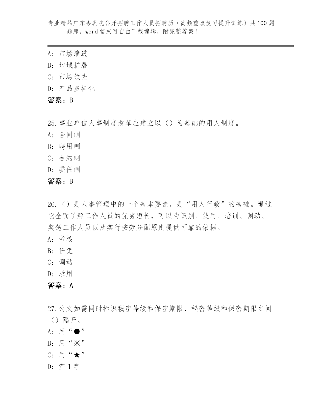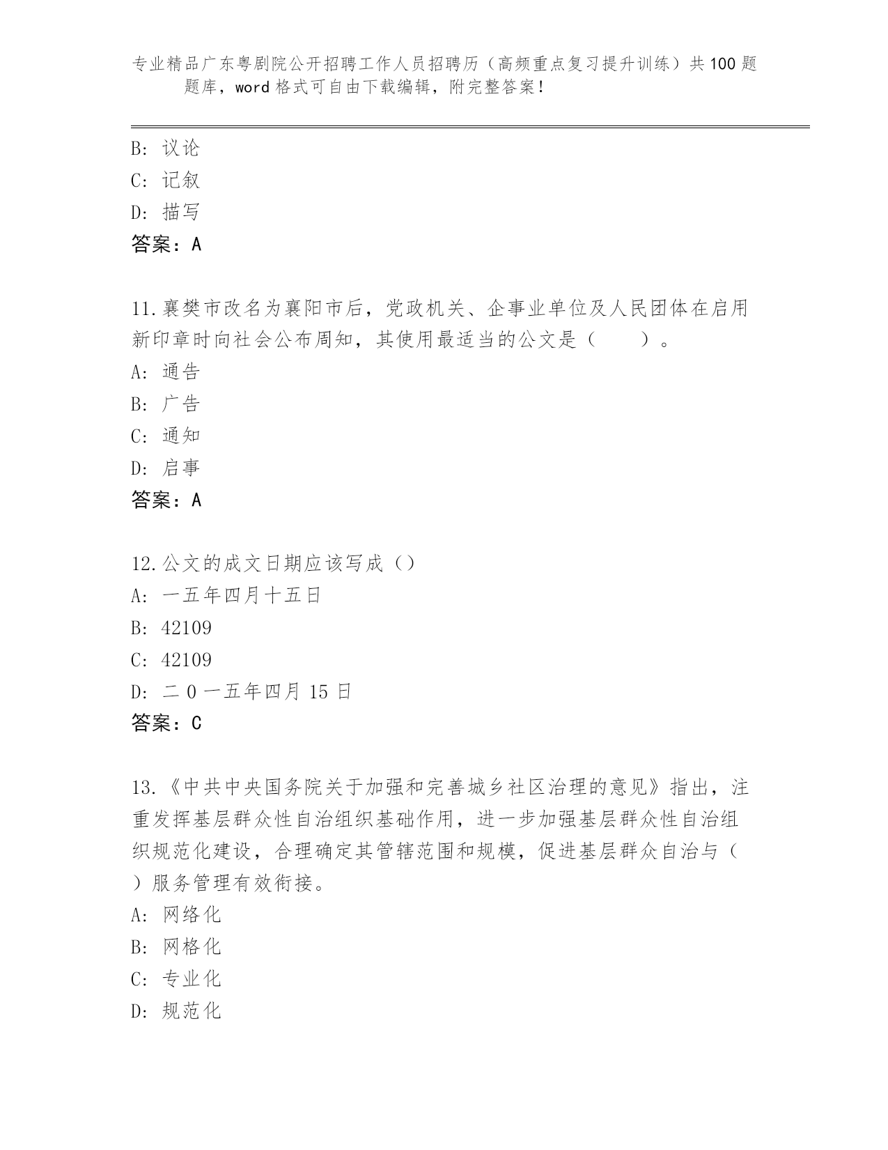 历年广东粤剧院公开招聘工作人员招聘历(高频重点复习提升训练)共100题 真题题库带答案(B卷)