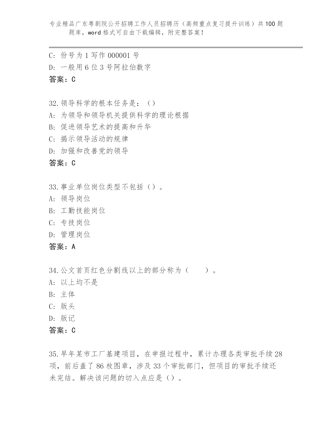 最新广东粤剧院公开招聘工作人员招聘历(高频重点复习提升训练)共100题 完整题库及免费答案