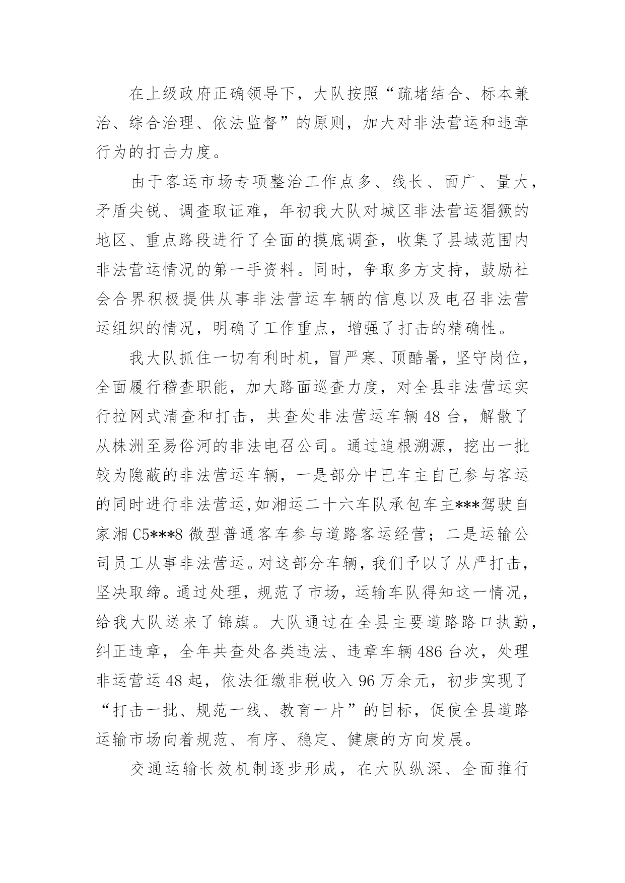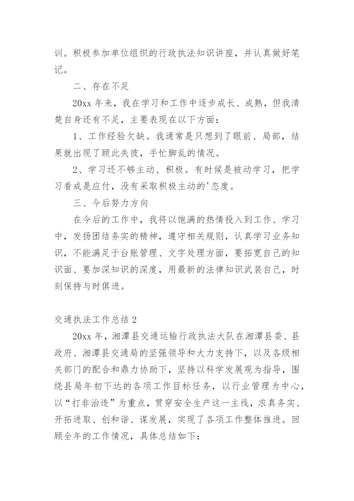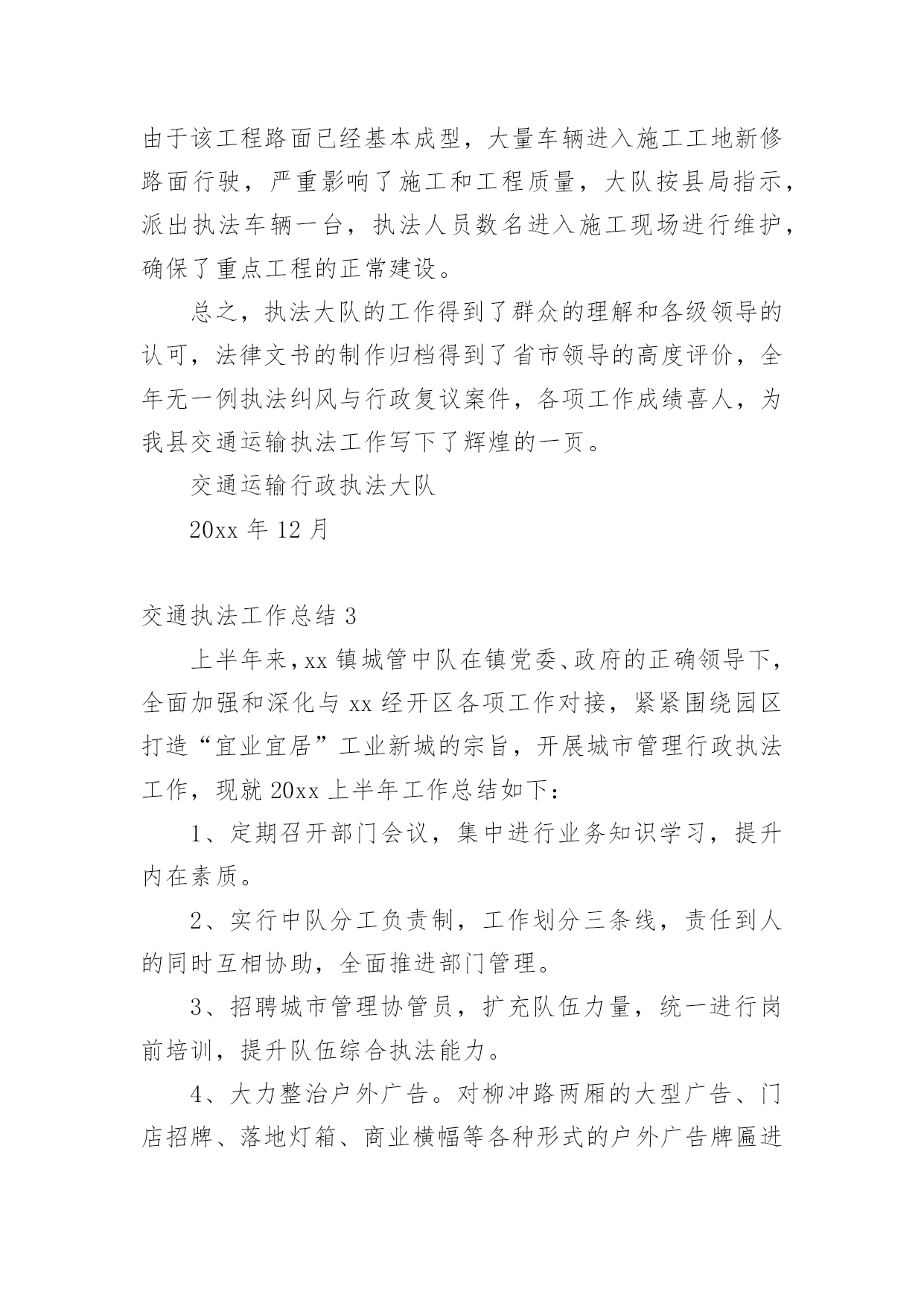 交通执法工作总结总结是事后对某一时期、某一项目或某些工作进行回顾和分析,从而做出带有规律性的结论,它在我们的学习、工作中起到呈上启下的作用,不如立即行动起来写一份总结吧。那么总结有什么格式呢?下面是小编帮大家整理的交通执法工作总结,仅供参考,大家一起来看看吧。交通执法工作总结120xx年我在领导的指导下,同事的悉心帮助下,行政执法工作取得了一定的进步,但也有不足。一、为了在今后的工作中更好地履行行政执法职责,努力把自己锻炼成为一名合格的交通行政执法工作者,现将20xx年行政执法的工作情况总结如下:一是端正执法理念,切实将依法行政摆在重要位置。思想上高度重视依法行政工作,认真领会依法行政的重要性,通过法制学习,行政执法考试熟悉交通行政执法工作的相关规章制度,不断强化思想认识。二是增强学习效果,切实加强对依法行政相关知识的学习。认真学习了《中华人民共和国道路运输条例》、《中华人民共和国公路法》、《公路安全保护条例》、《安徽省治理货物运输车辆超限超载办法》、《交通行政执法禁令》等相关法律法规和制度,深化了对“以人为本”、“执法为民”的理解。三是积极参加单位20xx年6月组织的行政执法学习培训。积极参加单位组织的行政执法知识讲座,并认真做好笔记。二、存在不足20xx年来,我在学习和工作中逐步成长、成熟,但我清楚自身还有不足,主要表现在以下方面:1、工作经验欠缺。我通常是只想到了眼前、局部,结果就出现了顾此失彼,手忙脚乱的情况。2、学习还不够主动、积极。有时候是被动学习,把学习看成是应付,没有采取积极主动的'态度。三、今后努力方向在今后的工作中,我将以饱满的热情投入到工作、学习中,发扬团结务实的精神,遵守相关规则,认真学习业务知识,不能满足于台账管理、文字处理方面,要拓宽自己的知识面、要加深知识的深度,用最新的法律知识武装自己,时刻保持与时俱进。交通执法工作总结220xx年,湘潭县交通运输行政执法大队在湘潭县委、县政府、湘潭县交通局的坚强领导和大力支持下,以及各级相关部门的配合和鼎力协助下,坚持以科学发展观为指导,围绕县局年初下达的各项工作目标任务,以行业管理为中心,以“打非治违”为重点,贯穿安全生产这一主线,求真务实、开拓进取、创和谐、谋发展,实现了各项工作整体推进。回顾全年的工作情况,具体总结如下:一、加快队伍建设,正规化管理上台阶大队在县局的统一部署和安排下,年初对我大队执法人员进行调整,补充了新的执法力量,为了充分发挥队员们的主观能动性,在人员安排上,借鉴去年的成功经验,在原有的基础上作了合理调整,根据个人特点,细化了分工,责任到人,从上路稽查、窗口服务、行政处罚、文书档案管理、财务、党务、安全等各个环节实行了“定人、定岗、定责任”,做到了各尽所能、人尽其材;明确分工后,队员们的工作积极性进一步提高,岗位适应性增强,工作效率明显上升。随着社会多元化和法制化进程的加快,我大队的执法工作面临更加严峻的考验,为了保持与时俱进的执法水平,我大队组织了系统的法律法规和业务知识的学习和培训,还多次组织队员赴省内兄弟单位学习、交流,借鉴他们的工作经验和先进管理模式,通过全方位、多渠道的学习和培训,执法大队的整体行政执法水平有了质的飞跃。年内,我大队再次对内部管理制度进行了修订和完善,让制度来规范行为,强化纪律。一年以来,我大队坚持周例会制度,研究分析各个时段的.工作重点,对执法中出现的新情况、新问题及时分析解决,对遇到的典型案例全员讨论学习。各项工作记录全面、详实、具体。通过各项制度的完善和执行,大队形成了上下贯通、左右相连的监督和管理体系,形成了“凡事有章可循、凡事有据可查、凡事有人负责、凡事有人监督”的良性运行机制。有力地推动了执法大队的正规化建设,使大队成为了一支经验丰富、业务精通、素质过硬的劲旅。二、文明执法树新风我大队执法人员严格执行政策规定,秉公办事,公正执法,在纠正违法违章时,严格依照法定程序办理。从受案到调查、取证、结案,书证、物证确实,法律文书齐全,做到了程序合法,归档有序,维护了法律的严肃性和效力。上路执勤时,在全队推行“温馨交通、微笑服务”活动,一个标准的手势,一个深情的敬礼,一句“您好”都成了队员们习惯的执法动作和语言,这不但改善了车主与执法人员的现场关系,便于我方纠正违章,同时也树立了良好的交通形象,处理了依法行政与文明执法的关系。服务大厅也增设了便民服务职能,为车主们提供茶水和休息场所。窗口办事不再让车主等待,办事人员主动热情接待外来人员,耐心解答各车主、车属单位的咨询,并及时做好宣传教育工作。进一步规范了窗口办事程序,切实改变了队员的工作作风,杜绝了“门难进、脸难看、话难听、事难办”的衙门作风,有时加班加点为车主提供方便,我大队考虑到有部分车主是外地的,办事不方便,就算是到了下班的时间,也坚决把当天的事情办完