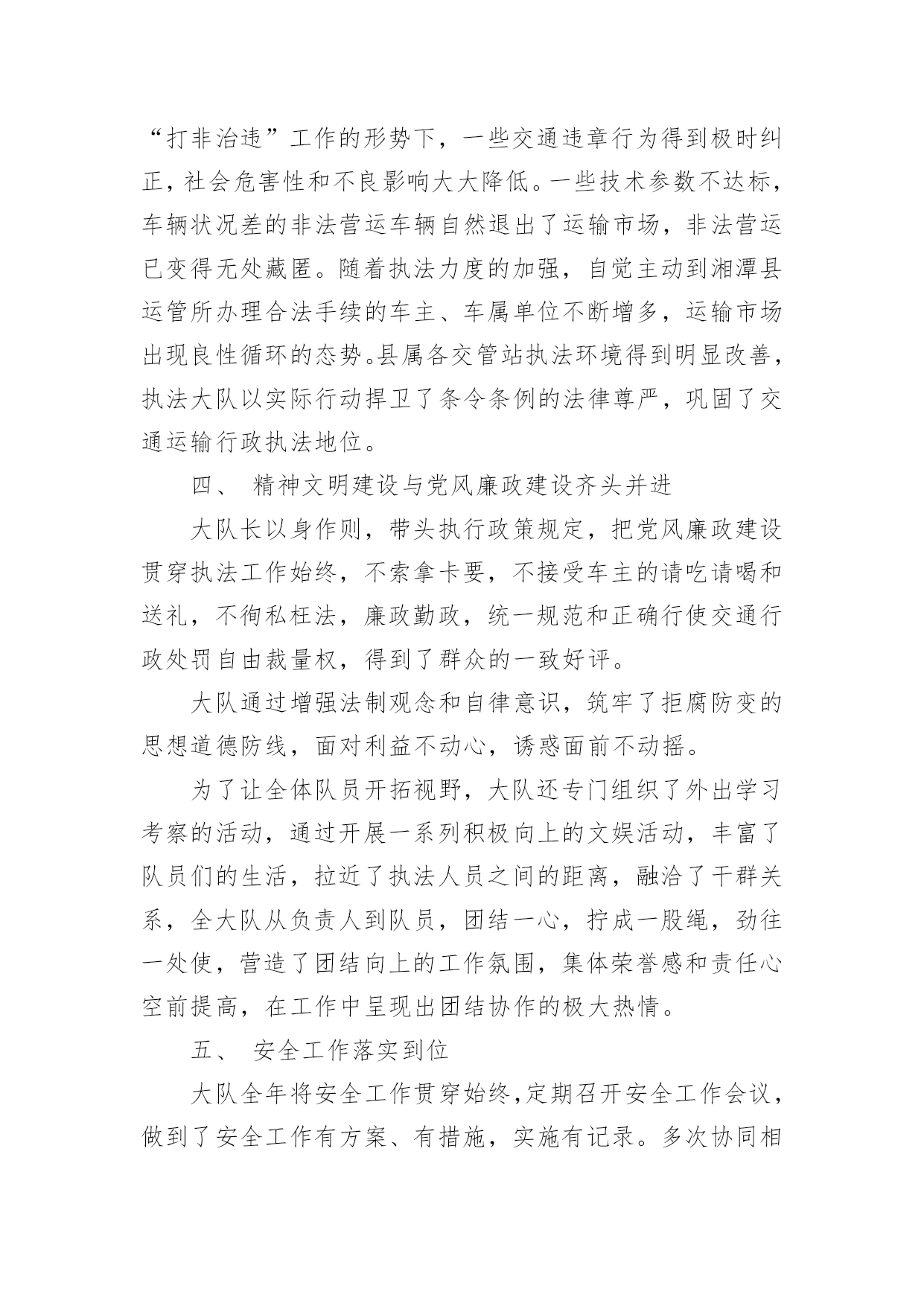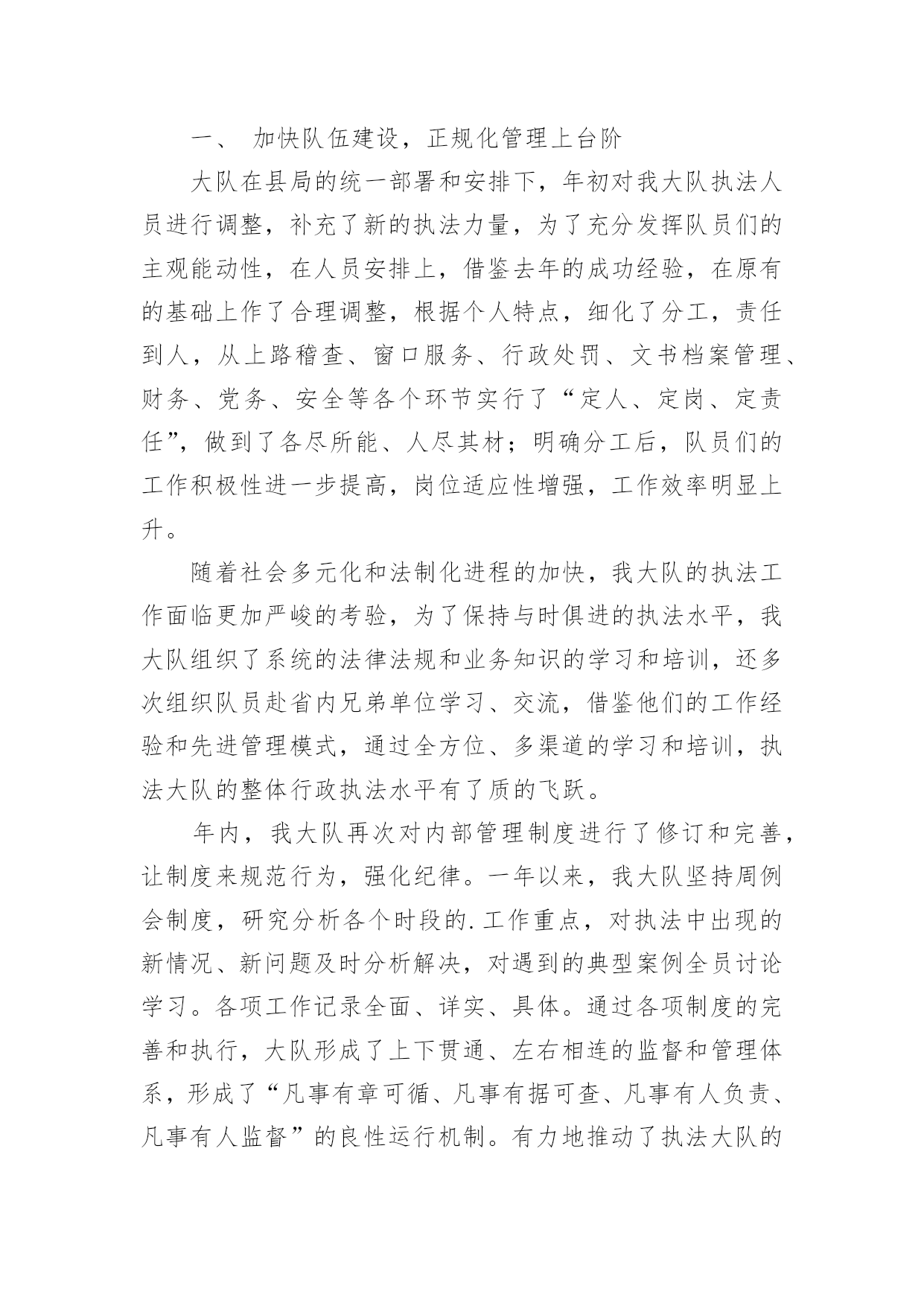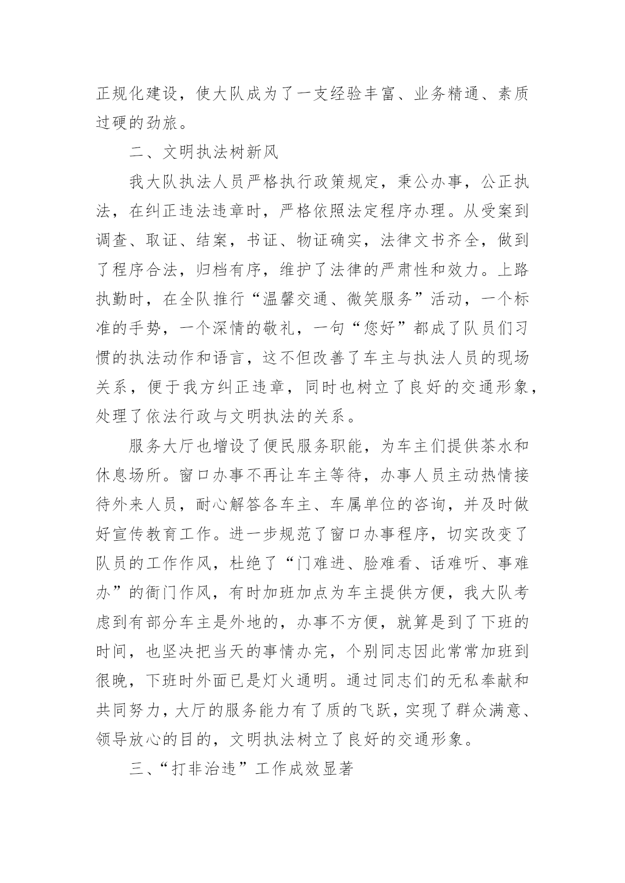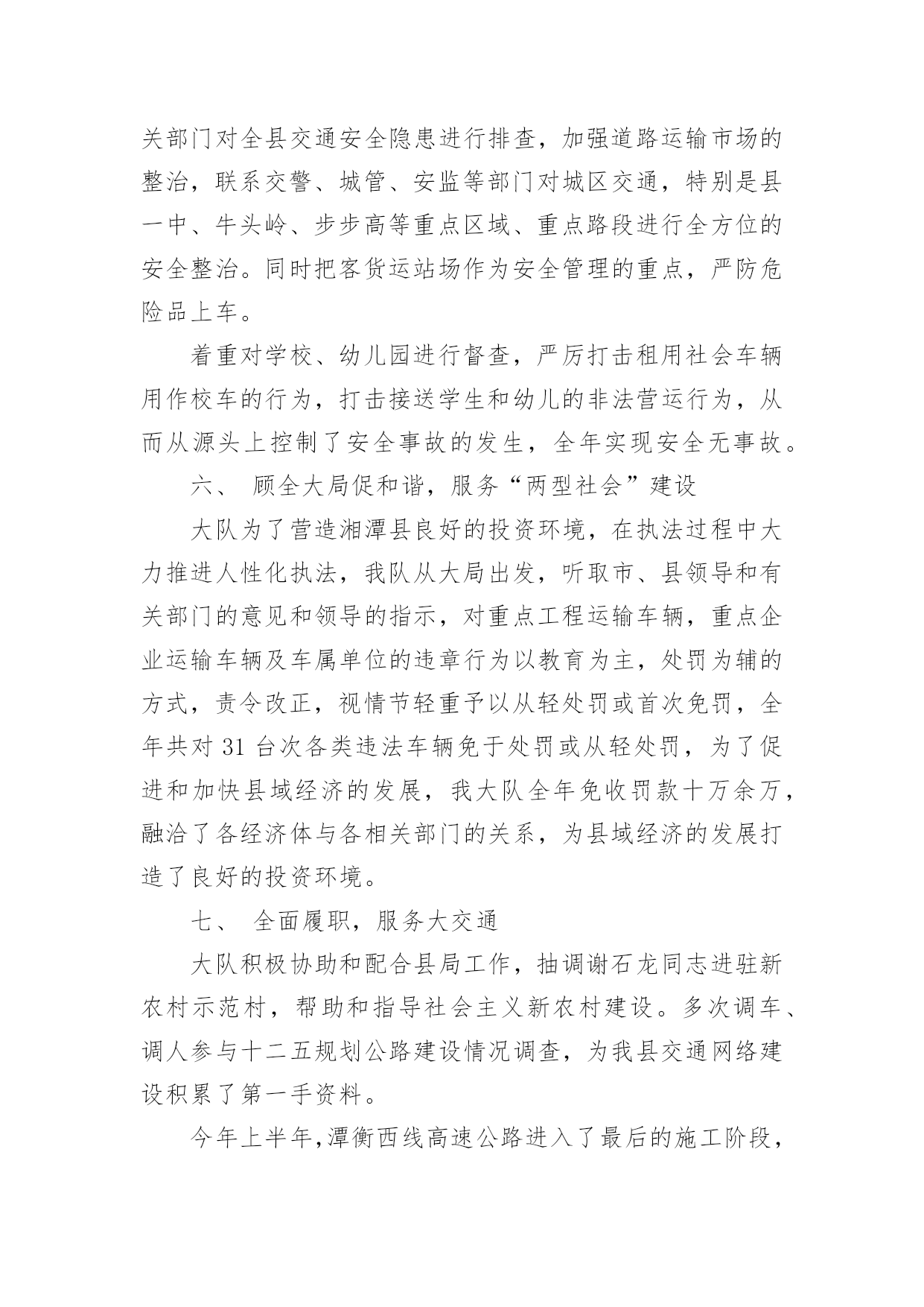 交通执法工作总结总结是事后对某一时期、某一项目或某些工作进行回顾和分析,从而做出带有规律性的结论,它在我们的学习、工作中起到呈上启下的作用,不如立即行动起来写一份总结吧。那么总结有什么格式呢?下面是小编帮大家整理的交通执法工作总结,仅供参考,大家一起来看看吧。交通执法工作总结120xx年我在领导的指导下,同事的悉心帮助下,行政执法工作取得了一定的进步,但也有不足。一、为了在今后的工作中更好地履行行政执法职责,努力把自己锻炼成为一名合格的交通行政执法工作者,现将20xx年行政执法的工作情况总结如下:一是端正执法理念,切实将依法行政摆在重要位置。思想上高度重视依法行政工作,认真领会依法行政的重要性,通过法制学习,行政执法考试熟悉交通行政执法工作的相关规章制度,不断强化思想认识。二是增强学习效果,切实加强对依法行政相关知识的学习。认真学习了《中华人民共和国道路运输条例》、《中华人民共和国公路法》、《公路安全保护条例》、《安徽省治理货物运输车辆超限超载办法》、《交通行政执法禁令》等相关法律法规和制度,深化了对“以人为本”、“执法为民”的理解。三是积极参加单位20xx年6月组织的行政执法学习培训。积极参加单位组织的行政执法知识讲座,并认真做好笔记。二、存在不足20xx年来,我在学习和工作中逐步成长、成熟,但我清楚自身还有不足,主要表现在以下方面:1、工作经验欠缺。我通常是只想到了眼前、局部,结果就出现了顾此失彼,手忙脚乱的情况。2、学习还不够主动、积极。有时候是被动学习,把学习看成是应付,没有采取积极主动的'态度。三、今后努力方向在今后的工作中,我将以饱满的热情投入到工作、学习中,发扬团结务实的精神,遵守相关规则,认真学习业务知识,不能满足于台账管理、文字处理方面,要拓宽自己的知识面、要加深知识的深度,用最新的法律知识武装自己,时刻保持与时俱进。交通执法工作总结220xx年,湘潭县交通运输行政执法大队在湘潭县委、县政府、湘潭县交通局的坚强领导和大力支持下,以及各级相关部门的配合和鼎力协助下,坚持以科学发展观为指导,围绕县局年初下达的各项工作目标任务,以行业管理为中心,以“打非治违”为重点,贯穿安全生产这一主线,求真务实、开拓进取、创和谐、谋发展,实现了各项工作整体推进。回顾全年的工作情况,具体总结如下:一、加快队伍建设,正规化管理上台阶大队在县局的统一部署和安排下,年初对我大队执法人员进行调整,补充了新的执法力量,为了充分发挥队员们的主观能动性,在人员安排上,借鉴去年的成功经验,在原有的基础上作了合理调整,根据个人特点,细化了分工,责任到人,从上路稽查、窗口服务、行政处罚、文书档案管理、财务、党务、安全等各个环节实行了“定人、定岗、定责任”,做到了各尽所能、人尽其材;明确分工后,队员们的工作积极性进一步提高,岗位适应性增强,工作效率明显上升。随着社会多元化和法制化进程的加快,我大队的执法工作面临更加严峻的考验,为了保持与时俱进的执法水平,我大队组织了系统的法律法规和业务知识的学习和培训,还多次组织队员赴省内兄弟单位学习、交流,借鉴他们的工作经验和先进管理模式,通过全方位、多渠道的学习和培训,执法大队的整体行政执法水平有了质的飞跃。年内,我大队再次对内部管理制度进行了修订和完善,让制度来规范行为,强化纪律。一年以来,我大队坚持周例会制度,研究分析各个时段的.工作重点,对执法中出现的新情况、新问题及时分析解决,对遇到的典型案例全员讨论学习。各项工作记录全面、详实、具体。通过各项制度的完善和执行,大队形成了上下贯通、左右相连的监督和管理体系,形成了“凡事有章可循、凡事有据可查、凡事有人负责、凡事有人监督”的良性运行机制。有力地推动了执法大队的正规化建设,使大队成为了一支经验丰富、业务精通、素质过硬的劲旅。二、文明执法树新风我大队执法人员严格执行政策规定,秉公办事,公正执法,在纠正违法违章时,严格依照法定程序办理。从受案到调查、取证、结案,书证、物证确实,法律文书齐全,做到了程序合法,归档有序,维护了法律的严肃性和效力。上路执勤时,在全队推行“温馨交通、微笑服务”活动,一个标准的手势,一个深情的敬礼,一句“您好”都成了队员们习惯的执法动作和语言,这不但改善了车主与执法人员的现场关系,便于我方纠正违章,同时也树立了良好的交通形象,处理了依法行政与文明执法的关系。服务大厅也增设了便民服务职能,为车主们提供茶水和休息场所。窗口办事不再让车主等待,办事人员主动热情接待外来人员,耐心解答各车主、车属单位的咨询,并及时做好宣传教育工作。进一步规范了窗口办事程序,切实改变了队员的工作作风,杜绝了“门难进、脸难看、话难听、事难办”的衙门作风,有时加班加点为车主提供方便,我大队考虑到有部分车主是外地的,办事不方便,就算是到了下班的时间,也坚决把当天的事情办完