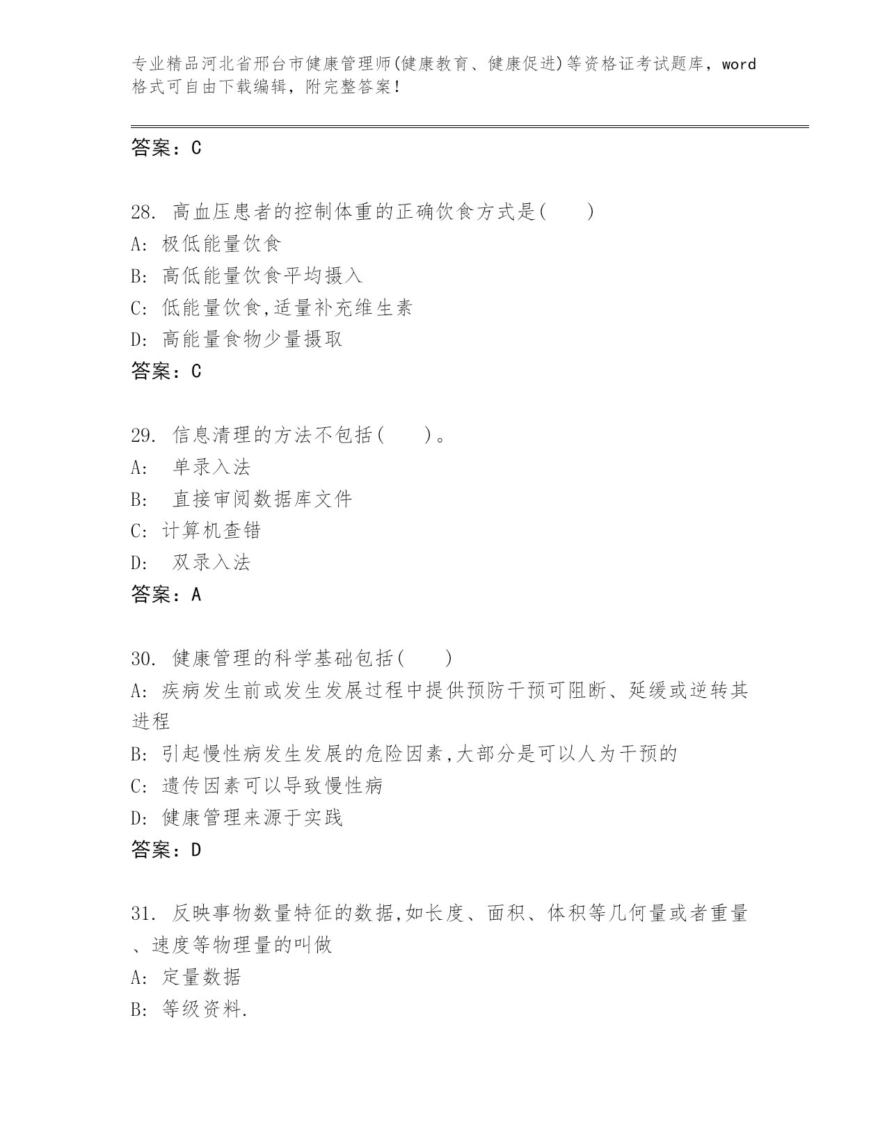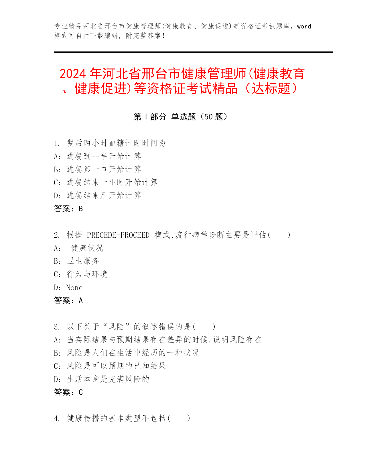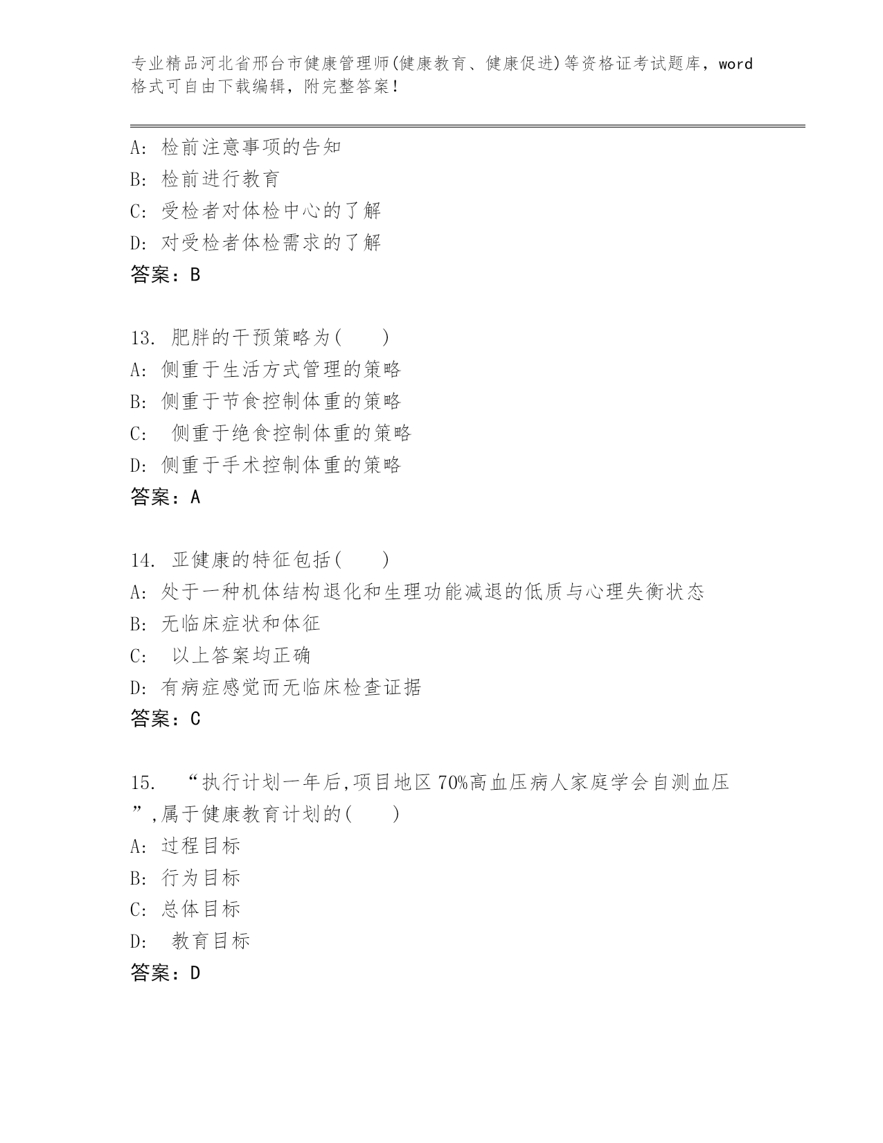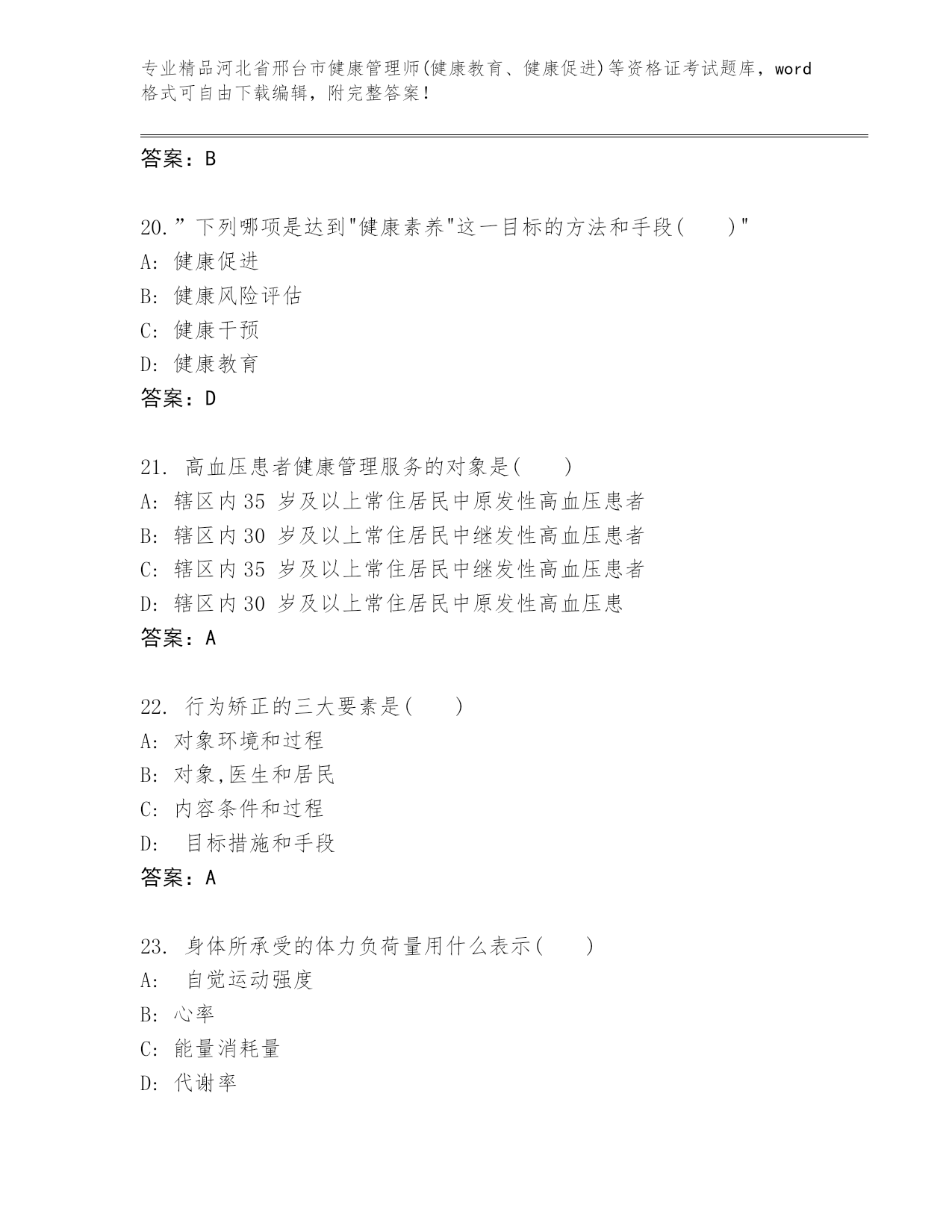 2024年河北省邢台市健康管理师(健康教育、健康促进)等资格证考试精品(达标题)