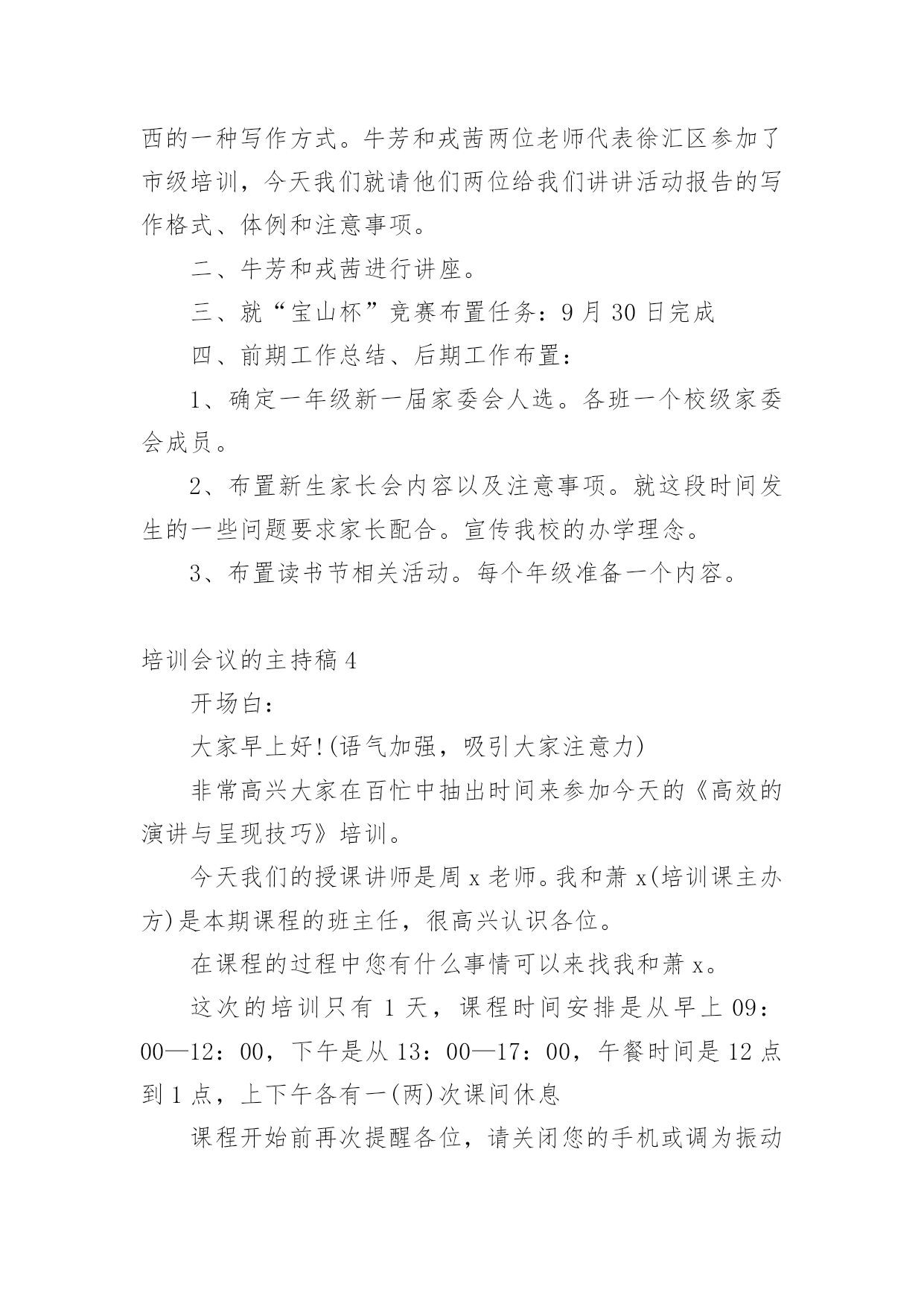 培训会议的主持稿在现实社会中,用到主持稿的地方越来越多,主持稿一般由开场白、中间部分与结束语组成。相信许多人会觉得主持稿很难写吧,以下是小编为大家整理的培训会议的主持稿,欢迎大家分享。培训会议的主持稿1同志们:现在开会!为加快推进我院等级医院创建工作,确保等级医院验收顺利达标,我们特邀了附二院办公室主任、三甲复评办主任博士来院指导培训。,医学博士,主任医师,硕士生导师,历任附二院放射科副主任、医疗设备处处长,现任附二院办公室主任,在三甲复评中兼任三甲办主任,主要负责复评的整体方案以及协调、推动、迎检等工作,具有丰富的医院管理与等级医院评审经验。下面,让我们以热烈的掌声欢迎曾燕博士进行培训与指导。刚才,X博士结合附二院三甲复评工作对等级医院创建作了生动的讲述,总结了许多很好的经验,也对我们区县级医院的创建工作提出了希望和具体要求,让我们再次以热烈的掌声感谢X博士的讲课。在今后的创建工作中,我们一定要按照等级医院创建的标准和我院目标责任分解的要求,继续狠抓创建工作,从以下三个方面抓好落实创建工作:培训会议的主持稿2亲爱的同志们:为贯彻落实全县工业经济暨安全生产和驻外招商人员出征工作会议精神,全面加强我县专业招商队伍建设,提高专业招商队伍的整体素质和实践能力,发挥其在全县招商引资工作中的主力军作用,促进全县招商引资工作上层次、上水平,经县委、县政府领导同意,决定举办这次全县驻外招商工作人员培训班。这次培训班,既是一次关于招商实务的集中培训,也是对大家奔赴招商一线的战前动员。今天培训的主题,一是熟悉沙洋县情,二是找准驻外招商的突破口,主要包括四个方面的内容,一是介绍沙洋基本县情。二是介绍沙洋投资政策和驻外招商工作人员的管理办法。三是商务礼仪及商务谈判技巧。四是领导讲话。会前,县招商中心作了细致的准备工作,将本次培训的相关内容都装订成册,供大家外出时学习参考。首先,由我来向大家简要介绍一下沙洋的基本县情。第二项,请县招商中心主任构燕同志组织学习两个文件,一个是沙洋县促进投资办法。一个是加强驻外招商人员管理的通知。另外,请构主任就驻外专班如何迅速开展工作提出要求。第三项,请县供销社主任刘占清同志对大家进行商务礼仪和商务谈判技巧方面的培训,大家欢迎。第四项,请县委常委、副县长任清锋同志讲话,大家欢迎。今天的培训会议在大家的共同努力下,圆满完成了预定的议程,收到了预期的效果.为认真贯彻落实县委、县政府有关招商引资工作的意见和任县长的讲话精神,我再强调以下几点:一、要形成高度统一的思想共识选派20个专班驻外招商是县委、县政府作出的一项重大决策部署,是实施沙洋对外开放战略的一项重要举措,同时也是强化行政推动、提高招商成效的重要手段。所以,我们必须深刻领会县委、县政府的决策意图,充分认识招商引资在我们沙洋的极端重要性和必要性。第一,招商引资是加快发展的主抓手。发展要依托项目,项目要依靠招商。区域经济的竞争说到底就是项目的竞争,就是招商引资的竞争,谁在招商引资上抢得先机,谁就能在加快发展上赢得主动。沙洋要加快发展,关键在工业,希望在项目,出路在招商。沙洋要在新一轮发展竞争中取胜,首先要在招商引资上大获全胜,否则,沙洋提速升位、跨越发展就没有希望,弯道超越、洼地崛起就更不可能。第二,招商引资是锻炼干部的练兵场。市场经济呼唤复合型干部,要求广大干部不仅要懂政治,更要懂经济;不仅要会管理,更要会经营。通过招商引资,可以开阔我们的胸襟,开阔我们的眼界,开阔我们的思路,从而更多地了解市场,更好地驾驭市场,不断增加我们的知识,不断增长我们的才干,成为符合时代要求、适应市场竞争的高素质、复合型干部,这也是县委、县政府培养、锻炼干部的一个重要方法。第三,招商引资是检验能力的“试金石”。在新的历史条件下,对我们的干部来讲,招商引资就是一块“试金石”。谁是真英雄,谁是真好汉,招商引资比比看。同志们能招来客商,能引来项目,就是沙洋经济社会发展的功臣、能人,反之就是庸人。是功臣就要重奖,是能人就要重用,是庸人就要淘汰。希望同志们都能够在招商引资中大显身手,为沙洋的发展建功立业。二、要树立务求必胜的坚定信心招商引资是强者之间的对话,是智者之间的较量。招商引资肯定充满着艰辛、充满着曲折,但同时也孕育着成功、孕育着希望。我们一定要在看到希望中坚定信心,决不能因为一时的困难而丧失我们的斗志。第一,要有勇气。招商引资不可能一帆风顺,短时间之内找不到头绪,或者碰到钉子,或者遇到曲折,这都是很正常的。但同志们要明确一点,成功向来只垂青那些锲而不舍的人,向来只垂青那些百折不挠的人,向来只垂青那些永往直前的人。只要我们鼓足干劲,知难而上不言难,迎难而上不怕难,克难而上而降难,充分利用我们沙洋的地缘、亲缘、友缘,坚持不懈地挖掘资源和市场,大胆地想,大胆地拼,大胆地抢,就能及时捕捉到商机,就
