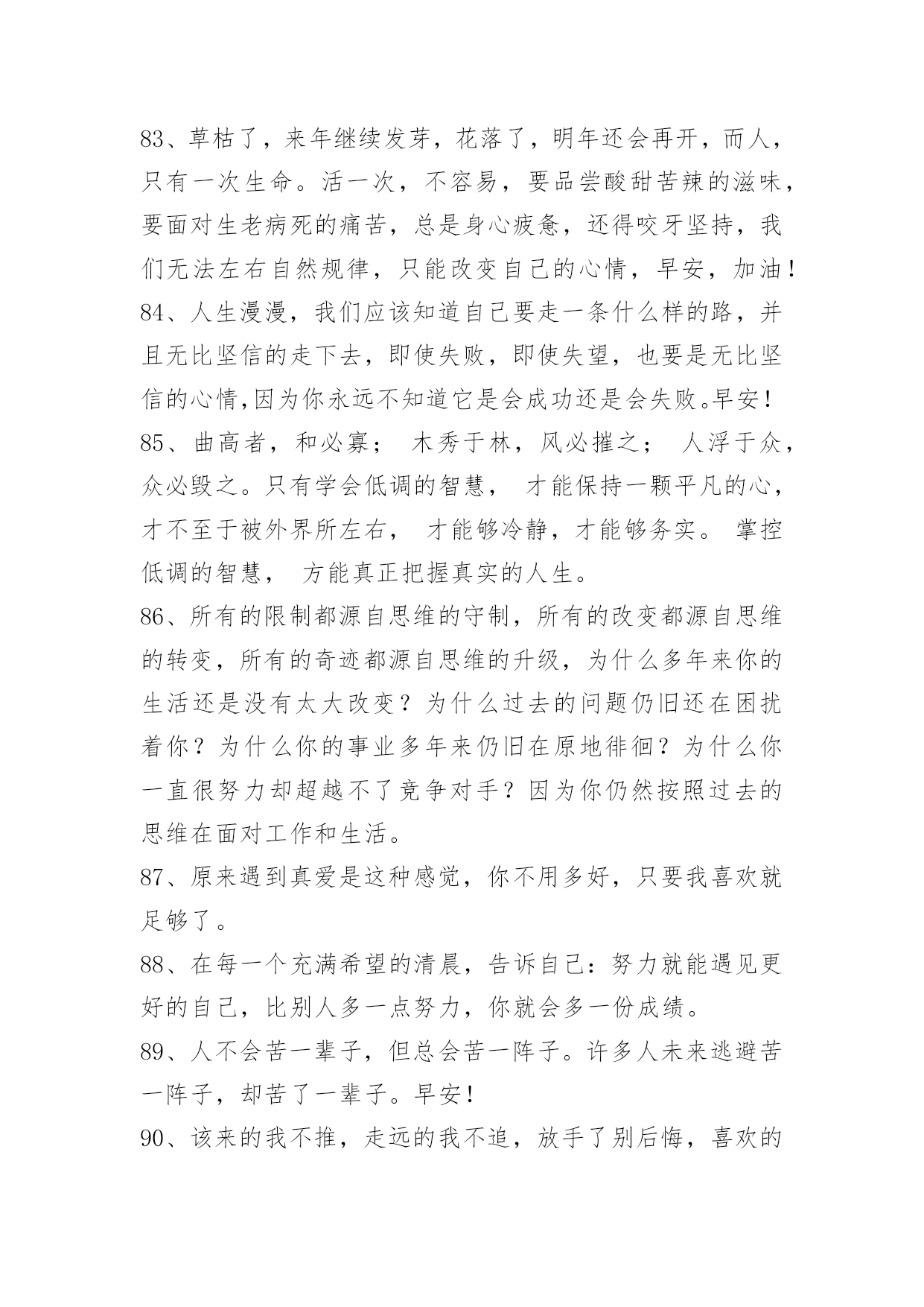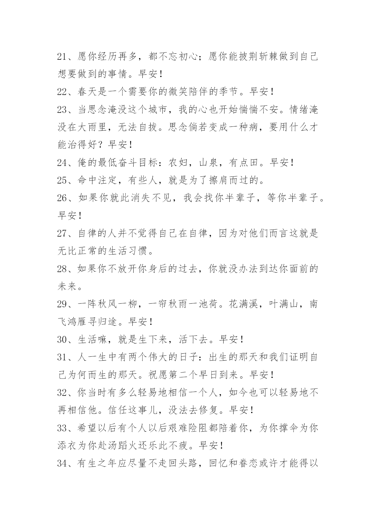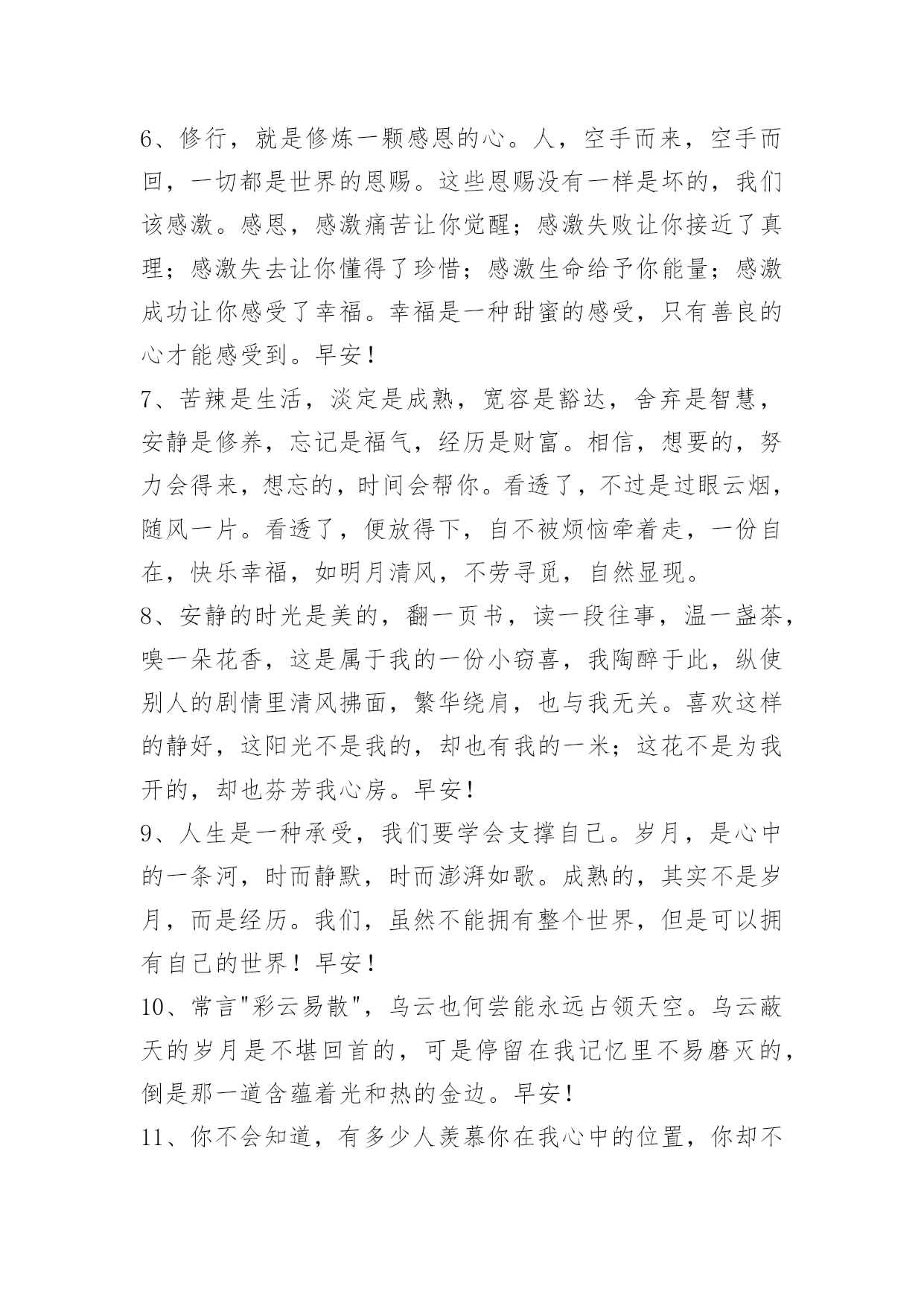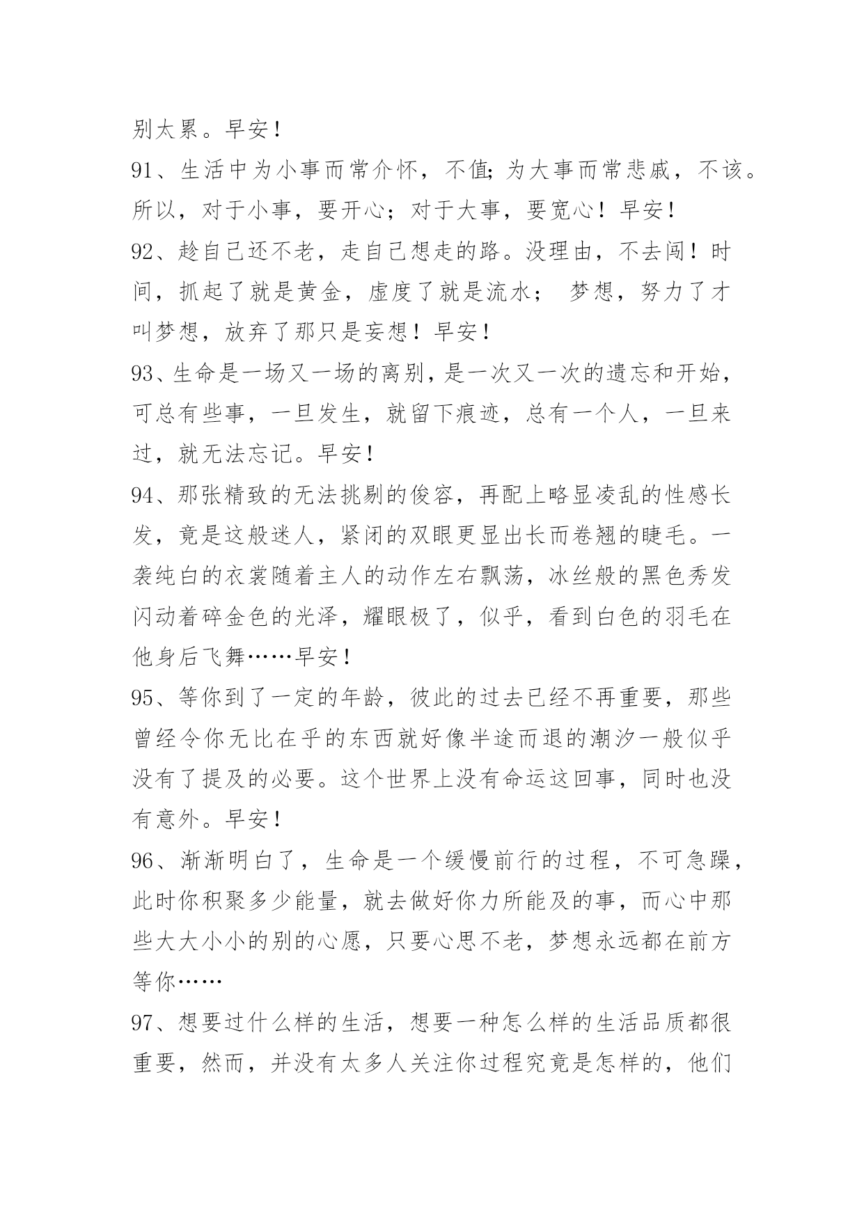 最新唯美早安文案最新唯美早安文案汇总(精选110句)如果你具备开始的勇气,就有了成功的豪情。早安!本篇文章是小编收集整理的唯美早安文案,欢迎阅读借鉴。1、永远都不要怀疑自己的能力,能力这种东西,你努力了就有,不努力就肯定没有。早安!2、要有勇气追随心声,听从直觉,它们在某种程度上知道你想成为的样子。早安!3、睡眼惺忪迎接黎明,刷牙洗脸手要轻。阳光给我好心情,享受清新好空气。一杯热饮好甜蜜,家有人伴好温馨。新的一天,新期待,完美生活常伴您!早安!4、人生难得四境界:一是痛而不言。话,妙在说与不说之间。无言不是不痛,而是直面悲痛、疼痛和惨痛。二是笑而不语。微笑具有移山的力量,淡然一笑,有时胜过千军万马。三是迷而不失。淡定是人生修炼,痴迷和失态会伤及自身。四是惊而不乱。宠辱很难不惊,心惊则心动,动中有静、惊而不乱则具有别致之美。早安!5、人生一世,草木一秋。世间就是这样,谁也逃不过两样东西,一是因果,二是无常!心量越大,烦恼越轻;心量越小,烦恼越重。静心。静能生慧,智者无忧,计较是疼,比较是痛,淡然是福。定心。不以物喜,不以己悲。安心。尽人事而顺天意,随遇而安即得幸福。正心。心术不正损人害己,意志不坚诸事难成。早安!6、修行,就是修炼一颗感恩的心。人,空手而来,空手而回,一切都是世界的恩赐。这些恩赐没有一样是坏的,我们该感激。感恩,感激痛苦让你觉醒;感激失败让你接近了真理;感激失去让你懂得了珍惜;感激生命给予你能量;感激成功让你感受了幸福。幸福是一种甜蜜的感受,只有善良的心才能感受到。早安!7、苦辣是生活,淡定是成熟,宽容是豁达,舍弃是智慧,安静是修养,忘记是福气,经历是财富。相信,想要的,努力会得来,想忘的,时间会帮你。看透了,不过是过眼云烟,随风一片。看透了,便放得下,自不被烦恼牵着走,一份自在,快乐幸福,如明月清风,不劳寻觅,自然显现。8、安静的时光是美的,翻一页书,读一段往事,温一盏茶,嗅一朵花香,这是属于我的一份小窃喜,我陶醉于此,纵使别人的剧情里清风拂面,繁华绕肩,也与我无关。喜欢这样的静好,这阳光不是我的,却也有我的一米;这花不是为我开的,却也芬芳我心房。早安!9、人生是一种承受,我们要学会支撑自己。岁月,是心中的一条河,时而静默,时而澎湃如歌。成熟的,其实不是岁月,而是经历。我们,虽然不能拥有整个世界,但是可以拥有自己的世界!早安!10、常言"彩云易散",乌云也何尝能永远占领天空。乌云蔽天的岁月是不堪回首的,可是停留在我记忆里不易磨灭的,倒是那一道含蕴着光和热的金边。早安!11、你不会知道,有多少人羡慕你在我心中的位置,你却不懂得珍惜。你忘了回忆,我忘了忘记。早安!12、在最好的时光,做想做的事,去想去的地方。早安!13、爱的本意不是痛苦和难过,不要只回忆痛苦,给自己徒增伤悲。爱的本身,是给人以快乐。爱一个人,原本就是一件可喜的事情。早安!14、愿湿气夹杂着福气,愿雨滴夹杂着如意,愿阴云夹杂着财运,愿雨后更能看到彩虹的身影。所以,不要不开心,要更开心!雨天祝福,愿你好运!早安!15、一个天生没有四肢的人,却让所有人羡慕他的自信,他的眼神,无数次的练习只为了自己能够不倚靠别人自己站起来!现在他在全世界演讲传达爱自信永不放弃!当你面对他的时候,我们碰到的那些挫折又算什么?只有惭愧。早安!16、多亏日子还有难过和失落,感激了生命必须放弃或选择,让我们在一场场身不由己里努力进化成更好的自己。早安!17、有时候,生活是不公平的,但我们却没理由对此绝望。早安!18、生活是盘大餐,总之五味俱全。周一周二西湖醋鱼,酸不溜丢;周三周四清炒苦瓜,苦不堪言;朋友啊,要忍得一时苦,到了周五香辣虾蟹,辣好下饭;最是双休满是甜点,甜甜蜜蜜喜喜欢欢。19、如果你想要造一艘船,先不要雇人去收集木头,也不要分配任务,而是去激发他们对海洋的渴望。早安!20、找不到答案的时候,就独自出去看一看这个世界,也许它给不了你什么,但它会让你变得释然一些。早安!21、愿你经历再多,都不忘初心;愿你能披荆斩棘做到自己想要做到的事情。早安!22、春天是一个需要你的微笑陪伴的季节。早安!23、当思念淹没这个城市,我的心也开始惴惴不安。情绪淹没在大雨里,无法自拔。思念倘若变成一种病,要用什么才能治得好?早安!24、俺的最低奋斗目标:农妇,山泉,有点田。早安!25、命中注定,有些人,就是为了擦肩而过的。26、如果你就此消失不见,我会找你半辈子,等你半辈子。早安!27、自律的人并不觉得自己在自律,因为对他们而言这就是无比正常的生活习惯。28、如果你不放开你身后的过去,你就没办法到达你面前的未来。29、一阵秋风一柳,一帘秋雨一池荷。花满溪,叶满山,南飞鸿雁寻归途。早安!30、生活嘛,就是生下来,活下去。早安!31、人一生中有两个伟大的日子:出生的那天和我们证明自己为何而生的
