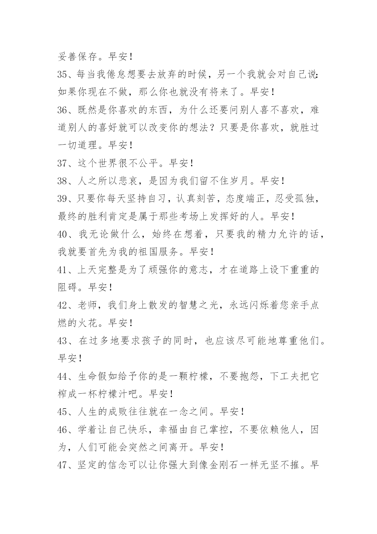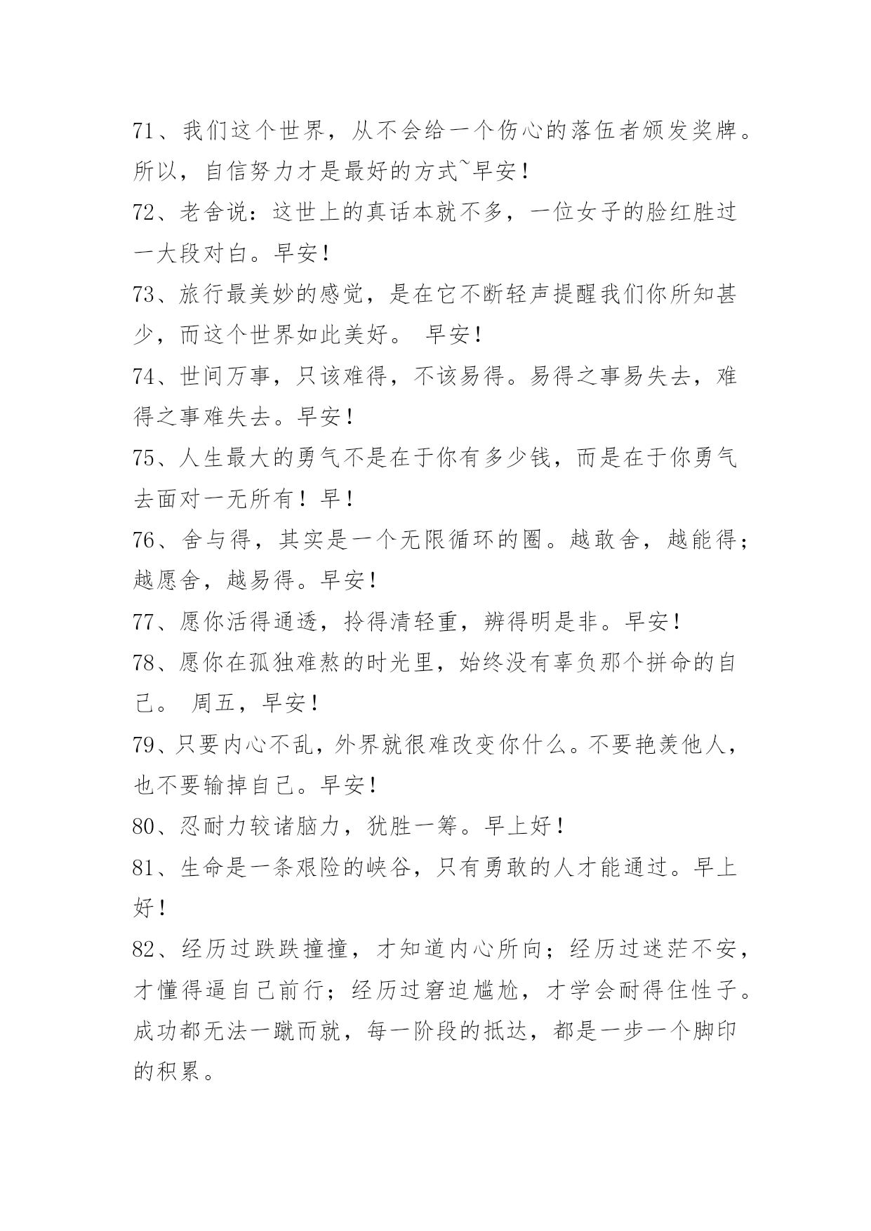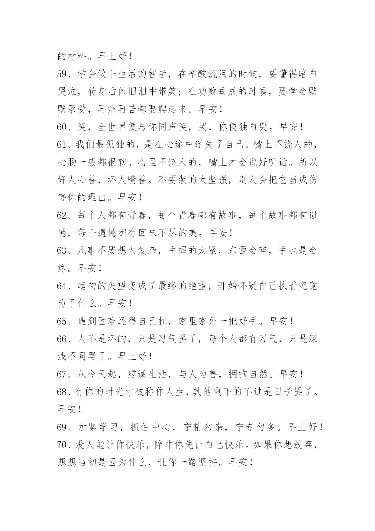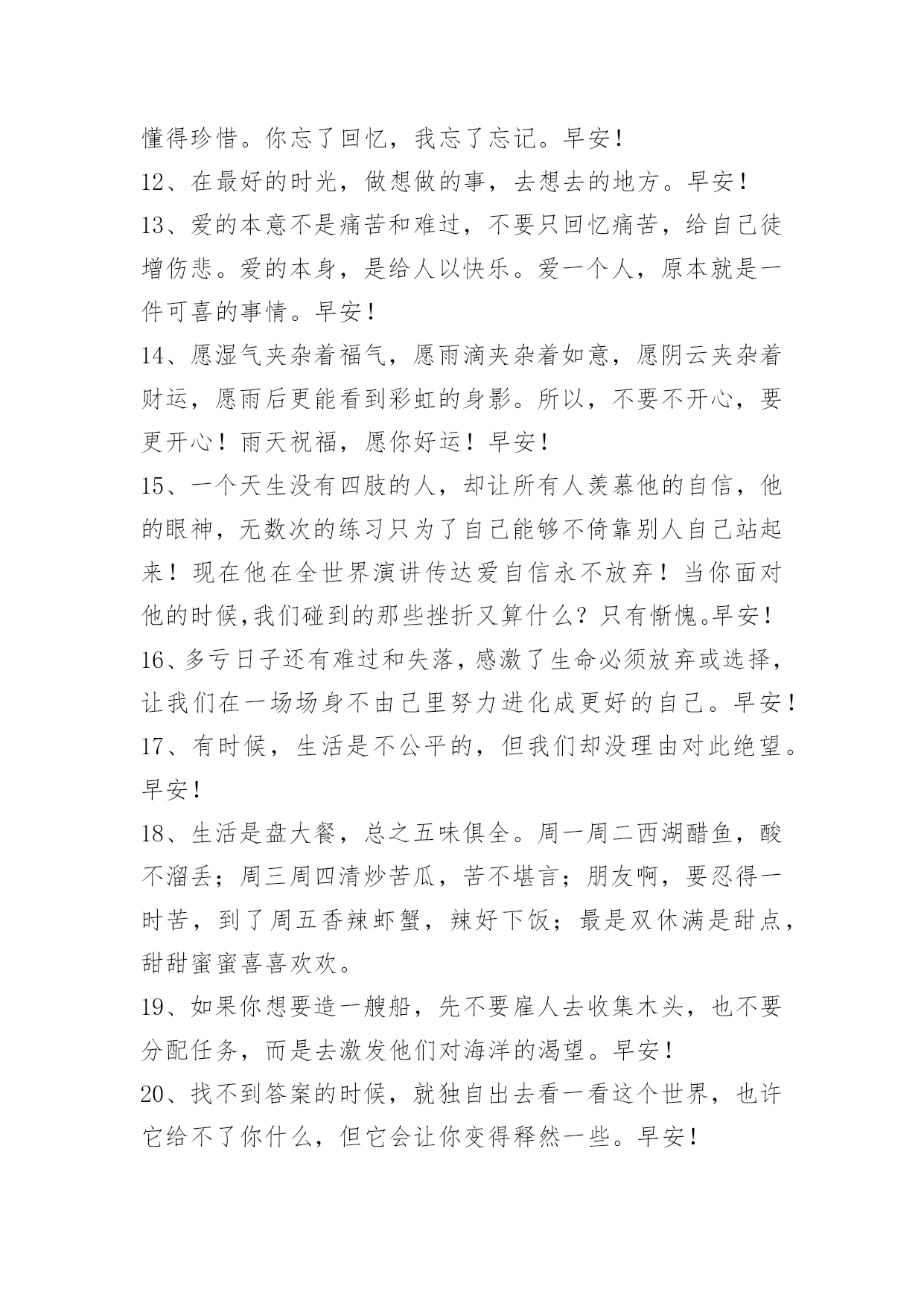 最新唯美早安文案最新唯美早安文案汇总(精选110句)如果你具备开始的勇气,就有了成功的豪情。早安!本篇文章是小编收集整理的唯美早安文案,欢迎阅读借鉴。1、永远都不要怀疑自己的能力,能力这种东西,你努力了就有,不努力就肯定没有。早安!2、要有勇气追随心声,听从直觉,它们在某种程度上知道你想成为的样子。早安!3、睡眼惺忪迎接黎明,刷牙洗脸手要轻。阳光给我好心情,享受清新好空气。一杯热饮好甜蜜,家有人伴好温馨。新的一天,新期待,完美生活常伴您!早安!4、人生难得四境界:一是痛而不言。话,妙在说与不说之间。无言不是不痛,而是直面悲痛、疼痛和惨痛。二是笑而不语。微笑具有移山的力量,淡然一笑,有时胜过千军万马。三是迷而不失。淡定是人生修炼,痴迷和失态会伤及自身。四是惊而不乱。宠辱很难不惊,心惊则心动,动中有静、惊而不乱则具有别致之美。早安!5、人生一世,草木一秋。世间就是这样,谁也逃不过两样东西,一是因果,二是无常!心量越大,烦恼越轻;心量越小,烦恼越重。静心。静能生慧,智者无忧,计较是疼,比较是痛,淡然是福。定心。不以物喜,不以己悲。安心。尽人事而顺天意,随遇而安即得幸福。正心。心术不正损人害己,意志不坚诸事难成。早安!6、修行,就是修炼一颗感恩的心。人,空手而来,空手而回,一切都是世界的恩赐。这些恩赐没有一样是坏的,我们该感激。感恩,感激痛苦让你觉醒;感激失败让你接近了真理;感激失去让你懂得了珍惜;感激生命给予你能量;感激成功让你感受了幸福。幸福是一种甜蜜的感受,只有善良的心才能感受到。早安!7、苦辣是生活,淡定是成熟,宽容是豁达,舍弃是智慧,安静是修养,忘记是福气,经历是财富。相信,想要的,努力会得来,想忘的,时间会帮你。看透了,不过是过眼云烟,随风一片。看透了,便放得下,自不被烦恼牵着走,一份自在,快乐幸福,如明月清风,不劳寻觅,自然显现。8、安静的时光是美的,翻一页书,读一段往事,温一盏茶,嗅一朵花香,这是属于我的一份小窃喜,我陶醉于此,纵使别人的剧情里清风拂面,繁华绕肩,也与我无关。喜欢这样的静好,这阳光不是我的,却也有我的一米;这花不是为我开的,却也芬芳我心房。早安!9、人生是一种承受,我们要学会支撑自己。岁月,是心中的一条河,时而静默,时而澎湃如歌。成熟的,其实不是岁月,而是经历。我们,虽然不能拥有整个世界,但是可以拥有自己的世界!早安!10、常言"彩云易散",乌云也何尝能永远占领天空。乌云蔽天的岁月是不堪回首的,可是停留在我记忆里不易磨灭的,倒是那一道含蕴着光和热的金边。早安!11、你不会知道,有多少人羡慕你在我心中的位置,你却不懂得珍惜。你忘了回忆,我忘了忘记。早安!12、在最好的时光,做想做的事,去想去的地方。早安!13、爱的本意不是痛苦和难过,不要只回忆痛苦,给自己徒增伤悲。爱的本身,是给人以快乐。爱一个人,原本就是一件可喜的事情。早安!14、愿湿气夹杂着福气,愿雨滴夹杂着如意,愿阴云夹杂着财运,愿雨后更能看到彩虹的身影。所以,不要不开心,要更开心!雨天祝福,愿你好运!早安!15、一个天生没有四肢的人,却让所有人羡慕他的自信,他的眼神,无数次的练习只为了自己能够不倚靠别人自己站起来!现在他在全世界演讲传达爱自信永不放弃!当你面对他的时候,我们碰到的那些挫折又算什么?只有惭愧。早安!16、多亏日子还有难过和失落,感激了生命必须放弃或选择,让我们在一场场身不由己里努力进化成更好的自己。早安!17、有时候,生活是不公平的,但我们却没理由对此绝望。早安!18、生活是盘大餐,总之五味俱全。周一周二西湖醋鱼,酸不溜丢;周三周四清炒苦瓜,苦不堪言;朋友啊,要忍得一时苦,到了周五香辣虾蟹,辣好下饭;最是双休满是甜点,甜甜蜜蜜喜喜欢欢。19、如果你想要造一艘船,先不要雇人去收集木头,也不要分配任务,而是去激发他们对海洋的渴望。早安!20、找不到答案的时候,就独自出去看一看这个世界,也许它给不了你什么,但它会让你变得释然一些。早安!21、愿你经历再多,都不忘初心;愿你能披荆斩棘做到自己想要做到的事情。早安!22、春天是一个需要你的微笑陪伴的季节。早安!23、当思念淹没这个城市,我的心也开始惴惴不安。情绪淹没在大雨里,无法自拔。思念倘若变成一种病,要用什么才能治得好?早安!24、俺的最低奋斗目标:农妇,山泉,有点田。早安!25、命中注定,有些人,就是为了擦肩而过的。26、如果你就此消失不见,我会找你半辈子,等你半辈子。早安!27、自律的人并不觉得自己在自律,因为对他们而言这就是无比正常的生活习惯。28、如果你不放开你身后的过去,你就没办法到达你面前的未来。29、一阵秋风一柳,一帘秋雨一池荷。花满溪,叶满山,南飞鸿雁寻归途。早安!30、生活嘛,就是生下来,活下去。早安!31、人一生中有两个伟大的日子:出生的那天和我们证明自己为何而生的