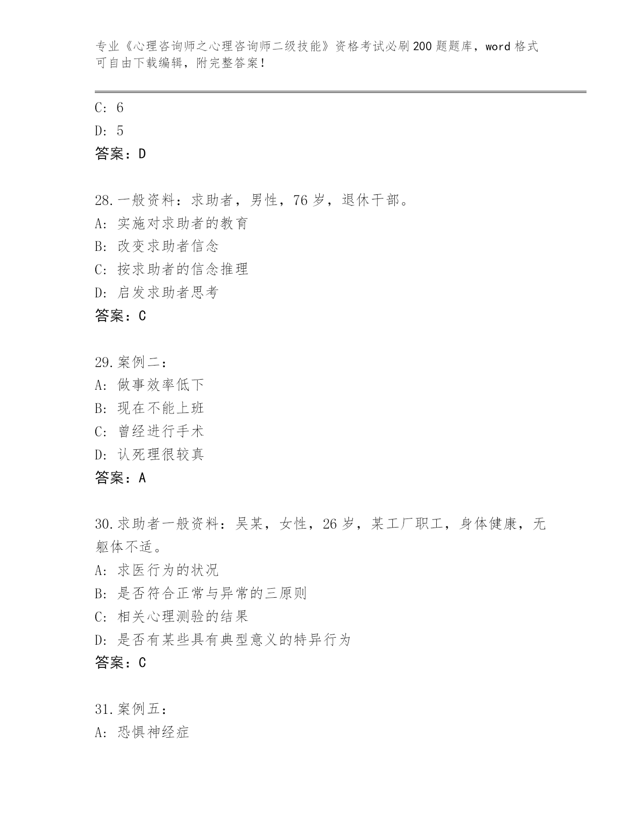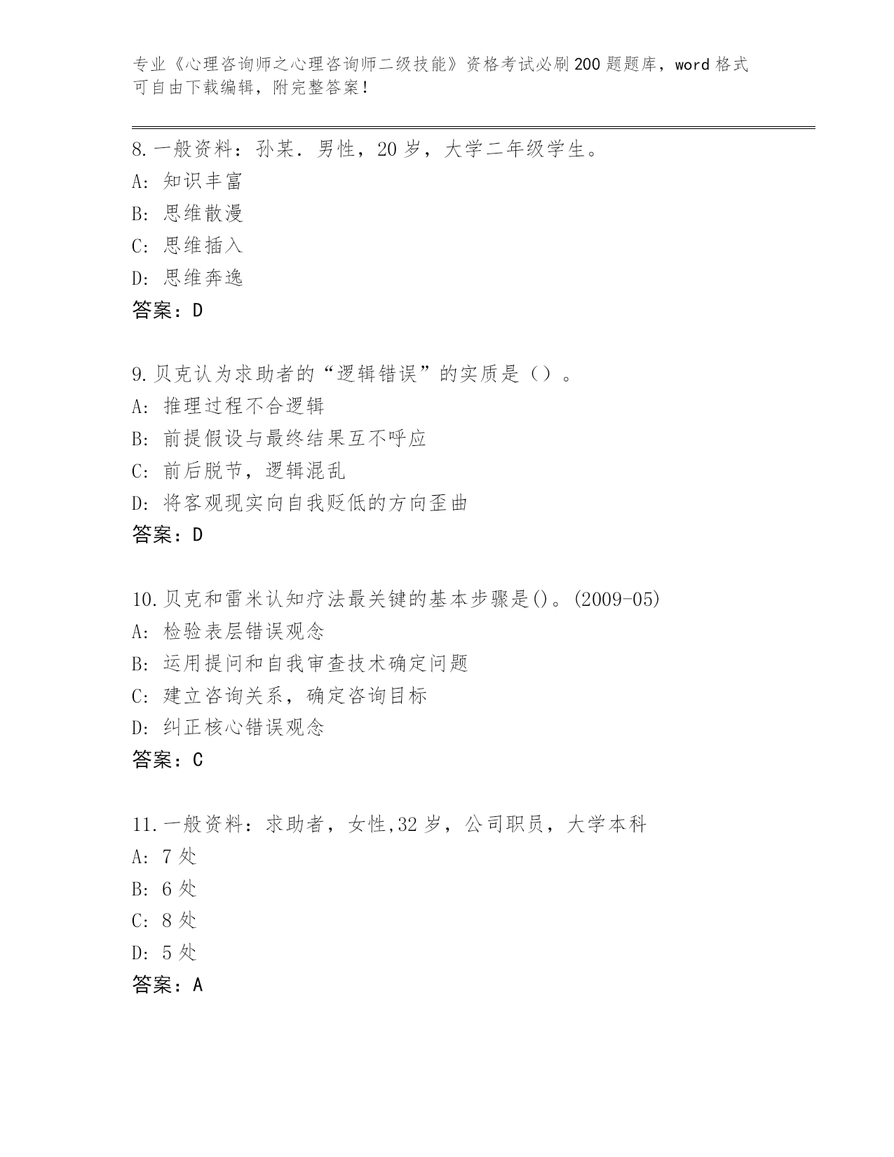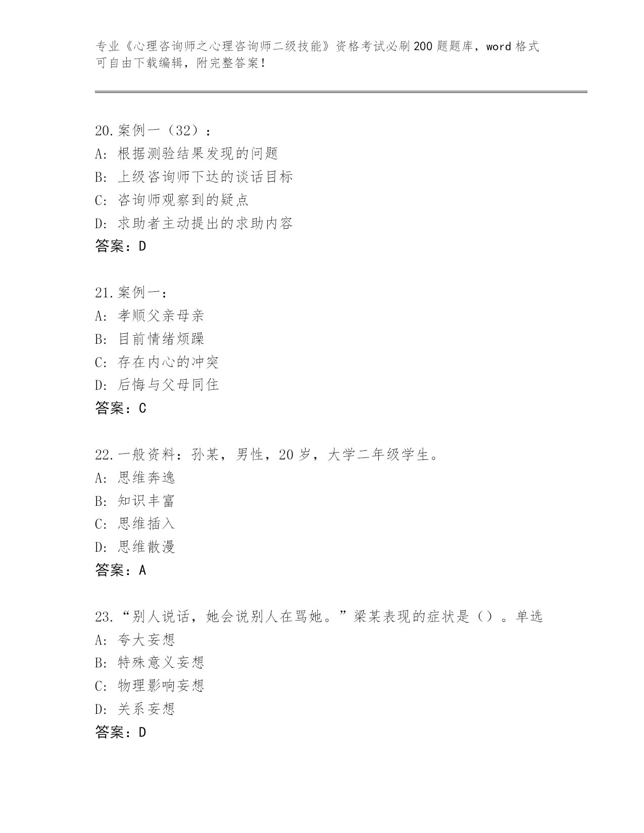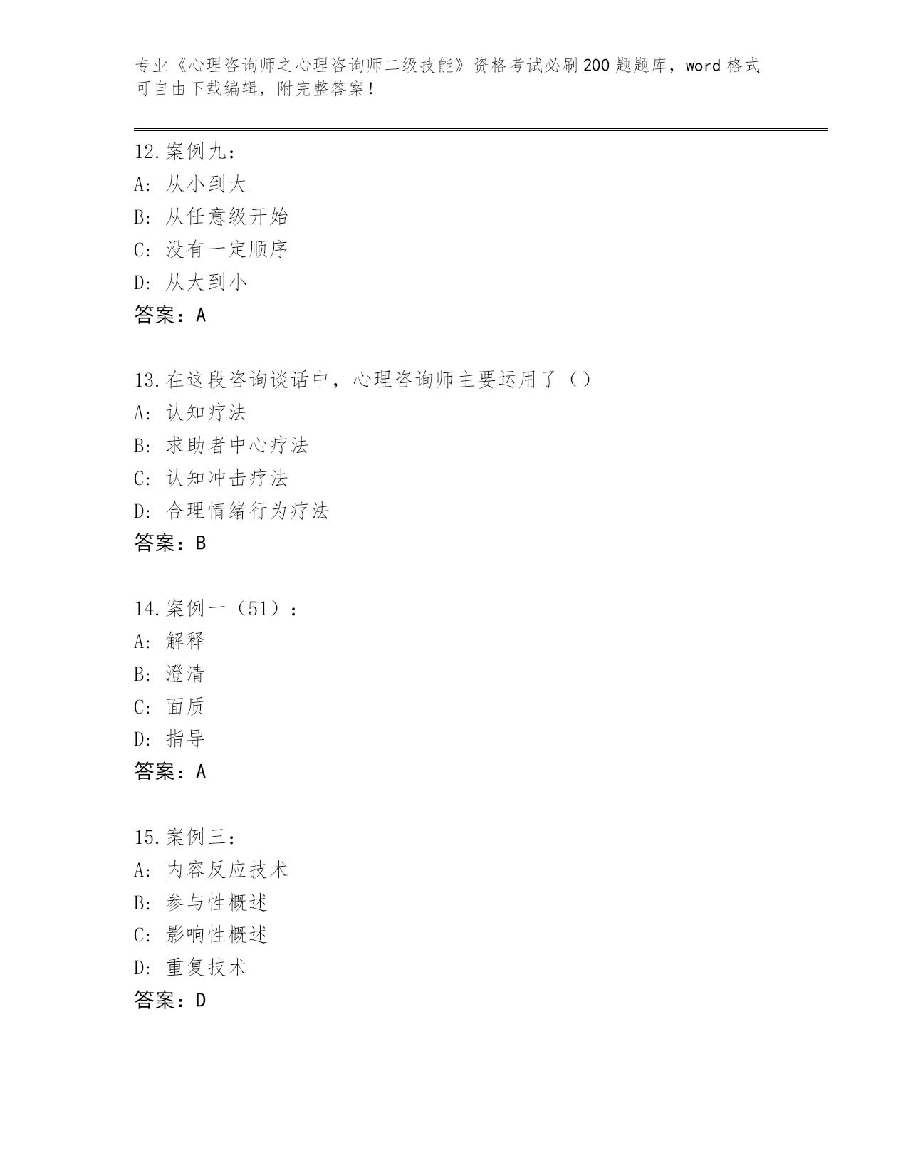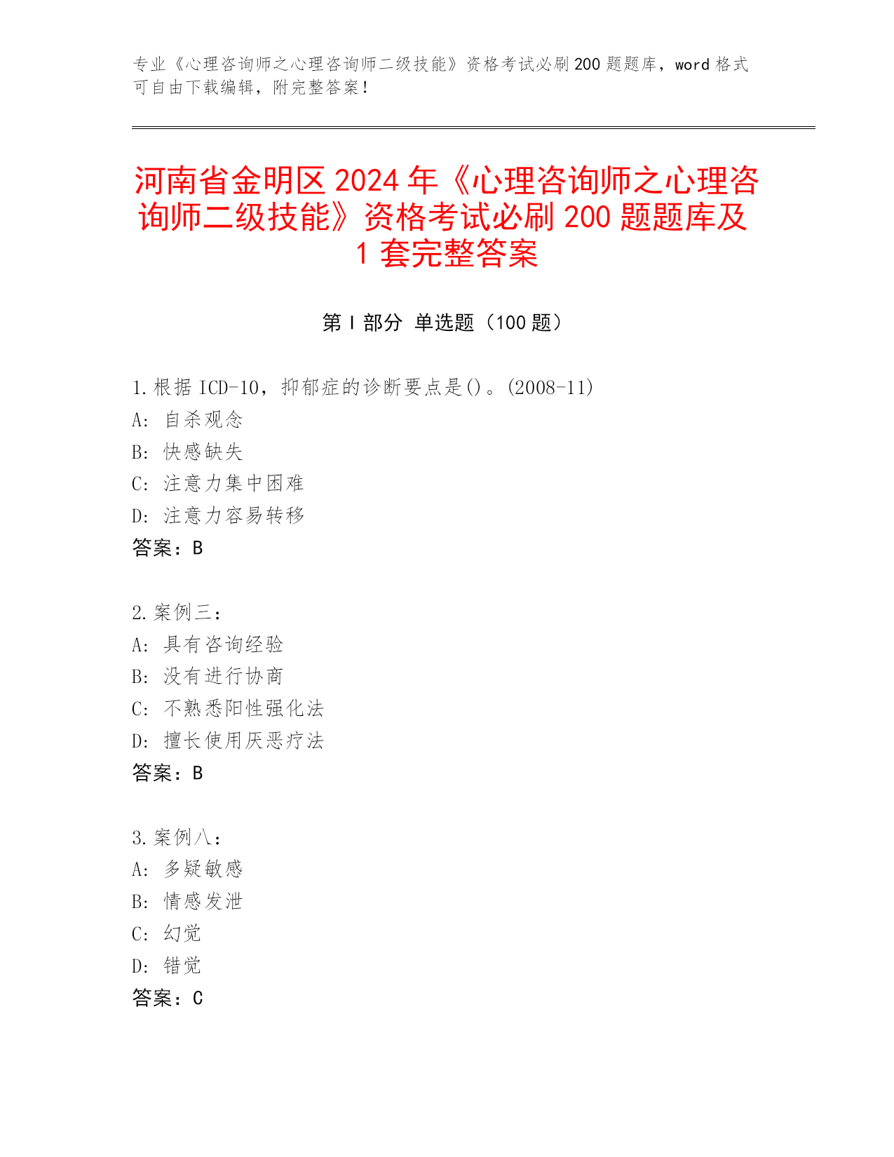 河南省金明区2024《心理咨询师之心理咨询师二级技能》资格考试必刷200题题库含答案