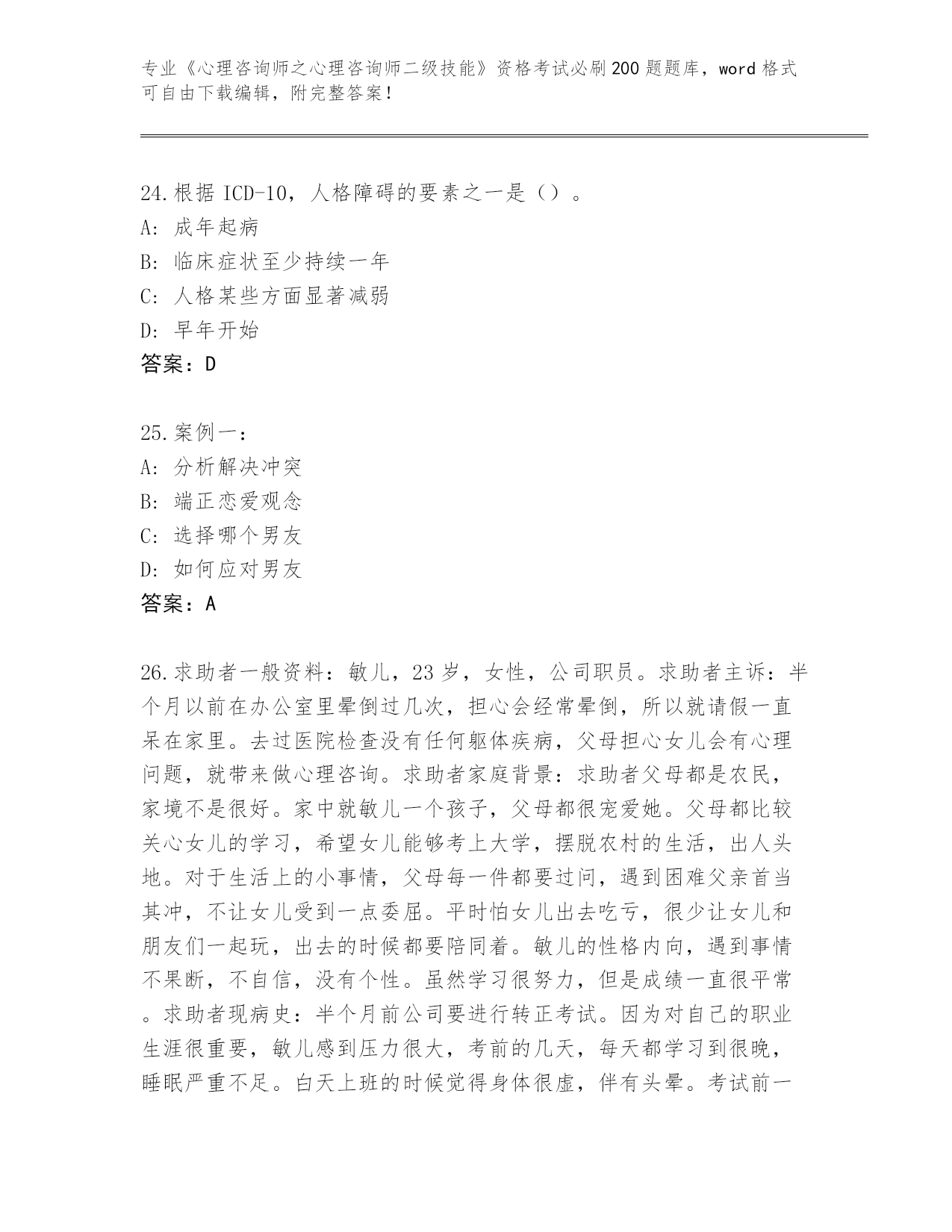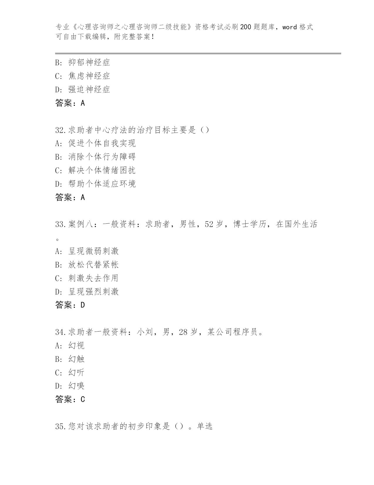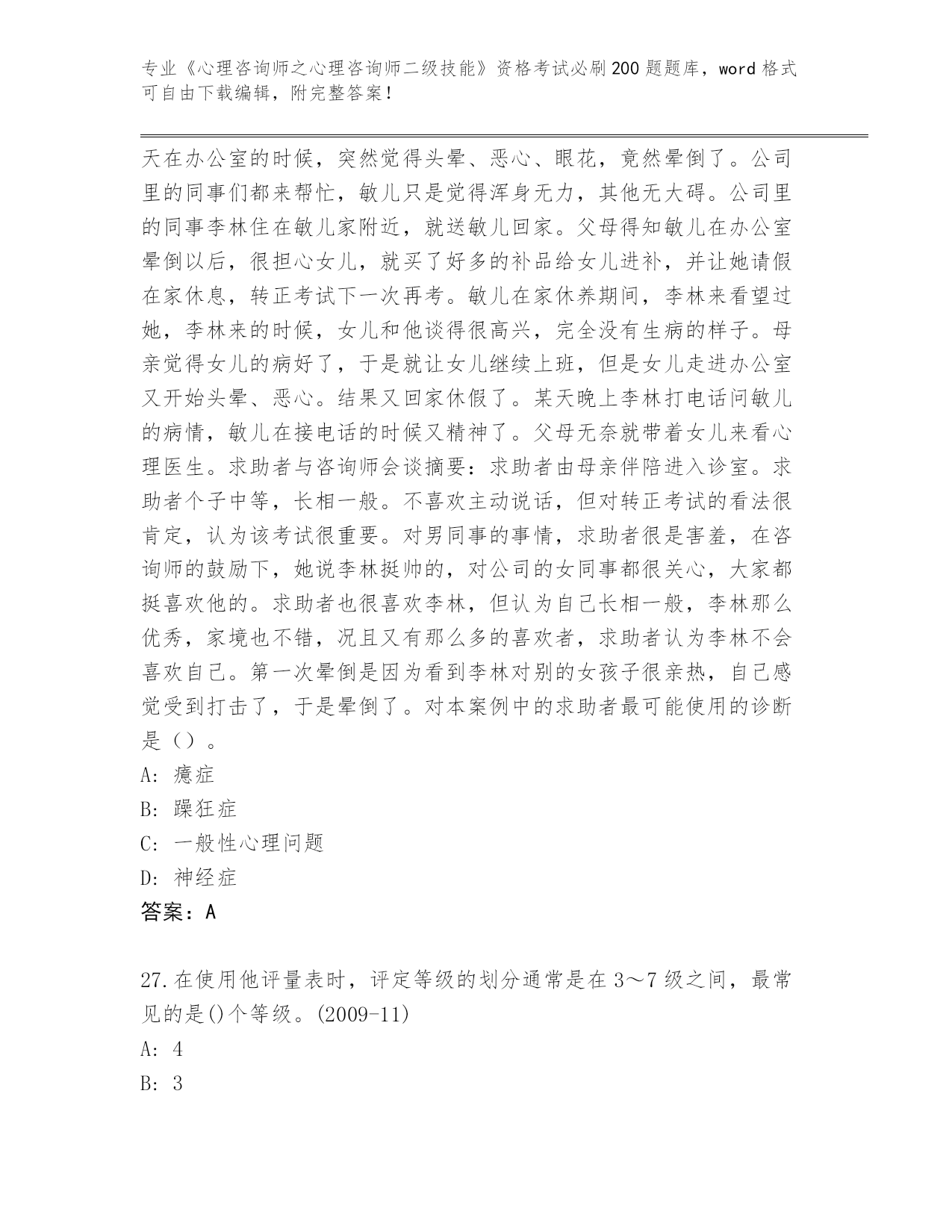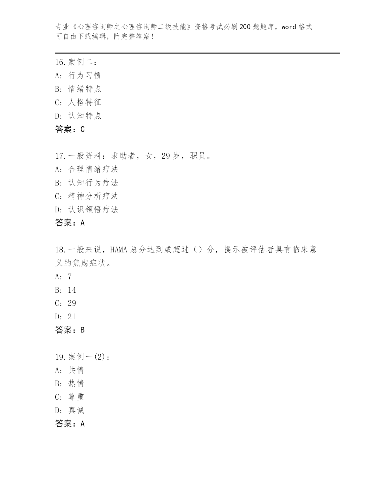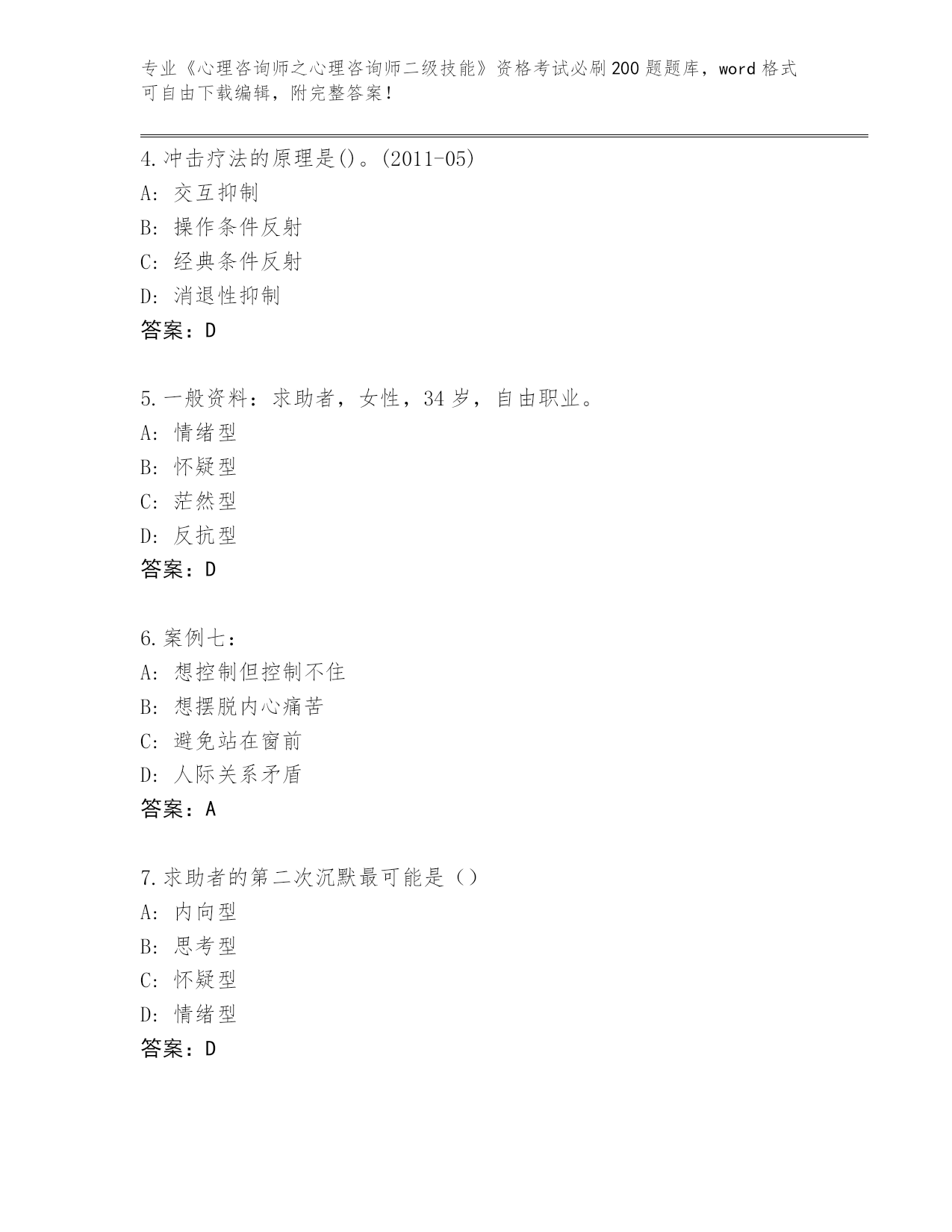 历年河南省《心理咨询师之心理咨询师二级技能》资格考试必刷200题题库(全优)