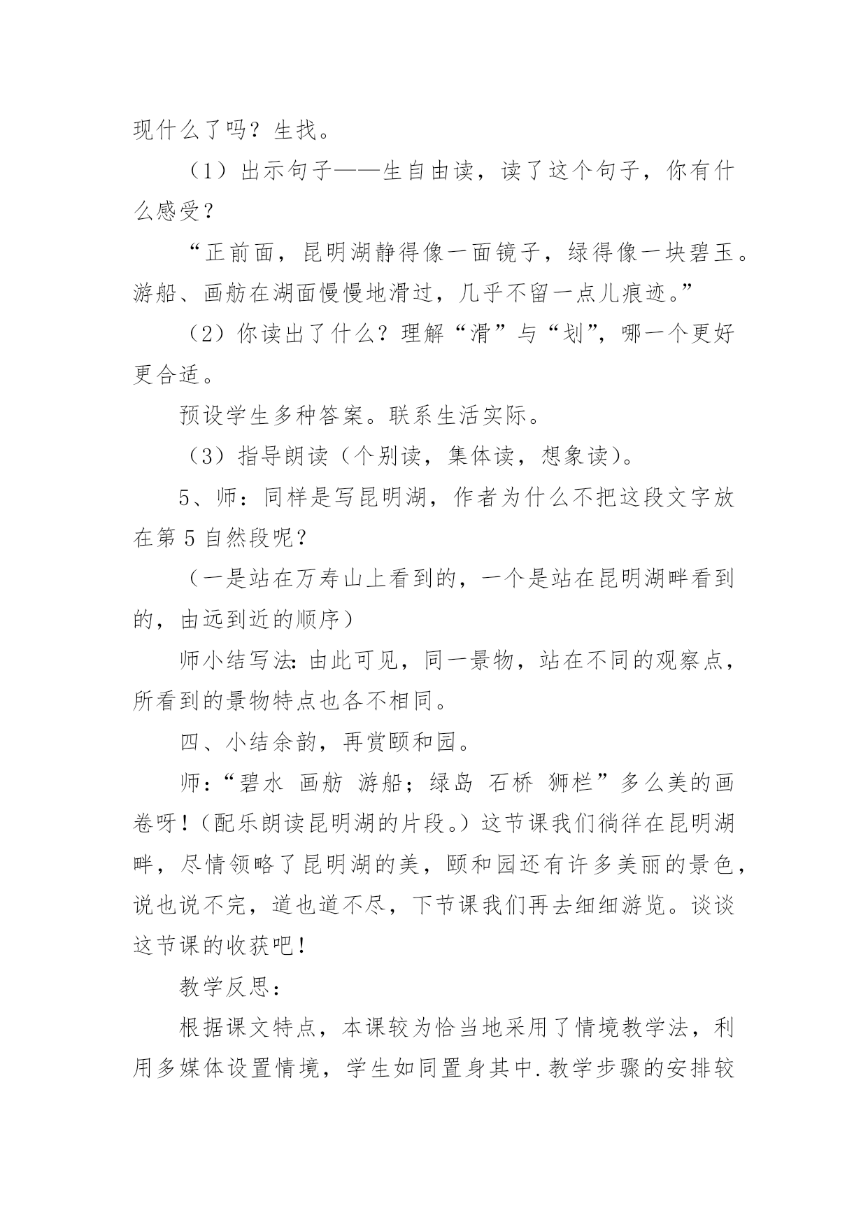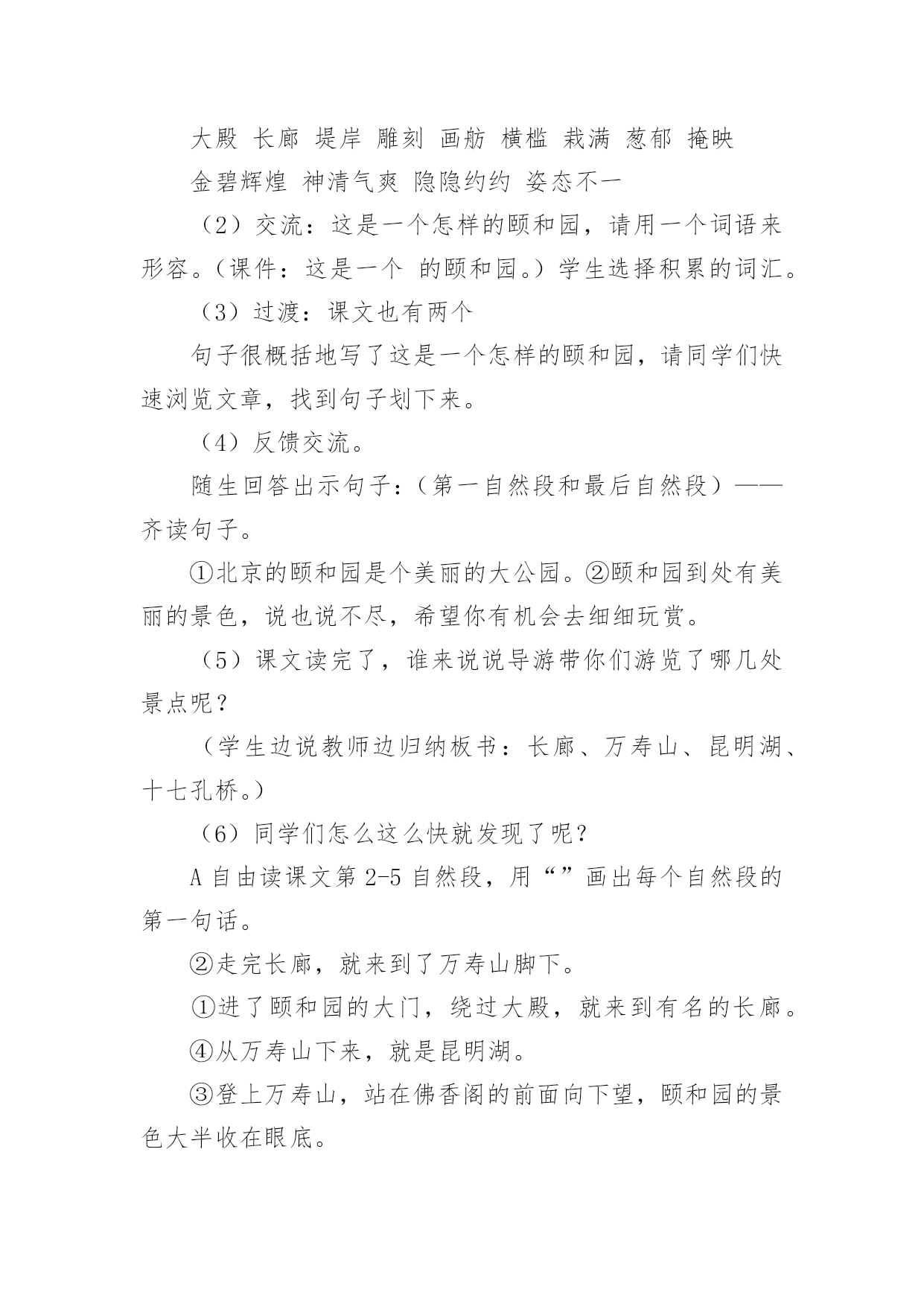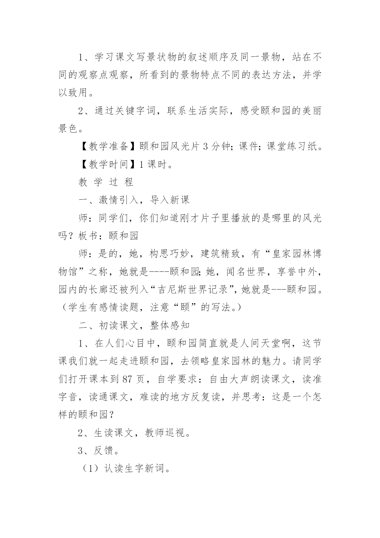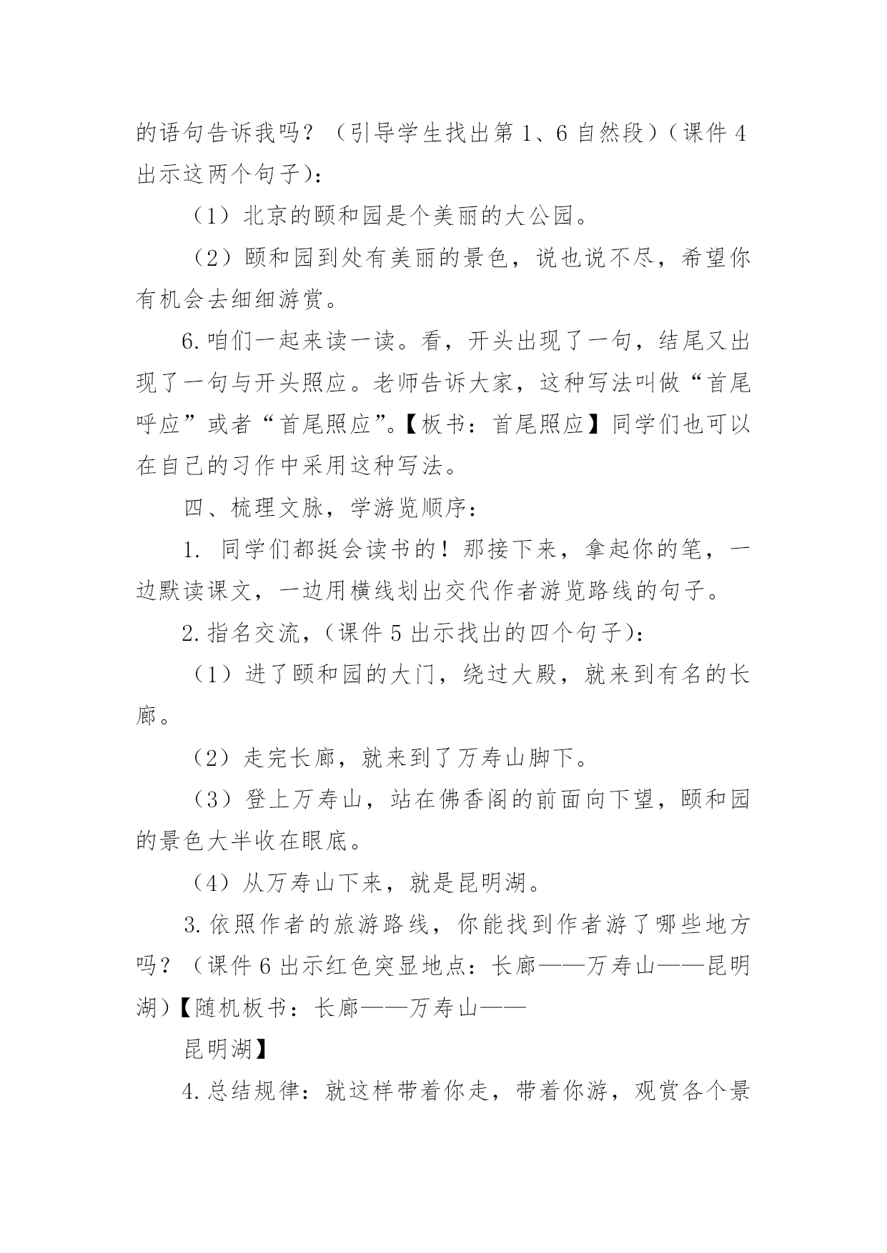《颐和园》教学设计《颐和园》教学设计在教学工作者实际的教学活动中,常常要写一份优秀的教学设计,编写教学设计有利于我们科学、合理地支配课堂时间。我们该怎么去写教学设计呢?以下是小编帮大家整理的《颐和园》教学设计,欢迎大家借鉴与参考,希望对大家有所帮助。《颐和园》教学设计1颐和园教学设计与反思北常保小学马艳君【教学目标】1、认识7个生字,会写11个生字。正确读写“长廊、神清气爽、金碧辉煌、宫殿、葱郁、掩映、隐隐约约、堤岸、雕刻、姿态不一”等词语。2、重点学习昆明湖的片段,初步学习课文写景文章的叙述顺序及抓住特点描写景物的表达方法;了解同一景物,站在不同的观察点观察,所看到的景物特点不同的写作方法。3、有感情地朗读课文,背诵优美句段。4、了解颐和园的美丽景色,培养学生的爱美情趣,培养民族自豪感。【教学重难点】1、学习课文写景状物的叙述顺序及同一景物,站在不同的观察点观察,所看到的景物特点不同的表达方法,并学以致用。2、通过关键字词,联系生活实际,感受颐和园的美丽景色。【教学准备】颐和园风光片3分钟;课件;课堂练习纸。【教学时间】1课时。教学过程一、激情引入,导入新课师:同学们,你们知道刚才片子里播放的是哪里的风光吗?板书:颐和园师:是的,她,构思巧妙,建筑精致,有“皇家园林博物馆”之称,她就是----颐和园;她,闻名世界,享誉中外,园内的长廊还被列入“吉尼斯世界记录”,她就是---颐和园。(学生有感情读题,注意“颐”的写法。)二、初读课文,整体感知1、在人们心目中,颐和园简直就是人间天堂啊,这节课我们就一起走进颐和园,去领略皇家园林的魅力。请同学们打开课本到87页,自学要求:自由大声朗读课文,读准字音,读通课文,难读的地方反复读,并思考:这是一个怎样的颐和园?2、生读课文,教师巡视。3、反馈。(1)认读生字新词。大殿长廊堤岸雕刻画舫横槛栽满葱郁掩映金碧辉煌神清气爽隐隐约约姿态不一(2)交流:这是一个怎样的颐和园,请用一个词语来形容。(课件:这是一个的颐和园。)学生选择积累的词汇。(3)过渡:课文也有两个句子很概括地写了这是一个怎样的颐和园,请同学们快速浏览文章,找到句子划下来。(4)反馈交流。随生回答出示句子:(第一自然段和最后自然段)——齐读句子。①北京的颐和园是个美丽的大公园。②颐和园到处有美丽的景色,说也说不尽,希望你有机会去细细玩赏。(5)课文读完了,谁来说说导游带你们游览了哪几处景点呢?(学生边说教师边归纳板书:长廊、万寿山、昆明湖、十七孔桥。)(6)同学们怎么这么快就发现了呢?A自由读课文第2-5自然段,用“”画出每个自然段的第一句话。②走完长廊,就来到了万寿山脚下。①进了颐和园的大门,绕过大殿,就来到有名的长廊。④从万寿山下来,就是昆明湖。③登上万寿山,站在佛香阁的前面向下望,颐和园的景色大半收在眼底。B师:这些句子能否交换位置?为什么?思考:作者是按什么顺序叙述的?理清叙述顺序。(板书:按游览的顺序)(7)用上表示方位的词语,出示课文的主要内容,说说发现了什么?北京的颐和园是个美丽的大公园。进了颐和园的大门,绕过大殿,就来到有名的长廊。走完长廊,就来到了万寿山脚下。登上万寿山,站在佛香阁的前面向下望,颐和园的.景色大半收在眼底。从万寿山下来,就是昆明湖。颐和园到处有美丽的景色,说也说不尽,希望你有机会去细细游赏。(师生总结:“总—分—总”的结构;首尾呼应的写法;过渡句的连接。)三、品读4、5自然段,感受昆明湖的美丽1、在课文中作者用的笔墨最多,写得最详细的是关于哪一部分的内容呢?直接出示第5自然段,师说:颐和园的美无处不在,我们先来领略昆明湖的美。2、生自由读课文,思考:看看昆明湖的哪些景物最吸引你。3、预设:(1)昆明湖围着长长的堤岸,堤上有好几座式样不同的石桥,两岸栽着数不清的垂柳。(有长长的堤岸,有数不清的垂柳,这使你联想到什么诗句呢?----草长莺飞二月天,拂堤杨柳醉春烟)(2)湖中心有个小岛,远远望去,岛上一片葱绿,树丛中露出宫殿的一角。A、请同学们闭上眼睛,边听边想,此时,我们就站在昆明湖畔,范读句子,你好象看到什么?B、是啊,站在湖畔,印入我们眼帘的是满目的葱绿,这是多么美的景色啊,让我们也美美地来读读,齐读。(春湖落日水拖蓝,天影楼台上下涵)(3)这座石桥有十七个桥洞,叫十七孔桥;桥栏杆上有上百根石柱,柱子上都雕刻着小狮子。这么多的狮子,姿态不一,没有哪两只是相同的。A、生找到句子,出示并让学生说说为什么喜欢。B、给“姿态不一”找个近义词。(形态万千、千姿百态、姿态万千等)C、老师也给你们带来了几张狮子图,让我们一起来欣赏。(出示狮子图片,引导学生朗读)。D、让我们拿起手中的笔,也来写一写你想象中的姿态不一的小狮子吧!——拿出练习纸,学生动笔写句子——反馈。这么多的狮子,姿态不一,有的好像;有的,