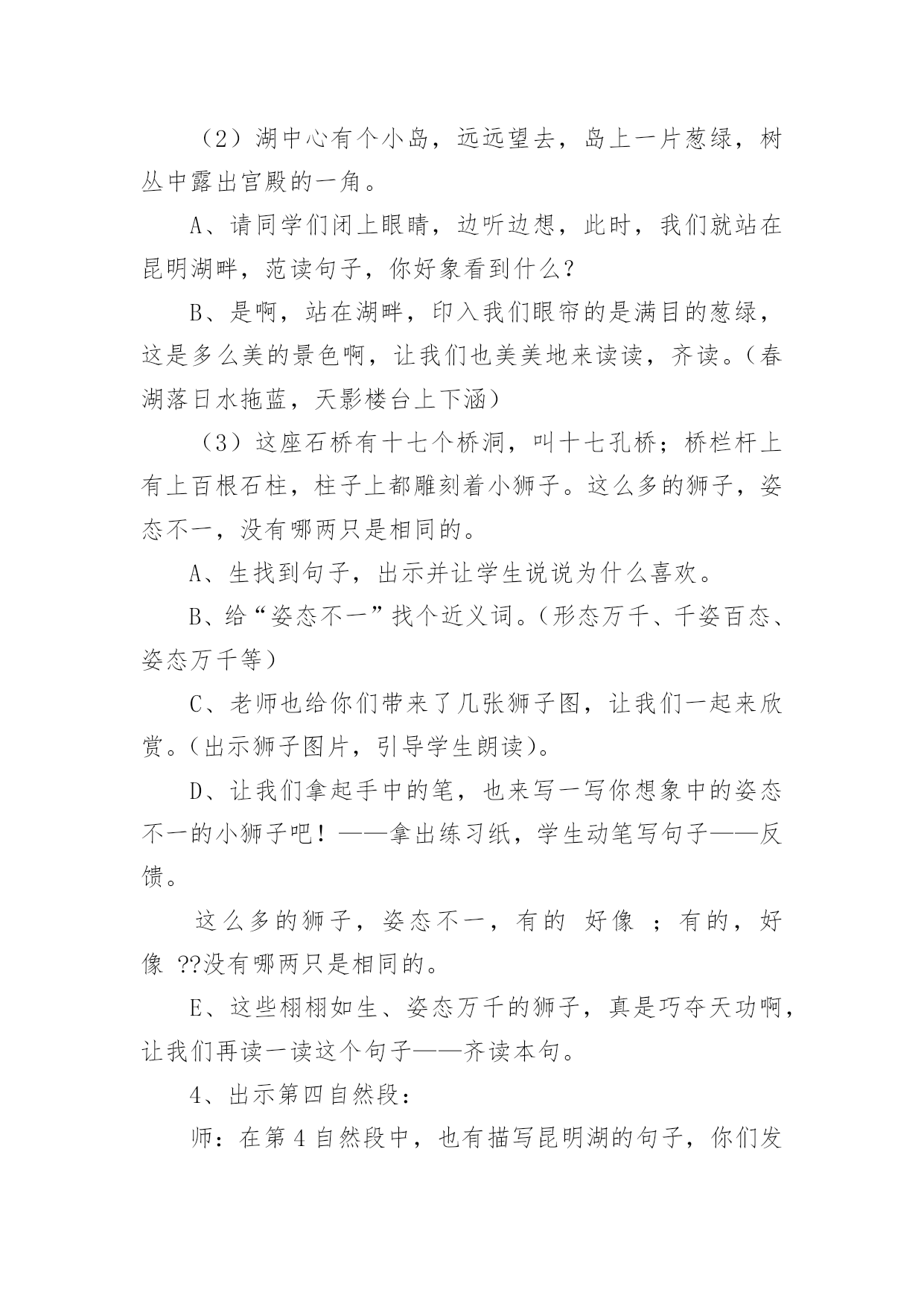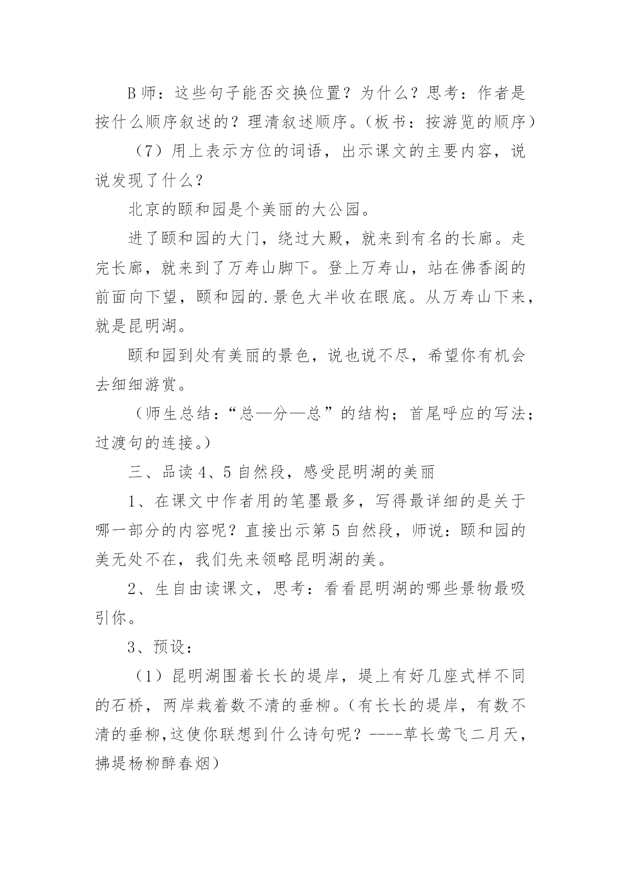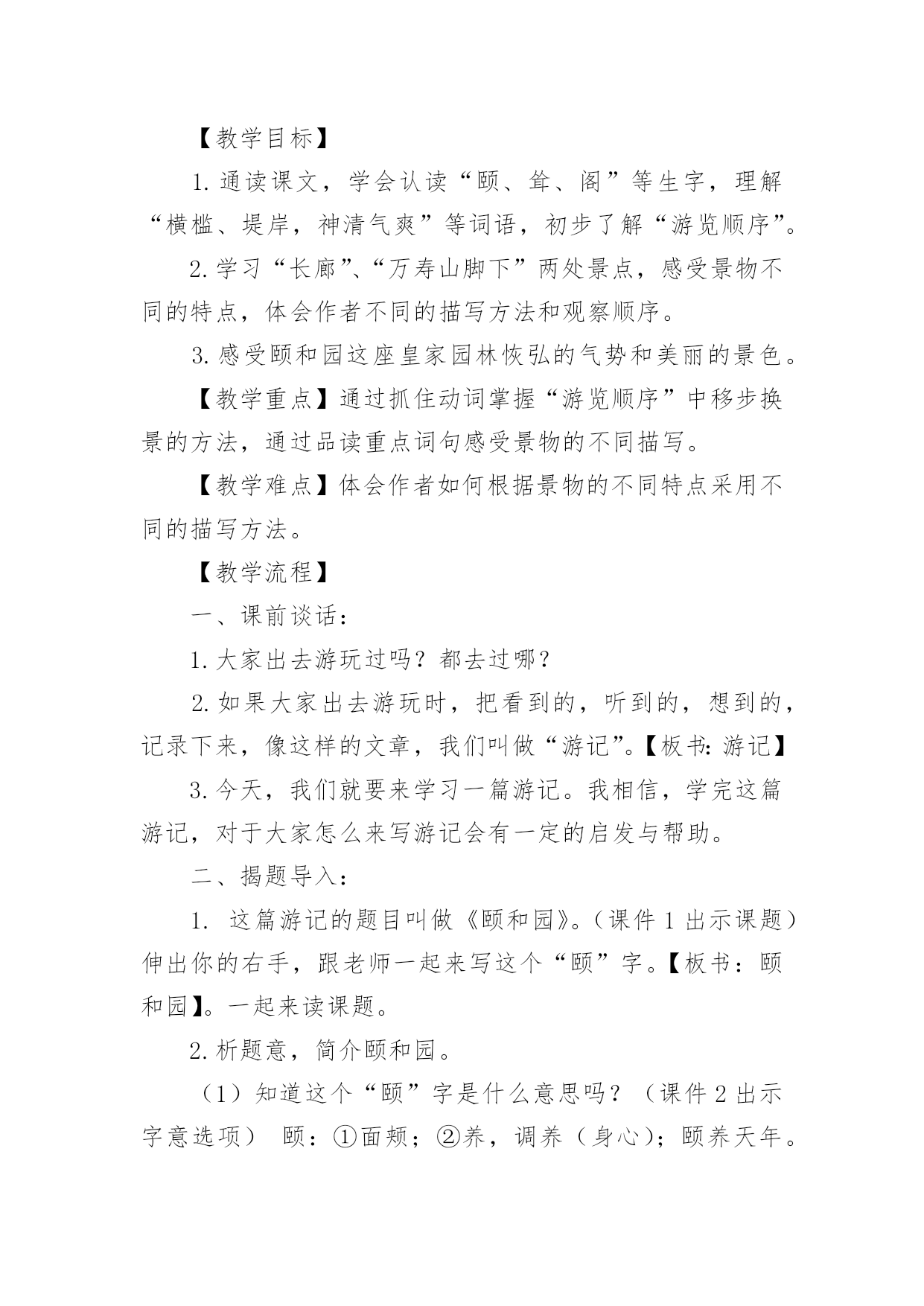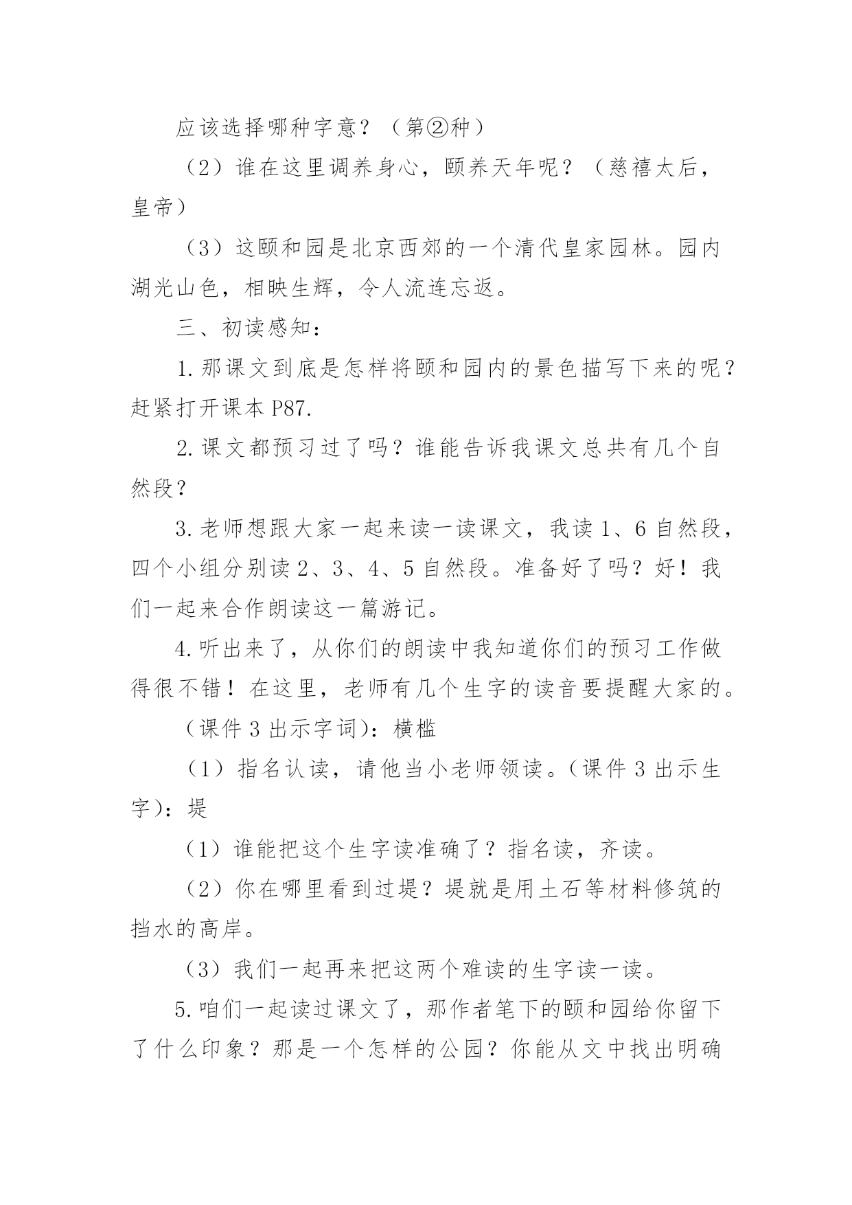 《颐和园》教学设计《颐和园》教学设计在教学工作者实际的教学活动中,常常要写一份优秀的教学设计,编写教学设计有利于我们科学、合理地支配课堂时间。我们该怎么去写教学设计呢?以下是小编帮大家整理的《颐和园》教学设计,欢迎大家借鉴与参考,希望对大家有所帮助。《颐和园》教学设计1颐和园教学设计与反思北常保小学马艳君【教学目标】1、认识7个生字,会写11个生字。正确读写“长廊、神清气爽、金碧辉煌、宫殿、葱郁、掩映、隐隐约约、堤岸、雕刻、姿态不一”等词语。2、重点学习昆明湖的片段,初步学习课文写景文章的叙述顺序及抓住特点描写景物的表达方法;了解同一景物,站在不同的观察点观察,所看到的景物特点不同的写作方法。3、有感情地朗读课文,背诵优美句段。4、了解颐和园的美丽景色,培养学生的爱美情趣,培养民族自豪感。【教学重难点】1、学习课文写景状物的叙述顺序及同一景物,站在不同的观察点观察,所看到的景物特点不同的表达方法,并学以致用。2、通过关键字词,联系生活实际,感受颐和园的美丽景色。【教学准备】颐和园风光片3分钟;课件;课堂练习纸。【教学时间】1课时。教学过程一、激情引入,导入新课师:同学们,你们知道刚才片子里播放的是哪里的风光吗?板书:颐和园师:是的,她,构思巧妙,建筑精致,有“皇家园林博物馆”之称,她就是----颐和园;她,闻名世界,享誉中外,园内的长廊还被列入“吉尼斯世界记录”,她就是---颐和园。(学生有感情读题,注意“颐”的写法。)二、初读课文,整体感知1、在人们心目中,颐和园简直就是人间天堂啊,这节课我们就一起走进颐和园,去领略皇家园林的魅力。请同学们打开课本到87页,自学要求:自由大声朗读课文,读准字音,读通课文,难读的地方反复读,并思考:这是一个怎样的颐和园?2、生读课文,教师巡视。3、反馈。(1)认读生字新词。大殿长廊堤岸雕刻画舫横槛栽满葱郁掩映金碧辉煌神清气爽隐隐约约姿态不一(2)交流:这是一个怎样的颐和园,请用一个词语来形容。(课件:这是一个的颐和园。)学生选择积累的词汇。(3)过渡:课文也有两个句子很概括地写了这是一个怎样的颐和园,请同学们快速浏览文章,找到句子划下来。(4)反馈交流。随生回答出示句子:(第一自然段和最后自然段)——齐读句子。①北京的颐和园是个美丽的大公园。②颐和园到处有美丽的景色,说也说不尽,希望你有机会去细细玩赏。(5)课文读完了,谁来说说导游带你们游览了哪几处景点呢?(学生边说教师边归纳板书:长廊、万寿山、昆明湖、十七孔桥。)(6)同学们怎么这么快就发现了呢?A自由读课文第2-5自然段,用“”画出每个自然段的第一句话。②走完长廊,就来到了万寿山脚下。①进了颐和园的大门,绕过大殿,就来到有名的长廊。④从万寿山下来,就是昆明湖。③登上万寿山,站在佛香阁的前面向下望,颐和园的景色大半收在眼底。B师:这些句子能否交换位置?为什么?思考:作者是按什么顺序叙述的?理清叙述顺序。(板书:按游览的顺序)(7)用上表示方位的词语,出示课文的主要内容,说说发现了什么?北京的颐和园是个美丽的大公园。进了颐和园的大门,绕过大殿,就来到有名的长廊。走完长廊,就来到了万寿山脚下。登上万寿山,站在佛香阁的前面向下望,颐和园的.景色大半收在眼底。从万寿山下来,就是昆明湖。颐和园到处有美丽的景色,说也说不尽,希望你有机会去细细游赏。(师生总结:“总—分—总”的结构;首尾呼应的写法;过渡句的连接。)三、品读4、5自然段,感受昆明湖的美丽1、在课文中作者用的笔墨最多,写得最详细的是关于哪一部分的内容呢?直接出示第5自然段,师说:颐和园的美无处不在,我们先来领略昆明湖的美。2、生自由读课文,思考:看看昆明湖的哪些景物最吸引你。3、预设:(1)昆明湖围着长长的堤岸,堤上有好几座式样不同的石桥,两岸栽着数不清的垂柳。(有长长的堤岸,有数不清的垂柳,这使你联想到什么诗句呢?----草长莺飞二月天,拂堤杨柳醉春烟)(2)湖中心有个小岛,远远望去,岛上一片葱绿,树丛中露出宫殿的一角。A、请同学们闭上眼睛,边听边想,此时,我们就站在昆明湖畔,范读句子,你好象看到什么?B、是啊,站在湖畔,印入我们眼帘的是满目的葱绿,这是多么美的景色啊,让我们也美美地来读读,齐读。(春湖落日水拖蓝,天影楼台上下涵)(3)这座石桥有十七个桥洞,叫十七孔桥;桥栏杆上有上百根石柱,柱子上都雕刻着小狮子。这么多的狮子,姿态不一,没有哪两只是相同的。A、生找到句子,出示并让学生说说为什么喜欢。B、给“姿态不一”找个近义词。(形态万千、千姿百态、姿态万千等)C、老师也给你们带来了几张狮子图,让我们一起来欣赏。(出示狮子图片,引导学生朗读)。D、让我们拿起手中的笔,也来写一写你想象中的姿态不一的小狮子吧!——拿出练习纸,学生动笔写句子——反馈。这么多的狮子,姿态不一,有的好像;有的,