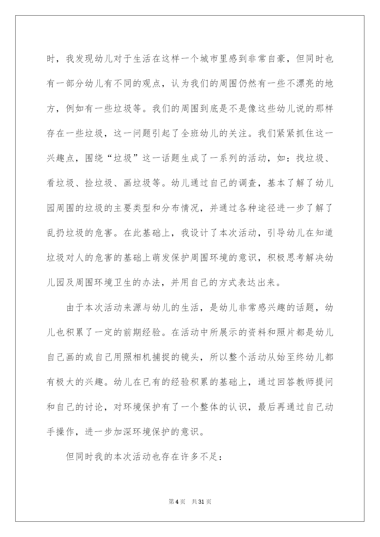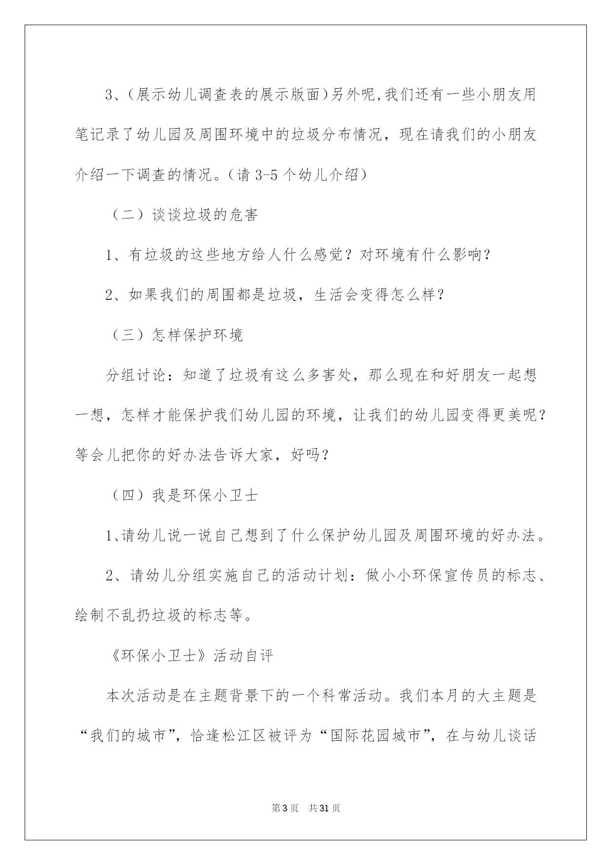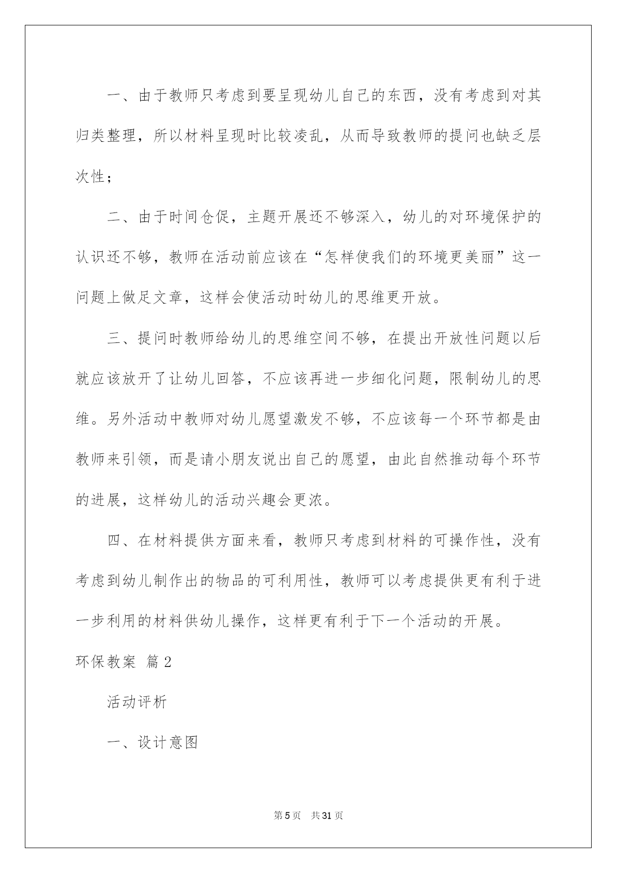 第PAGE\*Arabic\*MERGEFORMAT31页共NUMPAGES\*Arabic\*MERGEFORMAT31页第PAGE\*MERGEFORMAT31页共NUMPAGES\*MERGEFORMAT31页第PAGE\*MERGEFORMAT31页共NUMPAGES\*MERGEFORMAT31页第PAGE\*MERGEFORMAT31页共NUMPAGES\*MERGEFORMAT31页第PAGE\*MERGEFORMAT31页共NUMPAGES\*MERGEFORMAT31页第PAGE\*MERGEFORMAT31页共NUMPAGES\*MERGEFORMAT31页第PAGE\*MERGEFORMAT31页共NUMPAGES\*MERGEFORMAT31页第PAGE\*MERGEFORMAT31页共NUMPAGES\*MERGEFORMAT31页第PAGE\*MERGEFORMAT31页共NUMPAGES\*MERGEFORMAT31页第PAGE\*MERGEFORMAT31页共NUMPAGES\*MERGEFORMAT31页第PAGE\*MERGEFORMAT31页共NUMPAGES\*MERGEFORMAT31页2022实用的环保教案汇总9篇实用的环保教案汇总9篇作为一位不辞辛劳的人民教师,时常要开展教案准备工作,教案是保证教学取得成功、提高教学质量的基本条件。教案应该怎么写呢?以下是我整理的环保教案9篇,仅供参考,欢迎大家阅读。环保教案篇1设计意图:最近我们开展了《我们的城市》的大主题,恰逢松江区被评为“国际花园城市”,在与幼儿谈话时,我发现幼儿对于生活在这样一个城市里感到非常自豪,但同时也有一部分幼儿认为我们的周围仍然有一些不漂亮的地方,例如有一些垃圾等。所以我就围绕“垃圾”这一话题生成了一系列的活动,幼儿通过自己的调查,发现了幼儿园周围的垃圾的主要类型和分布情况,并通过各种途径进一步了解了乱扔垃圾的危害。在此基础上,我设计了本次活动,引导幼儿在知道垃圾对人的危害的基础上萌发保护周围环境的意识,积极思考解决幼儿园及周围环境卫生的办法,并用自己的方法表达出来。萌发幼儿保护周围环境的意识是本次活动的重点,运用集体活动和分散活动相结合的形式,采用情景法、提问法、探究法、操作法进行突破。活动的难点是启发幼儿积极思考解决幼儿园及周围环境卫生的办法,并用自己的方式表达出来。一、活动目标1、了解垃圾的危害,萌发幼儿保护周围环境的意识。2、启发幼儿积极思考解决幼儿园及周围环境卫生的办法,并用自己的方法表达出来。大班科学活动教案《环保小卫士》二、活动准备1、课前请幼儿调查并记录周围环境垃圾分布的情况。2、幼儿自己拍摄的照片。3、彩色纸、笔、吸管等。三、活动过程(一)组织幼儿交流调查周围环境的情况1、我们的幼儿园美不美?(放映幼儿园美丽的环境的镜头)2、但是呢,我们小朋友也发现了幼儿园有不美的地方(放映幼儿自己用相机捕捉的幼儿园及周围环境中的垃圾的镜头)3、(展示幼儿调查表的展示版面)另外呢,我们还有一些小朋友用笔记录了幼儿园及周围环境中的垃圾分布情况,现在请我们的小朋友介绍一下调查的情况。(请3-5个幼儿介绍)(二)谈谈垃圾的危害1、有垃圾的这些地方给人什么感觉?对环境有什么影响?2、如果我们的周围都是垃圾,生活会变得怎么样?(三)怎样保护环境分组讨论:知道了垃圾有这么多害处,那么现在和好朋友一起想一想,怎样才能保护我们幼儿园的环境,让我们的幼儿园变得更美呢?等会儿把你的好办法告诉大家,好吗?(四)我是环保小卫士1、请幼儿说一说自己想到了什么保护幼儿园及周围环境的好办法。2、请幼儿分组实施自己的活动计划:做小小环保宣传员的标志、绘制不乱扔垃圾的标志等。《环保小卫士》活动自评本次活动是在主题背景下的一个科常活动。我们本月的大主题是“我们的城市”,恰逢松江区被评为“国际花园城市”,在与幼儿谈话时,我发现幼儿对于生活在这样一个城市里感到非常自豪,但同时也有一部分幼儿有不同的观点,认为我们的周围仍然有一些不漂亮的地方,例如有一些垃圾等。我们的周围到底是不是像这些幼儿说的那样存在一些垃圾,这一问题引起了全班幼儿的关注。我们紧紧抓住这一兴趣点,围绕“垃圾”这一话题生成了一系列的活动,如:找垃圾、看垃圾、捡垃圾、画垃圾等。幼儿通过自己的调查,基本了解了幼儿园周围的垃圾的主要类型和分布情况,并通过各种途径进一步了解了乱扔垃圾的危害。在此基础上,我设计了本次活动,引导幼儿在知道垃圾对人的危害的基础上萌发保护周围环境的意识,积极思考解决幼儿园及周围环境卫生的办法,并用自己的方式表达出来。由