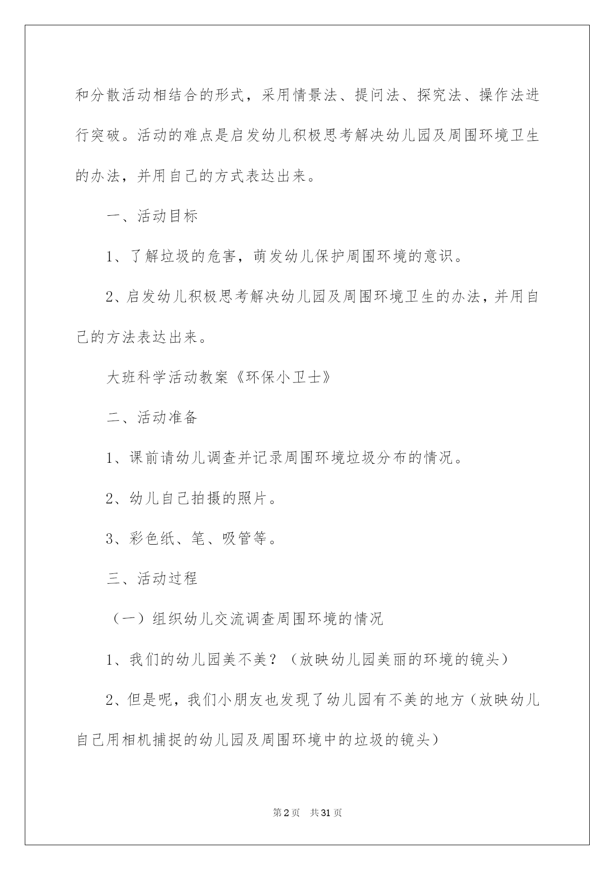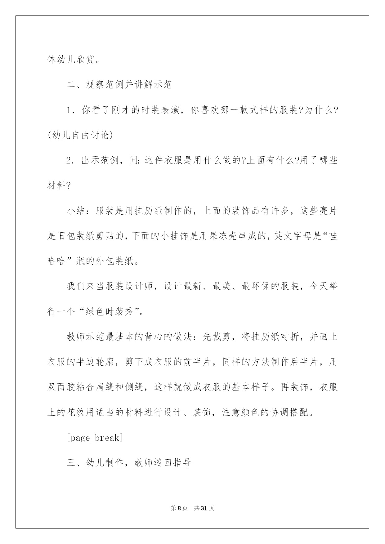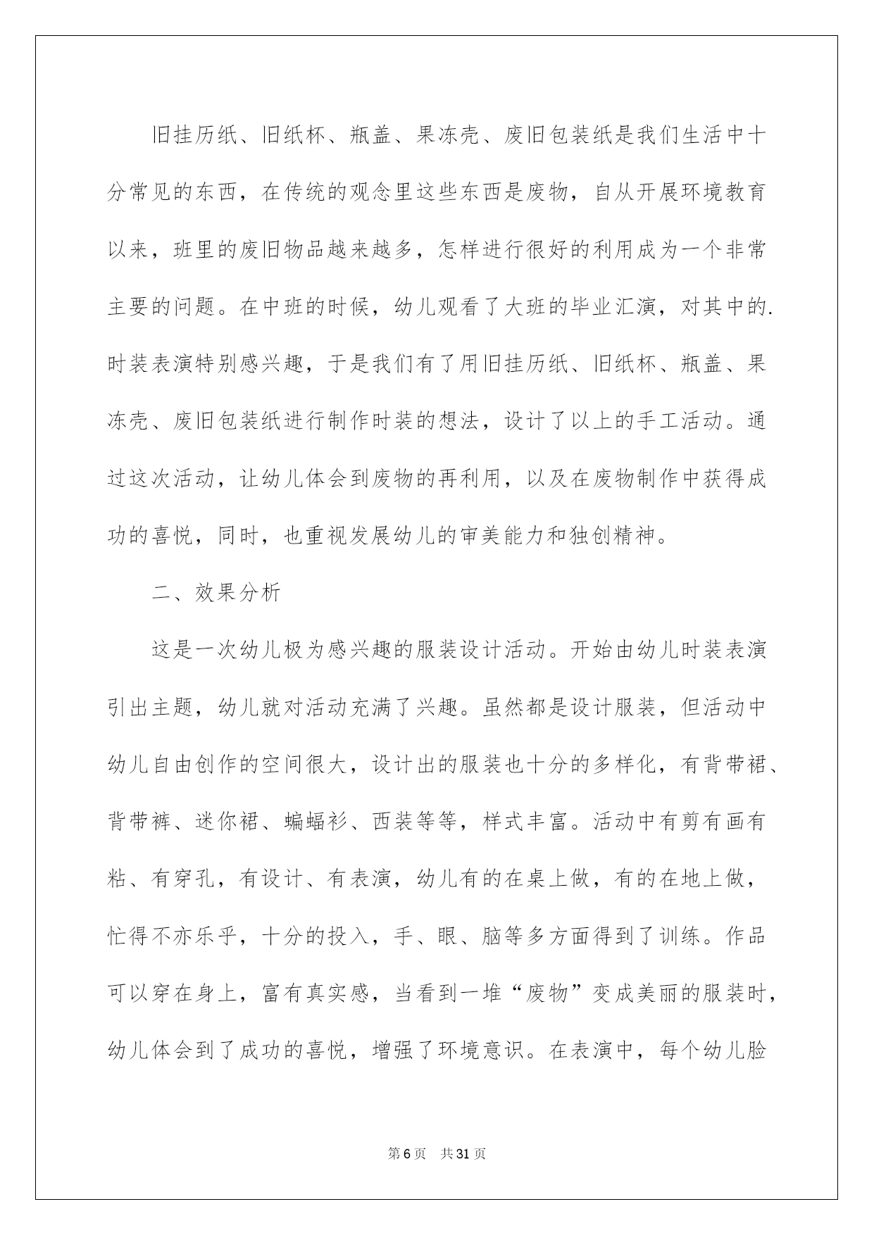 第PAGE\*Arabic\*MERGEFORMAT31页共NUMPAGES\*Arabic\*MERGEFORMAT31页第PAGE\*MERGEFORMAT31页共NUMPAGES\*MERGEFORMAT31页第PAGE\*MERGEFORMAT31页共NUMPAGES\*MERGEFORMAT31页第PAGE\*MERGEFORMAT31页共NUMPAGES\*MERGEFORMAT31页第PAGE\*MERGEFORMAT31页共NUMPAGES\*MERGEFORMAT31页第PAGE\*MERGEFORMAT31页共NUMPAGES\*MERGEFORMAT31页第PAGE\*MERGEFORMAT31页共NUMPAGES\*MERGEFORMAT31页第PAGE\*MERGEFORMAT31页共NUMPAGES\*MERGEFORMAT31页第PAGE\*MERGEFORMAT31页共NUMPAGES\*MERGEFORMAT31页第PAGE\*MERGEFORMAT31页共NUMPAGES\*MERGEFORMAT31页第PAGE\*MERGEFORMAT31页共NUMPAGES\*MERGEFORMAT31页2022实用的环保教案汇总9篇实用的环保教案汇总9篇作为一位不辞辛劳的人民教师,时常要开展教案准备工作,教案是保证教学取得成功、提高教学质量的基本条件。教案应该怎么写呢?以下是我整理的环保教案9篇,仅供参考,欢迎大家阅读。环保教案篇1设计意图:最近我们开展了《我们的城市》的大主题,恰逢松江区被评为“国际花园城市”,在与幼儿谈话时,我发现幼儿对于生活在这样一个城市里感到非常自豪,但同时也有一部分幼儿认为我们的周围仍然有一些不漂亮的地方,例如有一些垃圾等。所以我就围绕“垃圾”这一话题生成了一系列的活动,幼儿通过自己的调查,发现了幼儿园周围的垃圾的主要类型和分布情况,并通过各种途径进一步了解了乱扔垃圾的危害。在此基础上,我设计了本次活动,引导幼儿在知道垃圾对人的危害的基础上萌发保护周围环境的意识,积极思考解决幼儿园及周围环境卫生的办法,并用自己的方法表达出来。萌发幼儿保护周围环境的意识是本次活动的重点,运用集体活动和分散活动相结合的形式,采用情景法、提问法、探究法、操作法进行突破。活动的难点是启发幼儿积极思考解决幼儿园及周围环境卫生的办法,并用自己的方式表达出来。一、活动目标1、了解垃圾的危害,萌发幼儿保护周围环境的意识。2、启发幼儿积极思考解决幼儿园及周围环境卫生的办法,并用自己的方法表达出来。大班科学活动教案《环保小卫士》二、活动准备1、课前请幼儿调查并记录周围环境垃圾分布的情况。2、幼儿自己拍摄的照片。3、彩色纸、笔、吸管等。三、活动过程(一)组织幼儿交流调查周围环境的情况1、我们的幼儿园美不美?(放映幼儿园美丽的环境的镜头)2、但是呢,我们小朋友也发现了幼儿园有不美的地方(放映幼儿自己用相机捕捉的幼儿园及周围环境中的垃圾的镜头)3、(展示幼儿调查表的展示版面)另外呢,我们还有一些小朋友用笔记录了幼儿园及周围环境中的垃圾分布情况,现在请我们的小朋友介绍一下调查的情况。(请3-5个幼儿介绍)(二)谈谈垃圾的危害1、有垃圾的这些地方给人什么感觉?对环境有什么影响?2、如果我们的周围都是垃圾,生活会变得怎么样?(三)怎样保护环境分组讨论:知道了垃圾有这么多害处,那么现在和好朋友一起想一想,怎样才能保护我们幼儿园的环境,让我们的幼儿园变得更美呢?等会儿把你的好办法告诉大家,好吗?(四)我是环保小卫士1、请幼儿说一说自己想到了什么保护幼儿园及周围环境的好办法。2、请幼儿分组实施自己的活动计划:做小小环保宣传员的标志、绘制不乱扔垃圾的标志等。《环保小卫士》活动自评本次活动是在主题背景下的一个科常活动。我们本月的大主题是“我们的城市”,恰逢松江区被评为“国际花园城市”,在与幼儿谈话时,我发现幼儿对于生活在这样一个城市里感到非常自豪,但同时也有一部分幼儿有不同的观点,认为我们的周围仍然有一些不漂亮的地方,例如有一些垃圾等。我们的周围到底是不是像这些幼儿说的那样存在一些垃圾,这一问题引起了全班幼儿的关注。我们紧紧抓住这一兴趣点,围绕“垃圾”这一话题生成了一系列的活动,如:找垃圾、看垃圾、捡垃圾、画垃圾等。幼儿通过自己的调查,基本了解了幼儿园周围的垃圾的主要类型和分布情况,并通过各种途径进一步了解了乱扔垃圾的危害。在此基础上,我设计了本次活动,引导幼儿在知道垃圾对人的危害的基础上萌发保护周围环境的意识,积极思考解决幼儿园及周围环境卫生的办法,并用自己的方式表达出来。由