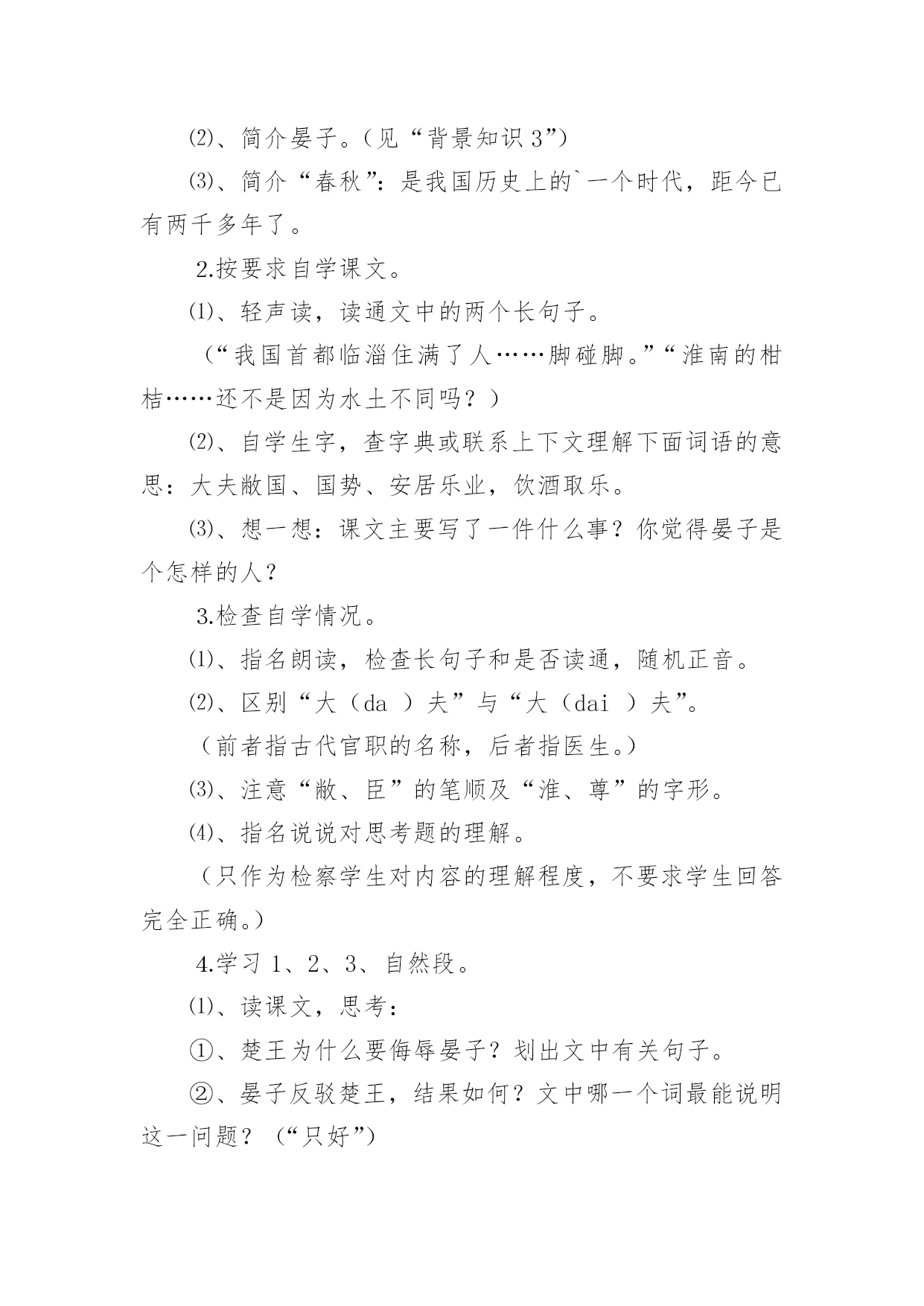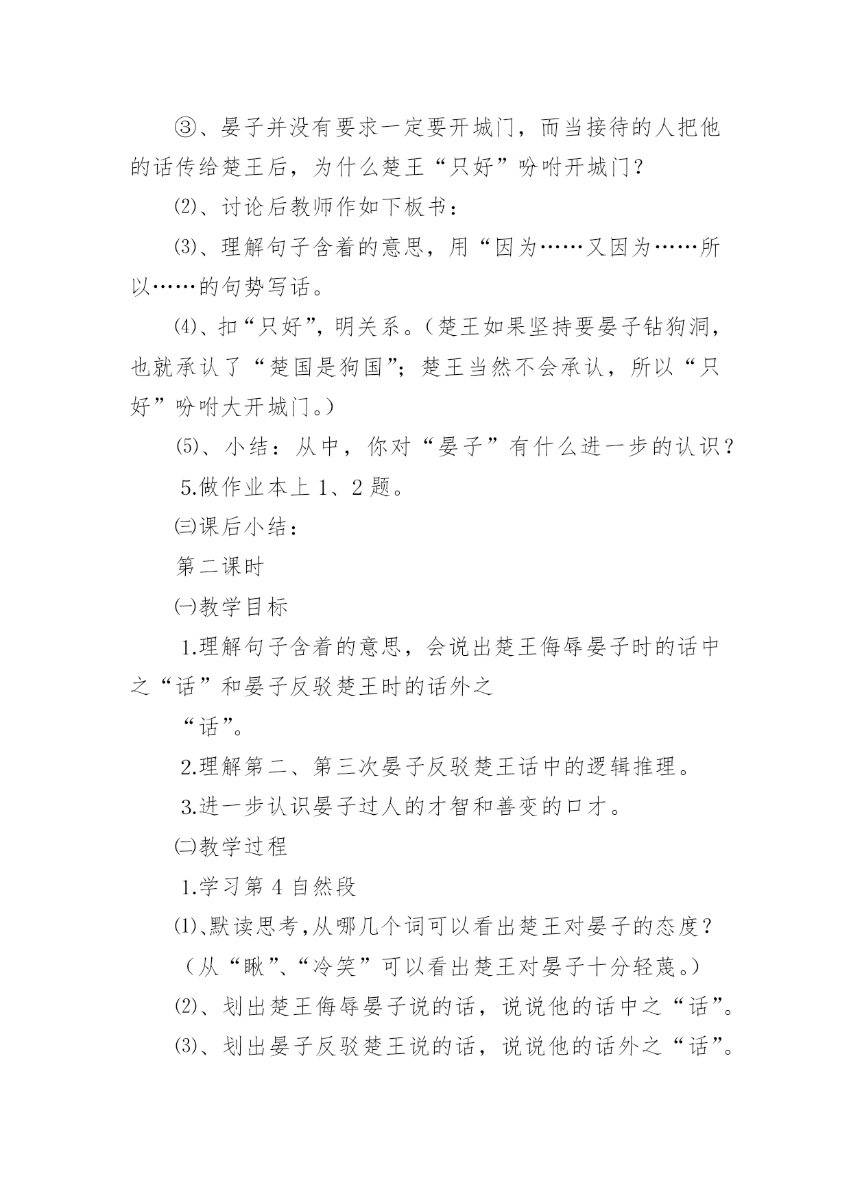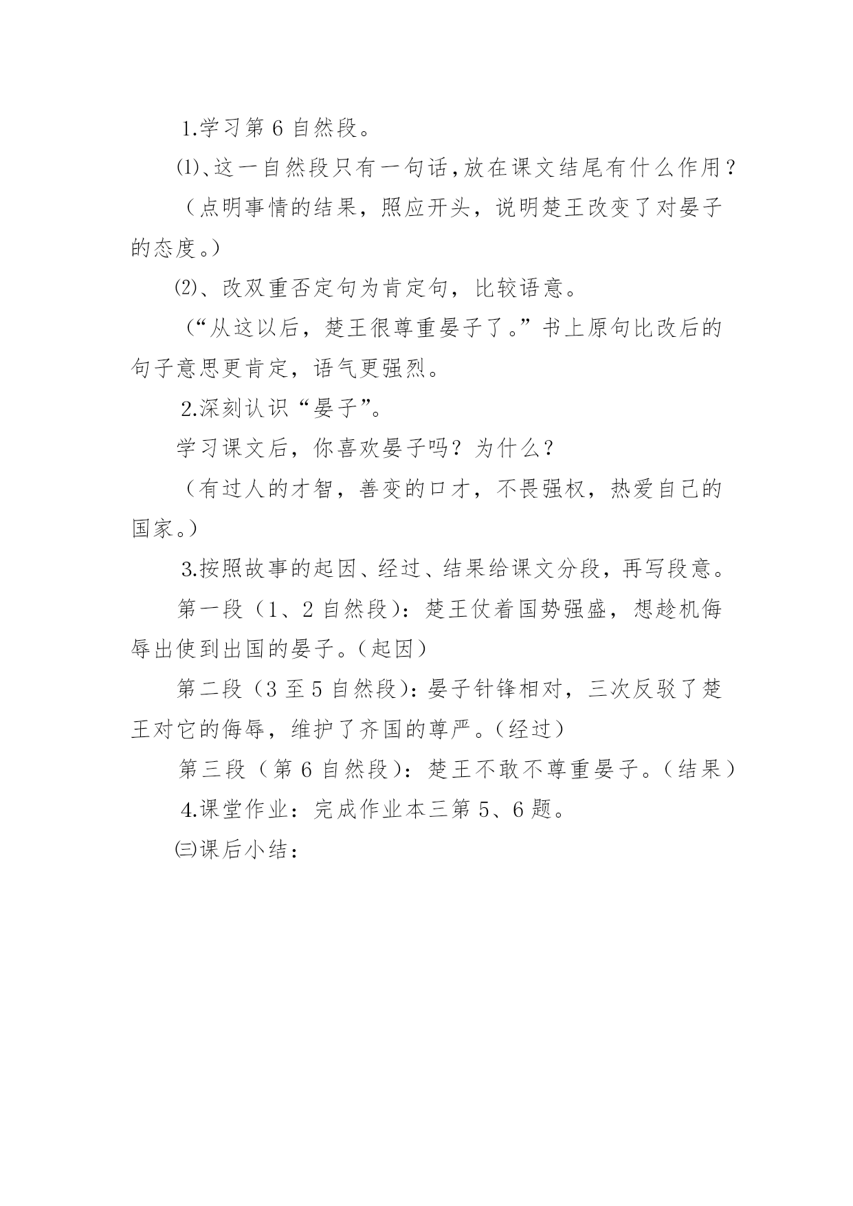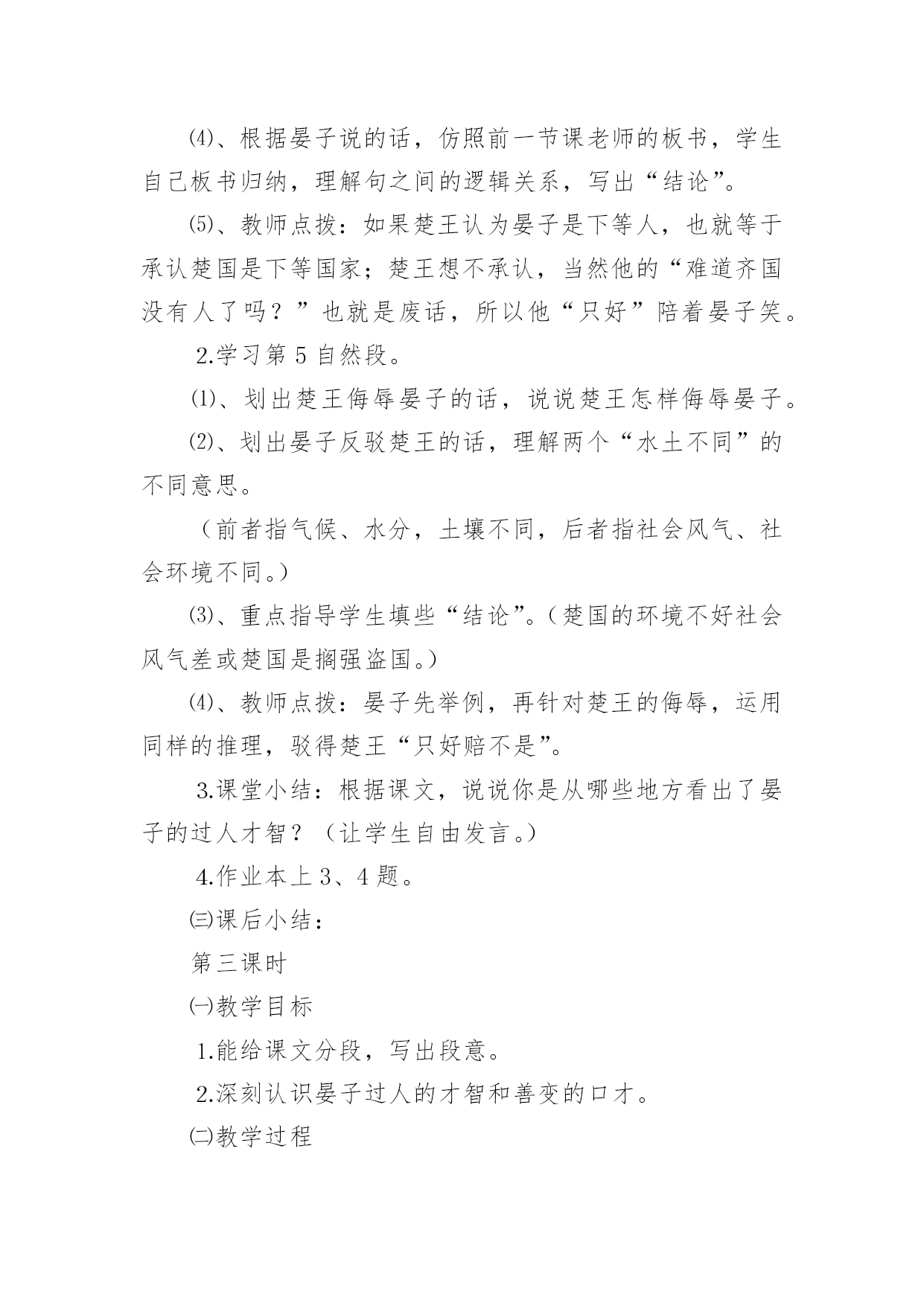 《晏子使楚》的教学设计一、教学目标1、学会读懂句子含着的意思。2、学会本课10个生字,理解17个词语的意思。3、能给课文分段,写出段落大意。4、了解晏子出使楚国,以超人的智慧和善辩的口才,驳倒楚王的三次侮辱,维护了齐国的尊严。二、教学重点理解句子含着的意思三、教学难点理解晏子反驳楚王的话,逻辑关系严密。四、教学准备电教媒体、挂图、小黑板。五、教学时间:3课时第一课时㈠教学目标⒈学会生字,理解词语的意思。⒉读通全文,了解课文的主要内容,初步感受晏子的聪明才智和善变的口才。⒊理解晏子第一次反驳楚王的话,逻辑关系严密。㈡教学过程⒈揭题解题。⑴、使:出使。⑵、简介晏子。(见“背景知识3”)⑶、简介“春秋”:是我国历史上的`一个时代,距今已有两千多年了。⒉按要求自学课文。⑴、轻声读,读通文中的两个长句子。(“我国首都临淄住满了人……脚碰脚。”“淮南的柑桔……还不是因为水土不同吗?)⑵、自学生字,查字典或联系上下文理解下面词语的意思:大夫敝国、国势、安居乐业,饮酒取乐。⑶、想一想:课文主要写了一件什么事?你觉得晏子是个怎样的人?⒊检查自学情况。⑴、指名朗读,检查长句子和是否读通,随机正音。⑵、区别“大(da)夫”与“大(dai)夫”。(前者指古代官职的名称,后者指医生。)⑶、注意“敝、臣”的笔顺及“淮、尊”的字形。⑷、指名说说对思考题的理解。(只作为检察学生对内容的理解程度,不要求学生回答完全正确。)⒋学习1、2、3、自然段。⑴、读课文,思考:①、楚王为什么要侮辱晏子?划出文中有关句子。②、晏子反驳楚王,结果如何?文中哪一个词最能说明这一问题?(“只好”)③、晏子并没有要求一定要开城门,而当接待的人把他的话传给楚王后,为什么楚王“只好”吩咐开城门?⑵、讨论后教师作如下板书:⑶、理解句子含着的意思,用“因为……又因为……所以……的句势写话。⑷、扣“只好”,明关系。(楚王如果坚持要晏子钻狗洞,也就承认了“楚国是狗国”;楚王当然不会承认,所以“只好”吩咐大开城门。)⑸、小结:从中,你对“晏子”有什么进一步的认识?⒌做作业本上1、2题。㈢课后小结:第二课时㈠教学目标⒈理解句子含着的意思,会说出楚王侮辱晏子时的话中之“话”和晏子反驳楚王时的话外之“话”。⒉理解第二、第三次晏子反驳楚王话中的逻辑推理。⒊进一步认识晏子过人的才智和善变的口才。㈡教学过程⒈学习第4自然段⑴、默读思考,从哪几个词可以看出楚王对晏子的态度?(从“瞅”、“冷笑”可以看出楚王对晏子十分轻蔑。)⑵、划出楚王侮辱晏子说的话,说说他的话中之“话”。⑶、划出晏子反驳楚王说的话,说说他的话外之“话”。⑷、根据晏子说的话,仿照前一节课老师的板书,学生自己板书归纳,理解句之间的逻辑关系,写出“结论”。⑸、教师点拨:如果楚王认为晏子是下等人,也就等于承认楚国是下等国家;楚王想不承认,当然他的“难道齐国没有人了吗?”也就是废话,所以他“只好”陪着晏子笑。⒉学习第5自然段。⑴、划出楚王侮辱晏子的话,说说楚王怎样侮辱晏子。⑵、划出晏子反驳楚王的话,理解两个“水土不同”的不同意思。(前者指气候、水分,土壤不同,后者指社会风气、社会环境不同。)⑶、重点指导学生填些“结论”。(楚国的环境不好社会风气差或楚国是搁强盗国。)⑷、教师点拨:晏子先举例,再针对楚王的侮辱,运用同样的推理,驳得楚王“只好赔不是”。⒊课堂小结:根据课文,说说你是从哪些地方看出了晏子的过人才智?(让学生自由发言。)⒋作业本上3、4题。㈢课后小结:第三课时㈠教学目标⒈能给课文分段,写出段意。⒉深刻认识晏子过人的才智和善变的口才。㈡教学过程⒈学习第6自然段。⑴、这一自然段只有一句话,放在课文结尾有什么作用?(点明事情的结果,照应开头,说明楚王改变了对晏子的态度。)⑵、改双重否定句为肯定句,比较语意。(“从这以后,楚王很尊重晏子了。”书上原句比改后的句子意思更肯定,语气更强烈。⒉深刻认识“晏子”。学习课文后,你喜欢晏子吗?为什么?(有过人的才智,善变的口才,不畏强权,热爱自己的国家。)⒊按照故事的起因、经过、结果给课文分段,再写段意。第一段(1、2自然段):楚王仗着国势强盛,想趁机侮辱出使到出国的晏子。(起因)第二段(3至5自然段):晏子针锋相对,三次反驳了楚王对它的侮辱,维护了齐国的尊严。(经过)第三段(第6自然段):楚王不敢不尊重晏子。(结果)⒋课堂作业:完成作业本三第5、6题。㈢课后小结: