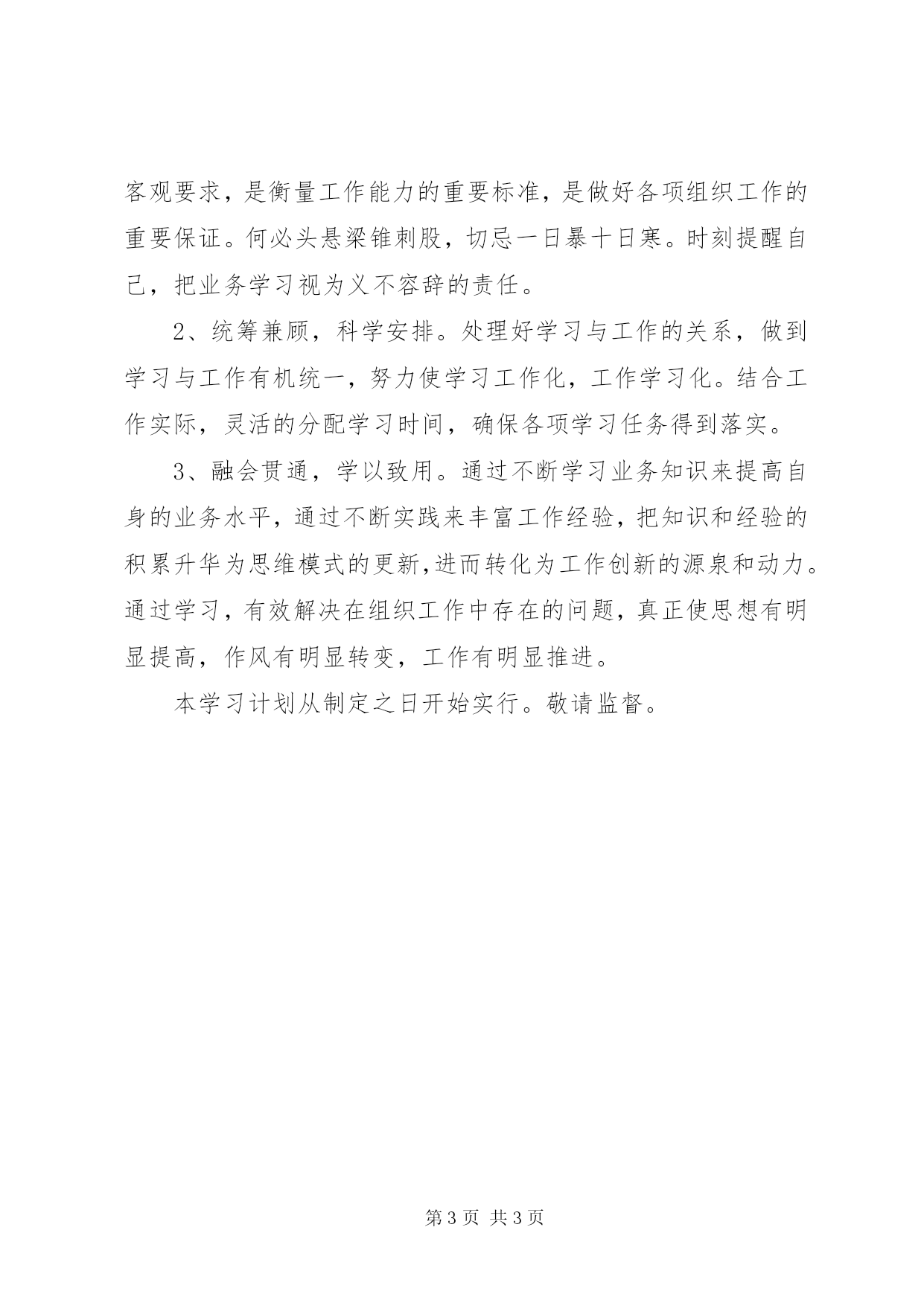 第PAGE\*Arabic\*MERGEFORMAT3页共NUMPAGES\*MERGEFORMAT3页公务员干部个人学习计划为了响应党中央建设“学习型政府”的要求,也为了不断完善自我,适应当前工作的需要,更新自己的知识层次和政治理论水平,与时俱进,努力提高自己的综合素质,做一名学习型的组工干部,特制订学习计划如下:一、学习目标提高自身政治理论水平,增强政治敏锐性;加强组工业务知识的学习,提高工作能力和效率,在写作上更进一步。二、学习时间1、周一至周五,上班时在不影响业务工作的情况下,利用一切可利用的时间学习。每天晚上7:00—8:00,学习1个小时。2、周六、周日,学习5个小时。4、每星期利用网络资源,上网学习个2小时。5、每天用半个小时阅读当天报纸、杂志,了解国内外的重大新闻、政策形势,提高自己的政策理论水平。三、学习任务1、政治理论。通过观看新闻联播,阅读黄冈日报、xx日报、中国青年报、党员生活等报刊杂志,学习马列主义、毛泽东思想、邓小平理论和“三个代表”重要思想及其一系列重要论述,和这些理论在各地方的实际应用,深刻领会其精神实质,用先进的理论指导自己的工作实践。“好记性不如烂笔头”,坚持边看边想,边想边写。每月完成读书笔记字数不少于5000字。2、业务知识。充分利用组织部的资源,学习、、、、、、、等法律法规,努力提高工作水平、工作能力和法律意识。学习公文写作、口才等方面的知识,结合工作中遇到的实际情况,多听、多看、多写以提高公文写作的水平。3、计算机知识。学习和掌握信息技术、电子政务等履行岗位职责必备的最新知识和技能,熟练掌握计算机文字处理技术和基本的网络技术。4、每周在新华网社区、强国论坛、东湖社区上关注热点时政,在网友的评论中汲取精华,学习对组织工作有用的方法、措施,有选择的借鉴新颖的思想开阔自己的思路。同时,每周完成硬性指标:3篇以上组织工作方面的评论,字数不少于200字。5、要求每2个星期完成一篇组工方面的文章,交给程科长批阅。6、在个人博客里记载完成的实事,写心得体会,周末完成1篇工作思想小结。四、学习要求1、端正思想,提高认识。加强业务学习是提高干部综合素质的迫切需要。组工干部必须做学习型的干部,这是时代发展的客观要求,是衡量工作能力的重要标准,是做好各项组织工作的重要保证。何必头悬梁锥刺股,切忌一日暴十日寒。时刻提醒自己,把业务学习视为义不容辞的责任。2、统筹兼顾,科学安排。处理好学习与工作的关系,做到学习与工作有机统一,努力使学习工作化,工作学习化。结合工作实际,灵活的分配学习时间,确保各项学习任务得到落实。3、融会贯通,学以致用。通过不断学习业务知识来提高自身的业务水平,通过不断实践来丰富工作经验,把知识和经验的积累升华为思维模式的更新,进而转化为工作创新的源泉和动力。通过学习,有效解决在组织工作中存在的问题,真正使思想有明显提高,作风有明显转变,工作有明显推进。本学习计划从制定之日开始实行。敬请监督。