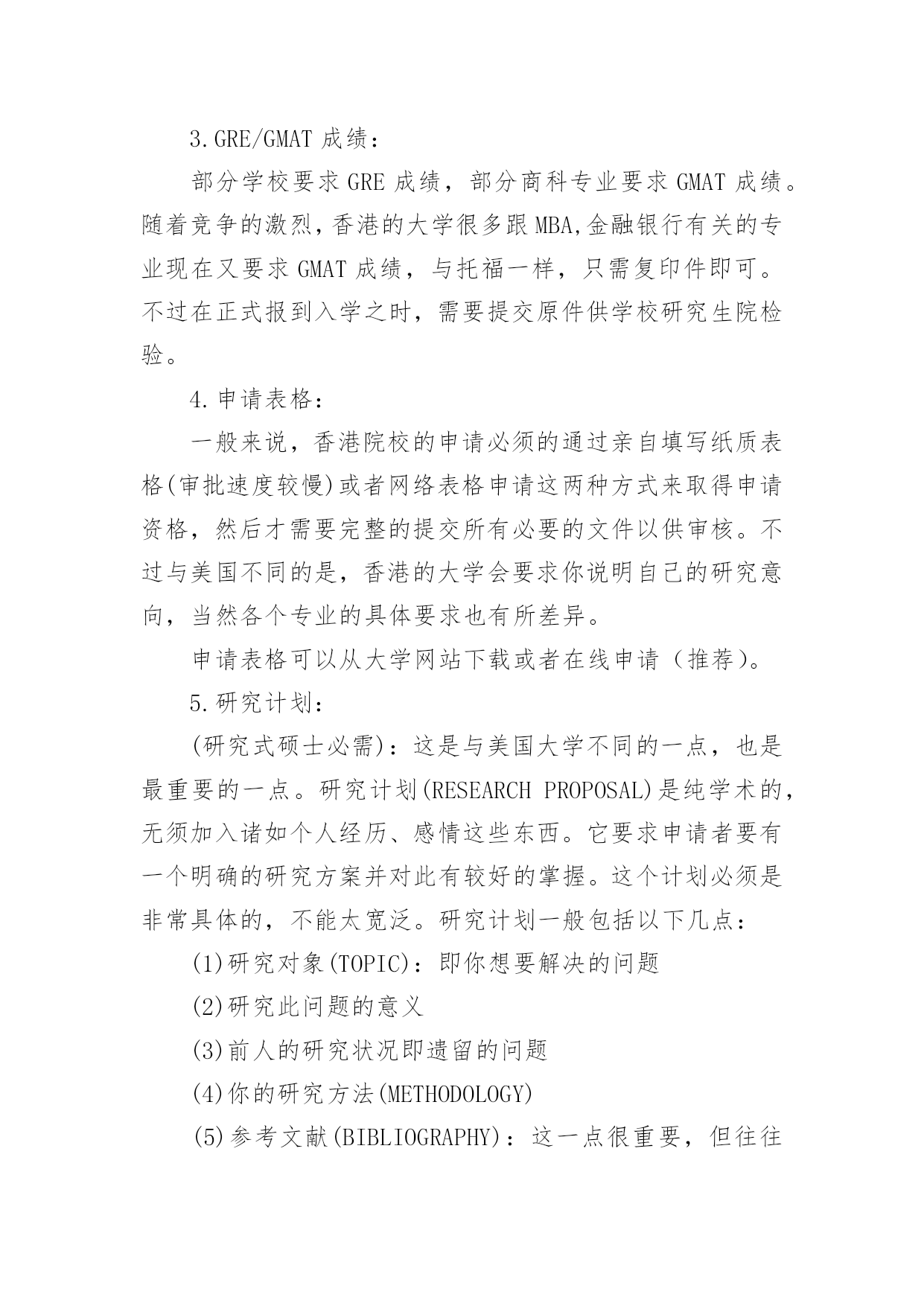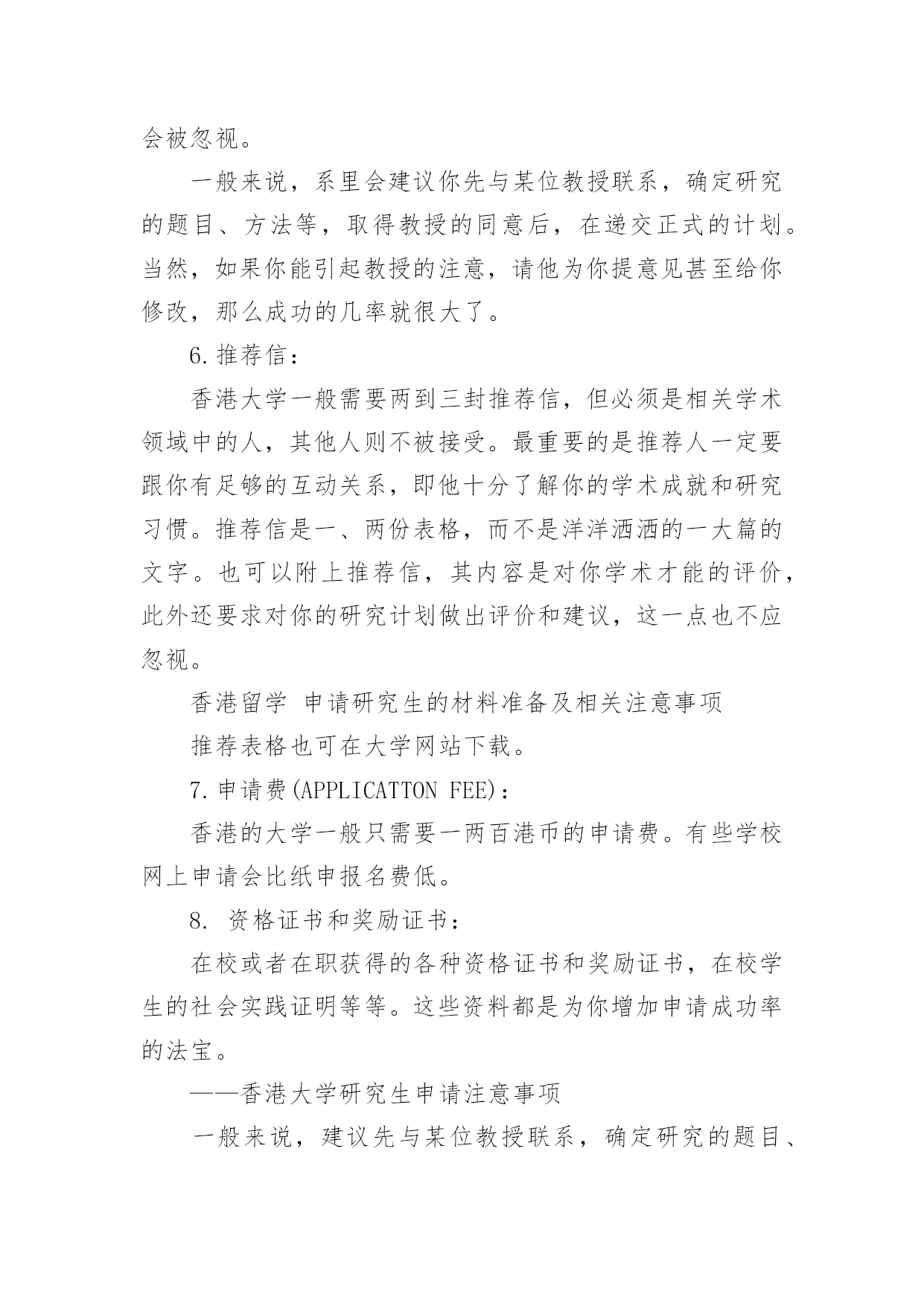 香港留学申请研究生的材料准备及注意事项香港留学申请研究生的材料准备及注意事项申请香港的大学与申请美国大学的程序大致差不多,但也有不同之处。下面介绍一下香港大学研究生申请所需的材料。首先,申请香港的研究生可以到网上去查询一下各大学的情况,如系科分配、奖学金多少等,确定目标之后便开始正式申请。香港大学的研究生申请一般需要以下材料:申请香港大学研究生的申请人一般需要以下材料:1.本科成绩单:中英文的各一份,并须经过学校公证(盖教务处公章于学校信封封口处)。2.英文水平证明:一般应具有托福成绩(TOEFL,旧制最低要求会在550分以上,新制80左右)。与美国不同的是,香港的大学并不要求一定要ETS寄送成绩,而是只要原件的复印件即可。现在许多香港大学已经开始认可和接受雅思成绩(IELTS,基本要求为6.5分)或大陆的大学英语六级证书(新制CET6一般得490分以上)。一个好的英文成绩是入读香港高校的敲门砖,但是决定申请成败的还是学生的个人综合素质(这体现在学术成就,思想品德,社会实践,获得的奖励等方面)及申请材料的准备是否充分,以上的各种能力都需要有针对性的,技巧性地体现在个人陈述,入学计划,研究报告等申请文件中。3.GRE/GMAT成绩:部分学校要求GRE成绩,部分商科专业要求GMAT成绩。随着竞争的激烈,香港的大学很多跟MBA,金融银行有关的专业现在又要求GMAT成绩,与托福一样,只需复印件即可。不过在正式报到入学之时,需要提交原件供学校研究生院检验。4.申请表格:一般来说,香港院校的申请必须的通过亲自填写纸质表格(审批速度较慢)或者网络表格申请这两种方式来取得申请资格,然后才需要完整的提交所有必要的文件以供审核。不过与美国不同的是,香港的大学会要求你说明自己的研究意向,当然各个专业的具体要求也有所差异。申请表格可以从大学网站下载或者在线申请(推荐)。5.研究计划:(研究式硕士必需):这是与美国大学不同的一点,也是最重要的一点。研究计划(RESEARCHPROPOSAL)是纯学术的,无须加入诸如个人经历、感情这些东西。它要求申请者要有一个明确的研究方案并对此有较好的掌握。这个计划必须是非常具体的,不能太宽泛。研究计划一般包括以下几点:(1)研究对象(TOPIC):即你想要解决的问题(2)研究此问题的意义(3)前人的研究状况即遗留的问题(4)你的研究方法(METHODOLOGY)(5)参考文献(BIBLIOGRAPHY):这一点很重要,但往往会被忽视。一般来说,系里会建议你先与某位教授联系,确定研究的题目、方法等,取得教授的同意后,在递交正式的计划。当然,如果你能引起教授的注意,请他为你提意见甚至给你修改,那么成功的几率就很大了。6.推荐信:香港大学一般需要两到三封推荐信,但必须是相关学术领域中的人,其他人则不被接受。最重要的是推荐人一定要跟你有足够的互动关系,即他十分了解你的学术成就和研究习惯。推荐信是一、两份表格,而不是洋洋洒洒的一大篇的文字。也可以附上推荐信,其内容是对你学术才能的评价,此外还要求对你的研究计划做出评价和建议,这一点也不应忽视。香港留学申请研究生的材料准备及相关注意事项推荐表格也可在大学网站下载。7.申请费(APPLICATTONFEE):香港的大学一般只需要一两百港币的申请费。有些学校网上申请会比纸申报名费低。8.资格证书和奖励证书:在校或者在职获得的各种资格证书和奖励证书,在校学生的社会实践证明等等。这些资料都是为你增加申请成功率的法宝。——香港大学研究生申请注意事项一般来说,建议先与某位教授联系,确定研究的题目、方法等,取得教授的同意后,在递交正式的计划。当然,如果你能引起教授的注意,请他为你提意见甚至给你修改,那么成功的几率就很大了。