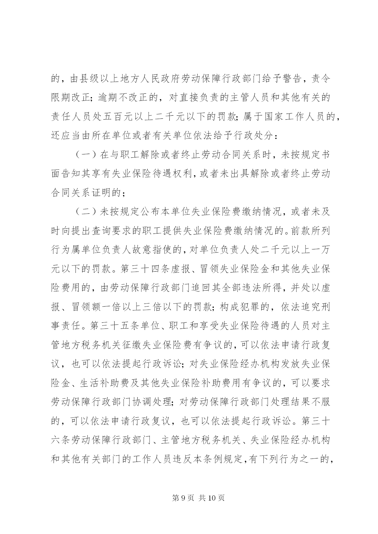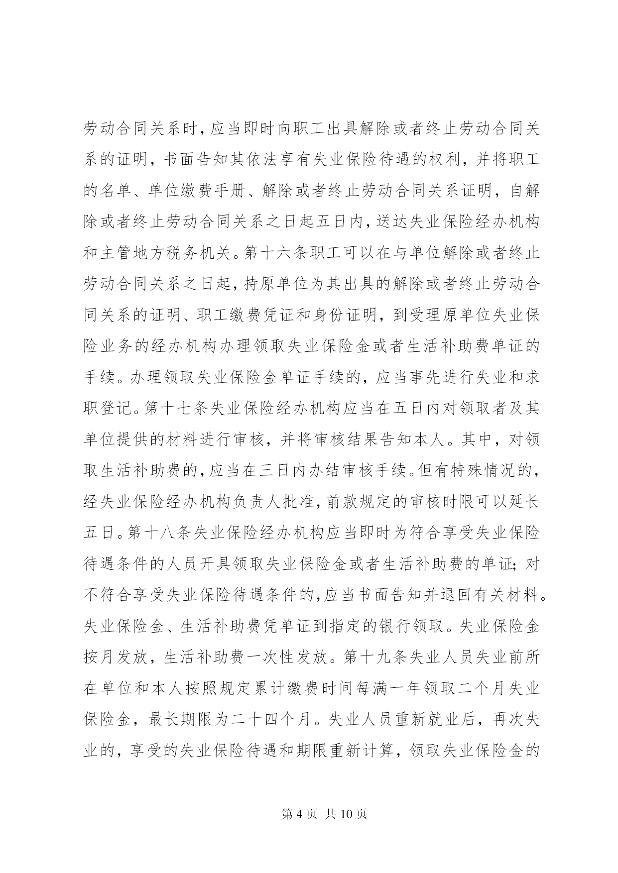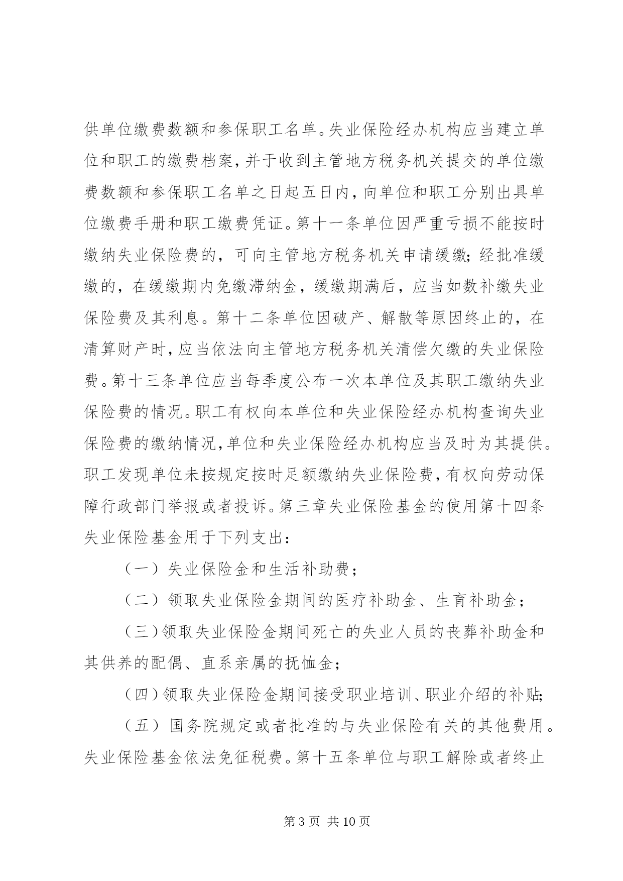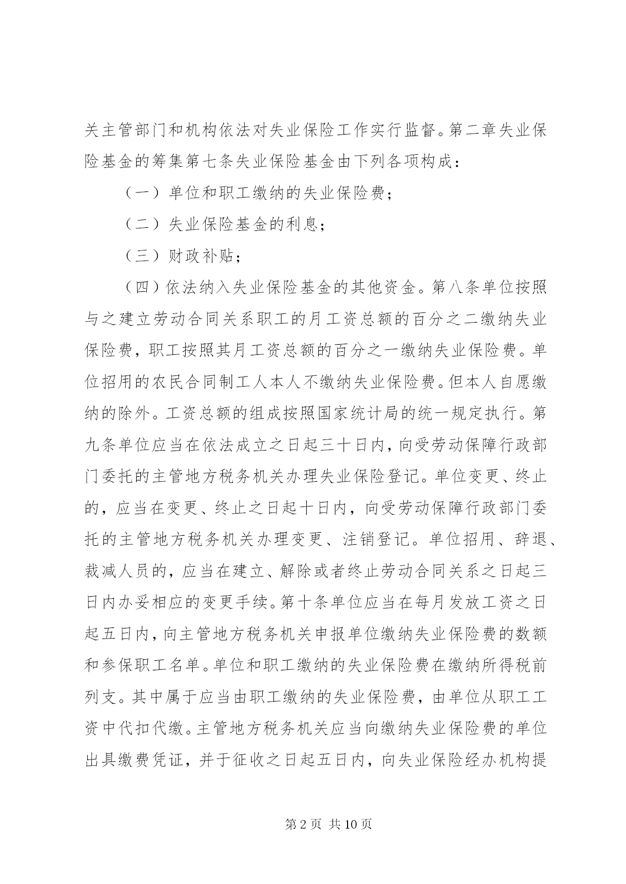 第PAGE\*Arabic\*MERGEFORMAT10页共NUMPAGES\*MERGEFORMAT10页企业失业保险条例第一章总则第一条为了保障劳动者失业期间的基本生活,促进再就业,根据《中华人民共和国劳动法》和国务院《失业保险条例》等有关法律、法规,结合本省实际,制定本条例。第二条本省行政区域内依法成立的各类企业、事业单位、社会团体、民办非企业单位、有雇工的个体工商户(以下统称单位)及与之建立劳动合同关系的劳动者(以下统称职工),应当按照本条例参加失业保险。第三条具备下列条件的失业人员,可以领取失业保险金:(一)按照规定参加失业保险,所在单位和本人已按照规定履行缴费义务满一年的;(二)非因本人意愿中断就业的;(三)已办理失业登记,并有求职要求的。失业人员在领取失业保险金期间,按照规定同时享受其他失业保险待遇。第四条失业保险基金,按照国家、单位、职工合理负担的原则,实行社会统筹。失业保险费由各级地方税务机关按照属地管理原则负责征收。第五条县级以上地方人民政府应当加快失业保险工作的信息化建设,建立失业保险基础数据库,做到信息互通、操作简便、管理规范。第六条县级以上地方人民政府劳动保障行政部门主管本行政区域内的失业保险工作。失业保险经办机构具体承办失业保险业务,其经费列入同级财政预算。县级以上地方人民政府有关主管部门和机构依法对失业保险工作实行监督。第二章失业保险基金的筹集第七条失业保险基金由下列各项构成:(一)单位和职工缴纳的失业保险费;(二)失业保险基金的利息;(三)财政补贴;(四)依法纳入失业保险基金的其他资金。第八条单位按照与之建立劳动合同关系职工的月工资总额的百分之二缴纳失业保险费,职工按照其月工资总额的百分之一缴纳失业保险费。单位招用的农民合同制工人本人不缴纳失业保险费。但本人自愿缴纳的除外。工资总额的组成按照国家统计局的统一规定执行。第九条单位应当在依法成立之日起三十日内,向受劳动保障行政部门委托的主管地方税务机关办理失业保险登记。单位变更、终止的,应当在变更、终止之日起十日内,向受劳动保障行政部门委托的主管地方税务机关办理变更、注销登记。单位招用、辞退、裁减人员的,应当在建立、解除或者终止劳动合同关系之日起三日内办妥相应的变更手续。第十条单位应当在每月发放工资之日起五日内,向主管地方税务机关申报单位缴纳失业保险费的数额和参保职工名单。单位和职工缴纳的失业保险费在缴纳所得税前列支。其中属于应当由职工缴纳的失业保险费,由单位从职工工资中代扣代缴。主管地方税务机关应当向缴纳失业保险费的单位出具缴费凭证,并于征收之日起五日内,向失业保险经办机构提供单位缴费数额和参保职工名单。失业保险经办机构应当建立单位和职工的缴费档案,并于收到主管地方税务机关提交的单位缴费数额和参保职工名单之日起五日内,向单位和职工分别出具单位缴费手册和职工缴费凭证。第十一条单位因严重亏损不能按时缴纳失业保险费的,可向主管地方税务机关申请缓缴;经批准缓缴的,在缓缴期内免缴滞纳金,缓缴期满后,应当如数补缴失业保险费及其利息。第十二条单位因破产、解散等原因终止的,在清算财产时,应当依法向主管地方税务机关清偿欠缴的失业保险费。第十三条单位应当每季度公布一次本单位及其职工缴纳失业保险费的情况。职工有权向本单位和失业保险经办机构查询失业保险费的缴纳情况,单位和失业保险经办机构应当及时为其提供。职工发现单位未按规定按时足额缴纳失业保险费,有权向劳动保障行政部门举报或者投诉。第三章失业保险基金的使用第十四条失业保险基金用于下列支出:(一)失业保险金和生活补助费;(二)领取失业保险金期间的医疗补助金、生育补助金;(三)领取失业保险金期间死亡的失业人员的丧葬补助金和其供养的配偶、直系亲属的抚恤金;(四)领取失业保险金期间接受职业培训、职业介绍的补贴;(五)国务院规定或者批准的与失业保险有关的其他费用。失业保险基金依法免征税费。第十五条单位与职工解除或者终止劳动合同关系时,应当即时向职工出具解除或者终止劳动合同关系的证明,书面告知其依法享有失业保险待遇的权利,并将职工的名单、单位缴费手册、解除或者终止劳动合同关系证明,自解除或者终止劳动合同关系之日起五日内,送达失业保险经办机构和主管地方税务机关。第十六条职工可以在与单位解除或者终止劳动合同关系之日起,持原单位为其出具的解除或者终止劳动合同关系的证明、职工缴费凭证和身份证明,到受理原单位失业保险业务的经办机构办理领取失业保险金或者生活补助费单证的手续。办理领取失业保险金单证手续的,应当事先进行失业和求职登记。第十七条失业保险经办机构应当在五日内对领取者及其单位提供的材料进行审核,并将审核结果告知本人。其中,对领取生活补助费的,应当在三日内办结审核手续。但有特殊情况的,经失业保险经办机构负责人批准