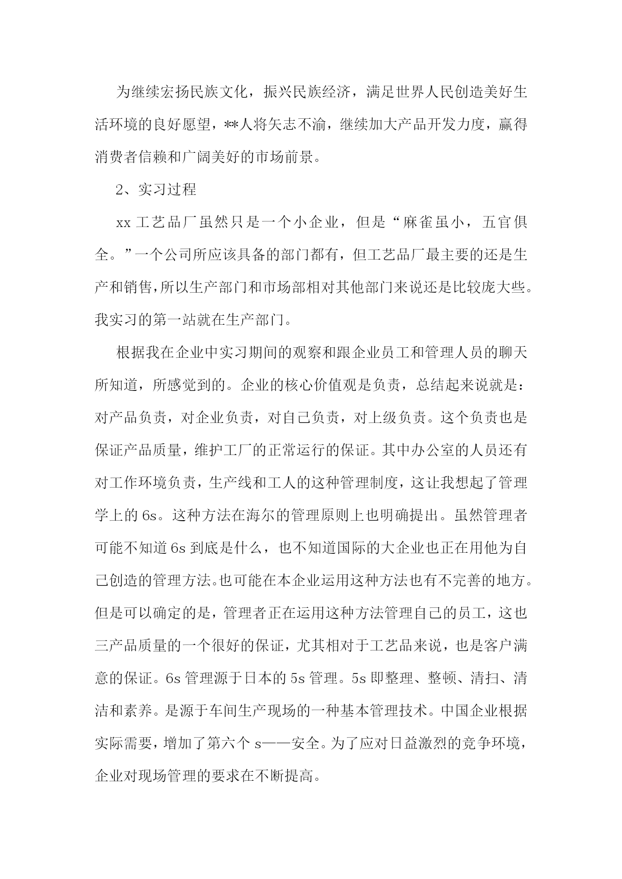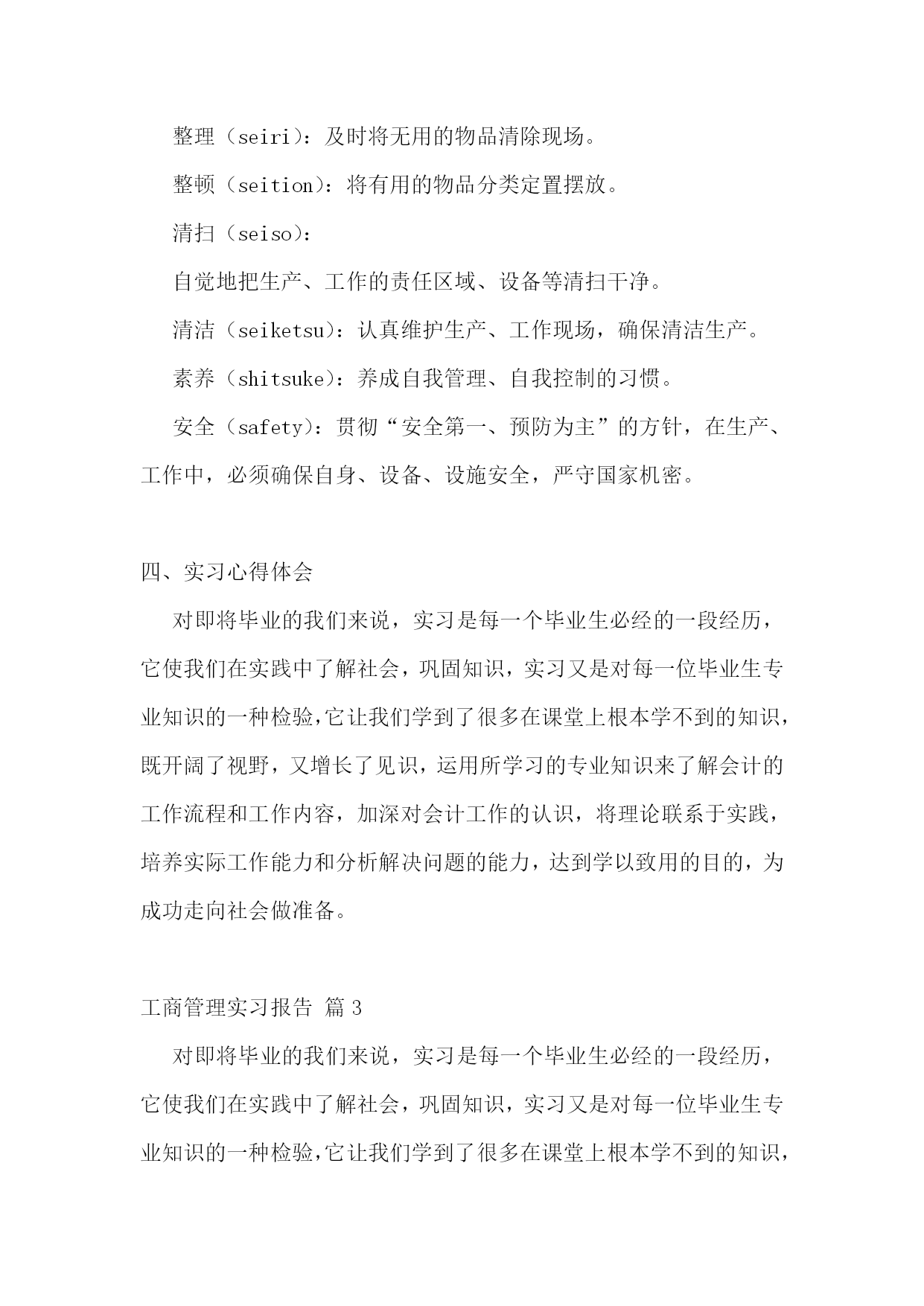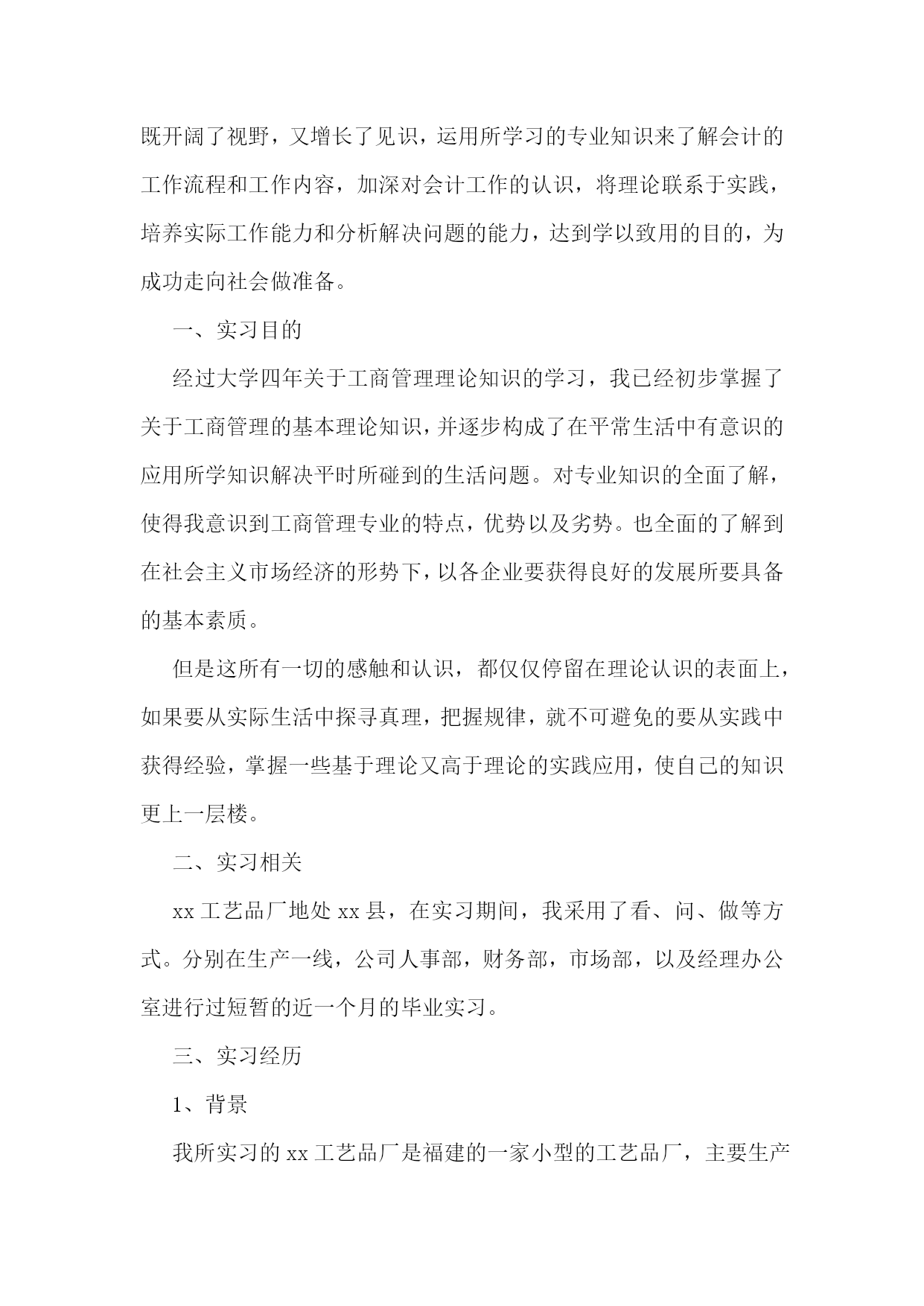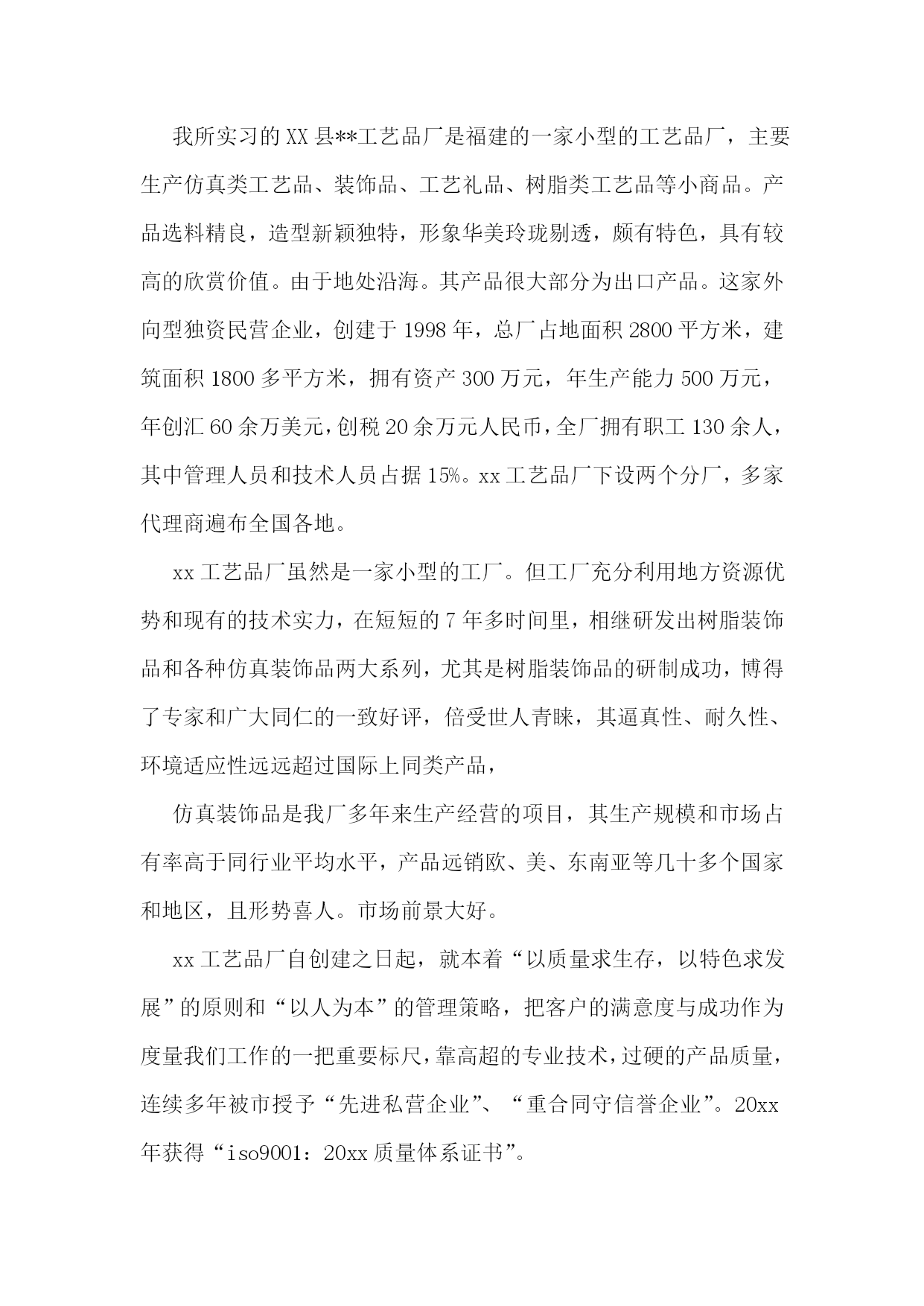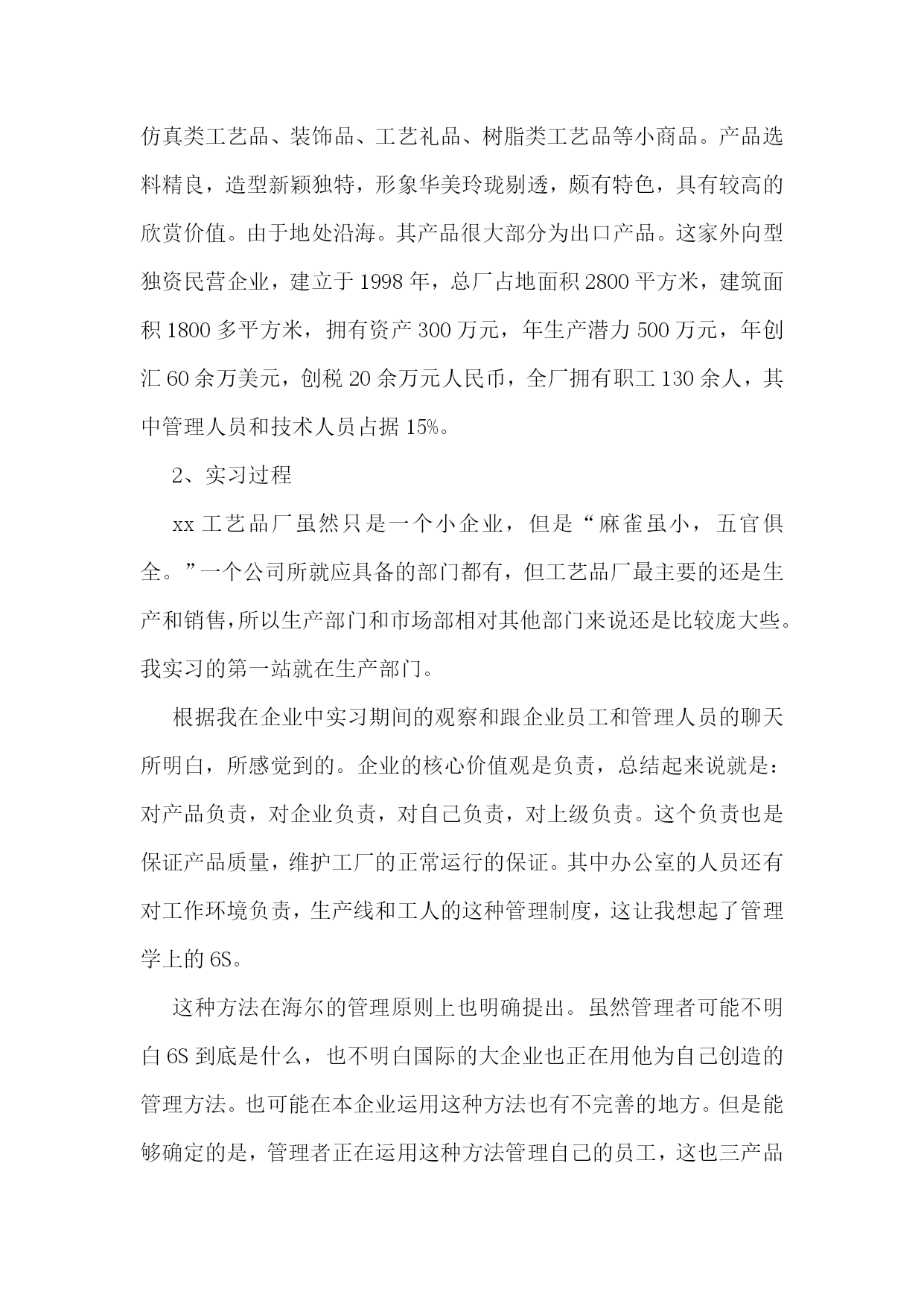 工商管理实习报告11篇工商管理实习报告篇2一、实习目的经过大学四年关于工商管理理论知识的学习,我已经初步掌握了关于工商管理的基本理论知识,并逐步形成了在平常生活中有意识的应用所学知识解决平时所碰到的生活问题。对专业知识的全面了解,使得我意识到工商管理专业的特点,优势以及劣势。也全面的了解到在社会主义市场经济的形势下,以各企业要获得良好的发展所要具备的基本素质。不过这所有一切的感触和认识,都仅仅停留在理论认识的表面上,如果要从实际生活中探寻真理,把握规律,就不可避免的要从实践中获得经验,掌握一些基于理论又高于理论的实践应用,使自己的知识更上一层楼。所以今年的三月一日开始,我就开始了在XX县**工艺品厂的实习经历。回顾实习生活,感触是很深的,收获是丰硕的。二、实习相关xx工艺品厂地处福建XX县,在实习期间,我采用了看、问、做等方式。分别在生产一线,公司人事部,财务部,市场部,以及经理办公室进行过短暂的近一个月的毕业实习。三、实习经历1、背景我所实习的XX县**工艺品厂是福建的一家小型的工艺品厂,主要生产仿真类工艺品、装饰品、工艺礼品、树脂类工艺品等小商品。产品选料精良,造型新颖独特,形象华美玲珑剔透,颇有特色,具有较高的欣赏价值。由于地处沿海。其产品很大部分为出口产品。这家外向型独资民营企业,创建于1998年,总厂占地面积2800平方米,建筑面积1800多平方米,拥有资产300万元,年生产能力500万元,年创汇60余万美元,创税20余万元人民币,全厂拥有职工130余人,其中管理人员和技术人员占据15%。xx工艺品厂下设两个分厂,多家代理商遍布全国各地。xx工艺品厂虽然是一家小型的工厂。但工厂充分利用地方资源优势和现有的技术实力,在短短的7年多时间里,相继研发出树脂装饰品和各种仿真装饰品两大系列,尤其是树脂装饰品的研制成功,博得了专家和广大同仁的一致好评,倍受世人青睐,其逼真性、耐久性、环境适应性远远超过国际上同类产品,仿真装饰品是我厂多年来生产经营的项目,其生产规模和市场占有率高于同行业平均水平,产品远销欧、美、东南亚等几十多个国家和地区,且形势喜人。市场前景大好。xx工艺品厂自创建之日起,就本着“以质量求生存,以特色求发展”的原则和“以人为本”的管理策略,把客户的满意度与成功作为度量我们工作的一把重要标尺,靠高超的专业技术,过硬的产品质量,连续多年被市授予“先进私营企业”、“重合同守信誉企业”。20xx年获得“iso9001:20xx质量体系证书”。为继续宏扬民族文化,振兴民族经济,满足世界人民创造美好生活环境的良好愿望,**人将矢志不渝,继续加大产品开发力度,赢得消费者信赖和广阔美好的市场前景。2、实习过程xx工艺品厂虽然只是一个小企业,但是“麻雀虽小,五官俱全。”一个公司所应该具备的部门都有,但工艺品厂最主要的还是生产和销售,所以生产部门和市场部相对其他部门来说还是比较庞大些。我实习的第一站就在生产部门。根据我在企业中实习期间的观察和跟企业员工和管理人员的聊天所知道,所感觉到的。企业的核心价值观是负责,总结起来说就是:对产品负责,对企业负责,对自己负责,对上级负责。这个负责也是保证产品质量,维护工厂的正常运行的保证。其中办公室的人员还有对工作环境负责,生产线和工人的这种管理制度,这让我想起了管理学上的6s。这种方法在海尔的管理原则上也明确提出。虽然管理者可能不知道6s到底是什么,也不知道国际的大企业也正在用他为自己创造的管理方法。也可能在本企业运用这种方法也有不完善的地方。但是可以确定的是,管理者正在运用这种方法管理自己的员工,这也三产品质量的一个很好的保证,尤其相对于工艺品来说,也是客户满意的保证。6s管理源于日本的5s管理。5s即整理、整顿、清扫、清洁和素养。是源于车间生产现场的一种基本管理技术。中国企业根据实际需要,增加了第六个s——安全。为了应对日益激烈的竞争环境,企业对现场管理的要求在不断提高。整理(seiri):及时将无用的物品清除现场。整顿(seition):将有用的物品分类定置摆放。清扫(seiso):自觉地把生产、工作的责任区域、设备等清扫干净。清洁(seiketsu):认真维护生产、工作现场,确保清洁生产。素养(shitsuke):养成自我管理、自我控制的习惯。安全(safety):贯彻“安全第一、预防为主”的方针,在生产、工作中,必须确保自身、设备、设施安全,严守国家机密。四、实习心得体会对即将毕业的我们来说,实习是每一个毕业生必经的一段经历,它使我们在实践中了解社会,巩固知识,实习又是对每一位毕业生专业知识的一种检验,它让我们学到了很多在课堂上根本学不到的知识,既开阔了视野,又增长了见识,运用所学习的专业知识来了解会计的工作流程和工作内容,加深对会