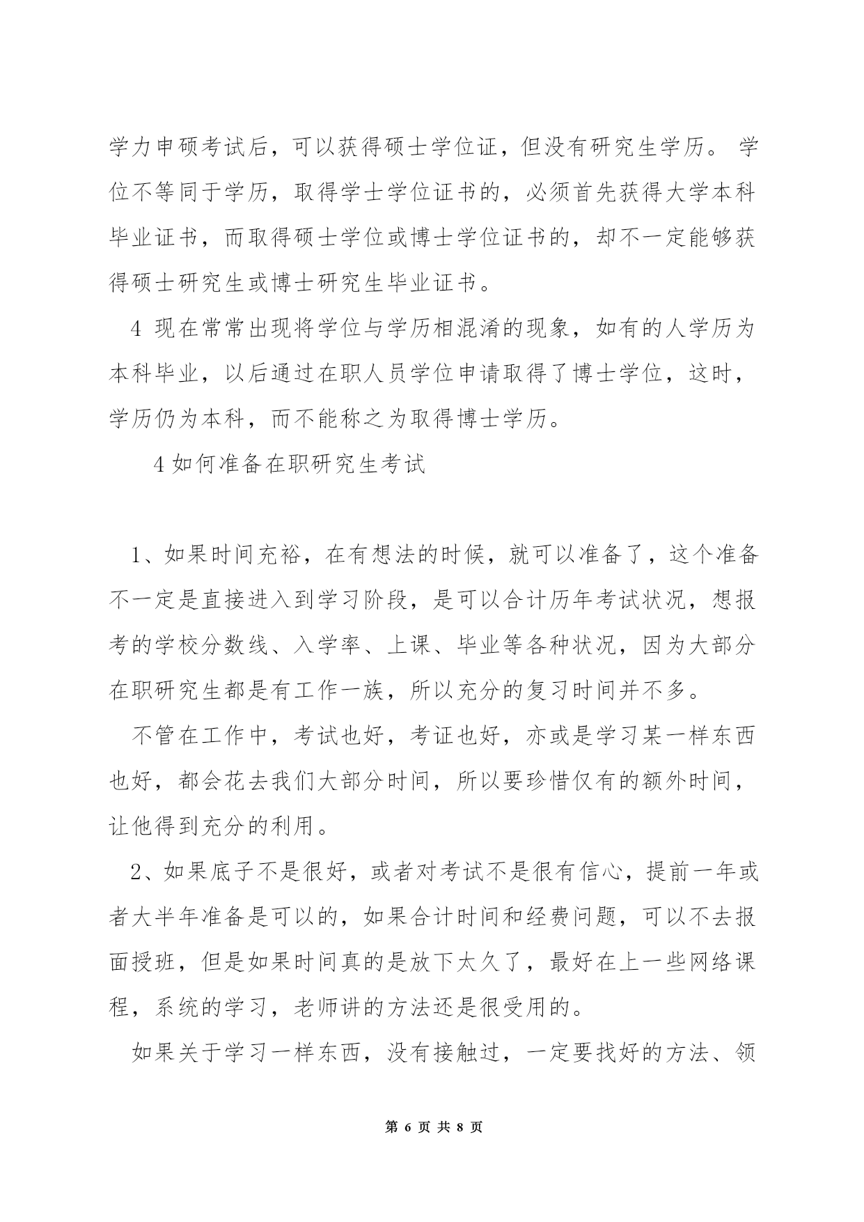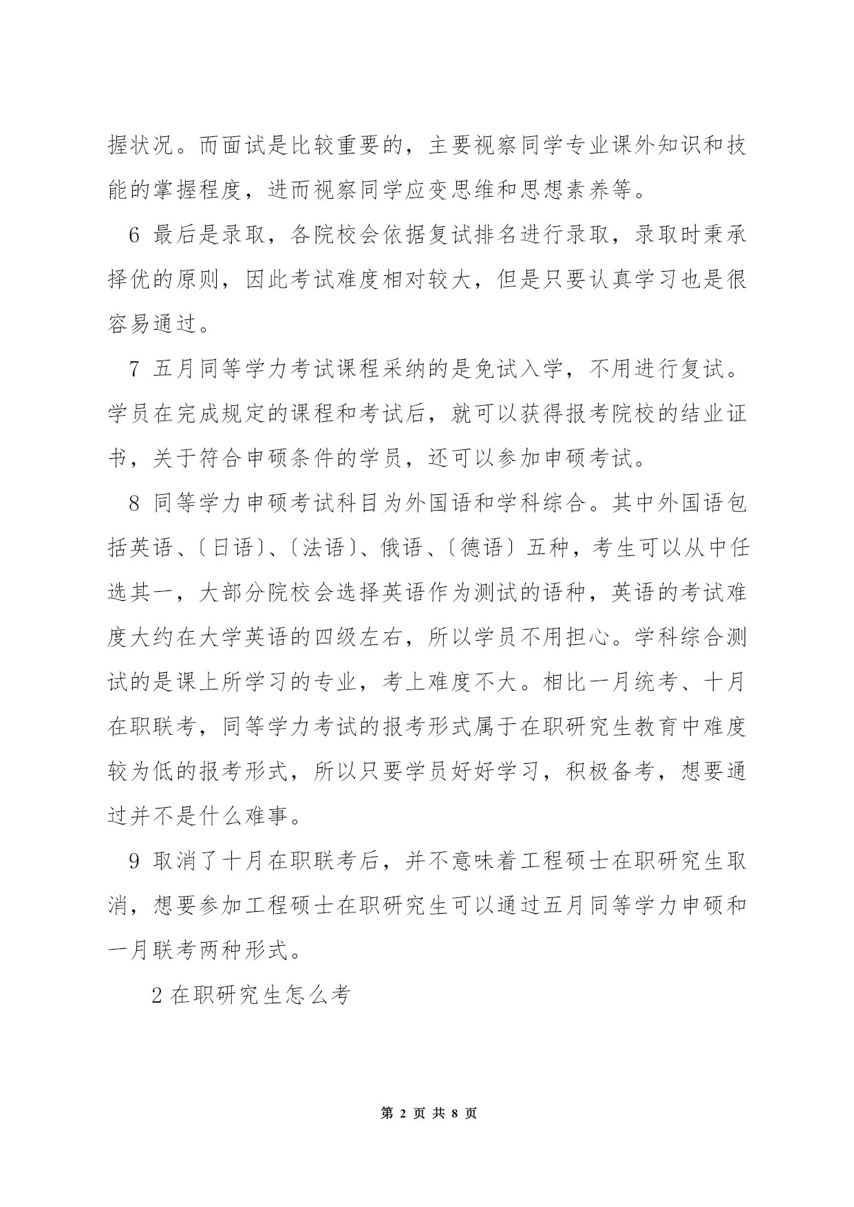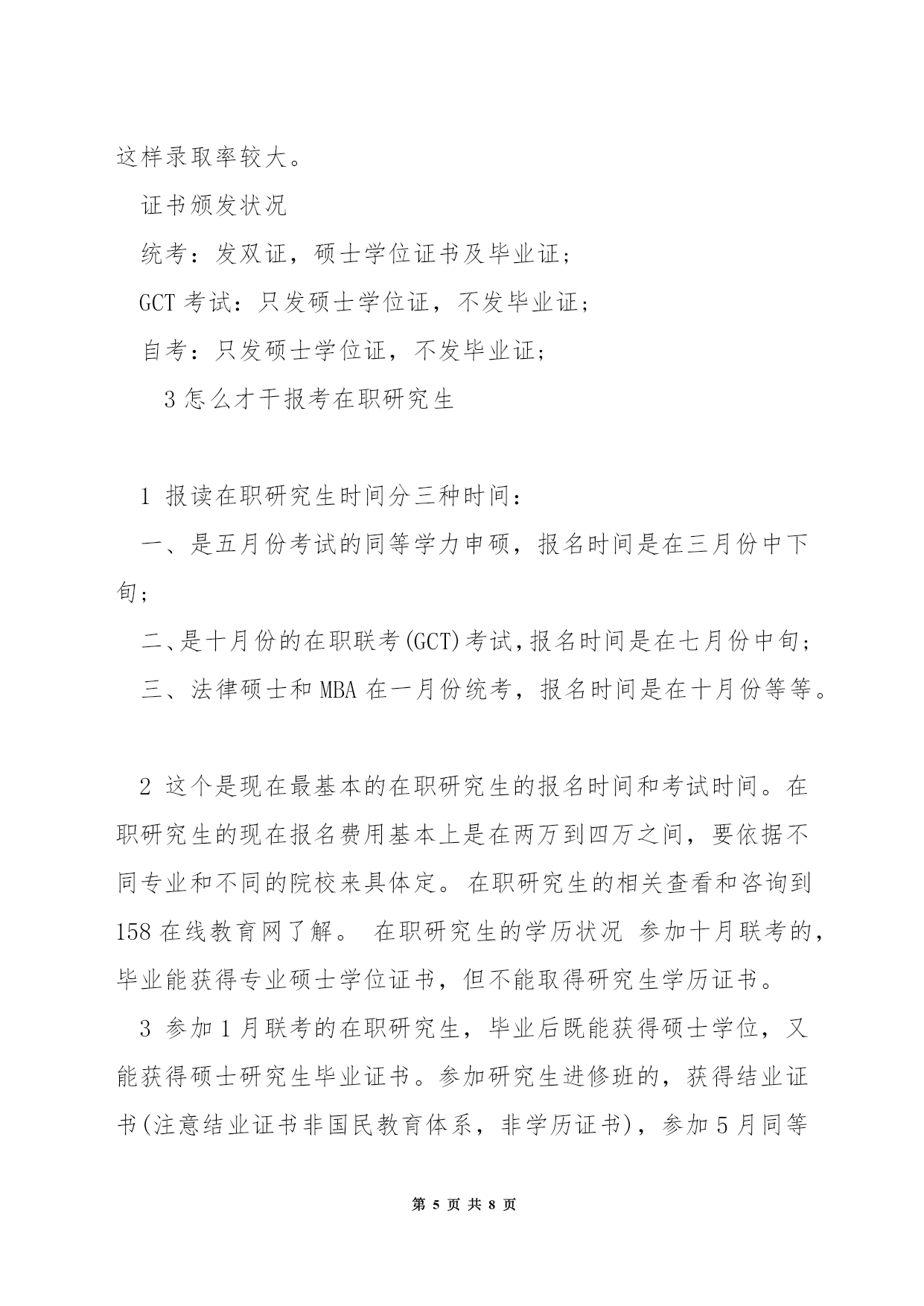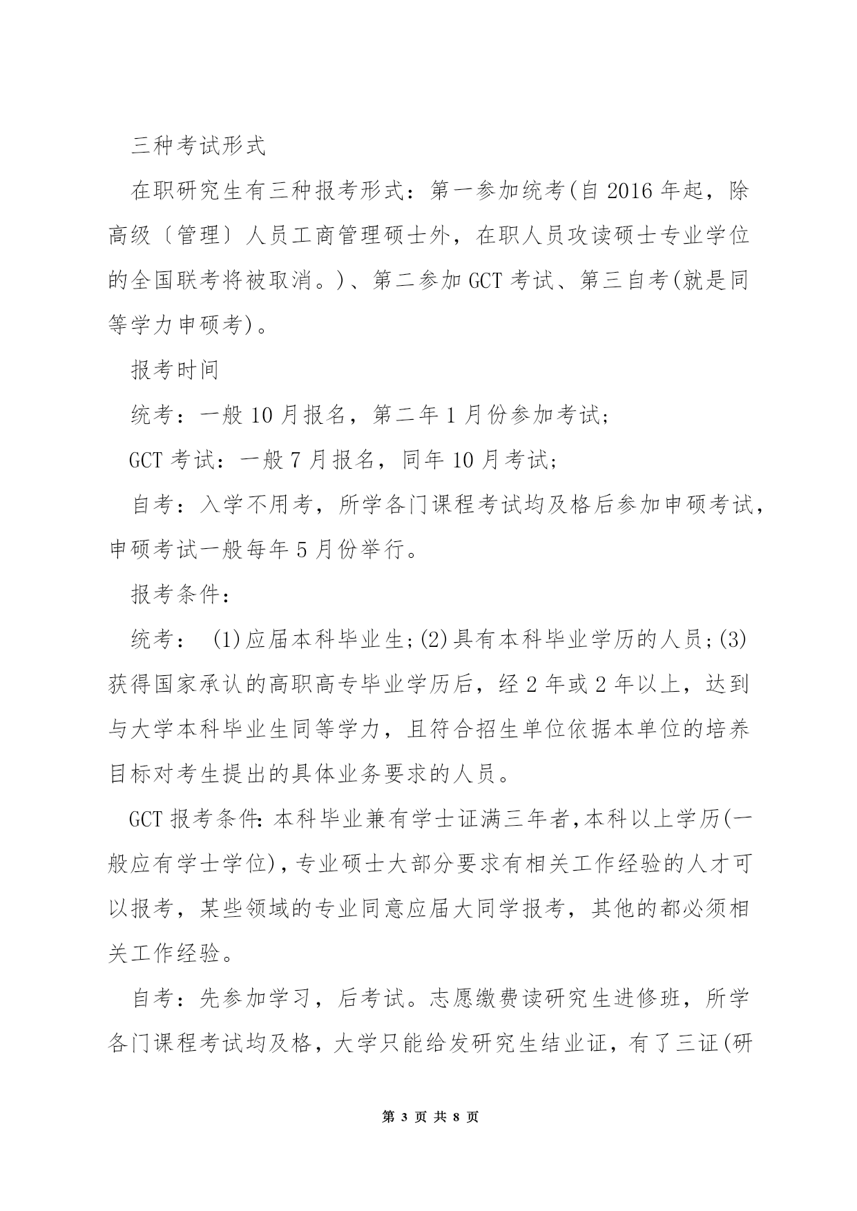 第PAGE\*MERGEFORMAT8页共NUMPAGES\*MERGEFORMAT8页在职研究生怎么样考试1首先说一下一月联考,这类在职研究生考试毕业后获得的是双证,也就是人们常说的学历证书和学位证书,社会认可度高,培养模式上与全日制的统招研究生一样,但考生谨记,此类研究生考试难度较大,通过率较低。考上这样的研究生意味着得放弃工作,专心读书,请慎重选择。2其次是五月同等学力申硕考试,这类在职研究生考试是先入学后考试,修满学分后后,在每年五月份参加申硕考试,毕业后获得硕士学位证书,此类研究生涵盖专业广泛,通过率居中。3最后是十月在职联考,先考试后入学,通过在职研究生考试后,学习课程,修满学分,通过毕业论文答辩后,获得硕士学位证书。社会认可度较高,关于升职加薪是一个不错的选择。不过现在十月联考已经取消。4一月份的双证在职研究生涉及专业有〔MBA〕、MPA、MEM、MPACC等,考生必须要先考试后入学的,其初试考试分为〔英语〕、数学、逻辑和写作,其中英语难度在大学四级和六级之间,必须要考生努力认真的学习。5然后是复试,双证在职研究生的复试考试分为笔试和面试,其中笔试所考内容是一下专业理论,来视察同学对专业知识的掌握状况。而面试是比较重要的,主要视察同学专业课外知识和技能的掌握程度,进而视察同学应变思维和思想素养等。6最后是录取,各院校会依据复试排名进行录取,录取时秉承择优的原则,因此考试难度相对较大,但是只要认真学习也是很容易通过。7五月同等学力考试课程采纳的是免试入学,不用进行复试。学员在完成规定的课程和考试后,就可以获得报考院校的结业证书,关于符合申硕条件的学员,还可以参加申硕考试。8同等学力申硕考试科目为外国语和学科综合。其中外国语包括英语、〔日语〕、〔法语〕、俄语、〔德语〕五种,考生可以从中任选其一,大部分院校会选择英语作为测试的语种,英语的考试难度大约在大学英语的四级左右,所以学员不用担心。学科综合测试的是课上所学习的专业,考上难度不大。相比一月统考、十月在职联考,同等学力考试的报考形式属于在职研究生教育中难度较为低的报考形式,所以只要学员好好学习,积极备考,想要通过并不是什么难事。9取消了十月在职联考后,并不意味着工程硕士在职研究生取消,想要参加工程硕士在职研究生可以通过五月同等学力申硕和一月联考两种形式。2在职研究生怎么考三种考试形式在职研究生有三种报考形式:第一参加统考(自2016年起,除高级〔管理〕人员工商管理硕士外,在职人员攻读硕士专业学位的全国联考将被取消。)、第二参加GCT考试、第三自考(就是同等学力申硕考)。报考时间统考:一般10月报名,第二年1月份参加考试;GCT考试:一般7月报名,同年10月考试;自考:入学不用考,所学各门课程考试均及格后参加申硕考试,申硕考试一般每年5月份举行。报考条件:统考:(1)应届本科毕业生;(2)具有本科毕业学历的人员;(3)获得国家承认的高职高专毕业学历后,经2年或2年以上,达到与大学本科毕业生同等学力,且符合招生单位依据本单位的培养目标对考生提出的具体业务要求的人员。GCT报考条件:本科毕业兼有学士证满三年者,本科以上学历(一般应有学士学位),专业硕士大部分要求有相关工作经验的人才可以报考,某些领域的专业同意应届大同学报考,其他的都必须相关工作经验。自考:先参加学习,后考试。志愿缴费读研究生进修班,所学各门课程考试均及格,大学只能给发研究生结业证,有了三证(研究生结业证、本科毕业证、学士证)就有资格参加同等学力申硕考试,国考及格的由国务院学位委颁发硕士证。考试内容统考:一般考试〔外语〕、政治、综合科目(依据报考专业不同而不同)和专业课。GCT考试:分为两个阶段。第一阶段:考生参加全国统一组织的工程硕士研究生入学资格考试(GCT),试卷由四个部分构成:语文表达能力测试、数学基础能力测试、逻辑推理能力测试、外语运用能力测试。第二阶段:由考生持本人的GCT成绩单,到所报考的院校申请参加学校依据培养目标自行确定和组织的测试。高等学校依据考生的各项测试成绩和对考生的视察结果,决定是否录取。自考:所学各门课程考试均及格后参加申硕考试,申硕考试包括外国语水平和学科综合水平全国统一考试。学习形式及择校原则统考一般不脱产人员与统招生一起学习上课,GCT考试及自考人员等不脱产人员,一般是院校针对在职研究生工作性质均采用周末班和集中班。在既兼顾工作又不耽误学业前提下,选择一所就近的学校,无疑节省时间和精力,同时选择一所师资力量雄厚重点大学也不失为不错的选择,丰富的学习资源为日后的工作学习都有很大的帮助,也可以轻松地选择一所竞争不激烈的学校,这样录取率较大。证书颁发状况统考:发双证,硕士学位证书及毕业证;GCT考试:只发硕士学位证,不发毕业证;自考:只发硕士学位证,不