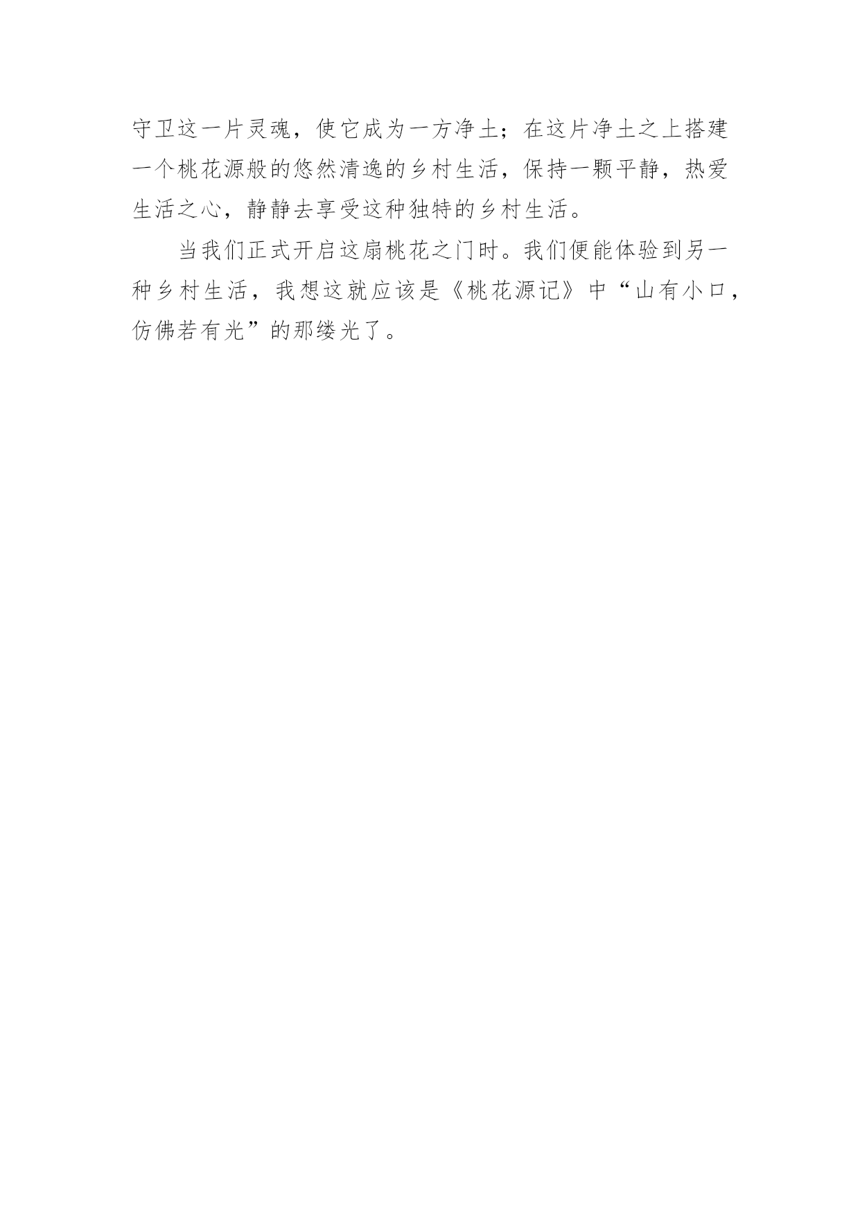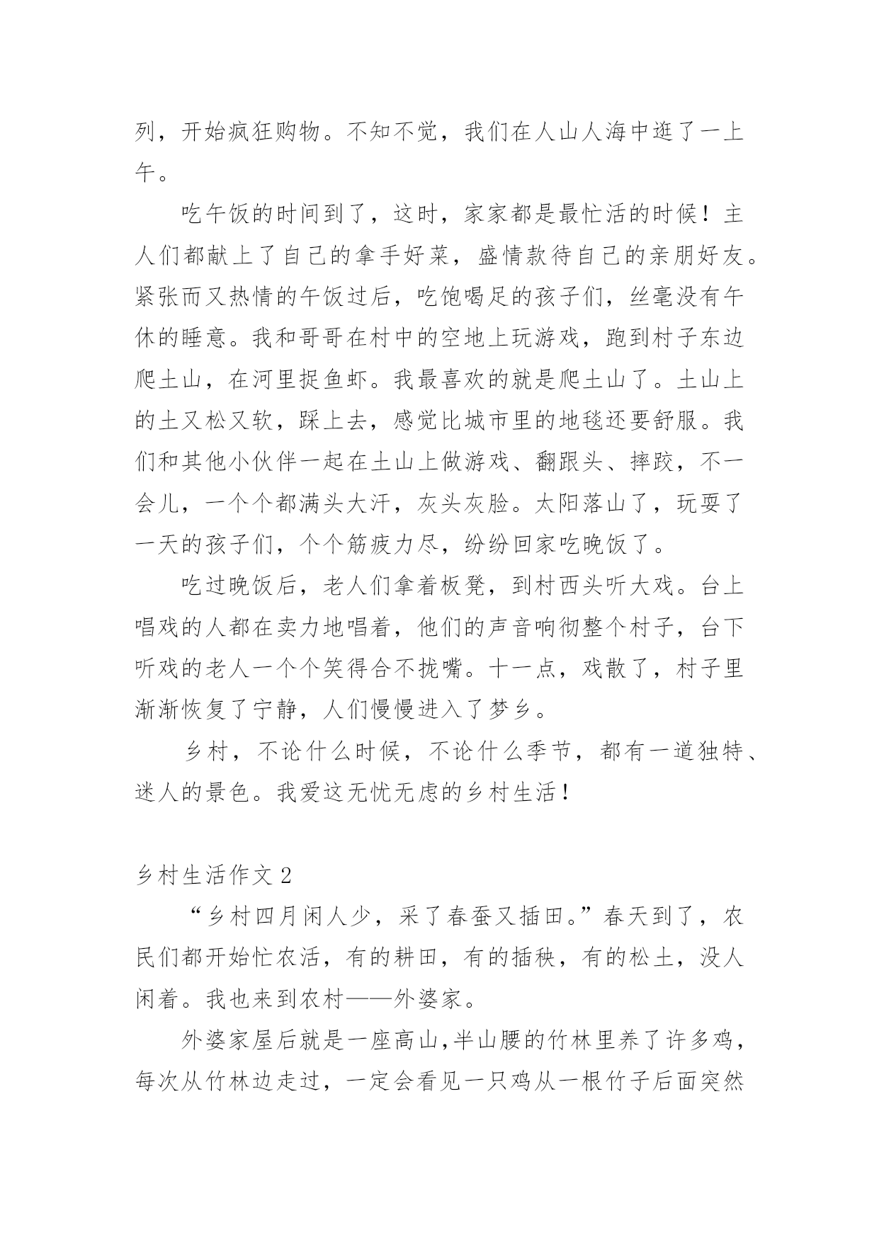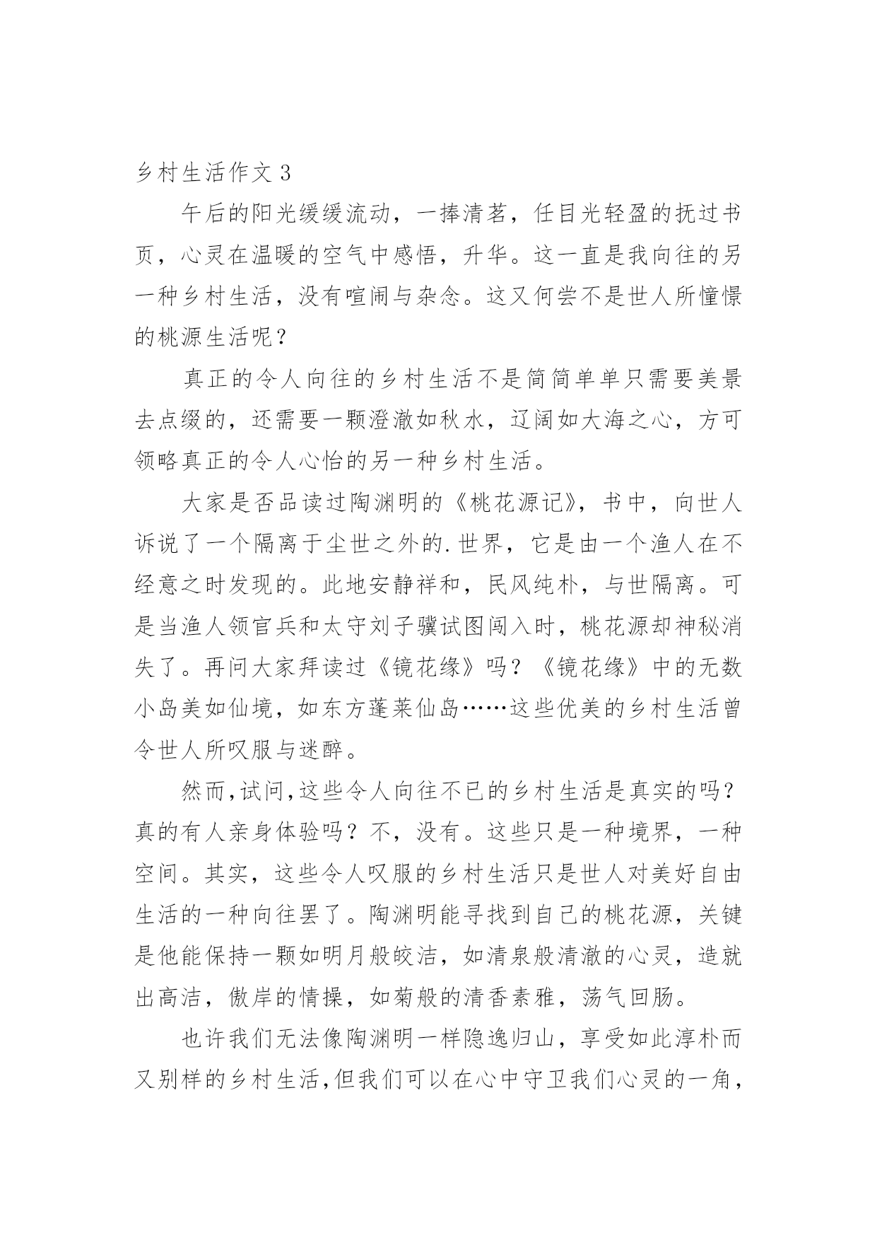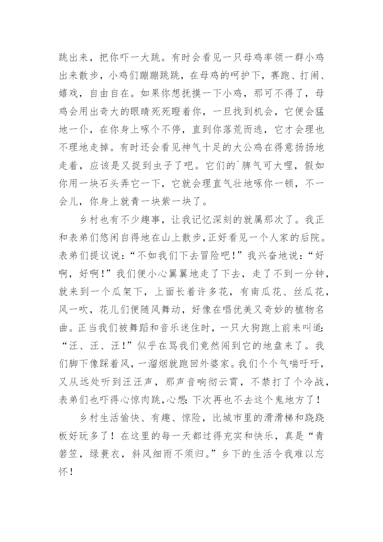 乡村生活作文(优秀)乡村生活作文3篇在日常学习、工作或生活中,大家都经常接触到作文吧,作文是人们以书面形式表情达意的言语活动。相信很多朋友都对写作文感到非常苦恼吧,以下是小编收集整理的乡村生活作文,供大家参考借鉴,希望可以帮助到有需要的朋友。乡村生活作文1放假了,我和爸爸妈妈趁着全家人都能休息的美好时光,来到妈妈的老家——內黄。在那里,我看到了独特、迷人的风景,感受到了在城市里从未有过的感觉。我们乘车来到姥姥家所在村庄的村口,下车后,我放眼望去,只见小村周围都是庄稼,绿油油的麦苗显示出勃勃生机。我们向村子里走去,一阵凉爽的春风迎面吹来,小麦频频点头,好像在欢迎我们的到来。那一天,正好赶上村子里过会,道路两旁,早已摆满了摊位,卖衣服的,卖家具的,卖玩具的,卖农具的……真是琳琅满目,一应俱全,比城市大商场里的东西还要多,还要丰富。这么多卖东西的'摊位,当然少不了前来购买的顾客啦!有的人正在和卖衣服的讨价还价,有的人在给自己家的小孩买玩具,还有的人在买耕地时使用的农具……似乎没有一个人闲着。当然,我们也没闲着。在姥姥家稍微休息了一会儿,我们也加入了购买的行列,开始疯狂购物。不知不觉,我们在人山人海中逛了一上午。吃午饭的时间到了,这时,家家都是最忙活的时候!主人们都献上了自己的拿手好菜,盛情款待自己的亲朋好友。紧张而又热情的午饭过后,吃饱喝足的孩子们,丝毫没有午休的睡意。我和哥哥在村中的空地上玩游戏,跑到村子东边爬土山,在河里捉鱼虾。我最喜欢的就是爬土山了。土山上的土又松又软,踩上去,感觉比城市里的地毯还要舒服。我们和其他小伙伴一起在土山上做游戏、翻跟头、摔跤,不一会儿,一个个都满头大汗,灰头灰脸。太阳落山了,玩耍了一天的孩子们,个个筋疲力尽,纷纷回家吃晚饭了。吃过晚饭后,老人们拿着板凳,到村西头听大戏。台上唱戏的人都在卖力地唱着,他们的声音响彻整个村子,台下听戏的老人一个个笑得合不拢嘴。十一点,戏散了,村子里渐渐恢复了宁静,人们慢慢进入了梦乡。乡村,不论什么时候,不论什么季节,都有一道独特、迷人的景色。我爱这无忧无虑的乡村生活!乡村生活作文2“乡村四月闲人少,采了春蚕又插田。”春天到了,农民们都开始忙农活,有的耕田,有的插秧,有的松土,没人闲着。我也来到农村——外婆家。外婆家屋后就是一座高山,半山腰的竹林里养了许多鸡,每次从竹林边走过,一定会看见一只鸡从一根竹子后面突然跳出来,把你吓一大跳。有时会看见一只母鸡率领一群小鸡出来散步,小鸡们蹦蹦跳跳,在母鸡的呵护下,赛跑、打闹、嬉戏,自由自在。如果你想抚摸一下小鸡,那可不得了,母鸡会用出奇大的眼睛死死瞪着你,一旦找到机会,它便会猛地一仆,在你身上啄个不停,直到你落荒而逃,它才会理也不理地走掉。有时还会看见神气十足的大公鸡在得意扬扬地走着,应该是又捉到虫子了吧。它们的`脾气可大哩,假如你用一块石头弄它一下,它就会理直气壮地啄你一顿,不一会儿,你身上就青一块紫一块了。乡村也有不少趣事,让我记忆深刻的就属那次了。我正和表弟们悠闲自得地在山上散步,正好看见一个人家的后院。表弟们提议说:“不如我们下去冒险吧!”我兴奋地说:“好啊,好啊!”我们便小心翼翼地走了下去,走了不到一分钟,就来到一个瓜架下,上面长着许多花,有南瓜花、丝瓜花,风一吹,花儿们便随风舞动,好像在唱优美又奇妙的植物名曲。正当我们被舞蹈和音乐迷住时,一只大狗跑上前来叫道:“汪、汪、汪!”似乎在骂我们竟然闯到它的地盘来了。我们脚下像踩着风,一溜烟就跑回外婆家。我们个个气喘吁吁,又从远处听到汪汪声,那声音响彻云霄,不禁打了个冷战,表弟们也吓得心惊肉跳,心想:下次再也不去这个鬼地方了!乡村生活愉快、有趣、惊险,比城市里的滑滑梯和跷跷板好玩多了!在这里的每一天都过得充实和快乐,真是“青箬笠,绿蓑衣,斜风细雨不须归。”乡下的生活令我难以忘怀!乡村生活作文3午后的阳光缓缓流动,一捧清茗,任目光轻盈的抚过书页,心灵在温暖的空气中感悟,升华。这一直是我向往的另一种乡村生活,没有喧闹与杂念。这又何尝不是世人所憧憬的桃源生活呢?真正的令人向往的乡村生活不是简简单单只需要美景去点缀的,还需要一颗澄澈如秋水,辽阔如大海之心,方可领略真正的令人心怡的另一种乡村生活。大家是否品读过陶渊明的《桃花源记》,书中,向世人诉说了一个隔离于尘世之外的.世界,它是由一个渔人在不经意之时发现的。此地安静祥和,民风纯朴,与世隔离。可是当渔人领官兵和太守刘子骥试图闯入时,桃花源却神秘消失了。再问大家拜读过《镜花缘》吗?《镜花缘》中的无数小岛美如仙境,如东方蓬莱仙岛……这些优美的乡村生活曾令世人所叹服与迷醉。然而,试问,这些令人向往不已的乡村生活是真实的吗?真的有人亲身体验吗?不,没有。这些只是一种境界,一种空间。其实,这些令人叹服的乡村生活只是世人对美好自由生活的一种向往罢了
